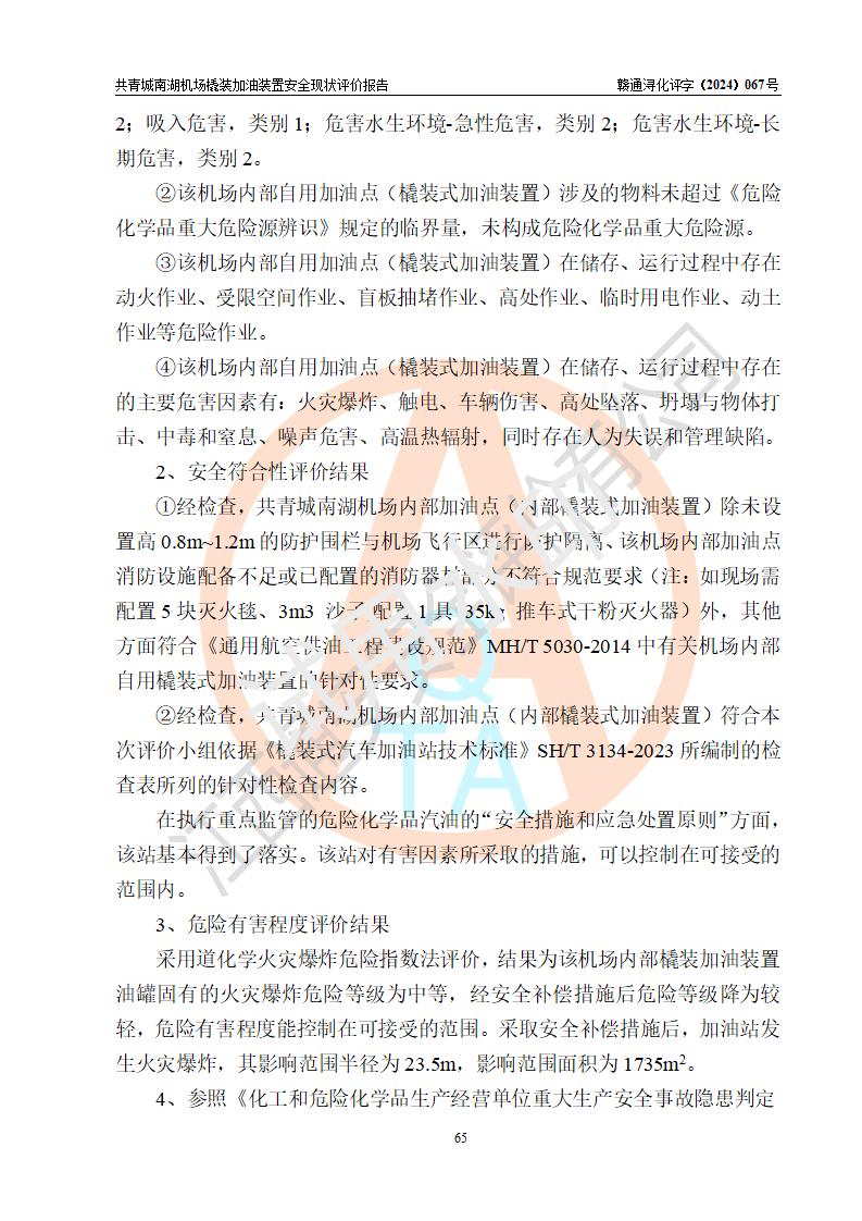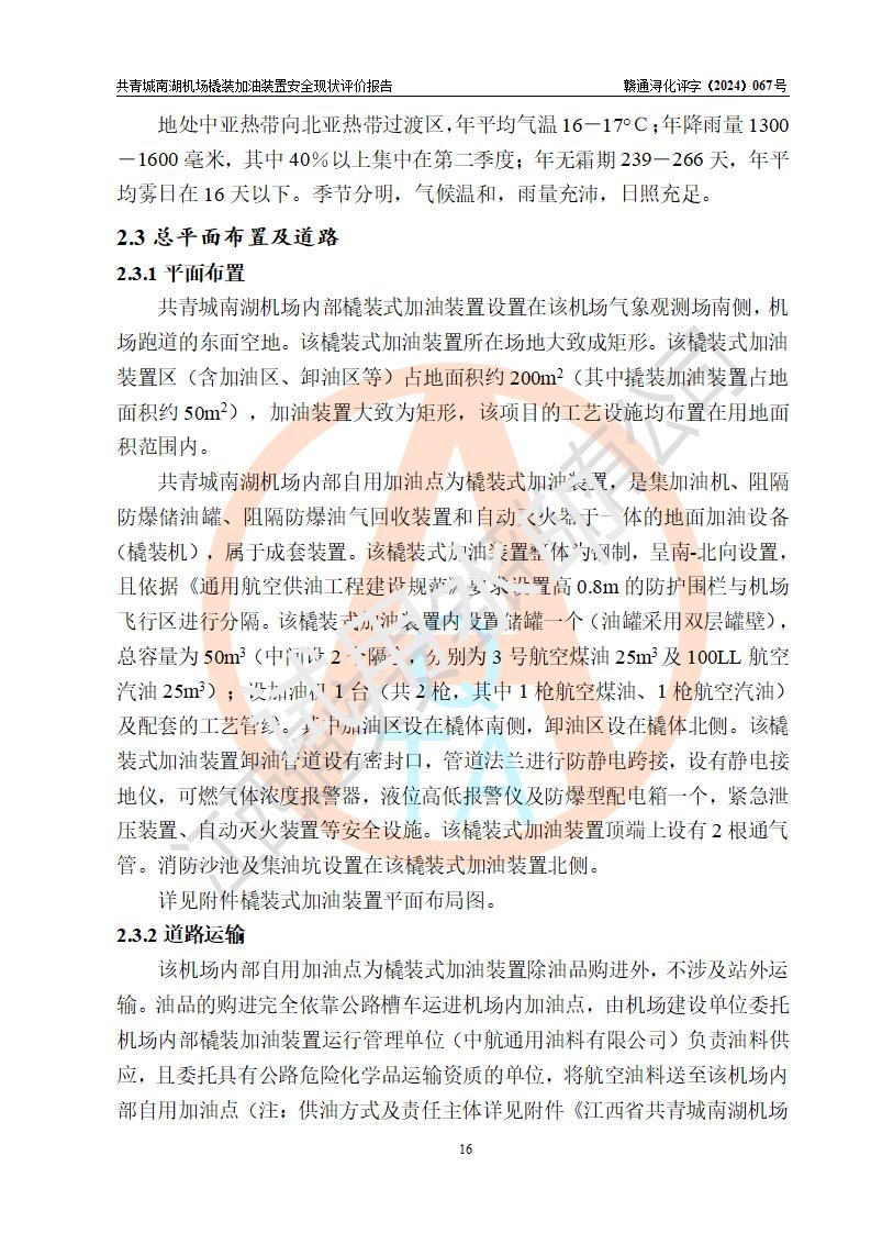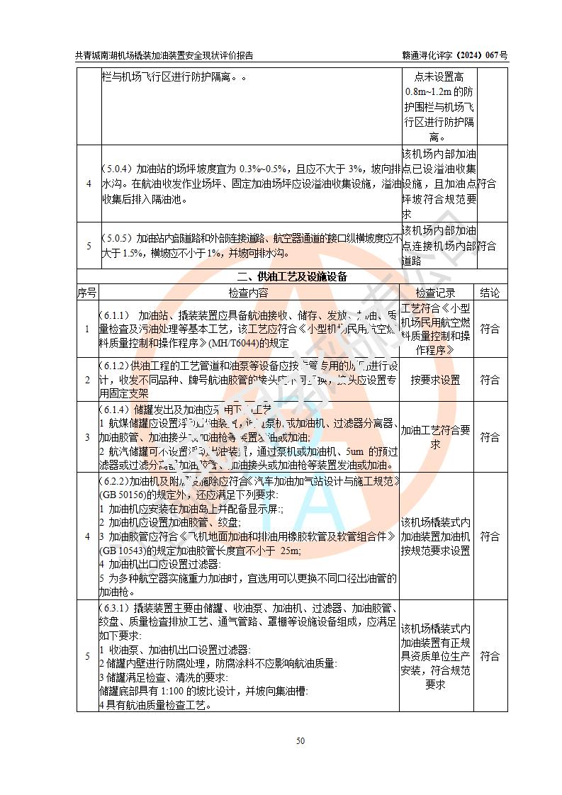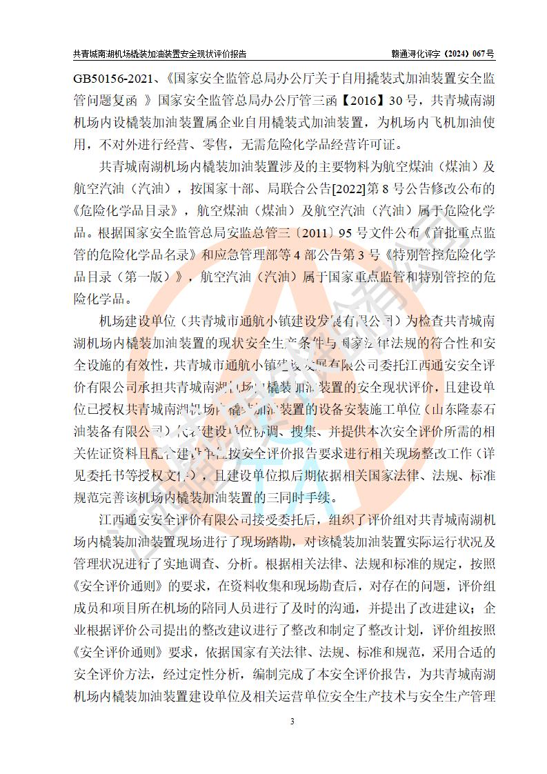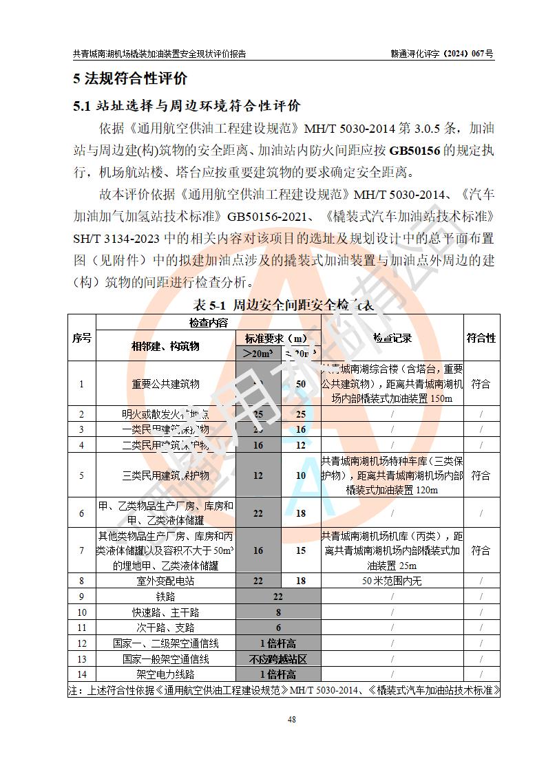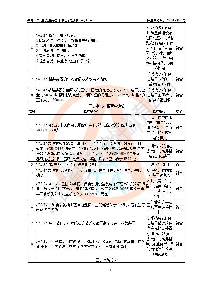 评价结论 | 九共青城南湖机场内橇装加油装置涉及的安全条件、安全运营条件、安全生产管理等方面在落实本报告安全对策措施建议后,符合《通用航空供油工程建设规范》MH/T 5030-2014、《汽车加油加气加氢站技术标准》GB50156-2021、《橇装式汽车加油站技术标准》SH/T 3134-2023等**有关法规、标准、规范要求。 | |||