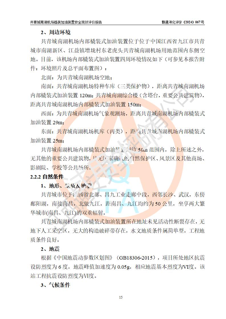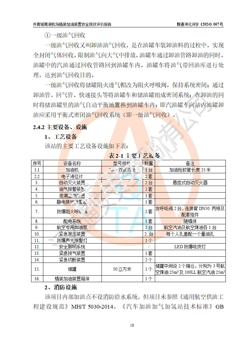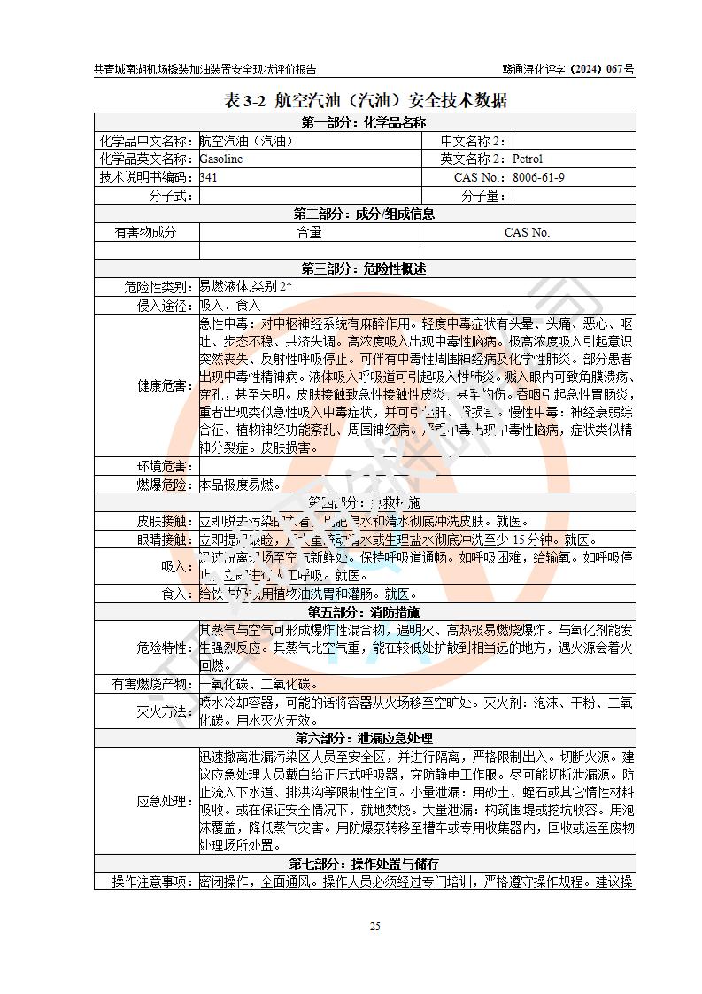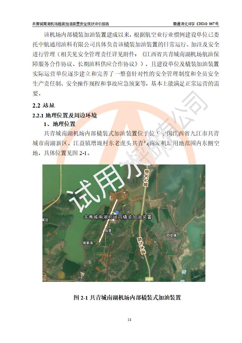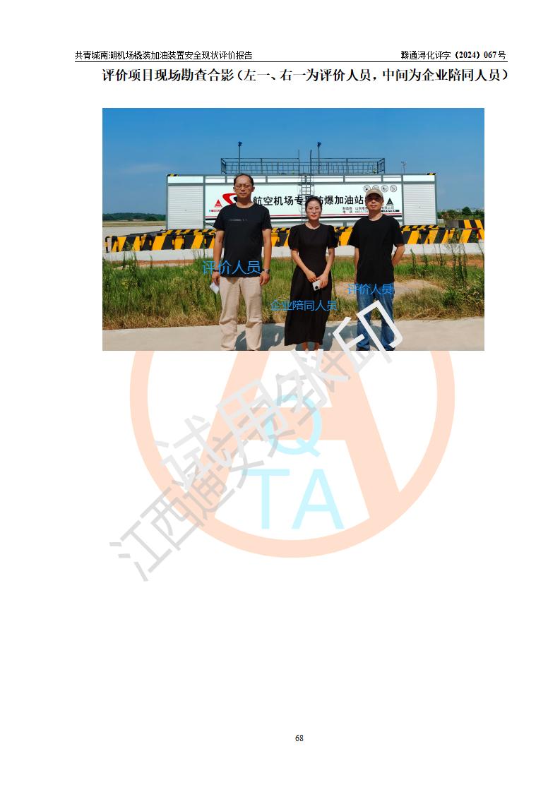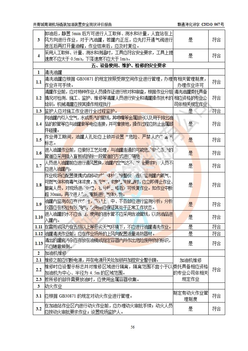 评价结论 | 九共青城南湖机场内橇装加油装置涉及的安全条件、安全运营条件、安全生产管理等方面在落实本报告安全对策措施建议后,符合《通用航空供油工程建设规范》MH/T 5030-2014、《汽车加油加气加氢站技术标准》GB50156-2021、《橇装式汽车加油站技术标准》SH/T 3134-2023等**有关法规、标准、规范要求。 | |||