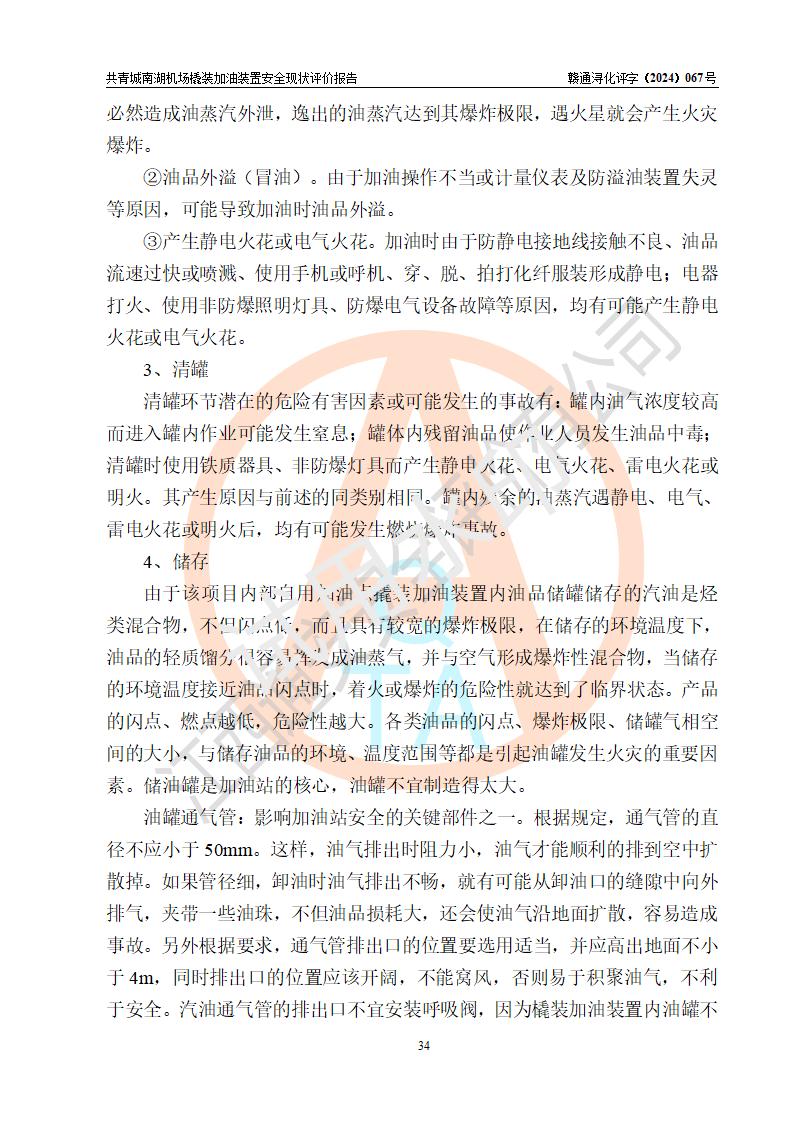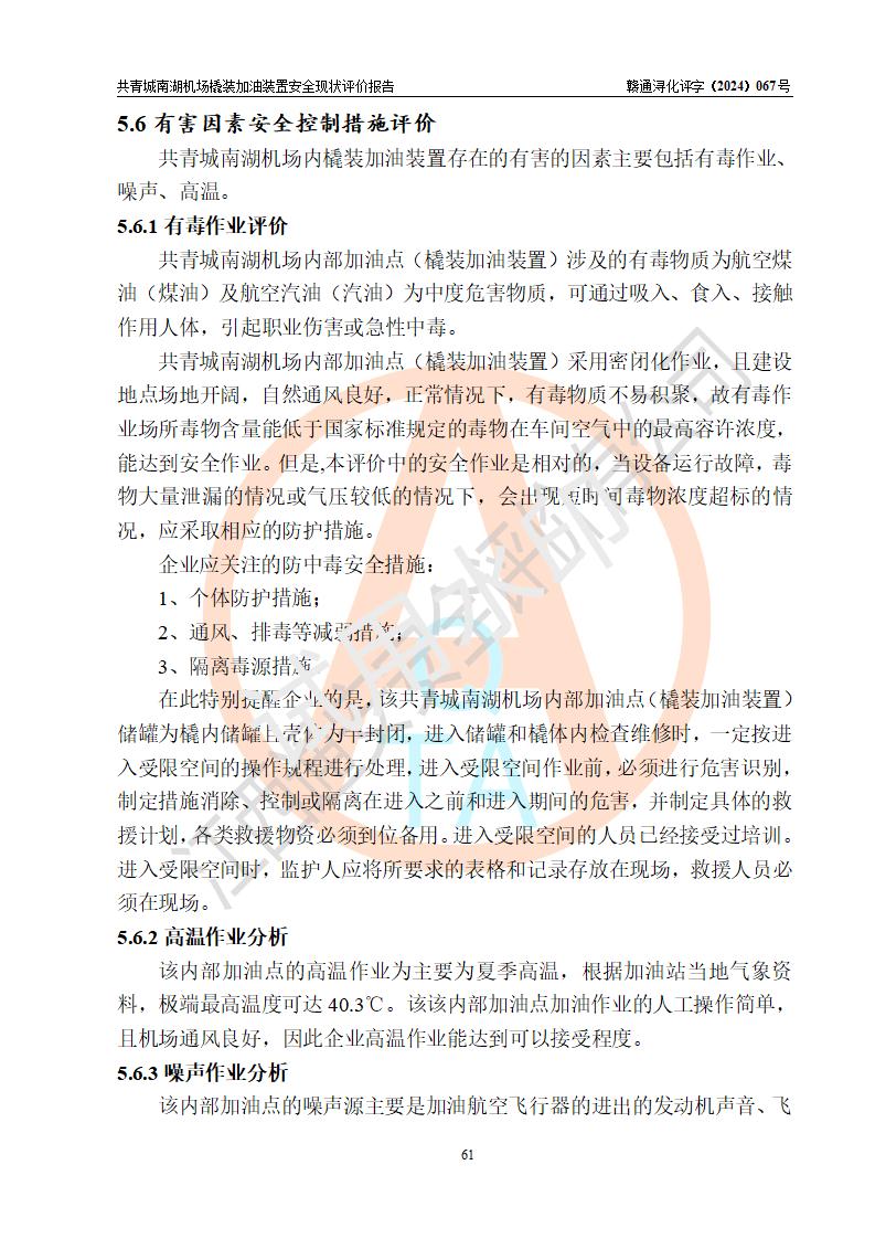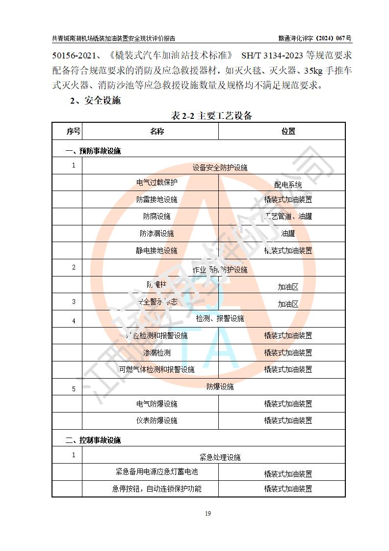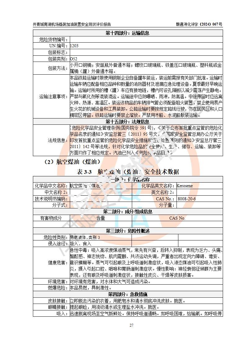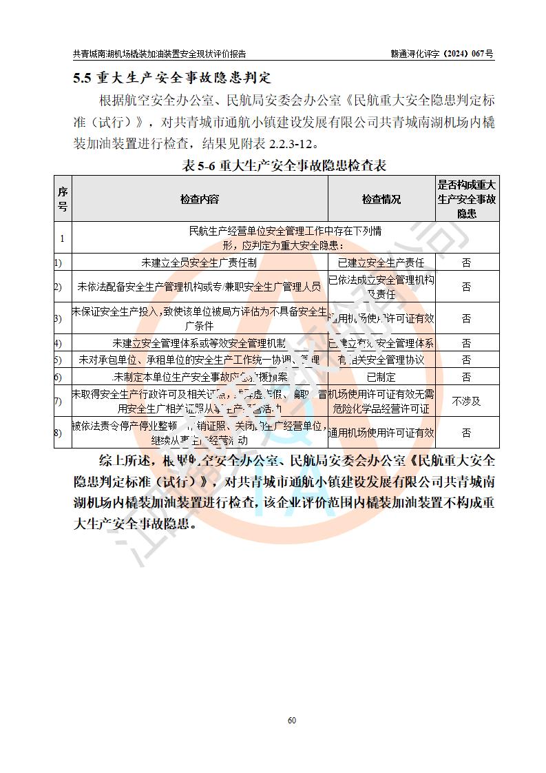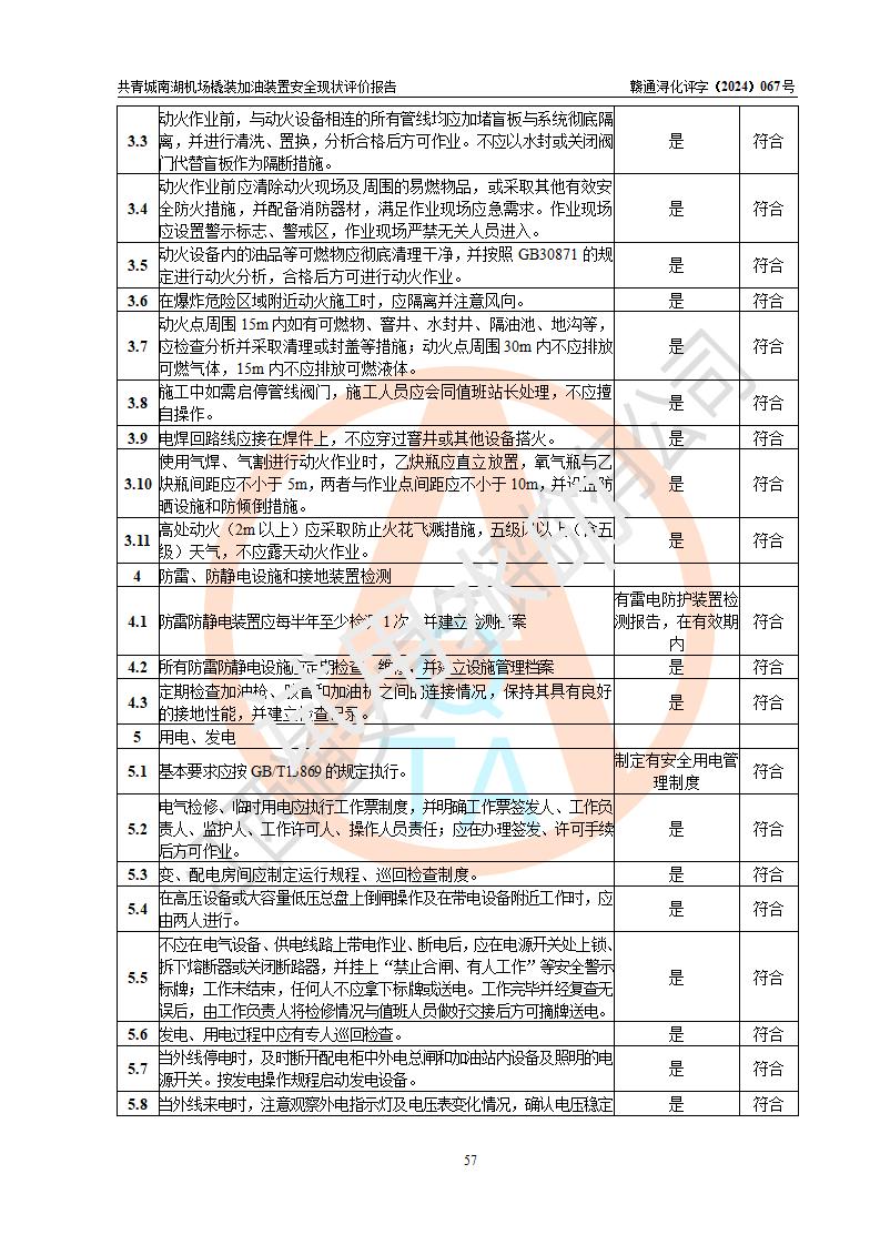 评价结论 | 九共青城南湖机场内橇装加油装置涉及的安全条件、安全运营条件、安全生产管理等方面在落实本报告安全对策措施建议后,符合《通用航空供油工程建设规范》MH/T 5030-2014、《汽车加油加气加氢站技术标准》GB50156-2021、《橇装式汽车加油站技术标准》SH/T 3134-2023等**有关法规、标准、规范要求。 | |||