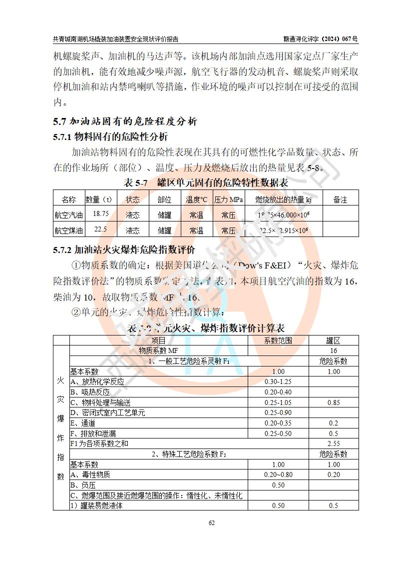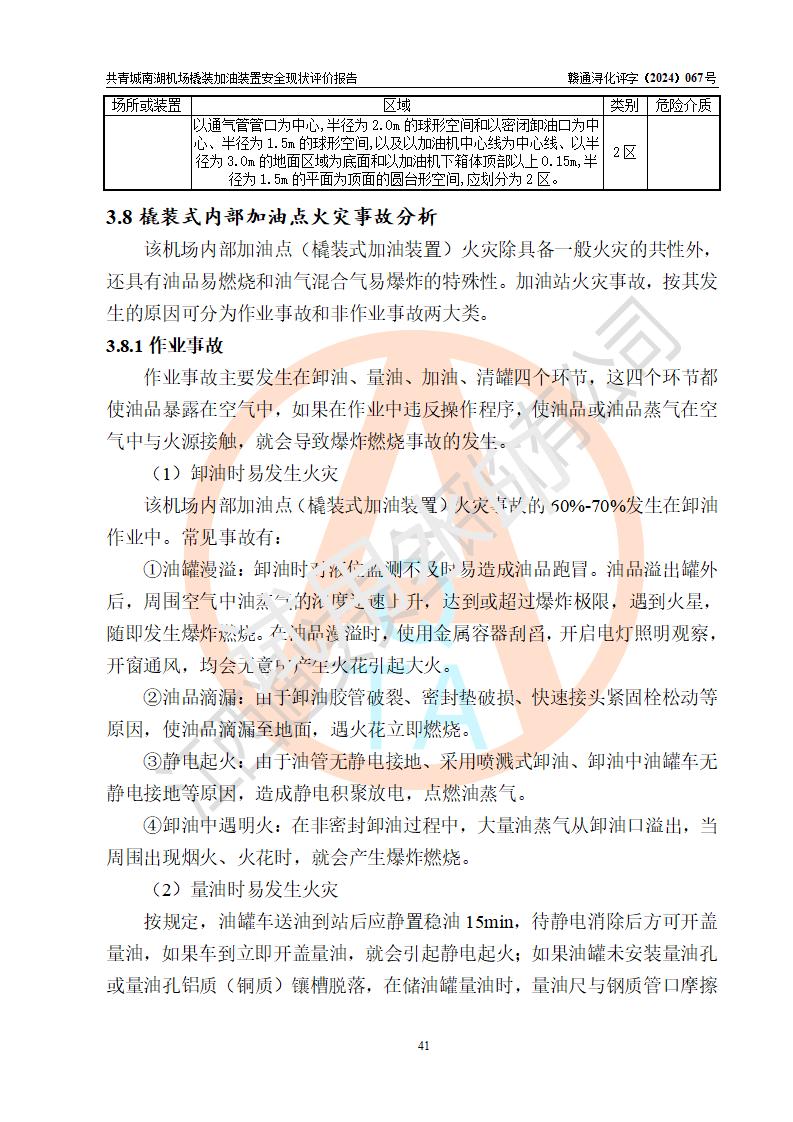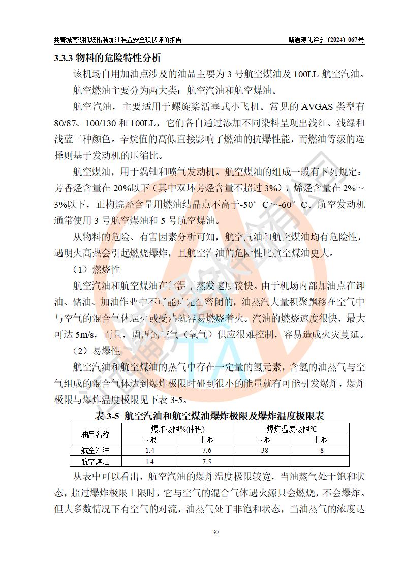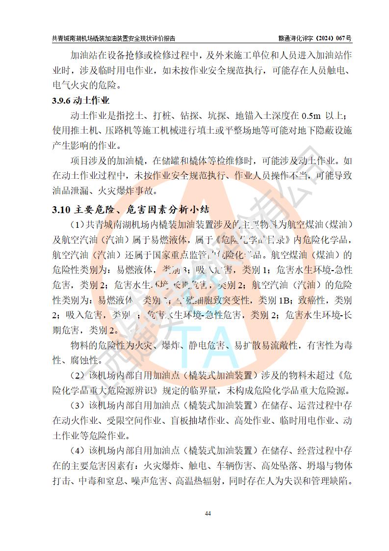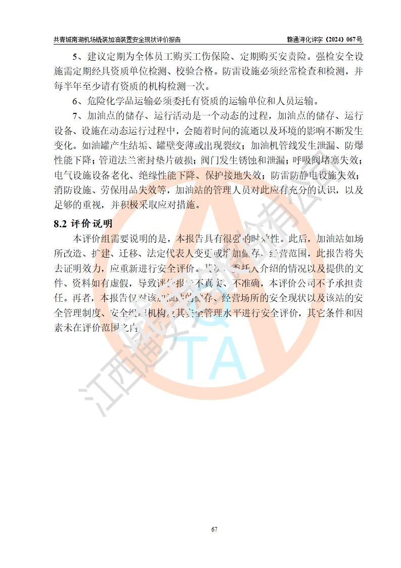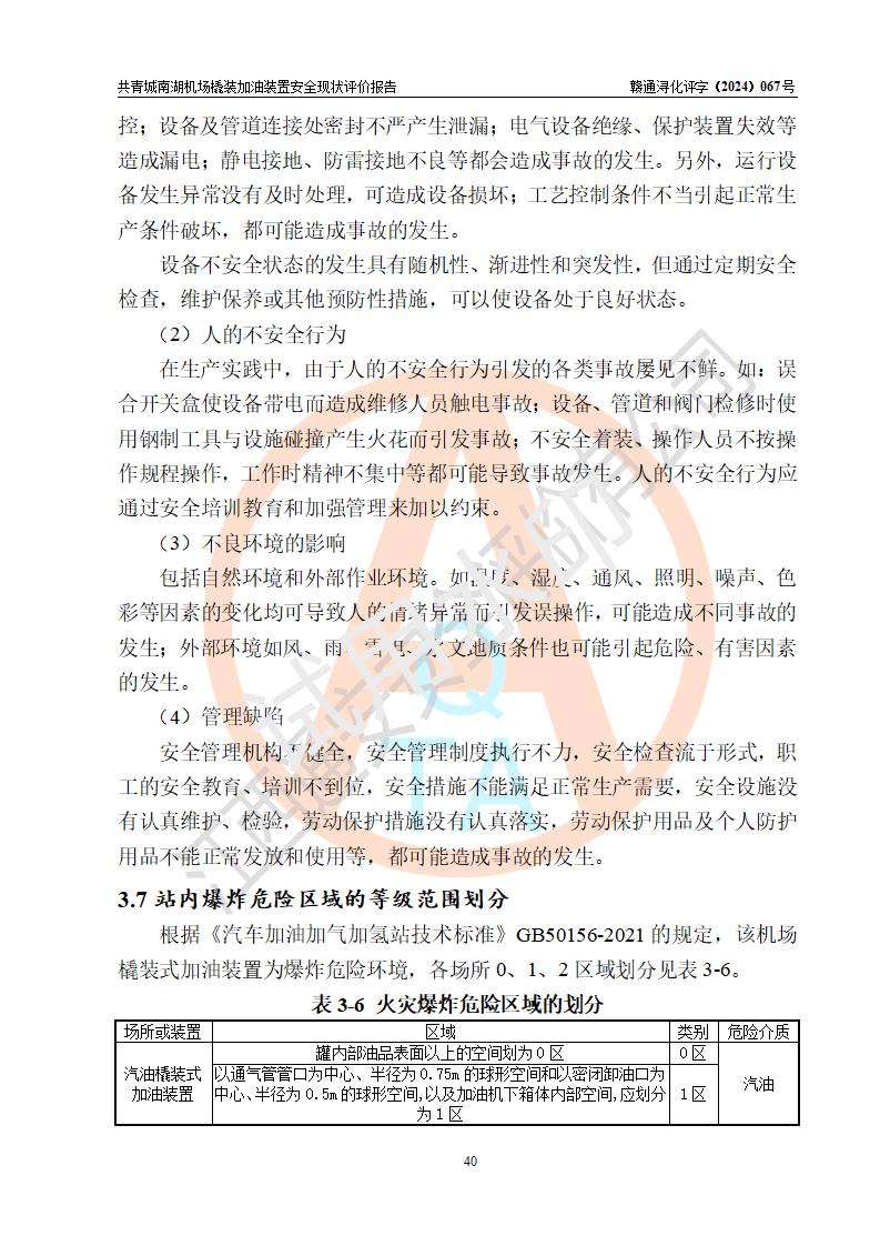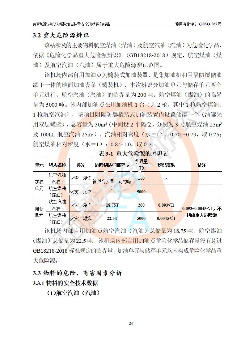评价结论 | 九共青城南湖机场内橇装加油装置涉及的安全条件、安全运营条件、安全生产管理等方面在落实本报告安全对策措施建议后,符合《通用航空供油工程建设规范》MH/T 5030-2014、《汽车加油加气加氢站技术标准》GB50156-2021、《橇装式汽车加油站技术标准》SH/T 3134-2023等**有关法规、标准、规范要求。 | |||