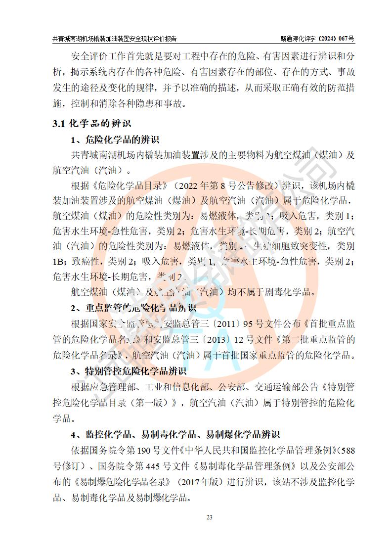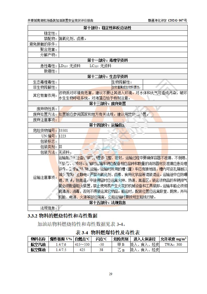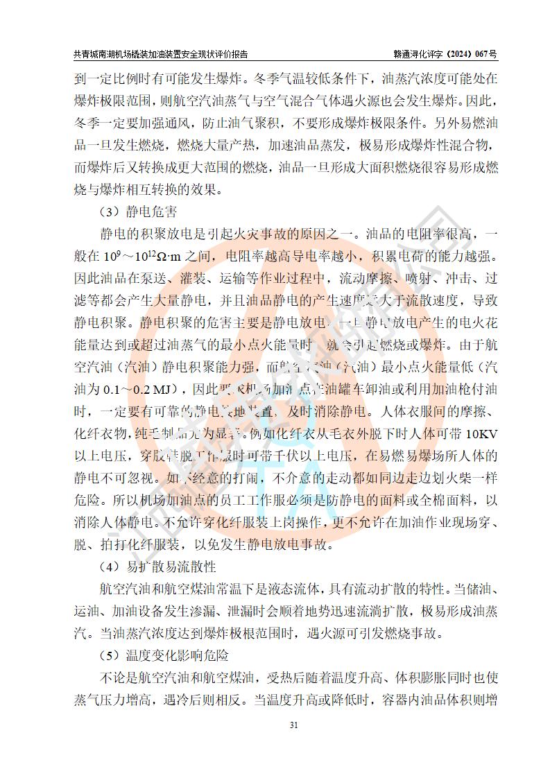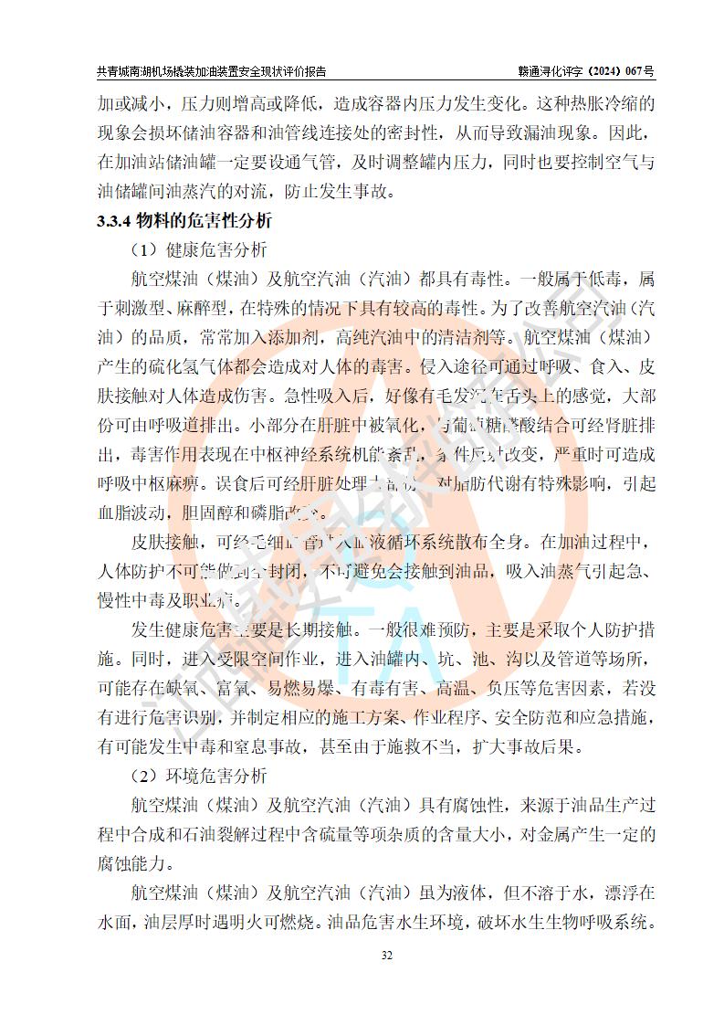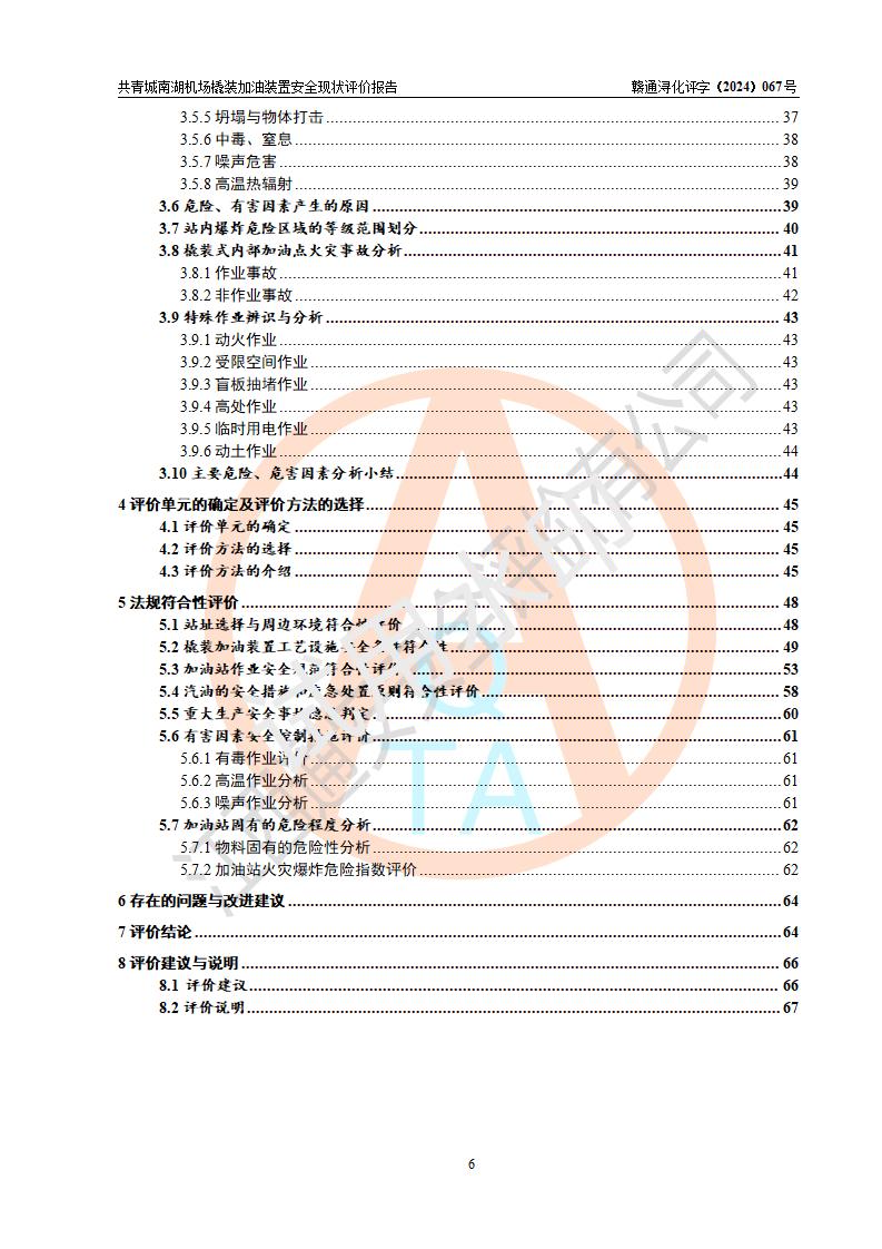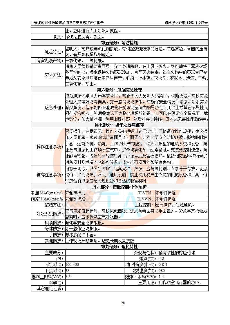 评价结论 | 九共青城南湖机场内橇装加油装置涉及的安全条件、安全运营条件、安全生产管理等方面在落实本报告安全对策措施建议后,符合《通用航空供油工程建设规范》MH/T 5030-2014、《汽车加油加气加氢站技术标准》GB50156-2021、《橇装式汽车加油站技术标准》SH/T 3134-2023等**有关法规、标准、规范要求。 | |||