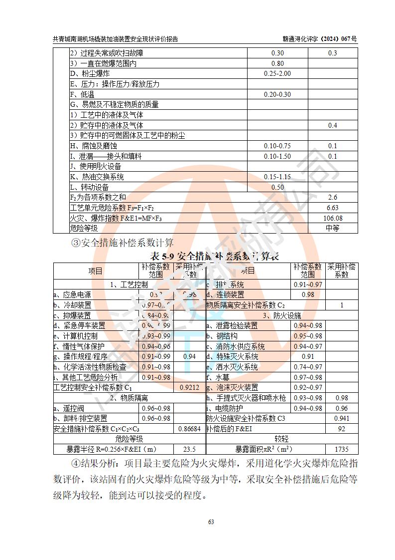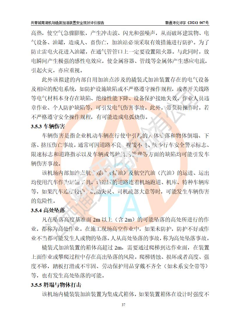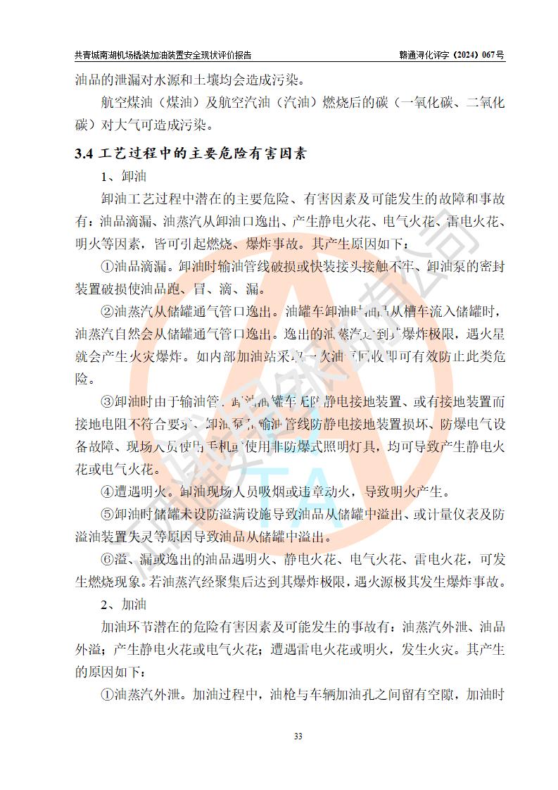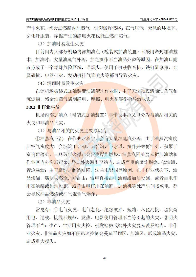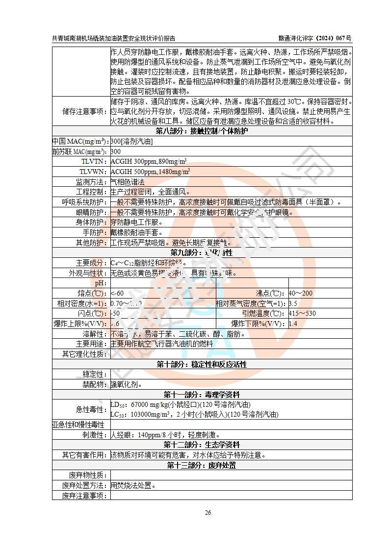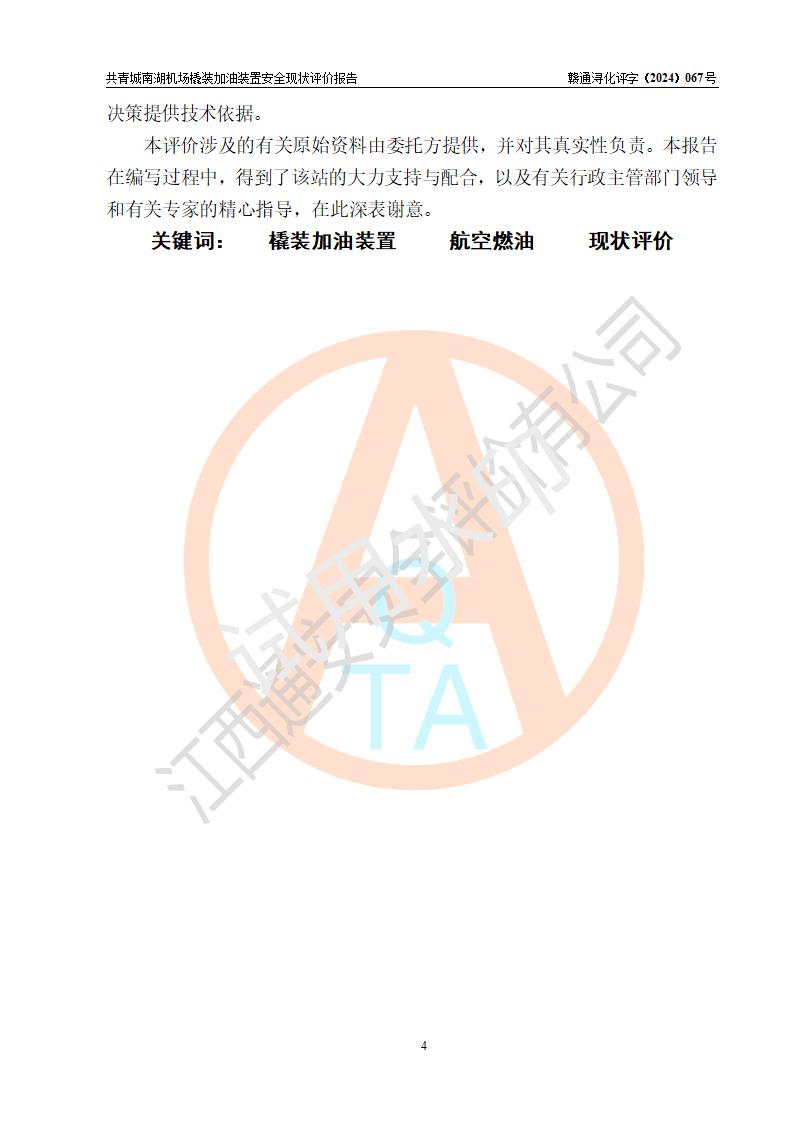 评价结论 | 九共青城南湖机场内橇装加油装置涉及的安全条件、安全运营条件、安全生产管理等方面在落实本报告安全对策措施建议后,符合《通用航空供油工程建设规范》MH/T 5030-2014、《汽车加油加气加氢站技术标准》GB50156-2021、《橇装式汽车加油站技术标准》SH/T 3134-2023等**有关法规、标准、规范要求。 | |||