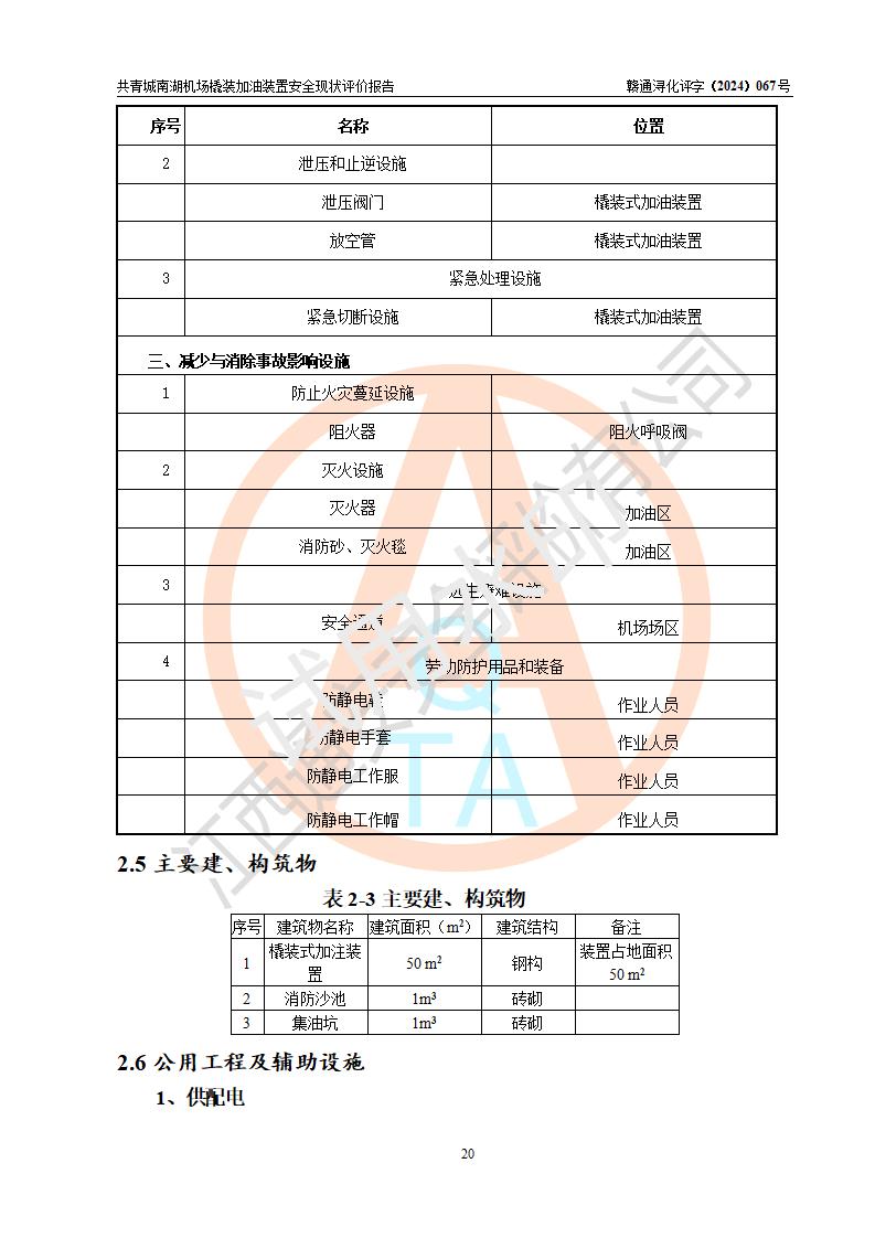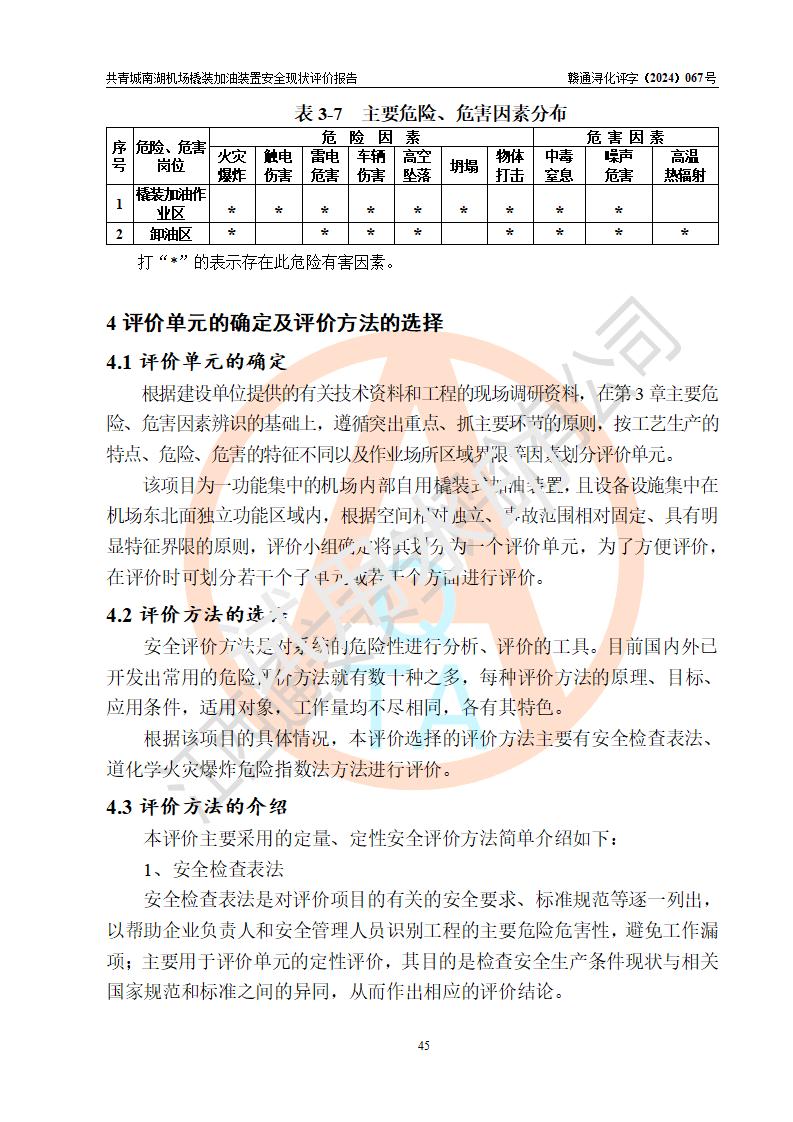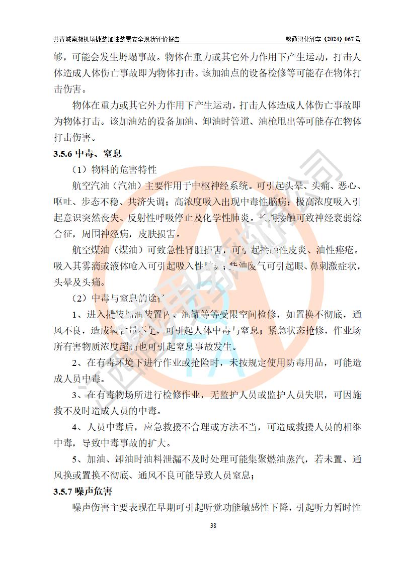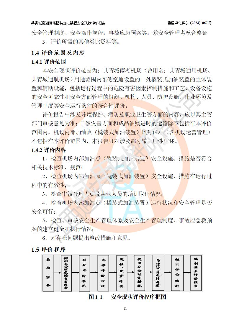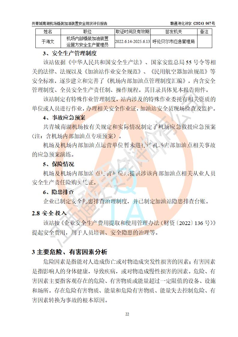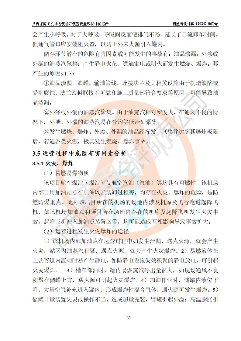 评价结论 | 九共青城南湖机场内橇装加油装置涉及的安全条件、安全运营条件、安全生产管理等方面在落实本报告安全对策措施建议后,符合《通用航空供油工程建设规范》MH/T 5030-2014、《汽车加油加气加氢站技术标准》GB50156-2021、《橇装式汽车加油站技术标准》SH/T 3134-2023等**有关法规、标准、规范要求。 | |||