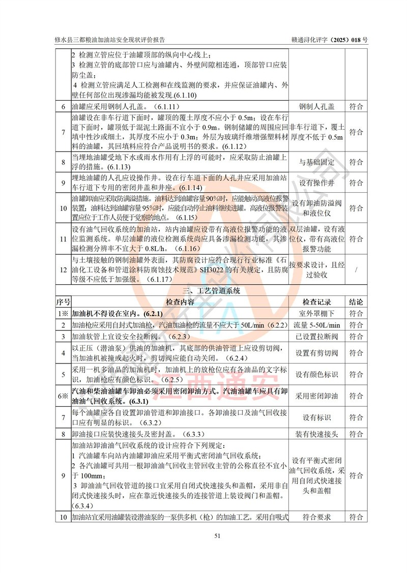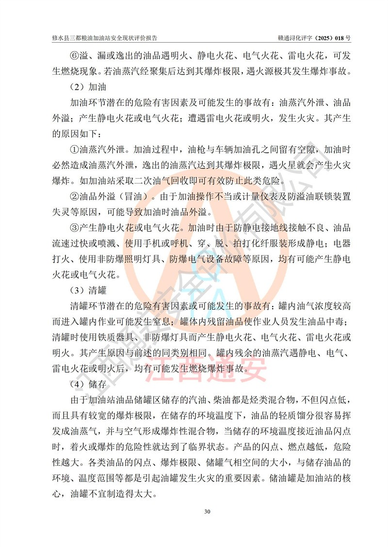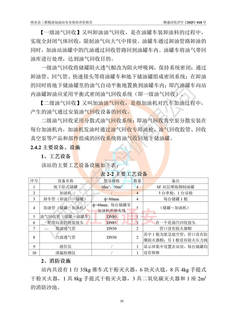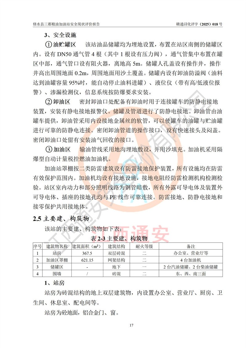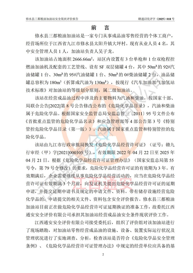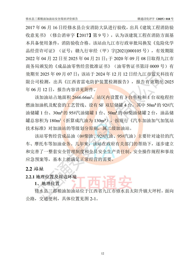 项目简介 | 修水县三都粮油加油站是一家专门从事成品油零售经营的个体工商户,经营场所位于江西省九江市修水县太阳升镇大坪村。现有从业人员4名,其中安全管理人员1人,加油站负责人吴子龙。 该加油站占地面积2666.66m2,站区内设置有3台单枪和1台双枪程控燃油加油机及配套的工艺管线、设有SF双层储罐4台,其中50m3的92#汽油储罐1台、30m3的95#汽油储罐1台、50m3的0#柴油储罐2台,油品储罐总容积为180m3(折算成汽油为130m3),按现行《汽车加油加气加氢站技术标准》对加油站的等级划分原则,属二级加油站。 该站由九江市行政审批局换发《危险化学品经营许可证》(证号:赣九行审经(甲)字[2021]000105号),**期限2022年04月22日至2025年04月21日日。 | |||