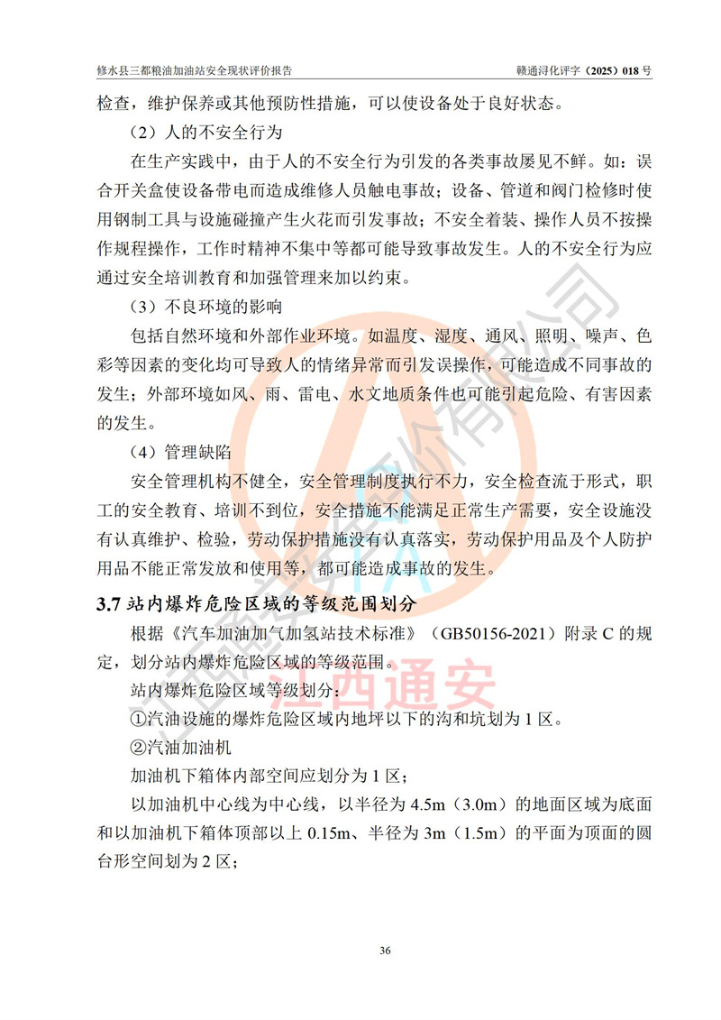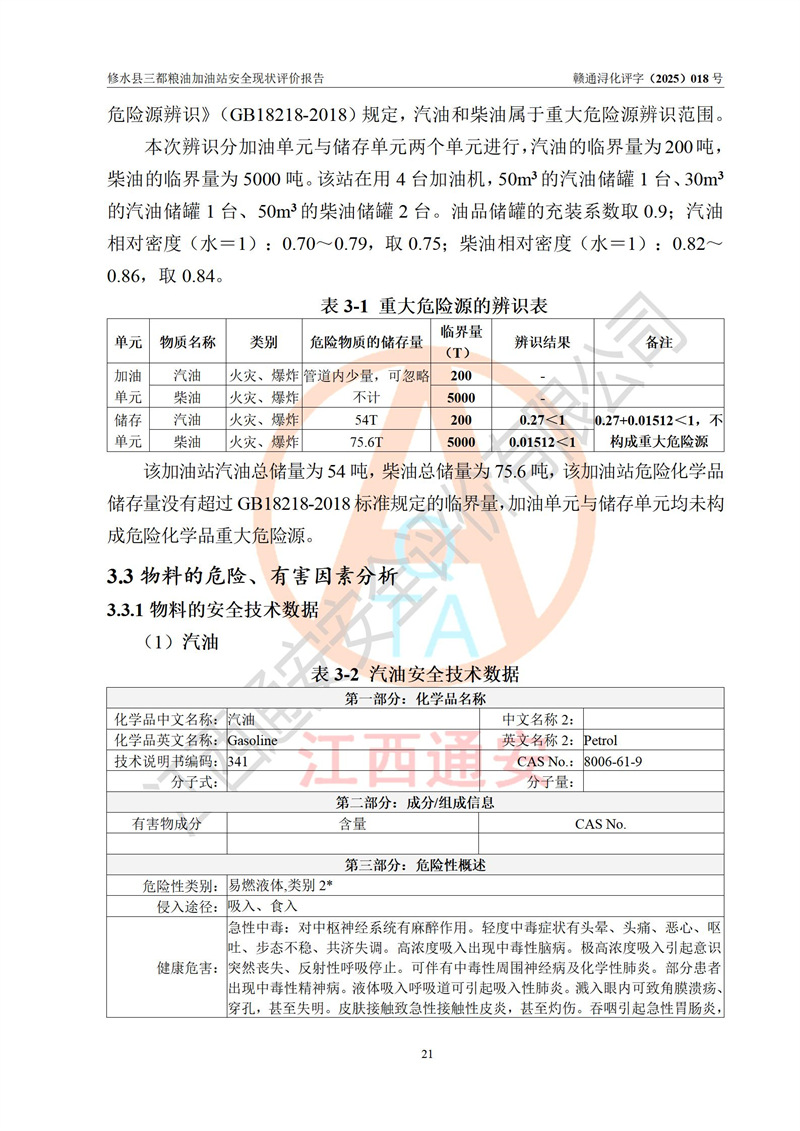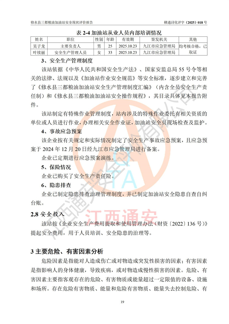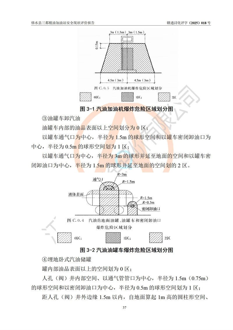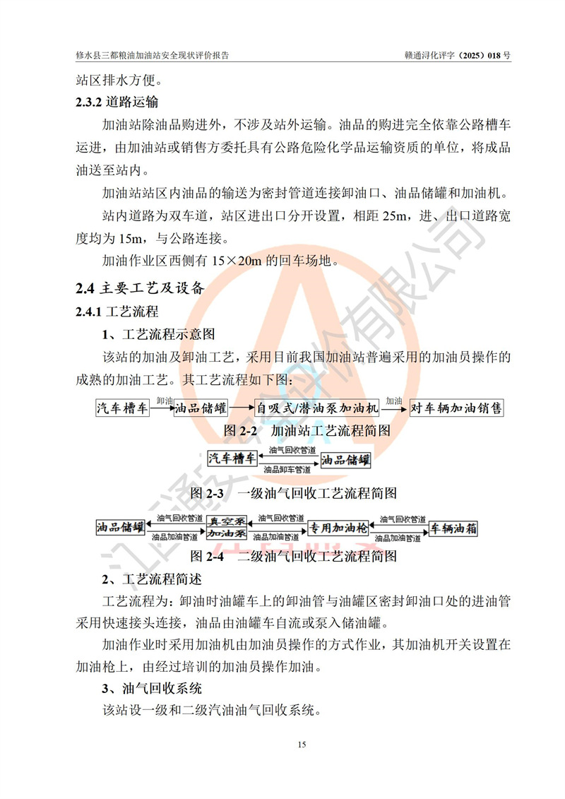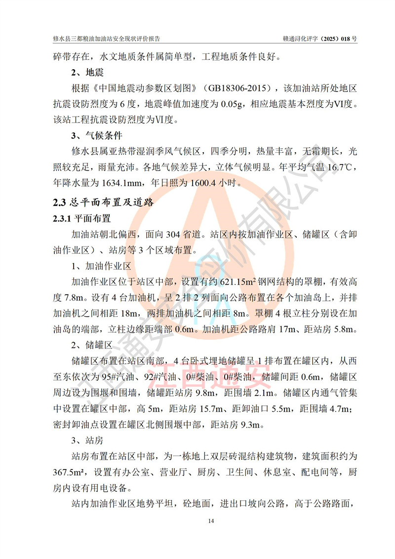 项目简介 | 修水县三都粮油加油站是一家专门从事成品油零售经营的个体工商户,经营场所位于江西省九江市修水县太阳升镇大坪村。现有从业人员4名,其中安全管理人员1人,加油站负责人吴子龙。 该加油站占地面积2666.66m2,站区内设置有3台单枪和1台双枪程控燃油加油机及配套的工艺管线、设有SF双层储罐4台,其中50m3的92#汽油储罐1台、30m3的95#汽油储罐1台、50m3的0#柴油储罐2台,油品储罐总容积为180m3(折算成汽油为130m3),按现行《汽车加油加气加氢站技术标准》对加油站的等级划分原则,属二级加油站。 该站由九江市行政审批局换发《危险化学品经营许可证》(证号:赣九行审经(甲)字[2021]000105号),**期限2022年04月22日至2025年04月21日日。 | |||