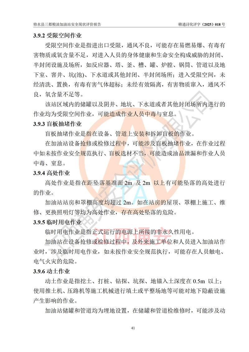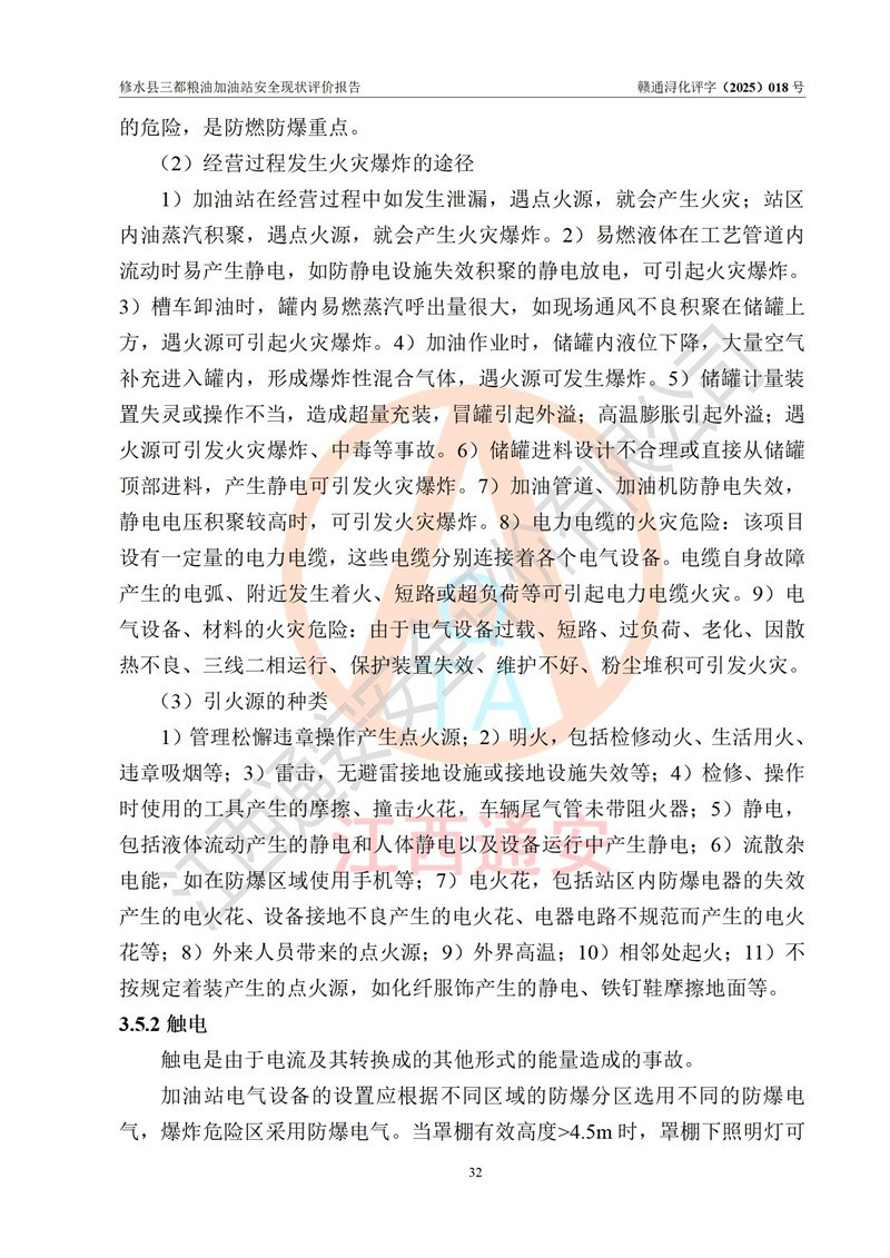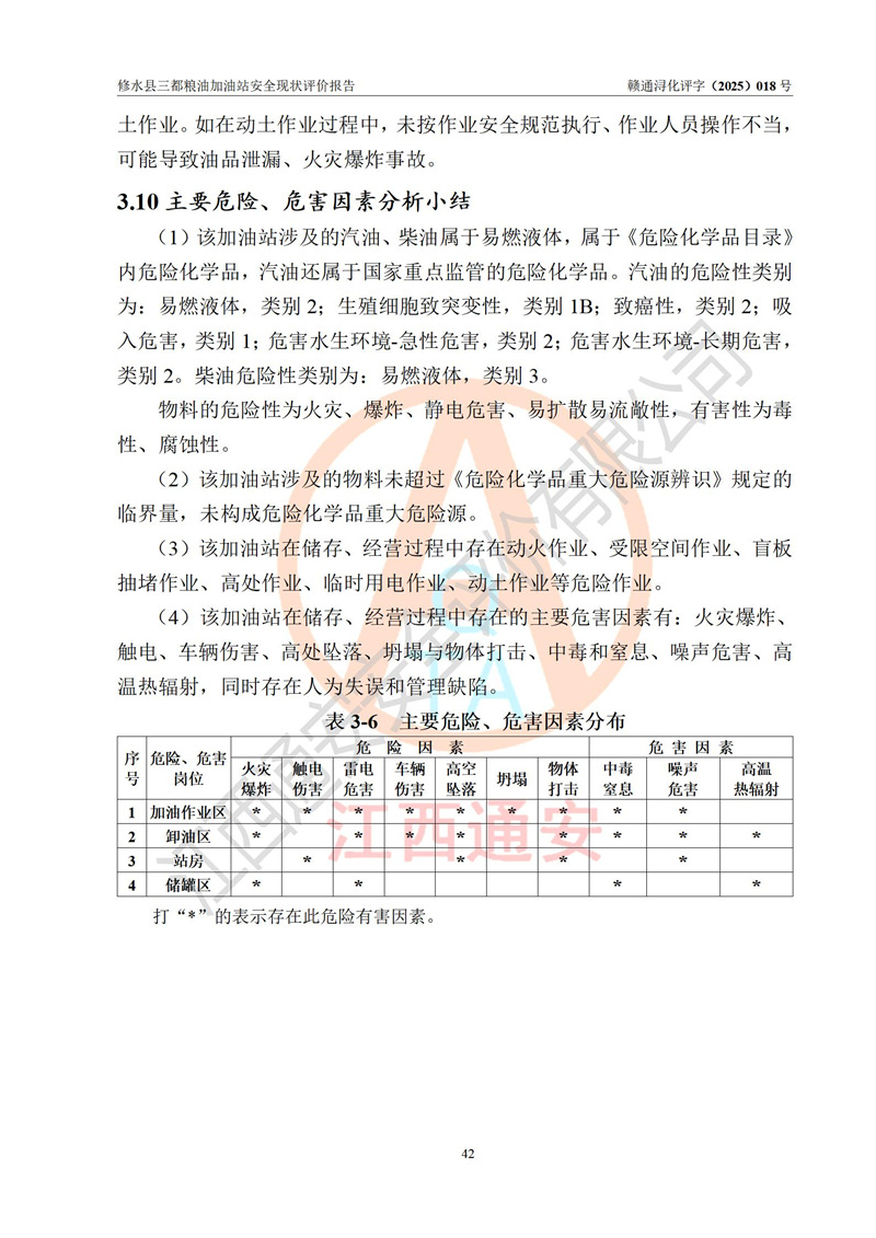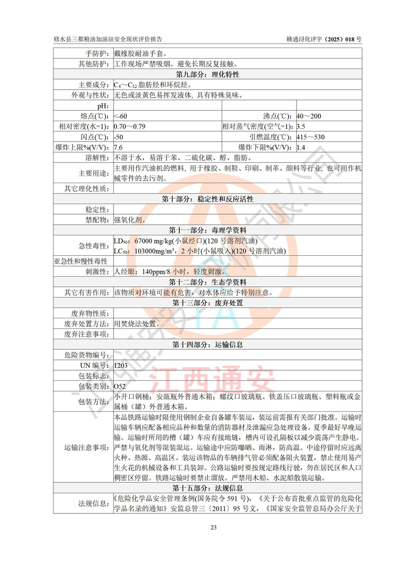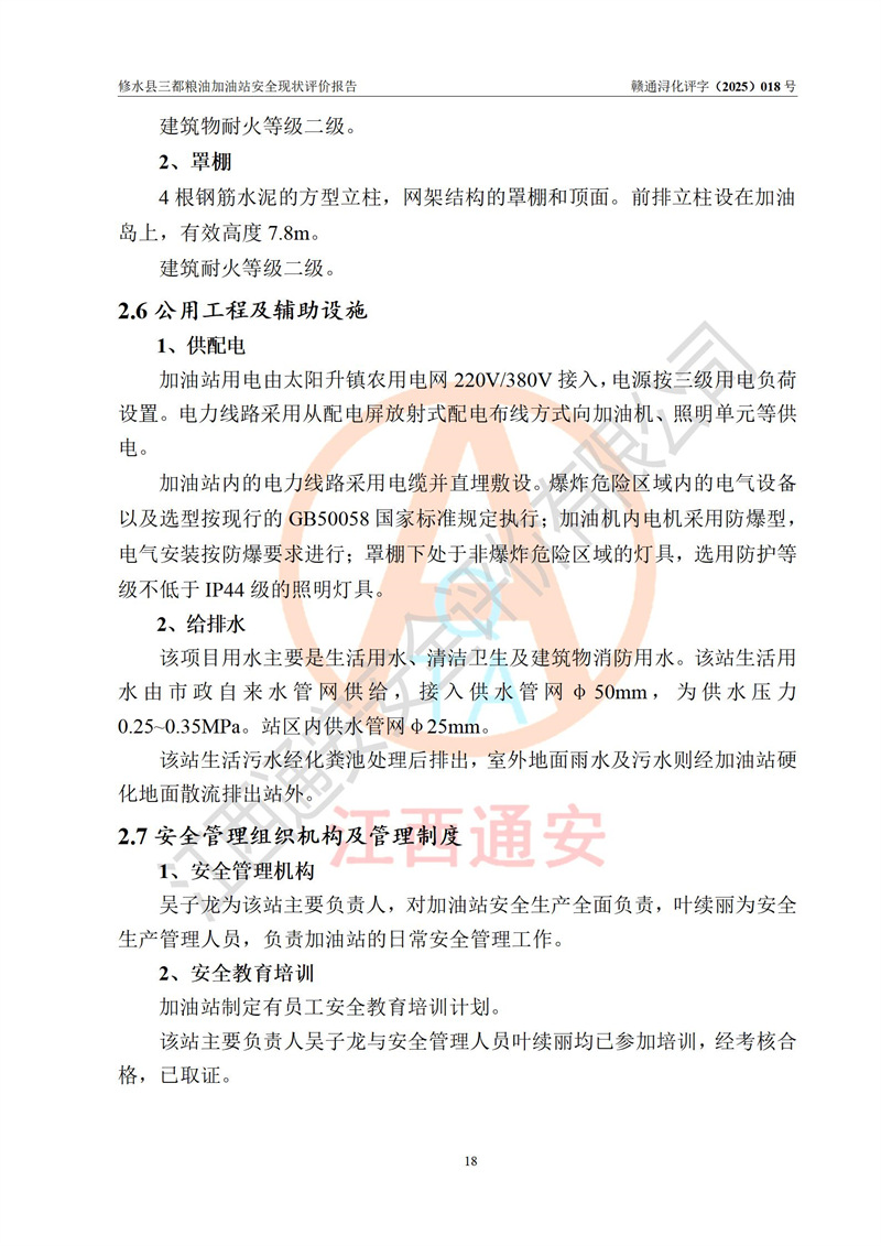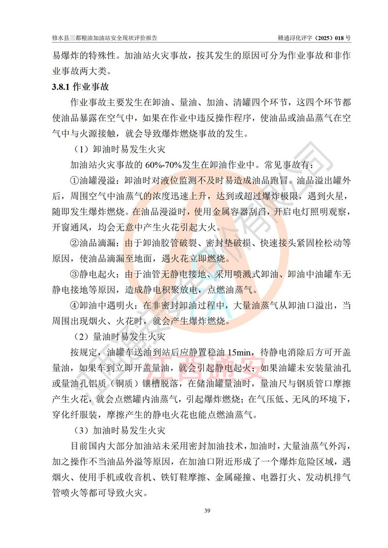 项目简介 | 修水县三都粮油加油站是一家专门从事成品油零售经营的个体工商户,经营场所位于江西省九江市修水县太阳升镇大坪村。现有从业人员4名,其中安全管理人员1人,加油站负责人吴子龙。 该加油站占地面积2666.66m2,站区内设置有3台单枪和1台双枪程控燃油加油机及配套的工艺管线、设有SF双层储罐4台,其中50m3的92#汽油储罐1台、30m3的95#汽油储罐1台、50m3的0#柴油储罐2台,油品储罐总容积为180m3(折算成汽油为130m3),按现行《汽车加油加气加氢站技术标准》对加油站的等级划分原则,属二级加油站。 该站由九江市行政审批局换发《危险化学品经营许可证》(证号:赣九行审经(甲)字[2021]000105号),**期限2022年04月22日至2025年04月21日日。 | |||