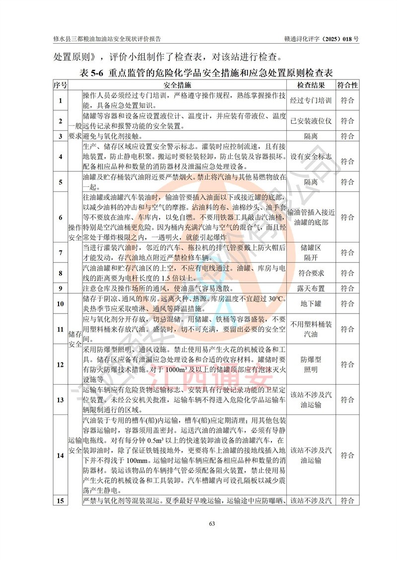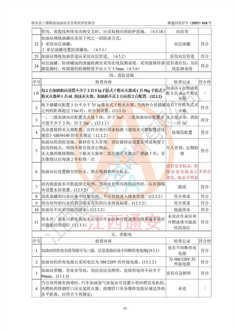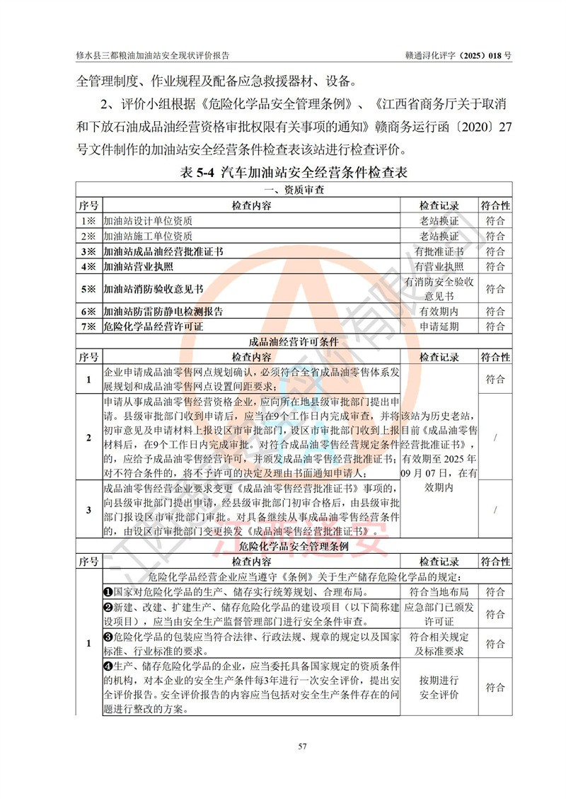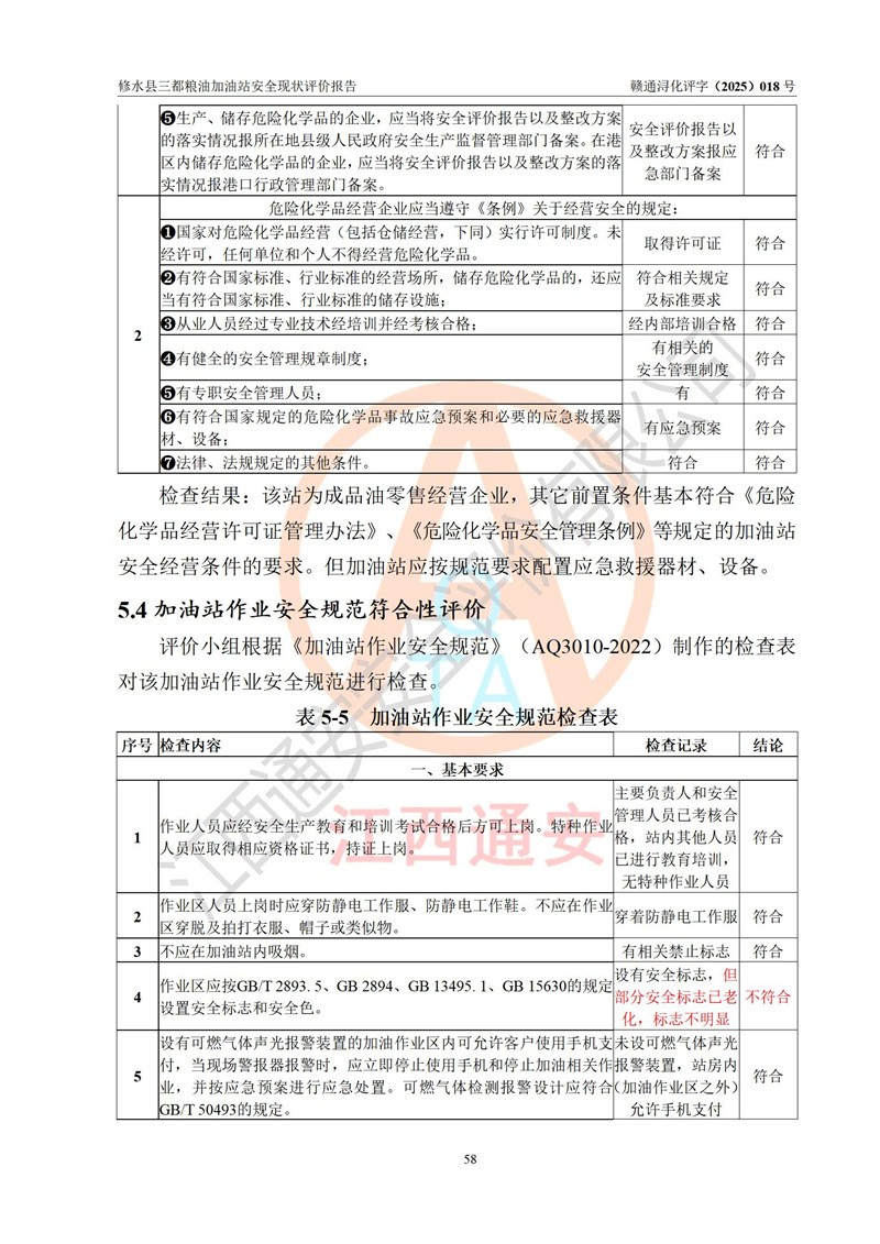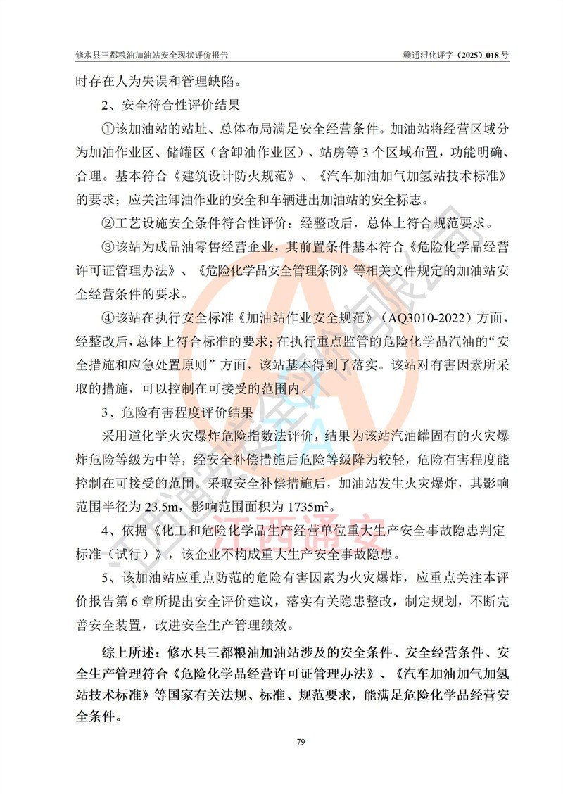 评价结论 | 修水县三都粮油加油站涉及的安全条件、安全经营条件、安全生产管理符合《危险化学品经营许可证管理办法》、《汽车加油加气加氢站技术标准》等**有关法规、标准、规范要求,能满足危险化学品经营安全条件。 | |||
