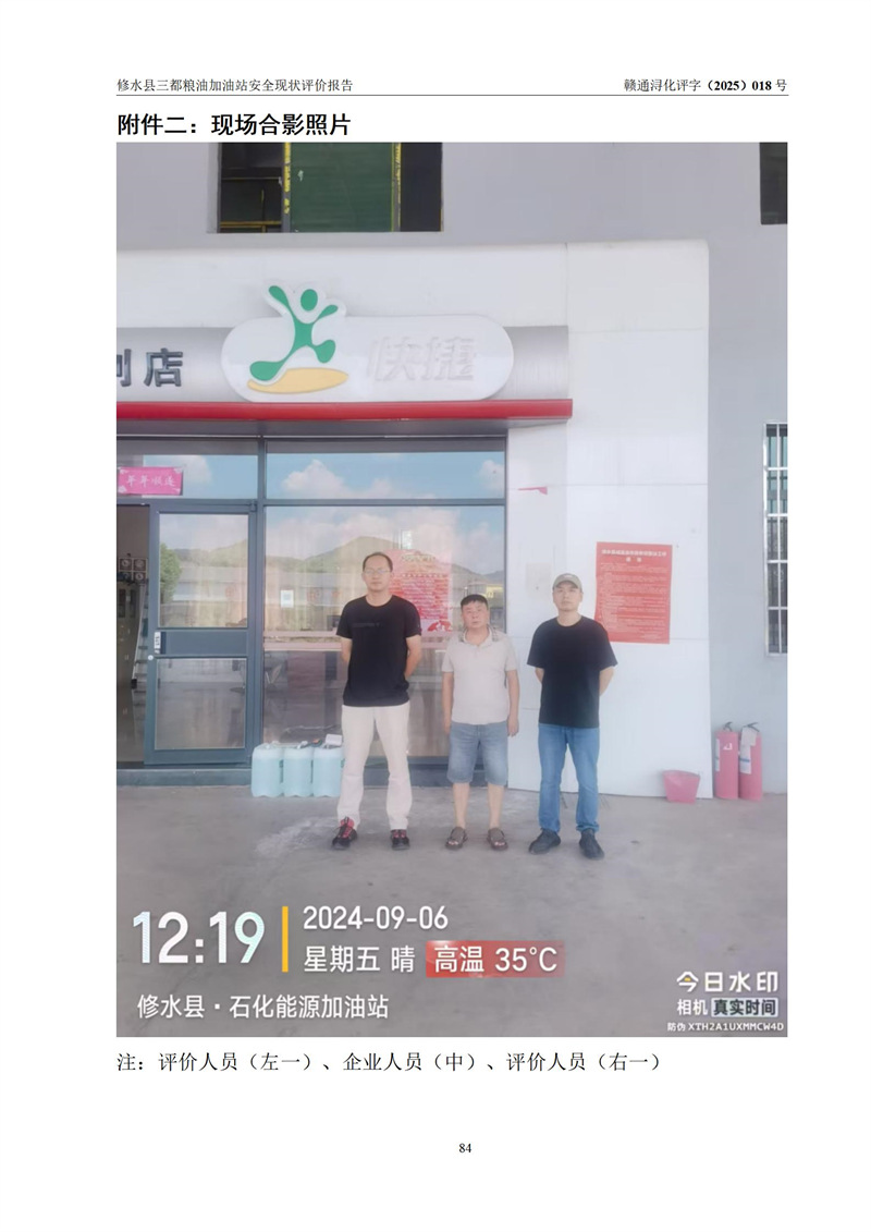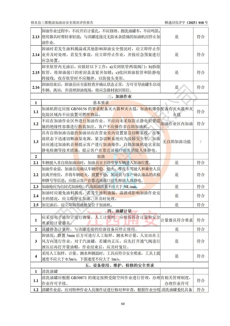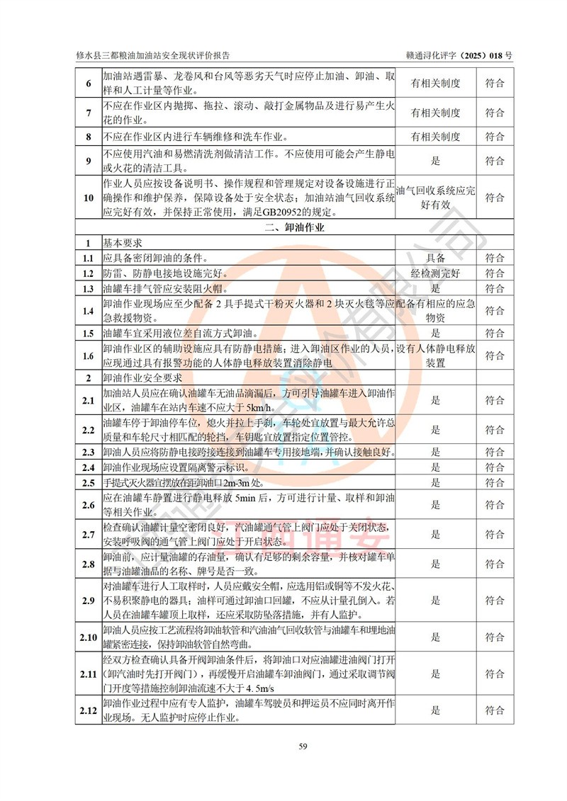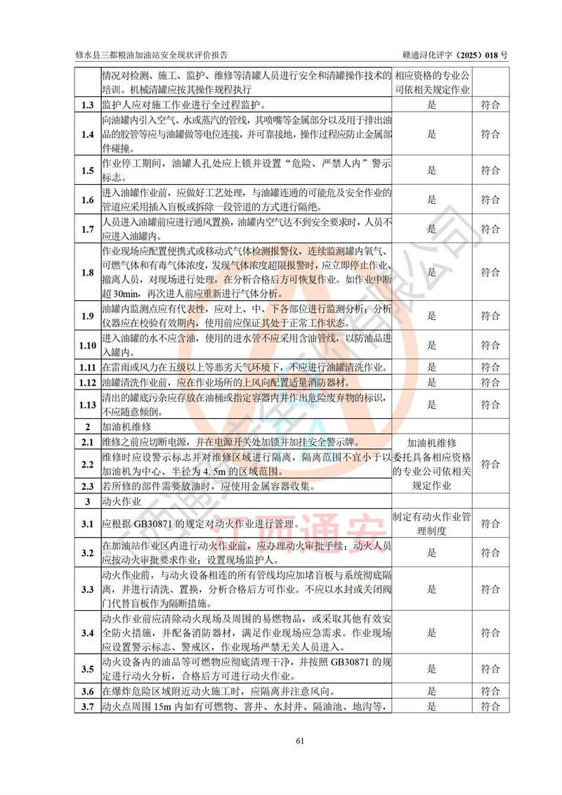 评价结论 | 修水县三都粮油加油站涉及的安全条件、安全经营条件、安全生产管理符合《危险化学品经营许可证管理办法》、《汽车加油加气加氢站技术标准》等**有关法规、标准、规范要求,能满足危险化学品经营安全条件。 | |||