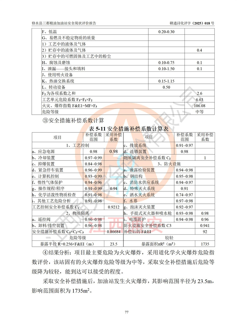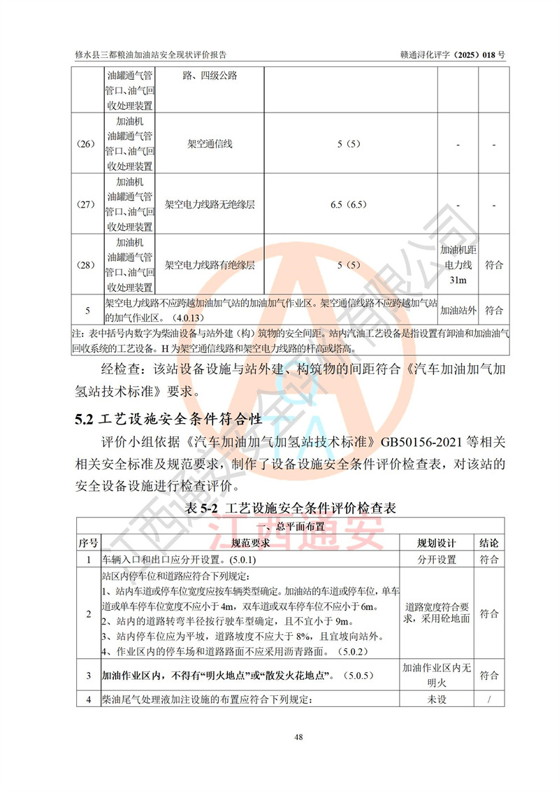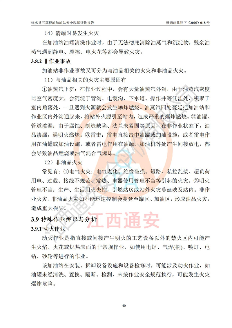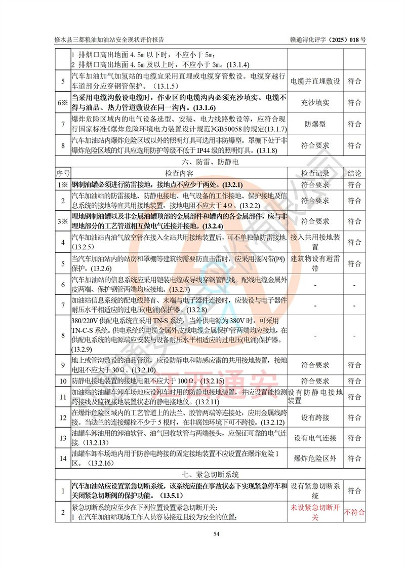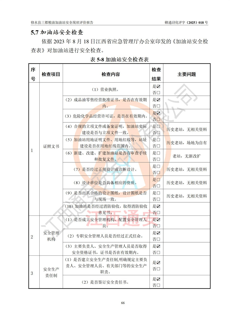 评价结论 | 修水县三都粮油加油站涉及的安全条件、安全经营条件、安全生产管理符合《危险化学品经营许可证管理办法》、《汽车加油加气加氢站技术标准》等**有关法规、标准、规范要求,能满足危险化学品经营安全条件。 | |||
