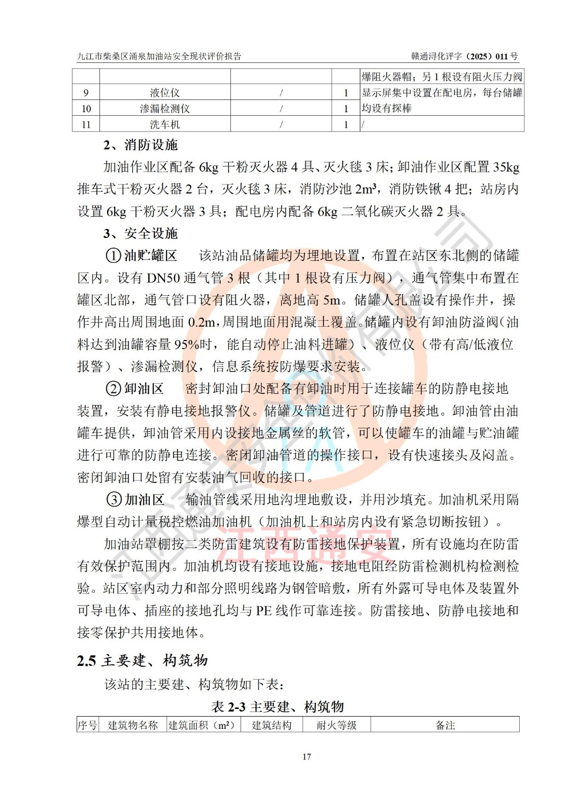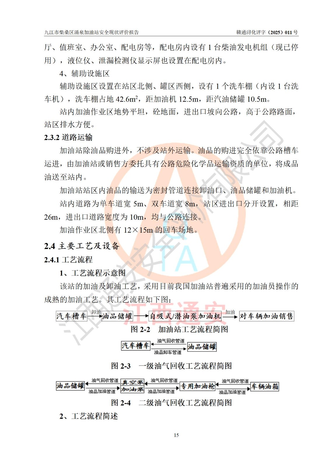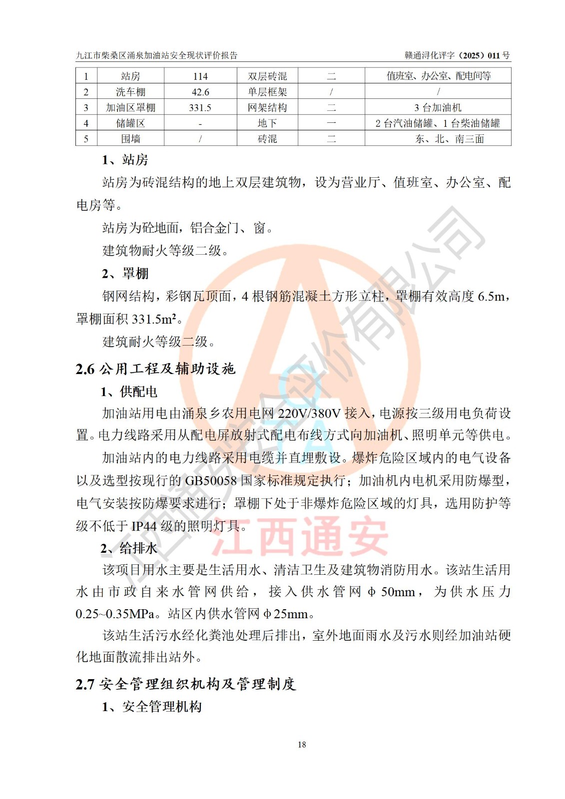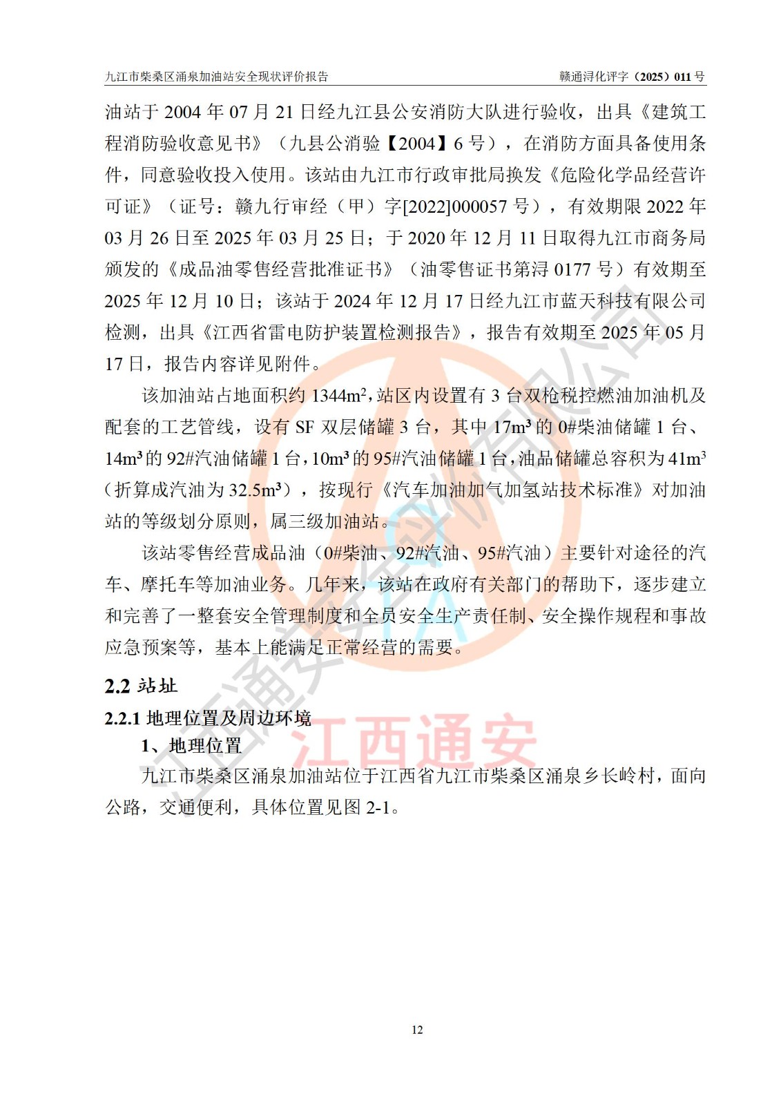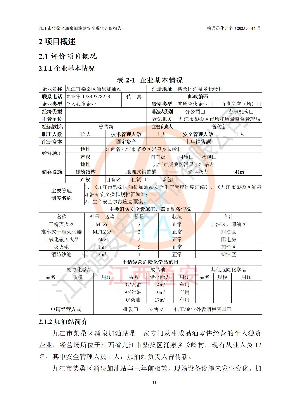 项目简介 | 九江市柴桑区涌泉加油站是一家专门从事成品油零售经营的个人独资企业,经营场所位于江西省九江市柴桑区涌泉乡长岭村。现有从业人员12名,其中安全管理人员1人,加油站负责人曾传新。 该加油站占地面积约1344m2,站区内设置有3台双枪税控燃油加油机及配套的工艺管线,设有SF双层储罐3台,其中17m3的0#柴油储罐1台、14m3的92#汽油储罐1台,10m3的95#汽油储罐1台,油品储罐总容积为41m3(折算成汽油为32.5m3),按现行《汽车加油加气加氢站技术标准》对加油站的等级划分原则,属三级加油站。 该站由九江市行政审批局换发《危险化学品经营许可证》(证号:赣九行审经(甲)字[2022]000057号),**期限2022年03月26日至2025年03月25日。 | |||