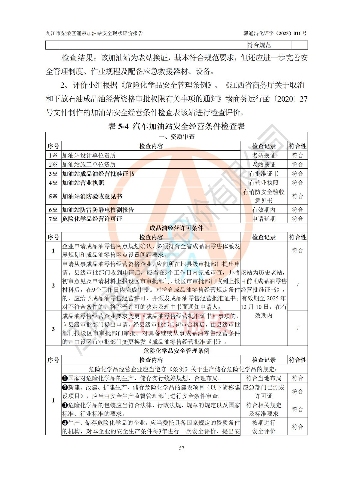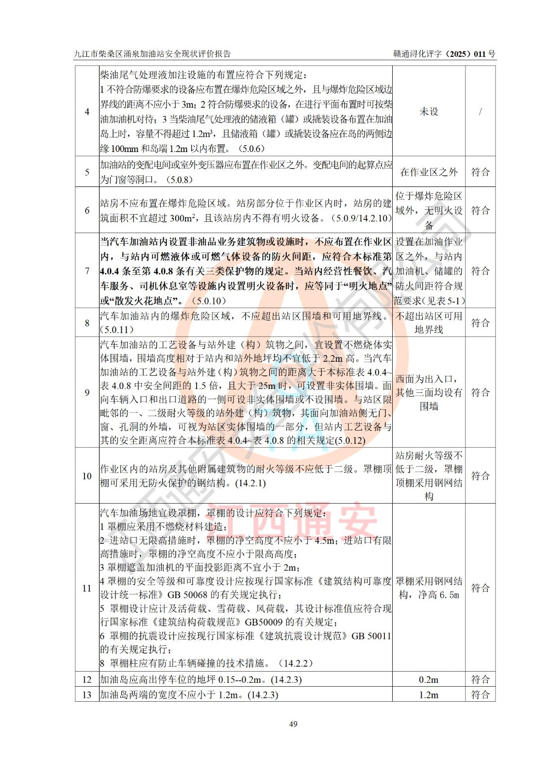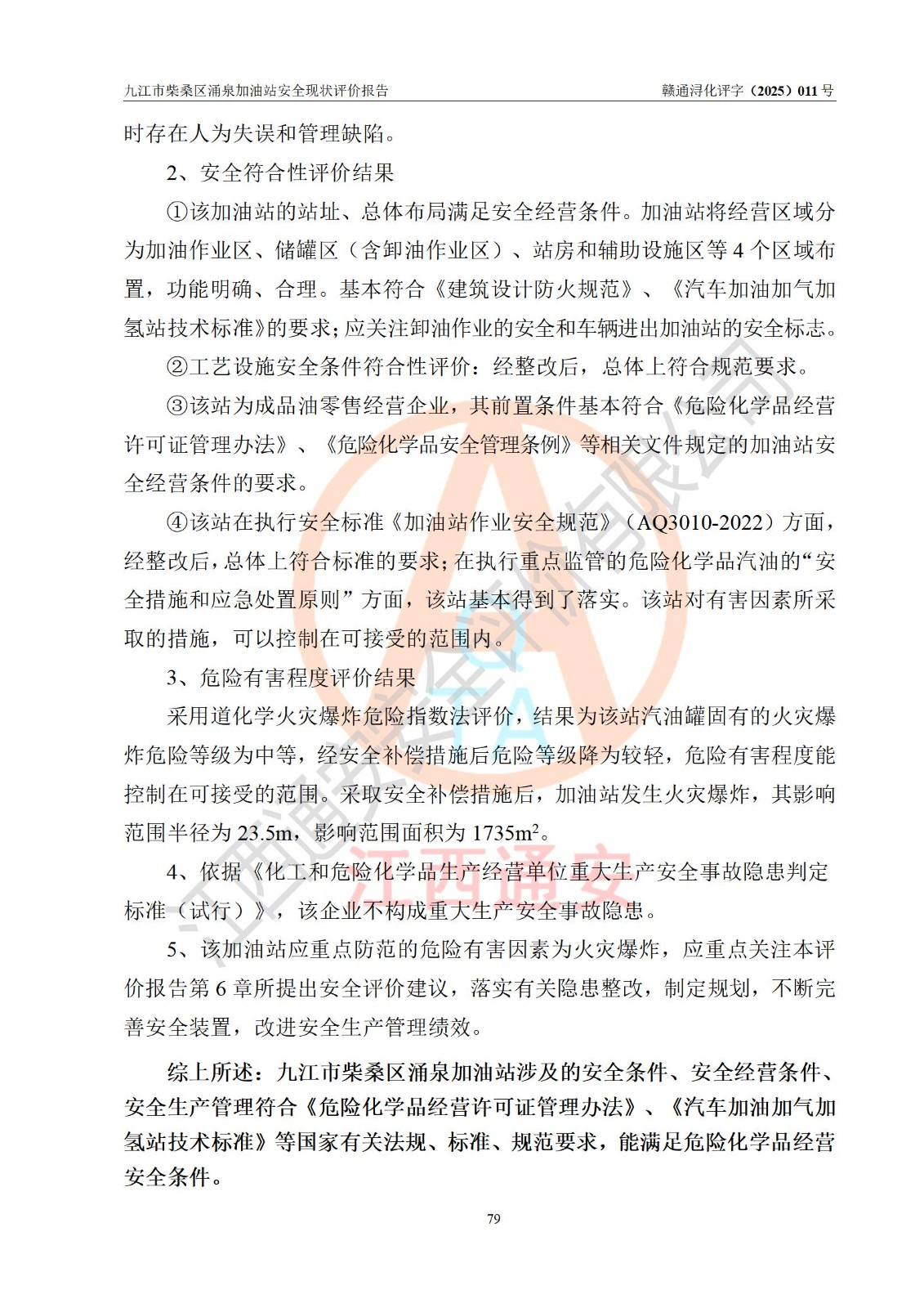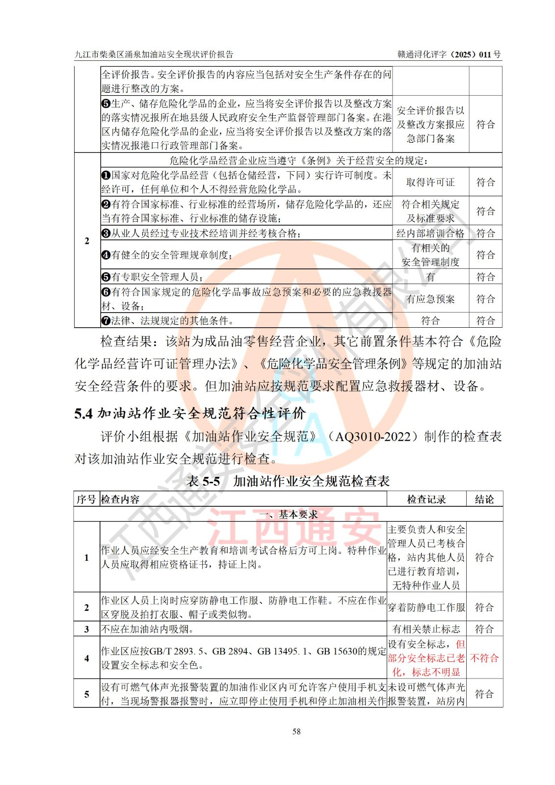 评价结论 | 九江市柴桑区涌泉加油站涉及的安全条件、安全经营条件、安全生产管理符合《危险化学品经营许可证管理办法》、《汽车加油加气加氢站技术标准》等**有关法规、标准、规范要求,能满足危险化学品经营安全条件。 | |||