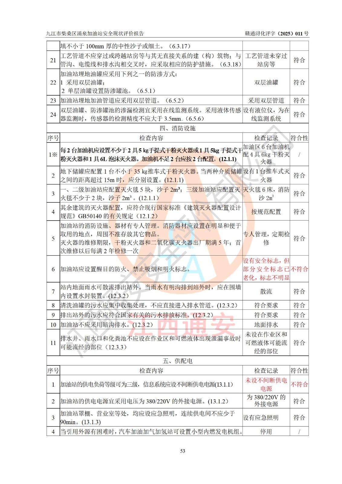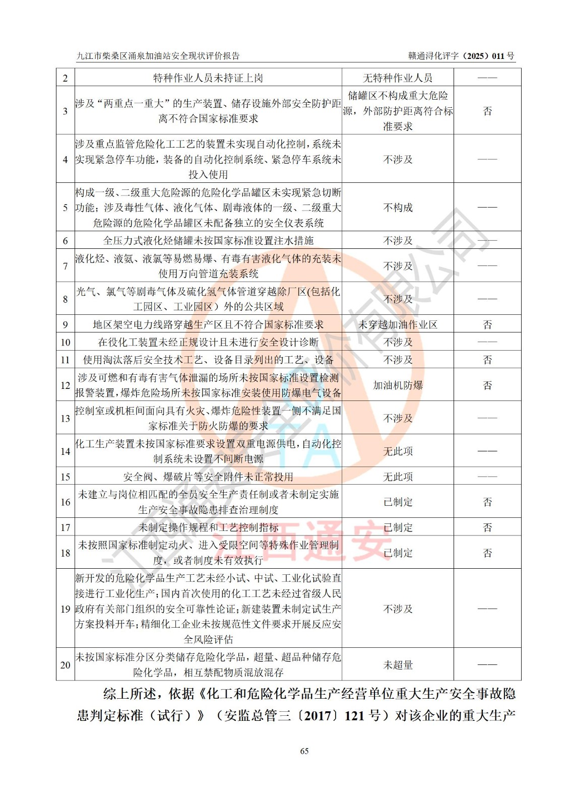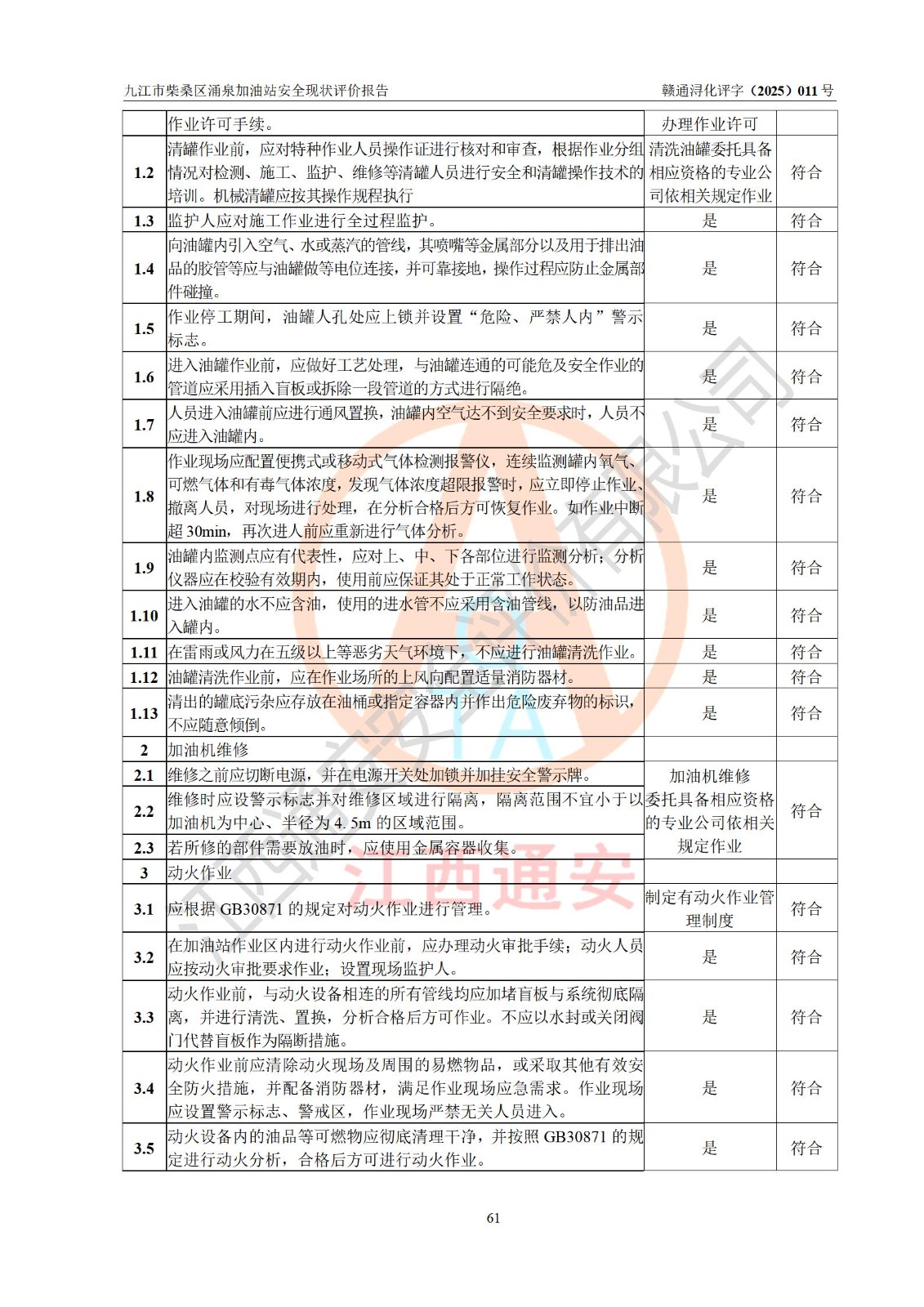 评价结论 | 九江市柴桑区涌泉加油站涉及的安全条件、安全经营条件、安全生产管理符合《危险化学品经营许可证管理办法》、《汽车加油加气加氢站技术标准》等**有关法规、标准、规范要求,能满足危险化学品经营安全条件。 | |||
