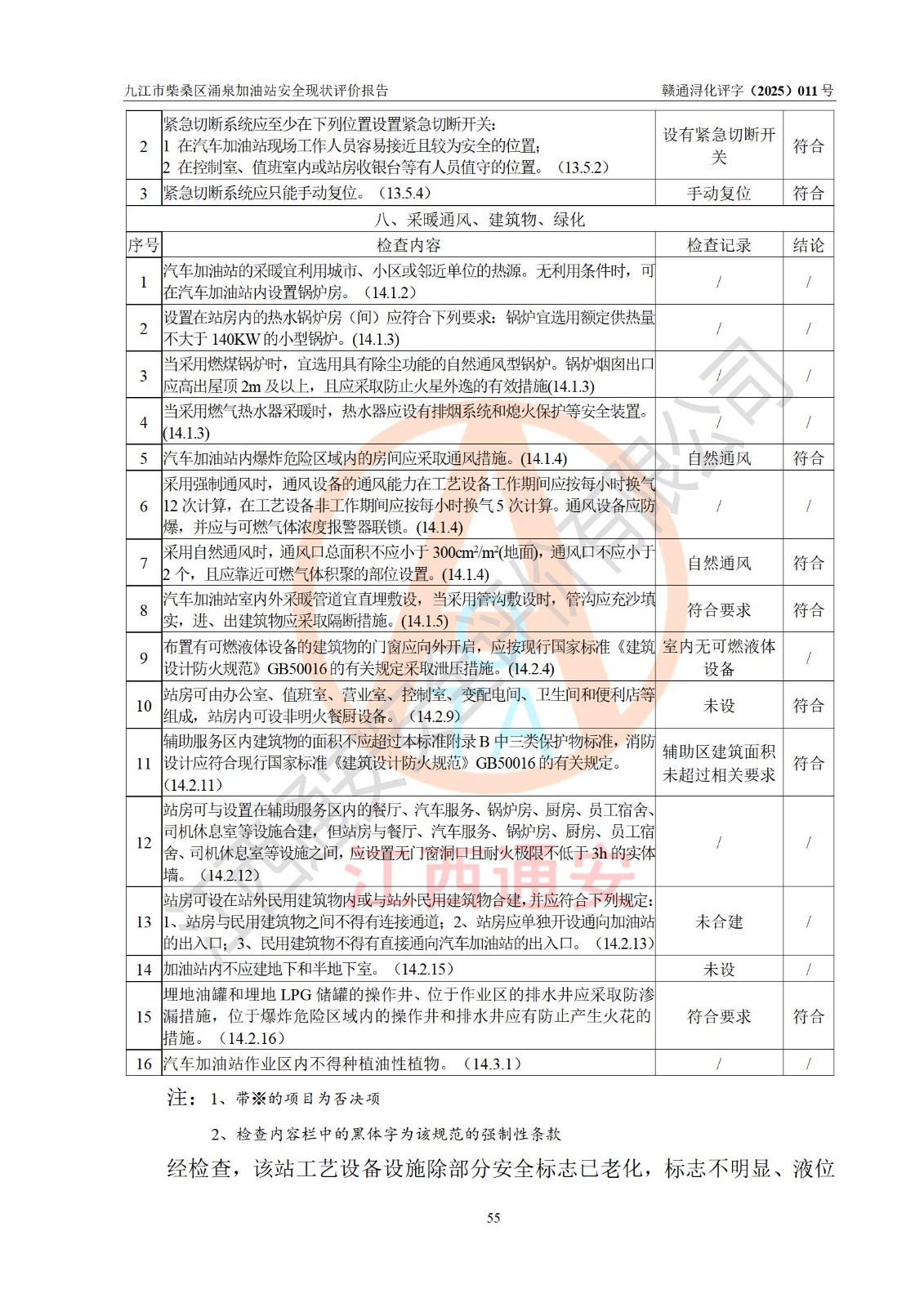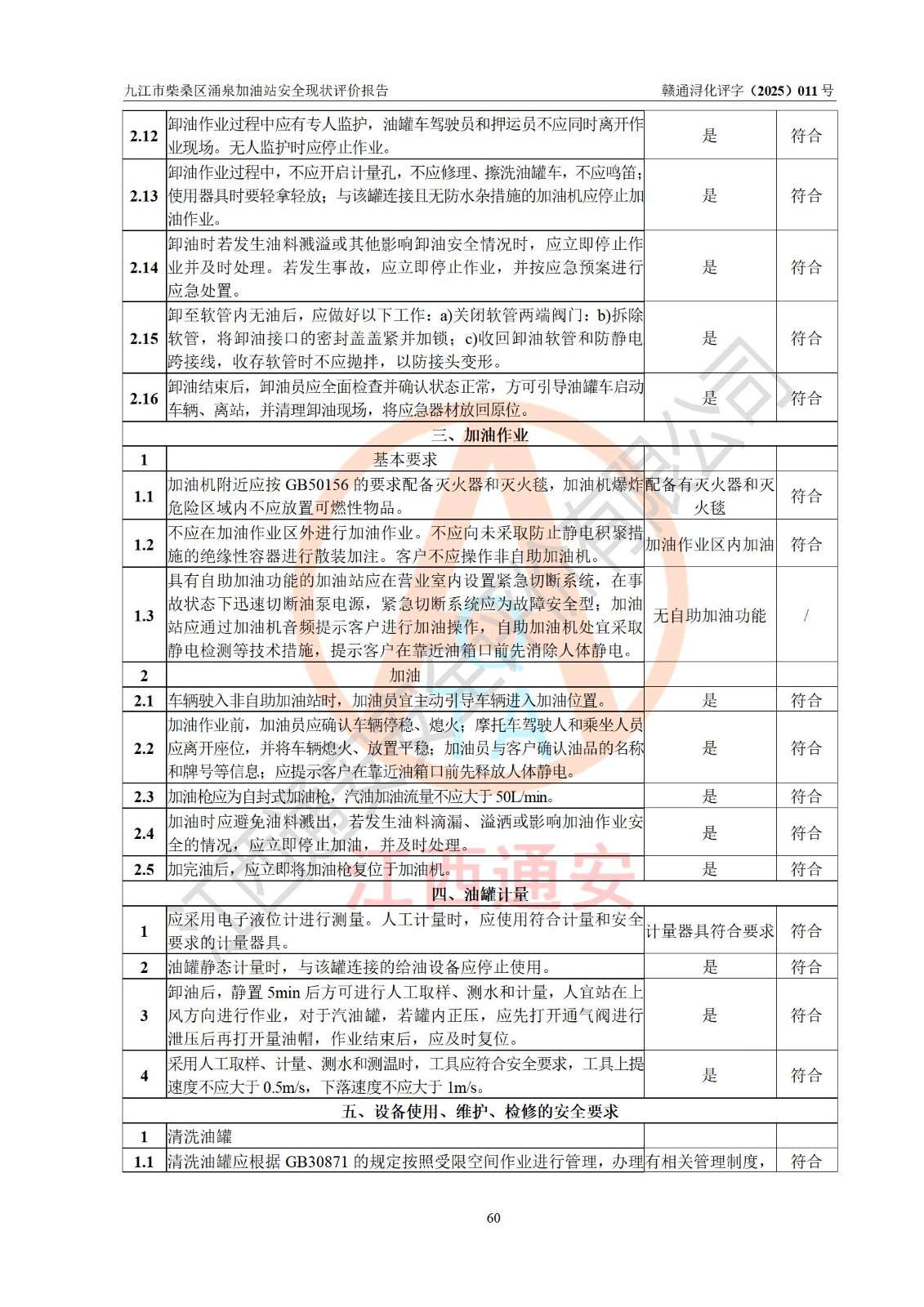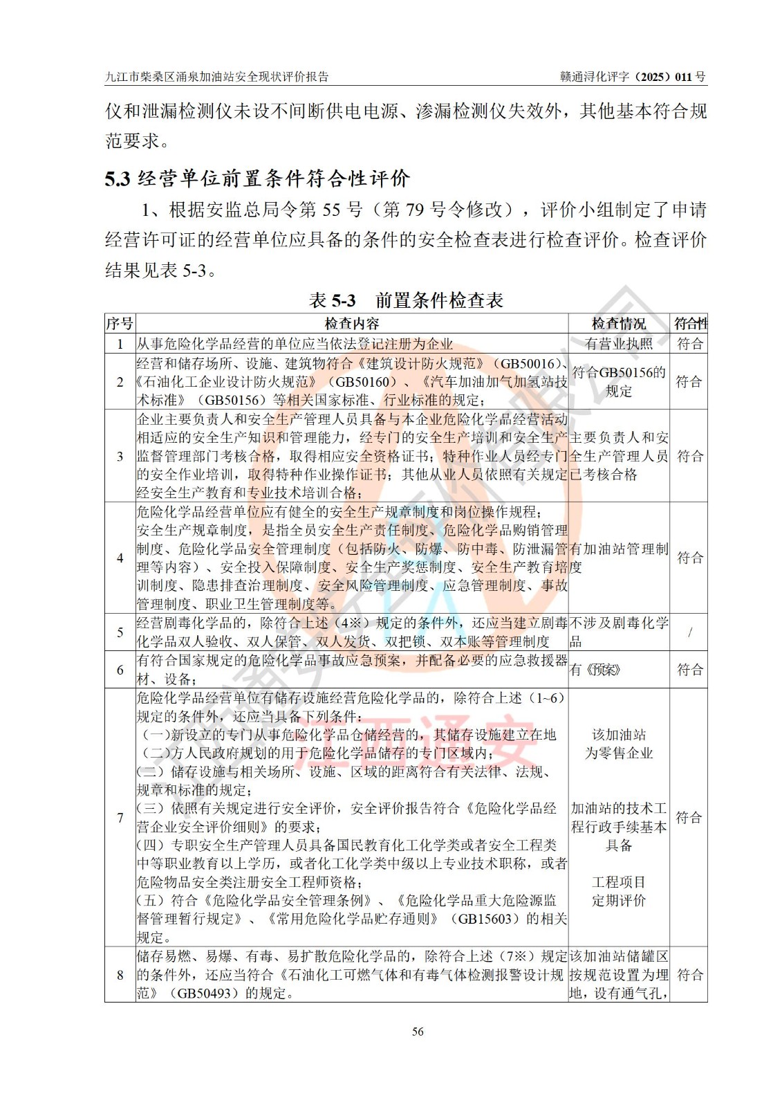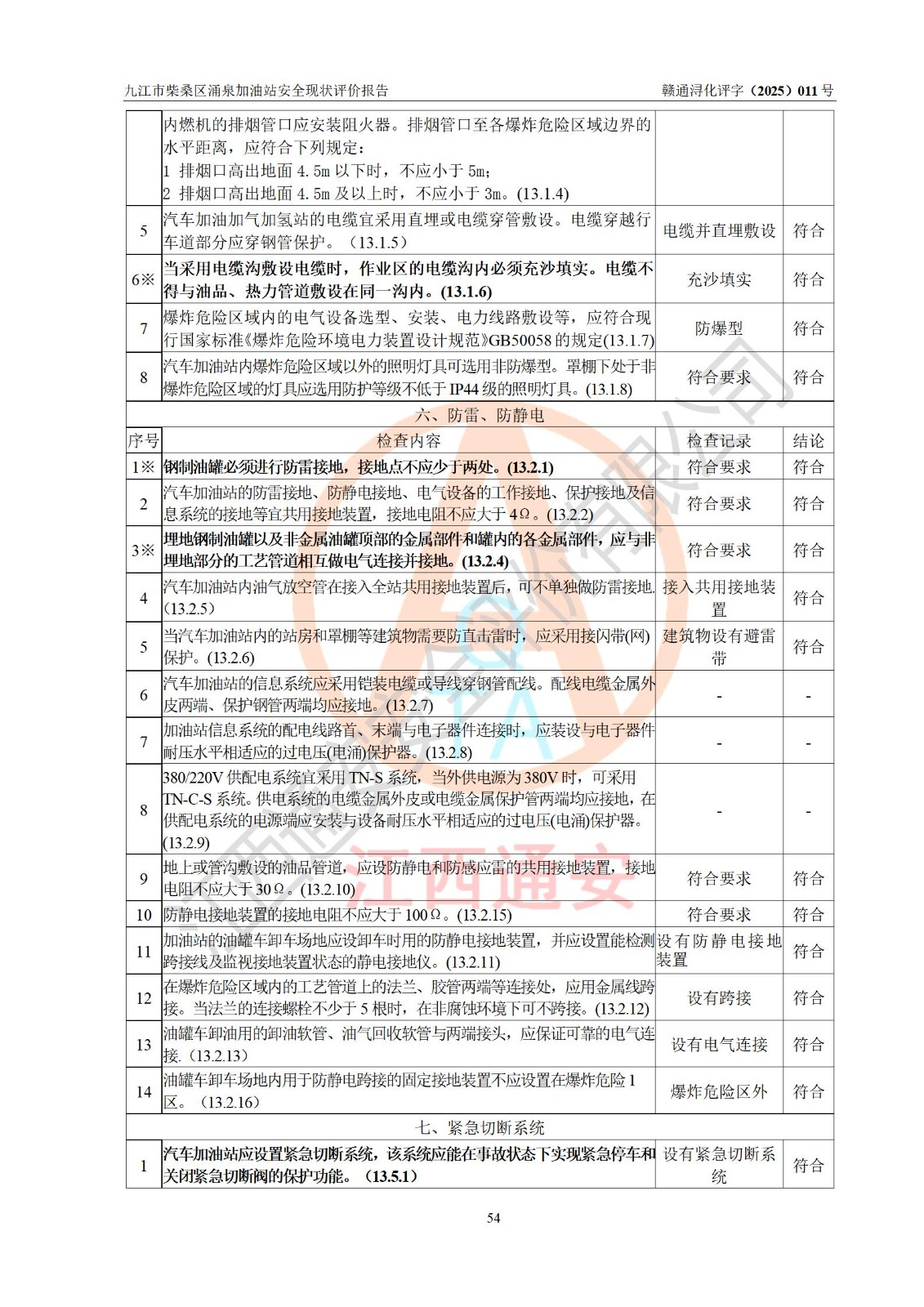 评价结论 | 九江市柴桑区涌泉加油站涉及的安全条件、安全经营条件、安全生产管理符合《危险化学品经营许可证管理办法》、《汽车加油加气加氢站技术标准》等**有关法规、标准、规范要求,能满足危险化学品经营安全条件。 | |||