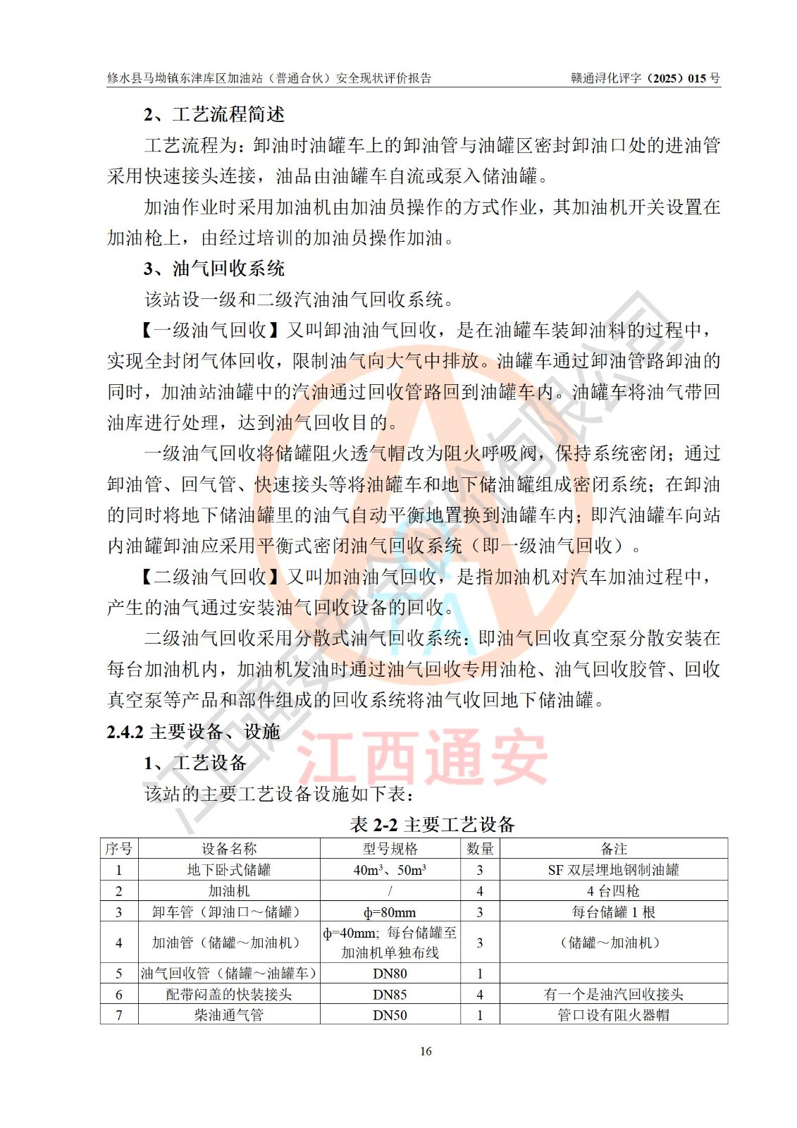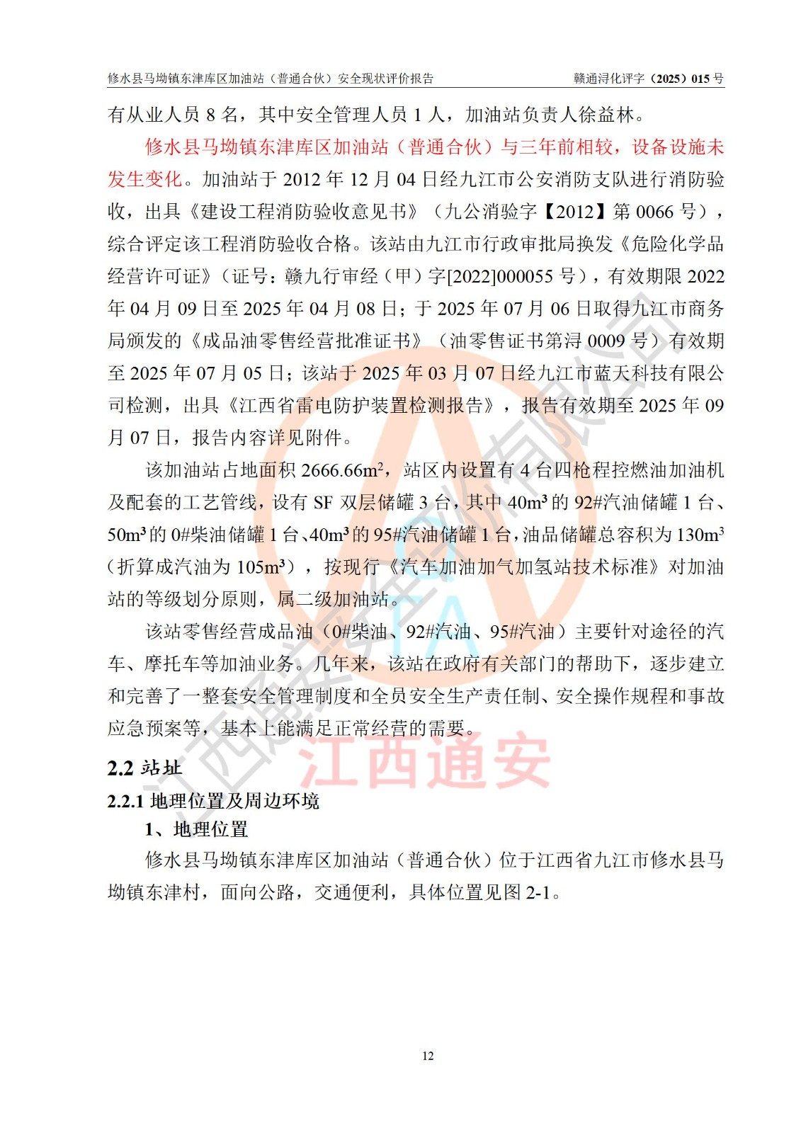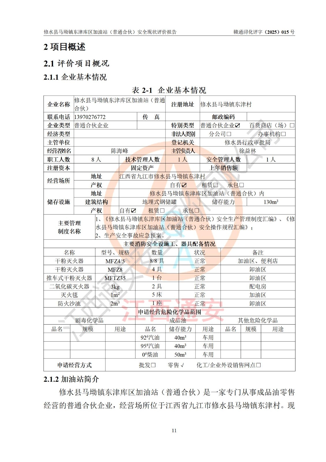 项目简介 | 修水县马坳镇东津库区加油站(普通合伙)是一家专门从事成品油零售经营的普通合伙企业,经营场所位于江西省九江市修水县马坳镇东津村。现有从业人员8名,其中安全管理人员1人,加油站负责人徐益林。 该加油站占地面积2666.66m2,站区内设置有4台四枪程控燃油加油机及配套的工艺管线,设有SF双层储罐3台,其中40m3的92#汽油储罐1台、50m3的0#柴油储罐1台、40m3的95#汽油储罐1台,油品储罐总容积为130m3(折算成汽油为105m3),按现行《汽车加油加气加氢站技术标准》对加油站的等级划分原则,属二级加油站。 该站由九江市行政审批局换发《危险化学品经营许可证》(证号:赣九行审经(甲)字[2022]000055号),**期限2022年04月09日至2025年04月08日。 | |||