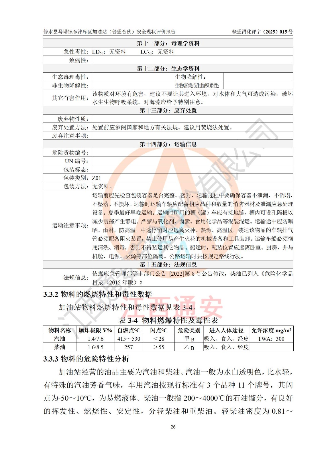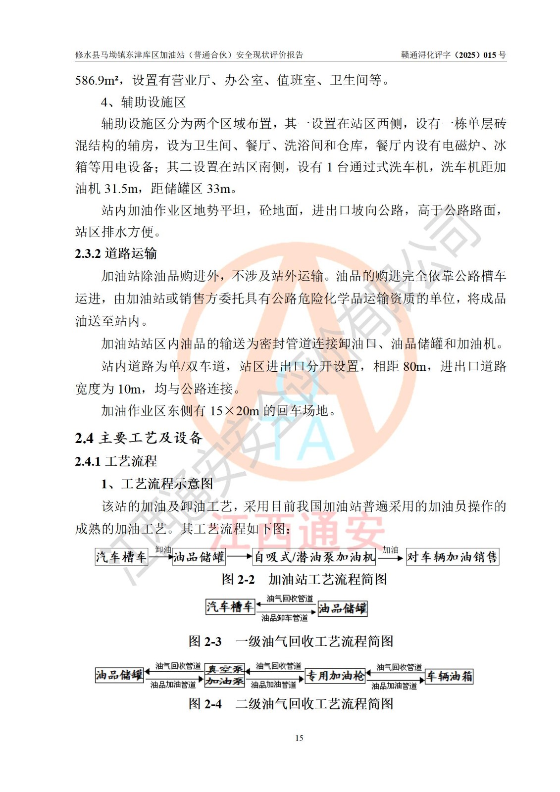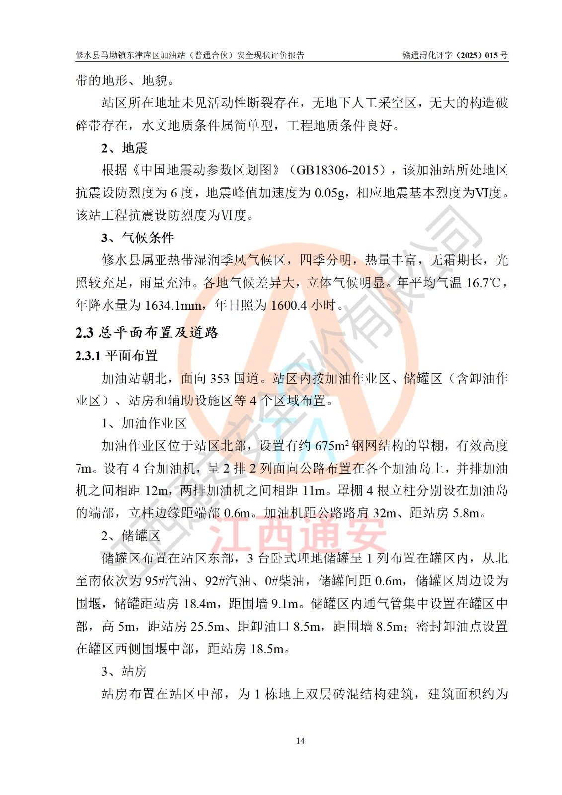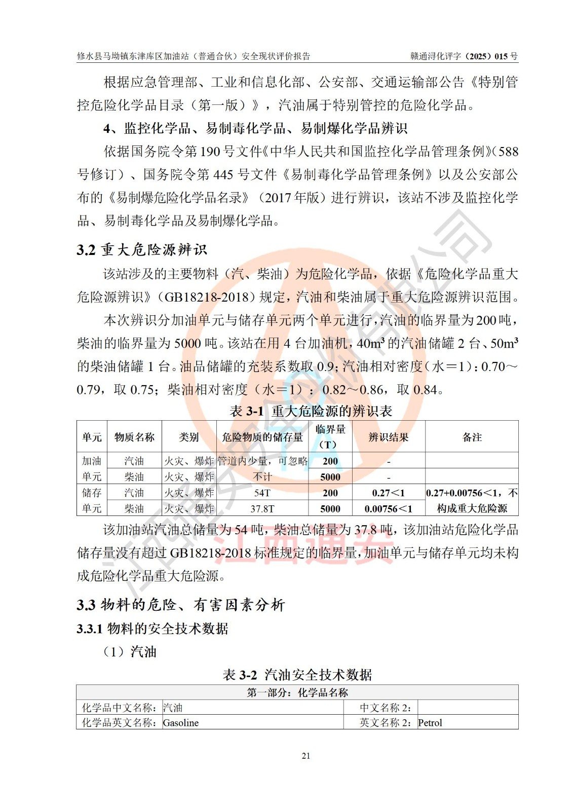 项目简介 | 修水县马坳镇东津库区加油站(普通合伙)是一家专门从事成品油零售经营的普通合伙企业,经营场所位于江西省九江市修水县马坳镇东津村。现有从业人员8名,其中安全管理人员1人,加油站负责人徐益林。 该加油站占地面积2666.66m2,站区内设置有4台四枪程控燃油加油机及配套的工艺管线,设有SF双层储罐3台,其中40m3的92#汽油储罐1台、50m3的0#柴油储罐1台、40m3的95#汽油储罐1台,油品储罐总容积为130m3(折算成汽油为105m3),按现行《汽车加油加气加氢站技术标准》对加油站的等级划分原则,属二级加油站。 该站由九江市行政审批局换发《危险化学品经营许可证》(证号:赣九行审经(甲)字[2022]000055号),**期限2022年04月09日至2025年04月08日。 | |||