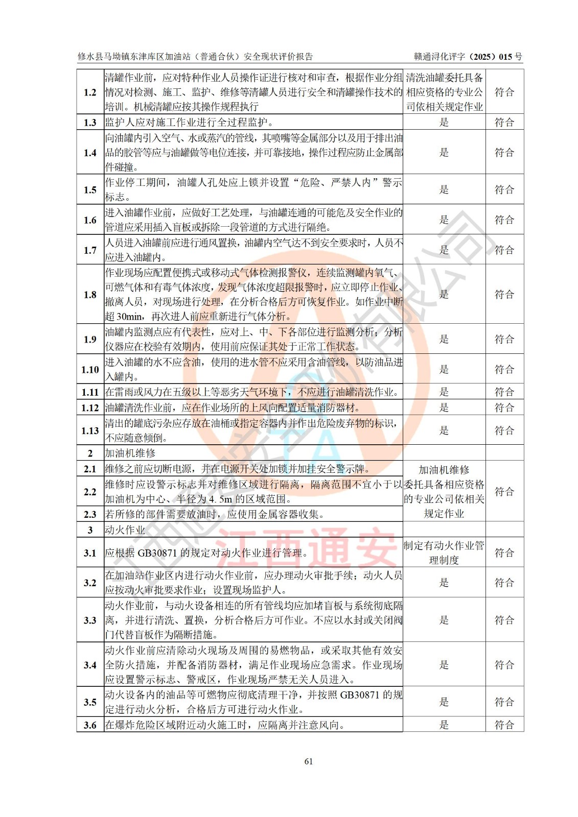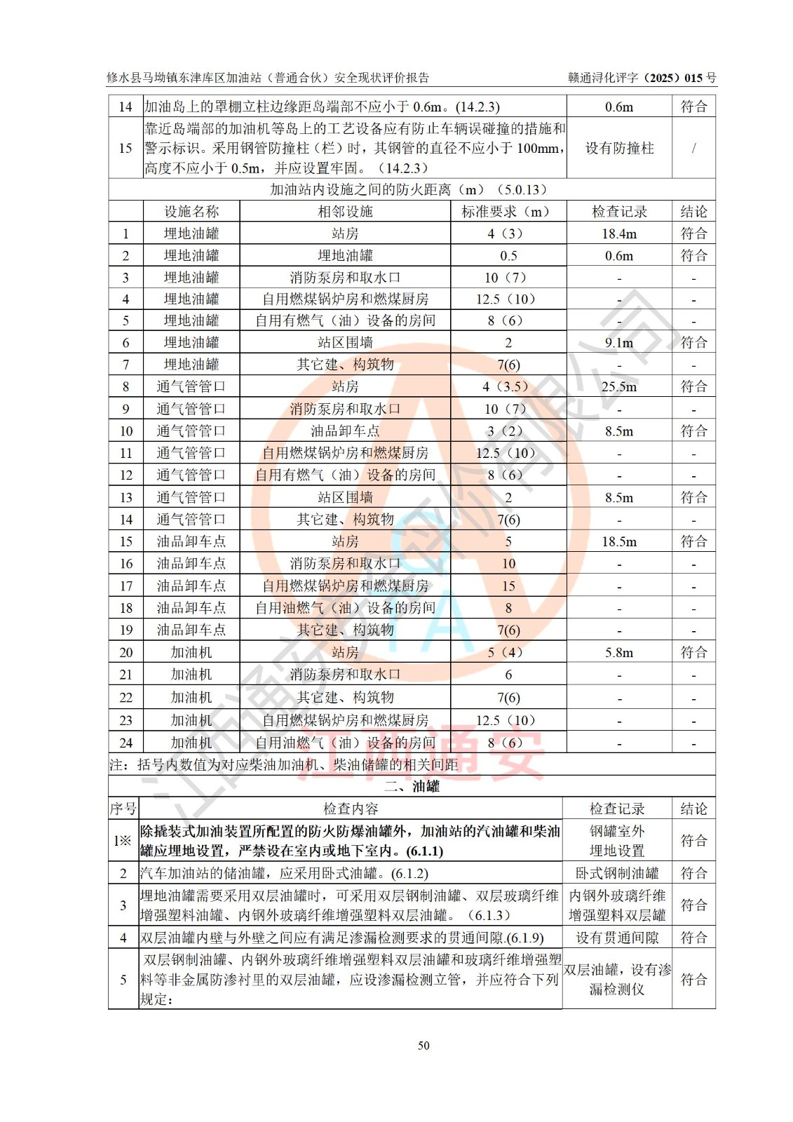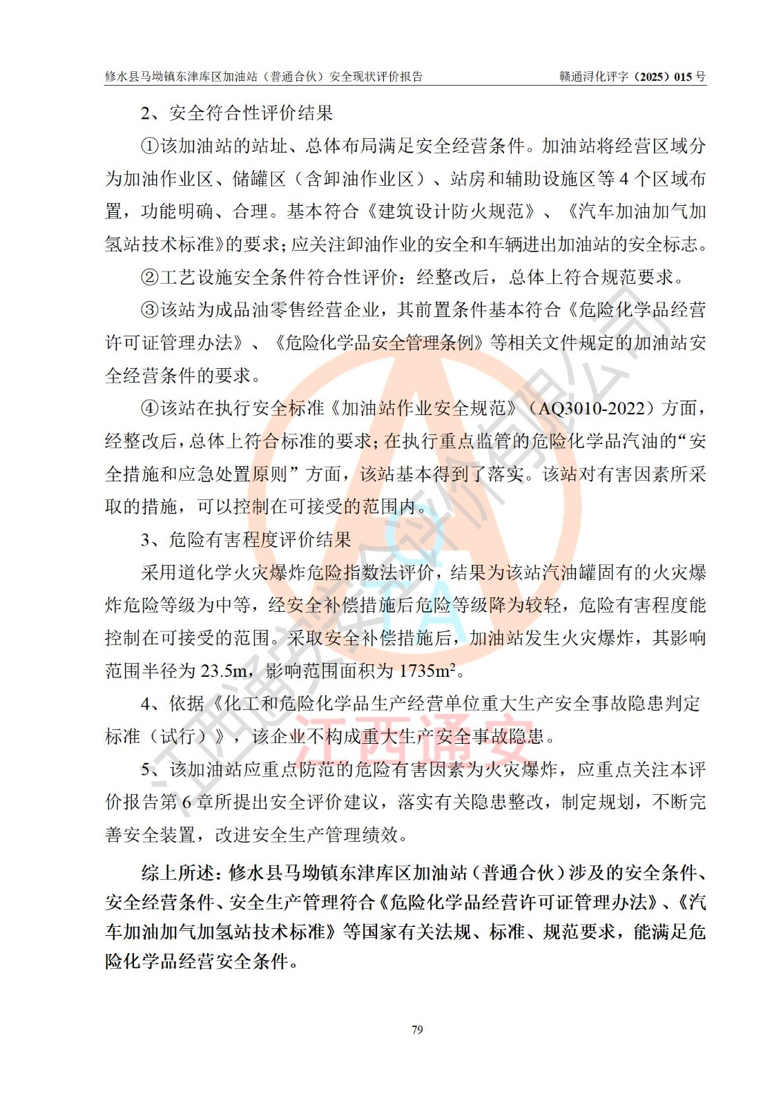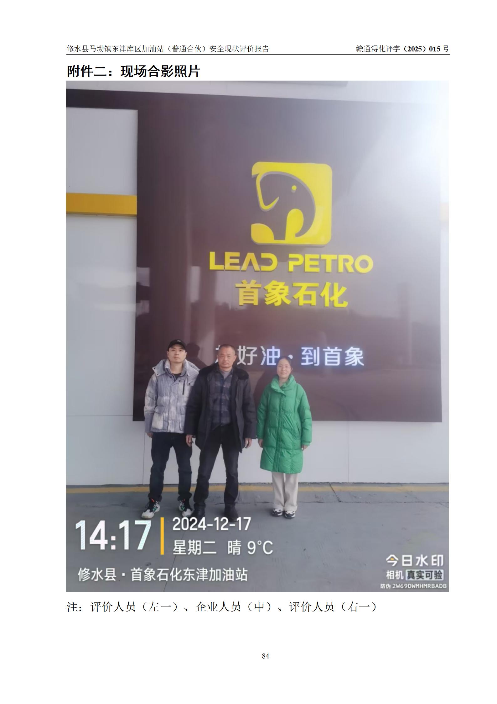 评价结论 | 修水县马坳镇东津库区加油站(普通合伙)涉及的安全条件、安全经营条件、安全生产管理符合《危险化学品经营许可证管理办法》、《汽车加油加气加氢站技术标准》等**有关法规、标准、规范要求,能满足危险化学品经营安全条件。 | |||
