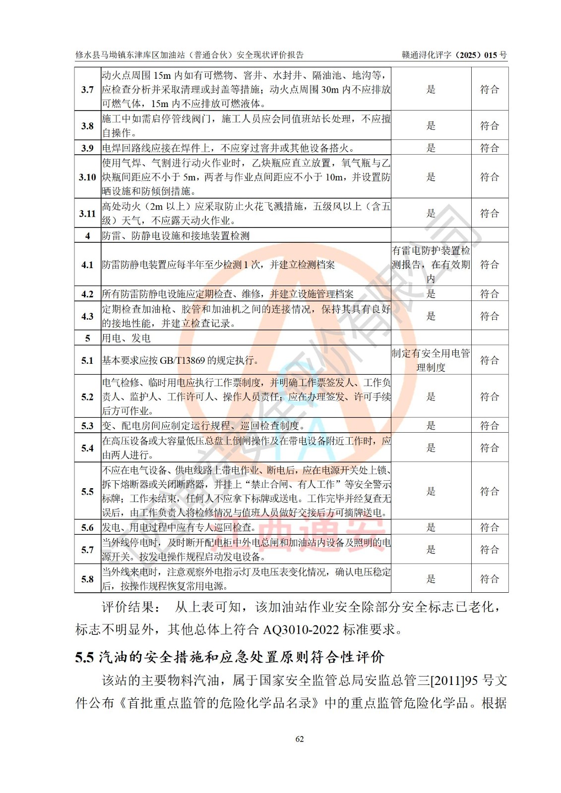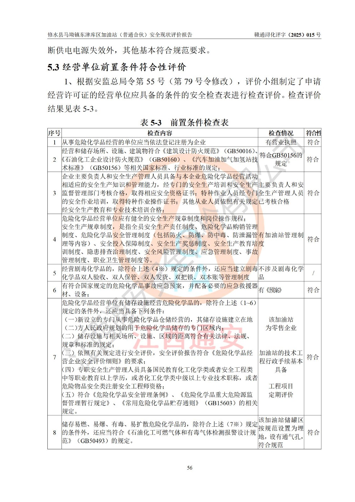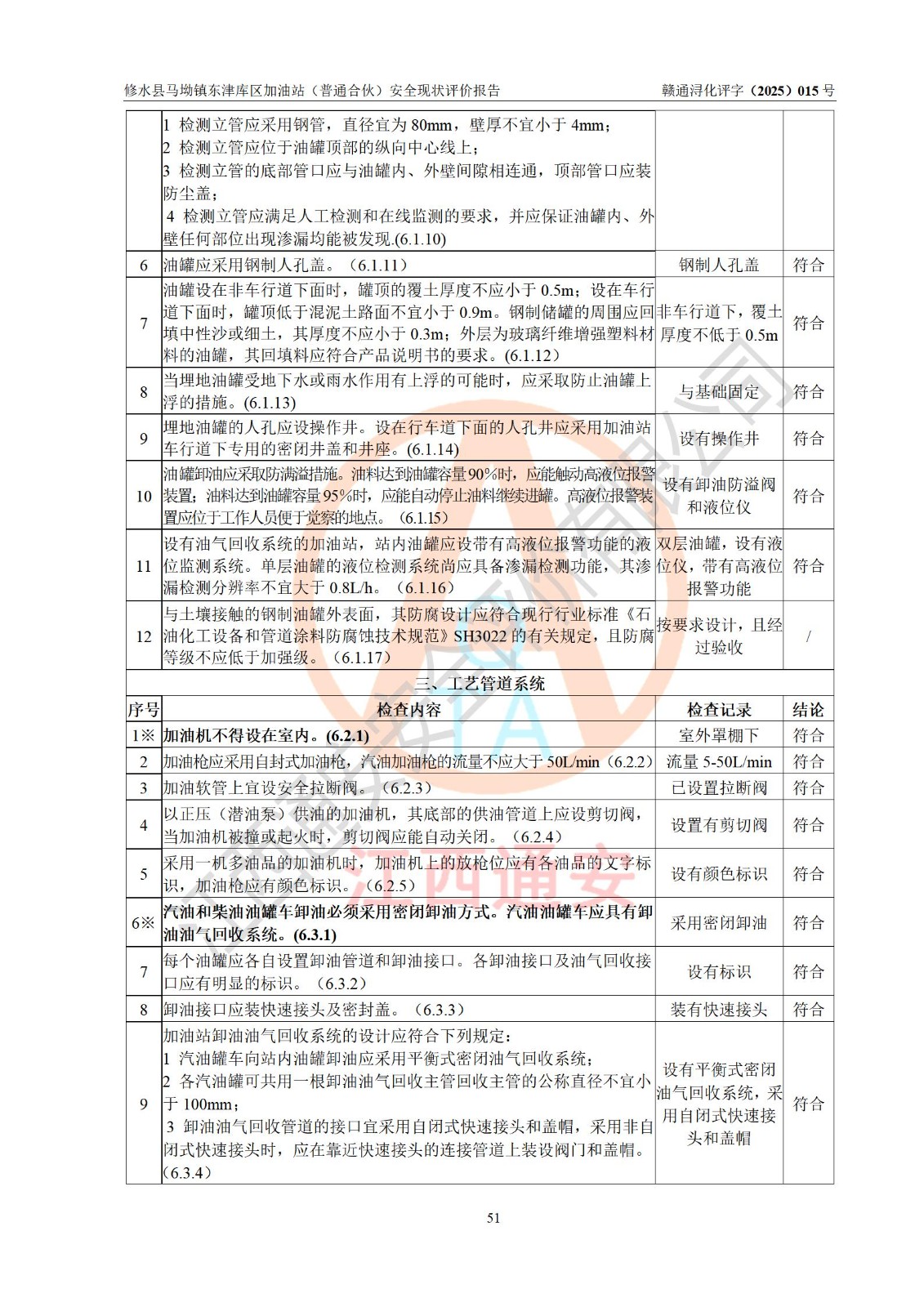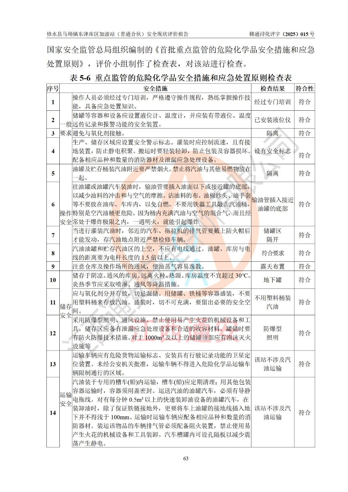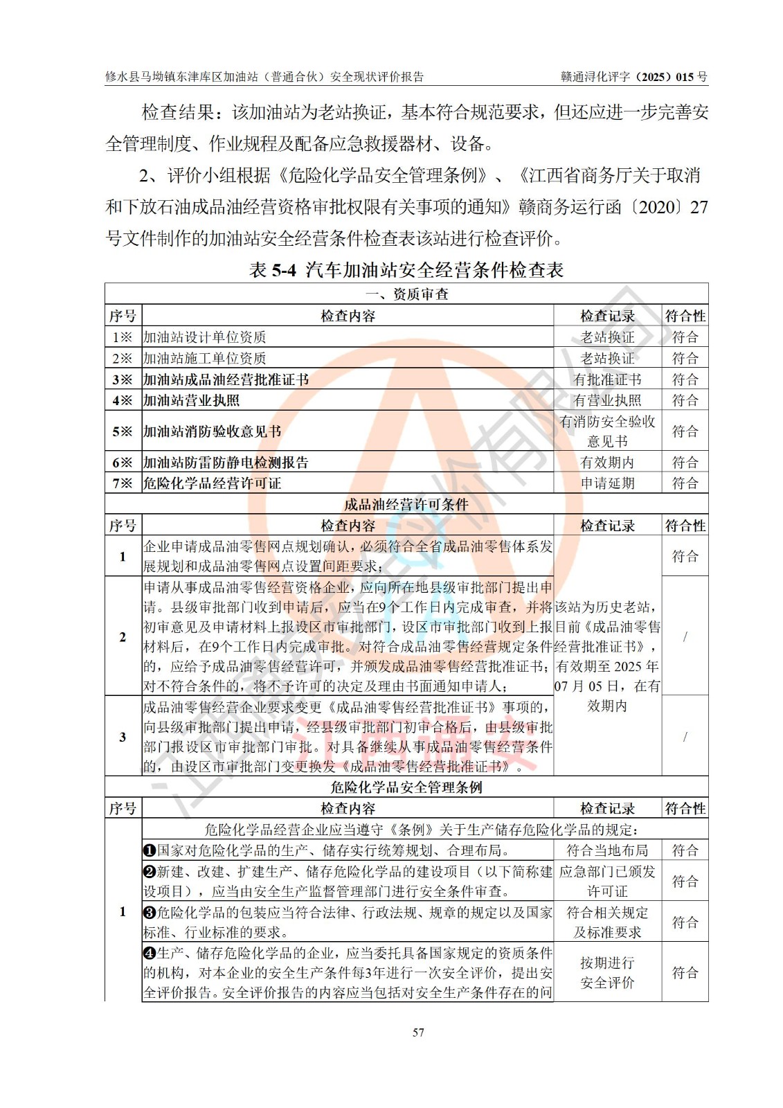 评价结论 | 修水县马坳镇东津库区加油站(普通合伙)涉及的安全条件、安全经营条件、安全生产管理符合《危险化学品经营许可证管理办法》、《汽车加油加气加氢站技术标准》等**有关法规、标准、规范要求,能满足危险化学品经营安全条件。 | |||