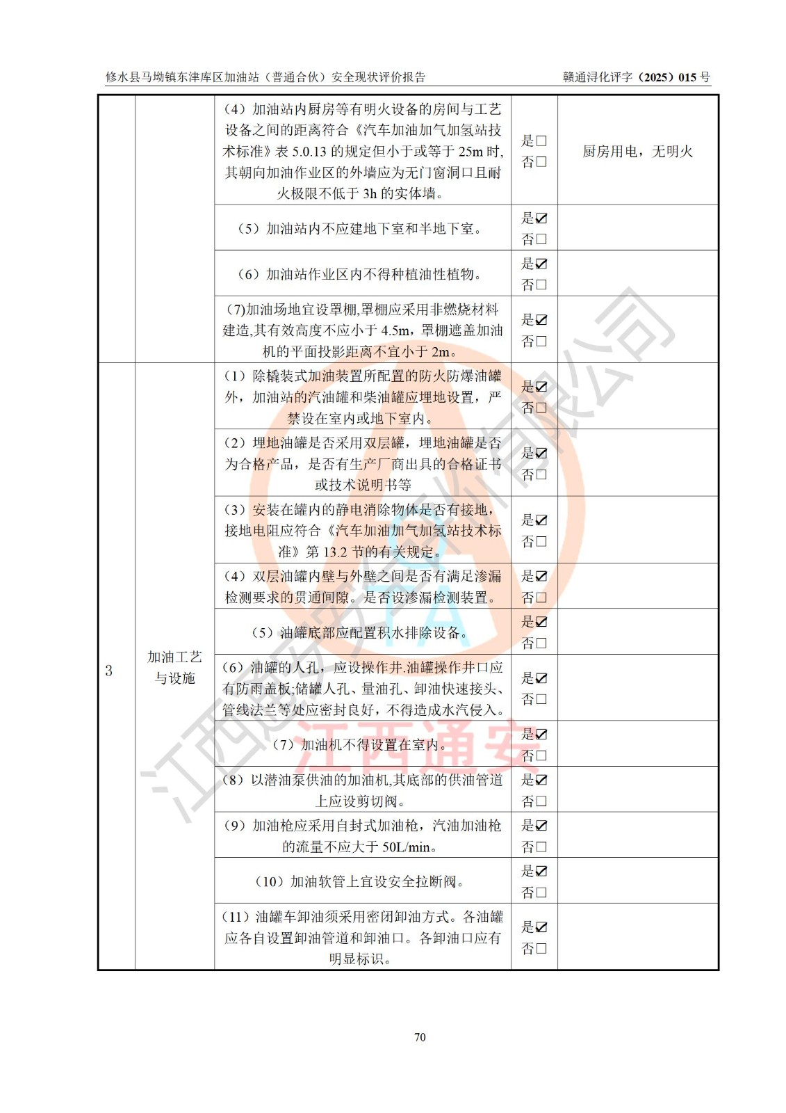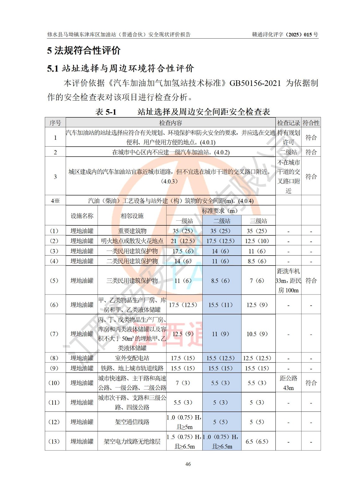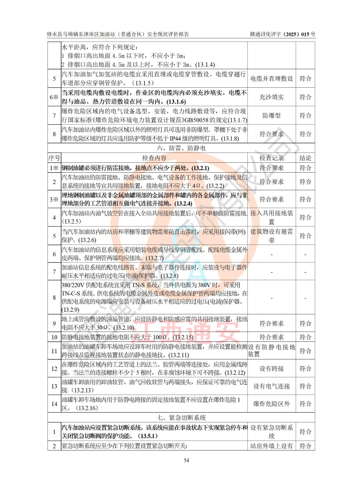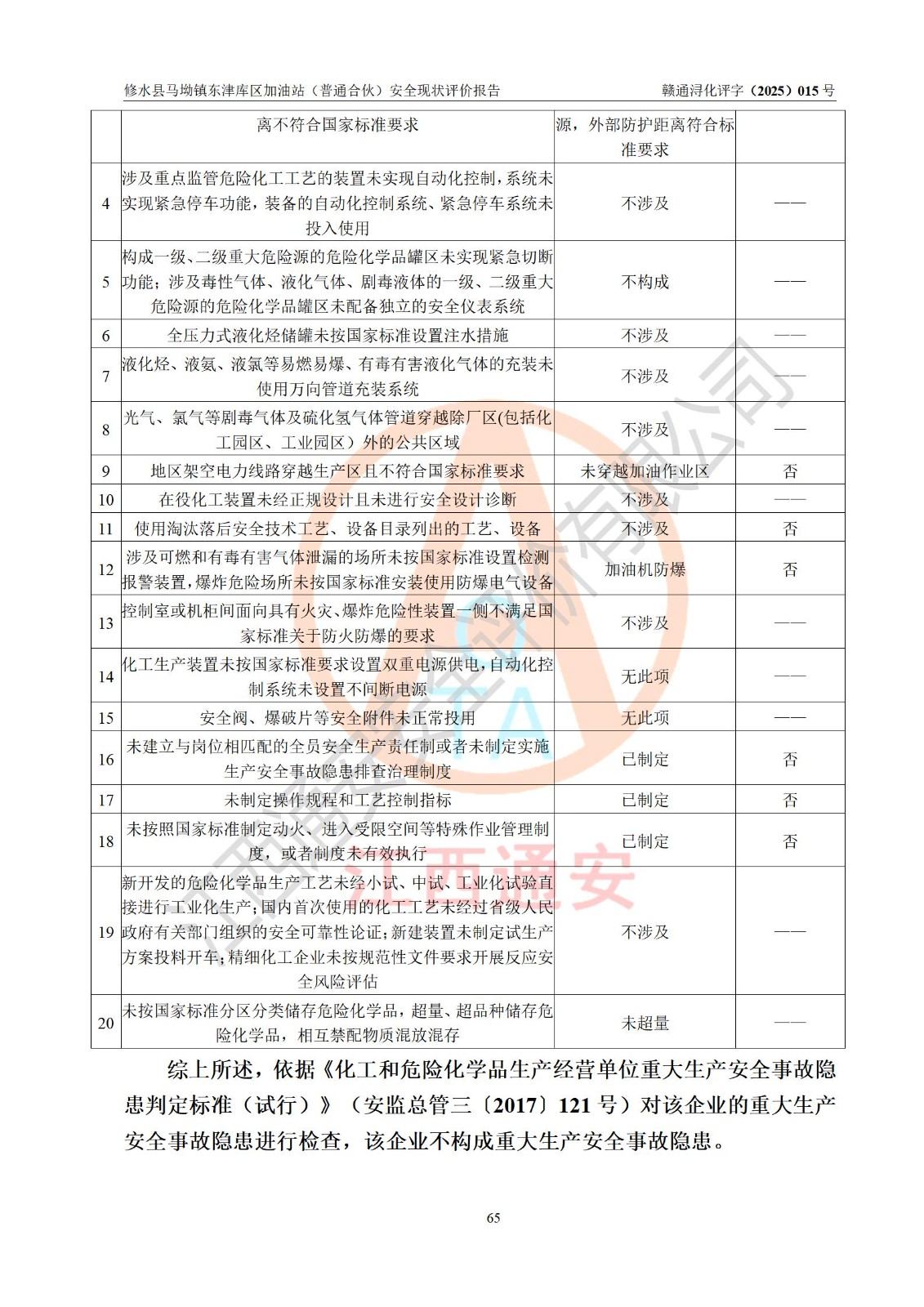 评价结论 | 修水县马坳镇东津库区加油站(普通合伙)涉及的安全条件、安全经营条件、安全生产管理符合《危险化学品经营许可证管理办法》、《汽车加油加气加氢站技术标准》等**有关法规、标准、规范要求,能满足危险化学品经营安全条件。 | |||