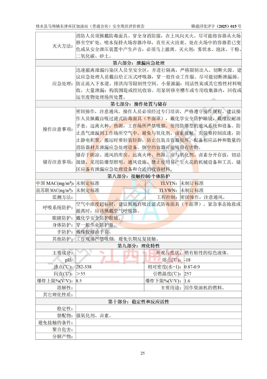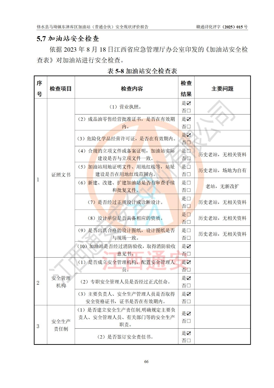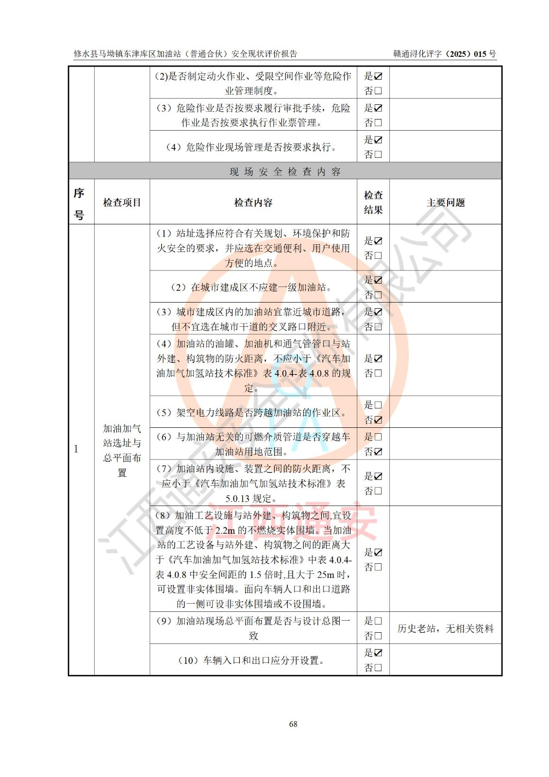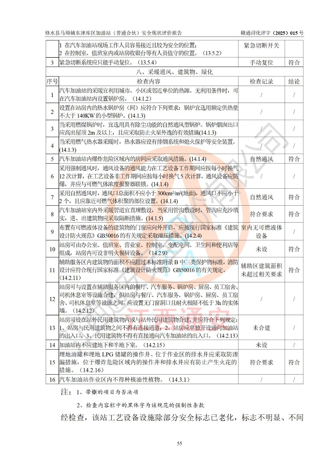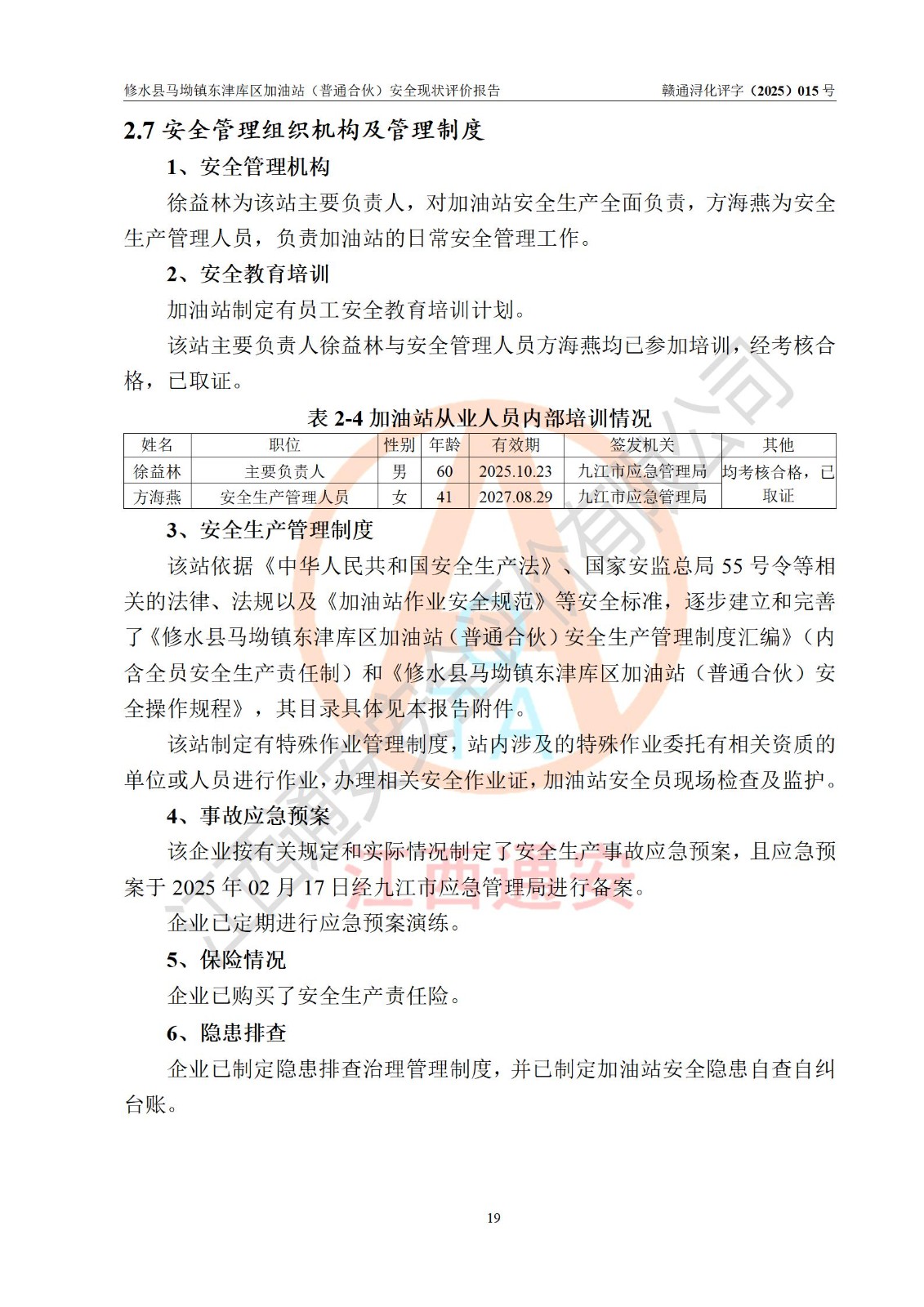 评价结论 | 修水县马坳镇东津库区加油站(普通合伙)涉及的安全条件、安全经营条件、安全生产管理符合《危险化学品经营许可证管理办法》、《汽车加油加气加氢站技术标准》等**有关法规、标准、规范要求,能满足危险化学品经营安全条件。 | |||