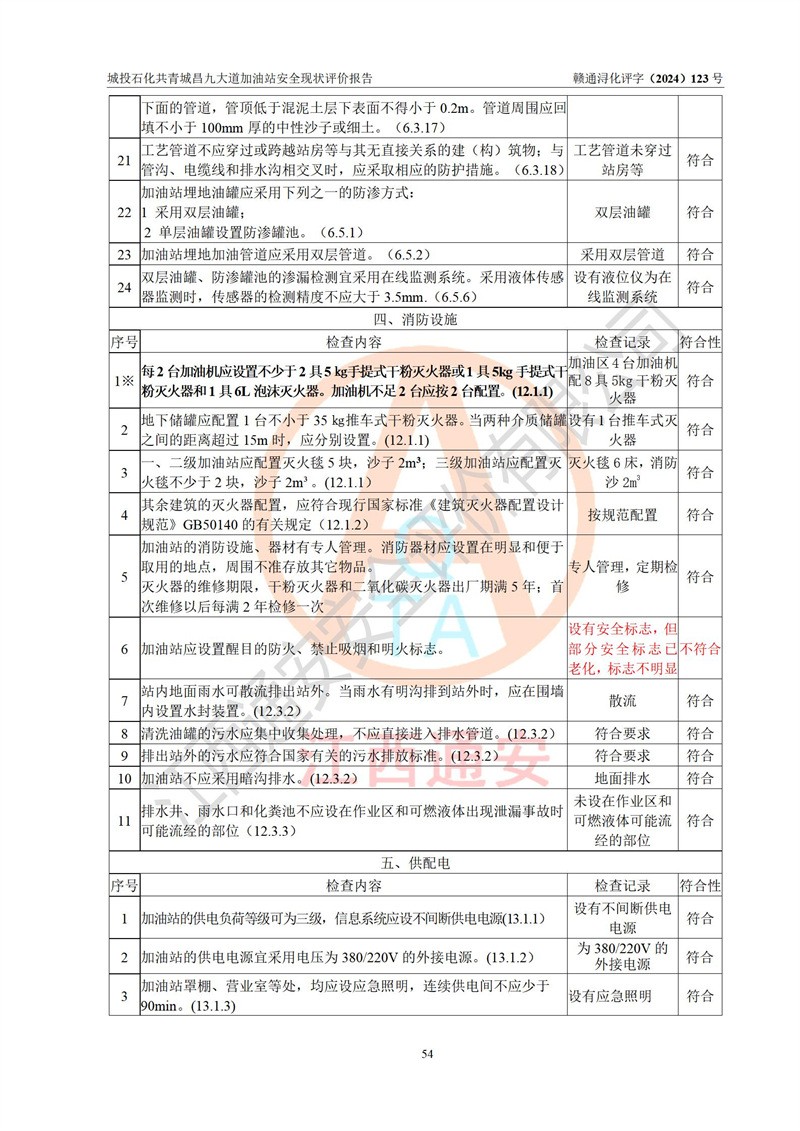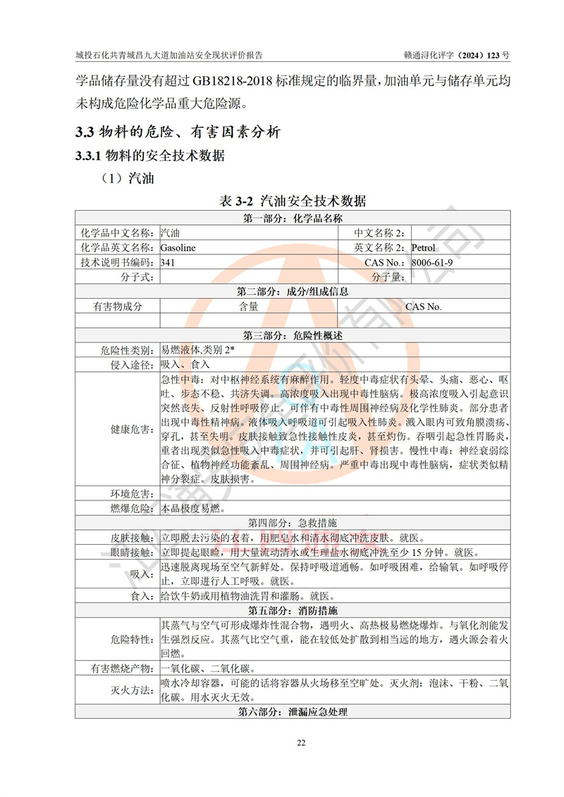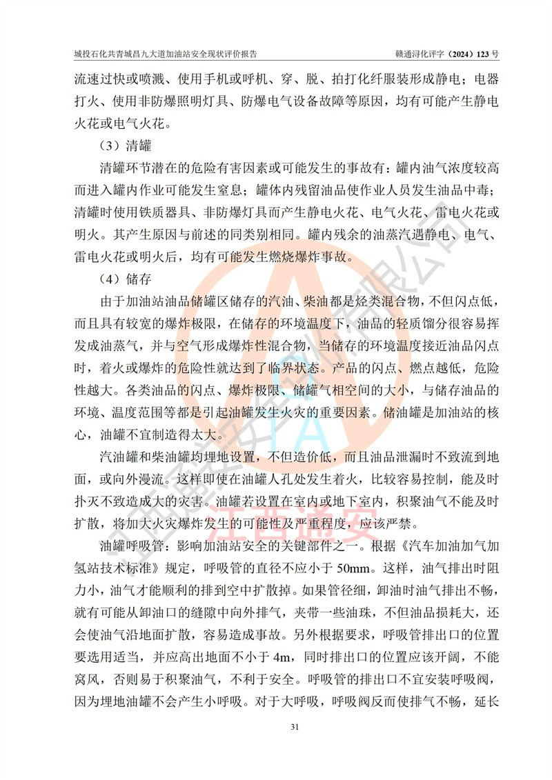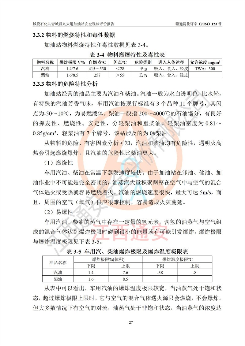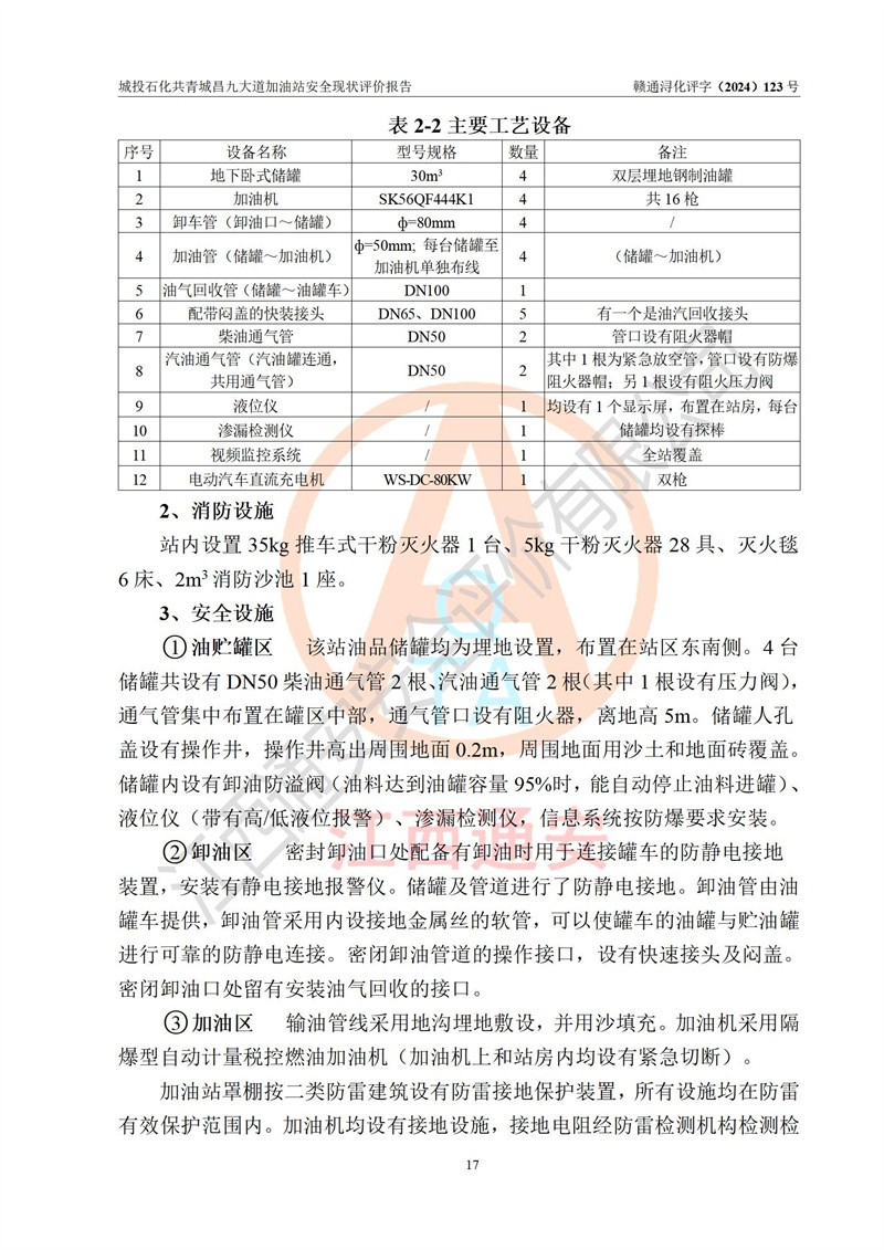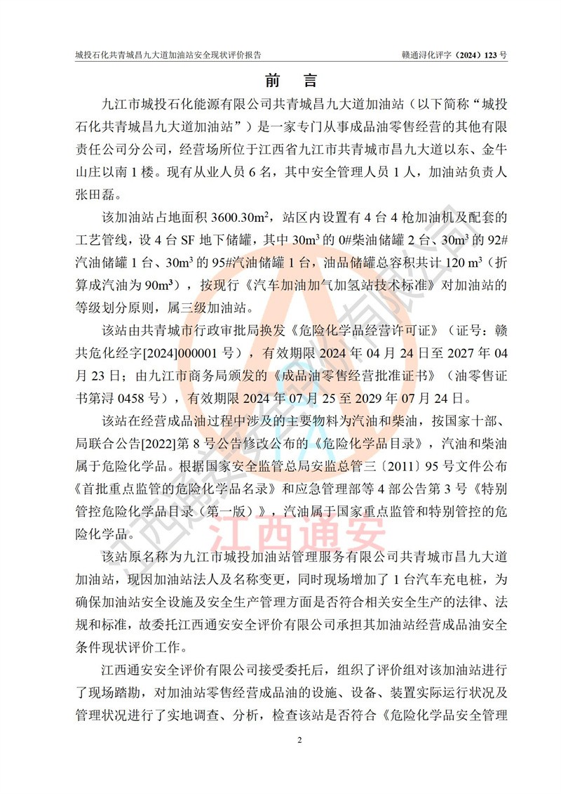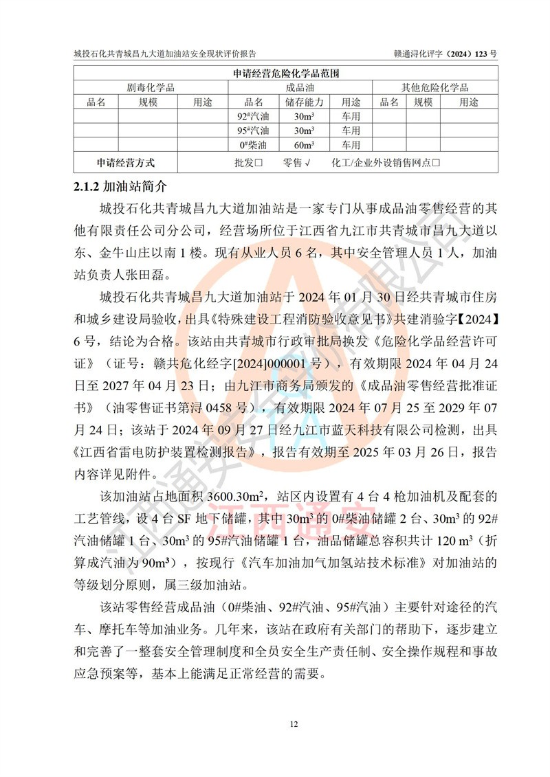 项目简介 | 九江市城投石化能源有限公司共青城昌九大道加油站是一家专门从事成品油零售经营的其他有限责任公司分公司,经营场所位于江西省九江市共青城市昌九大道以东、金牛山庄以南1楼。现有从业人员6名,其中安全管理人员1人,加油站负责人张田磊。 该加油站占地面积3600.30m2,站区内设置有4台4枪加油机及配套的工艺管线,设4台SF地下储罐,其中30m3的0#柴油储罐2台、30m3的92#汽油储罐1台、30m3的95#汽油储罐1台,油品储罐总容积共计120 m3(折算成汽油为90m3),按现行《汽车加油加气加氢站技术标准》对加油站的等级划分原则,属三级加油站。 该站由共青城市行政审批局换发《危险化学品经营许可证》(证号:赣共危化经字[2024]000001号),**期限2024年04月24日至2027年04月23日。 | |||