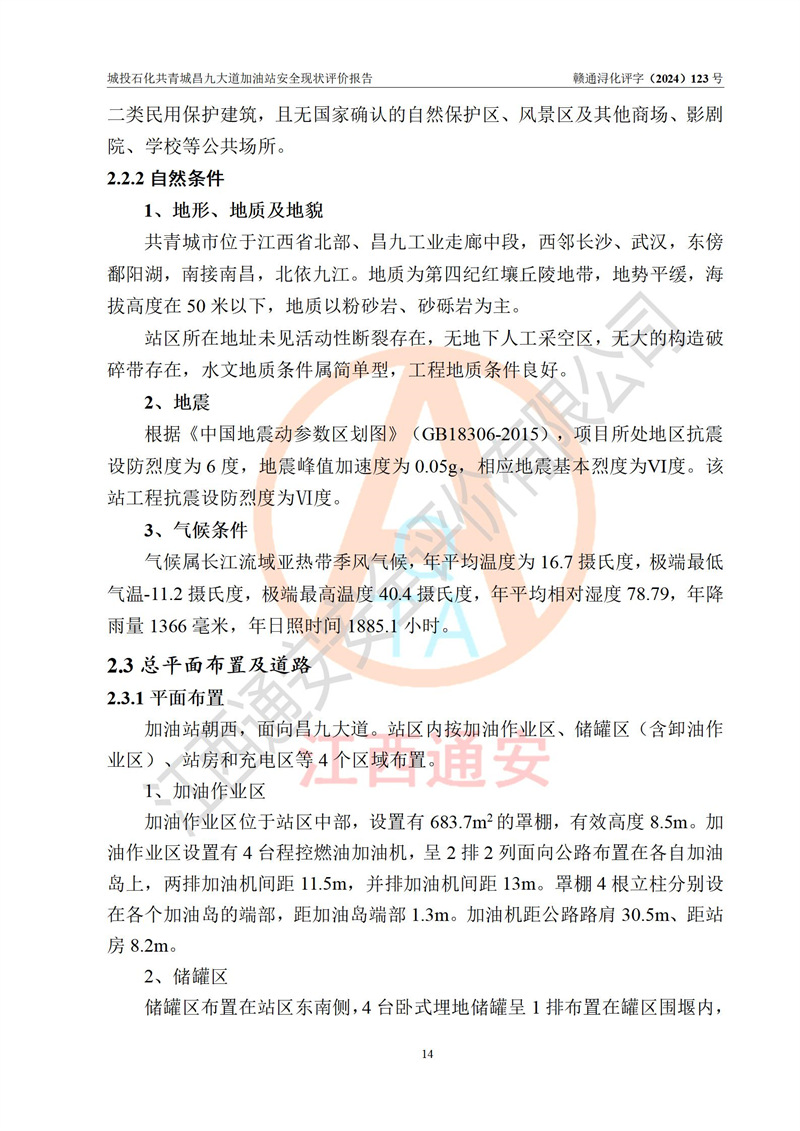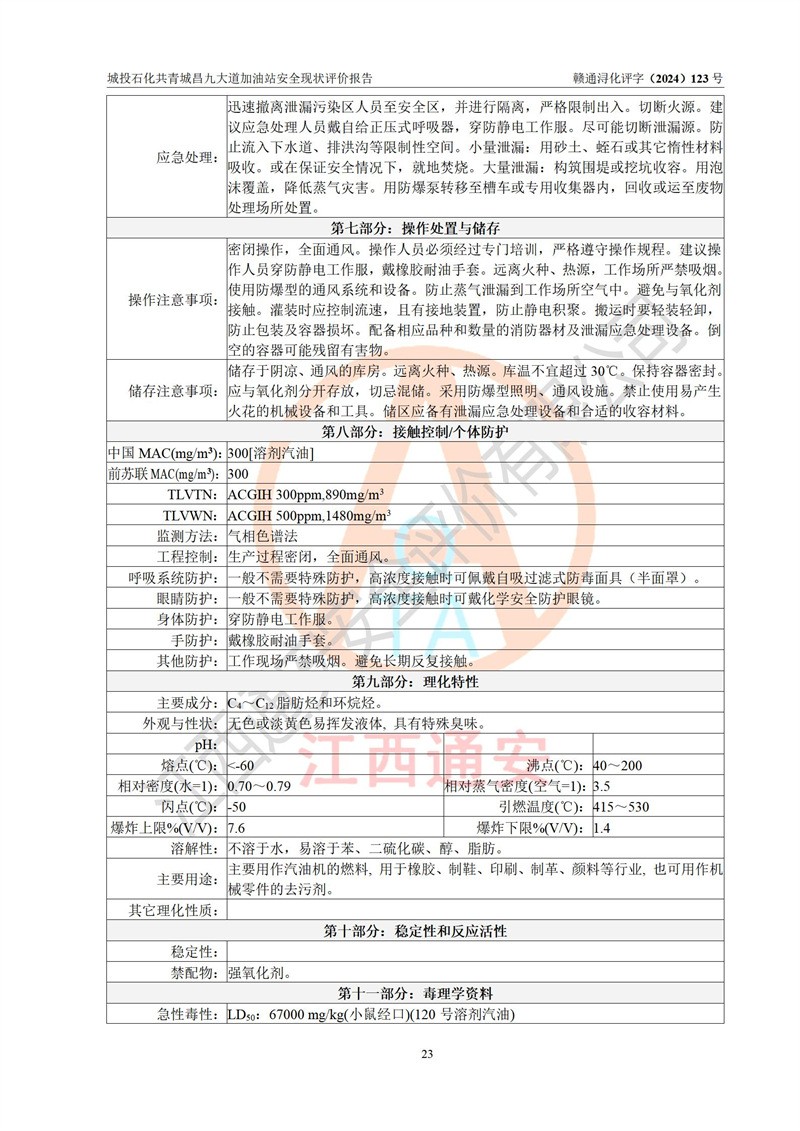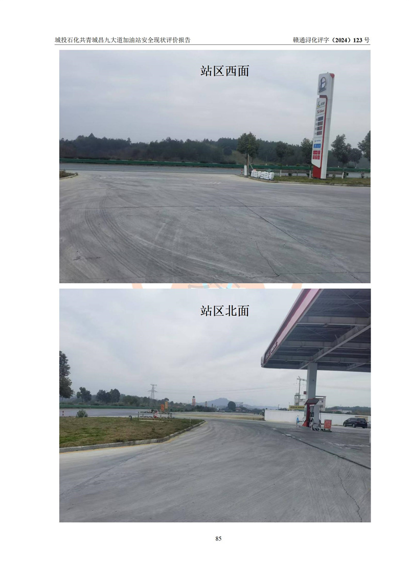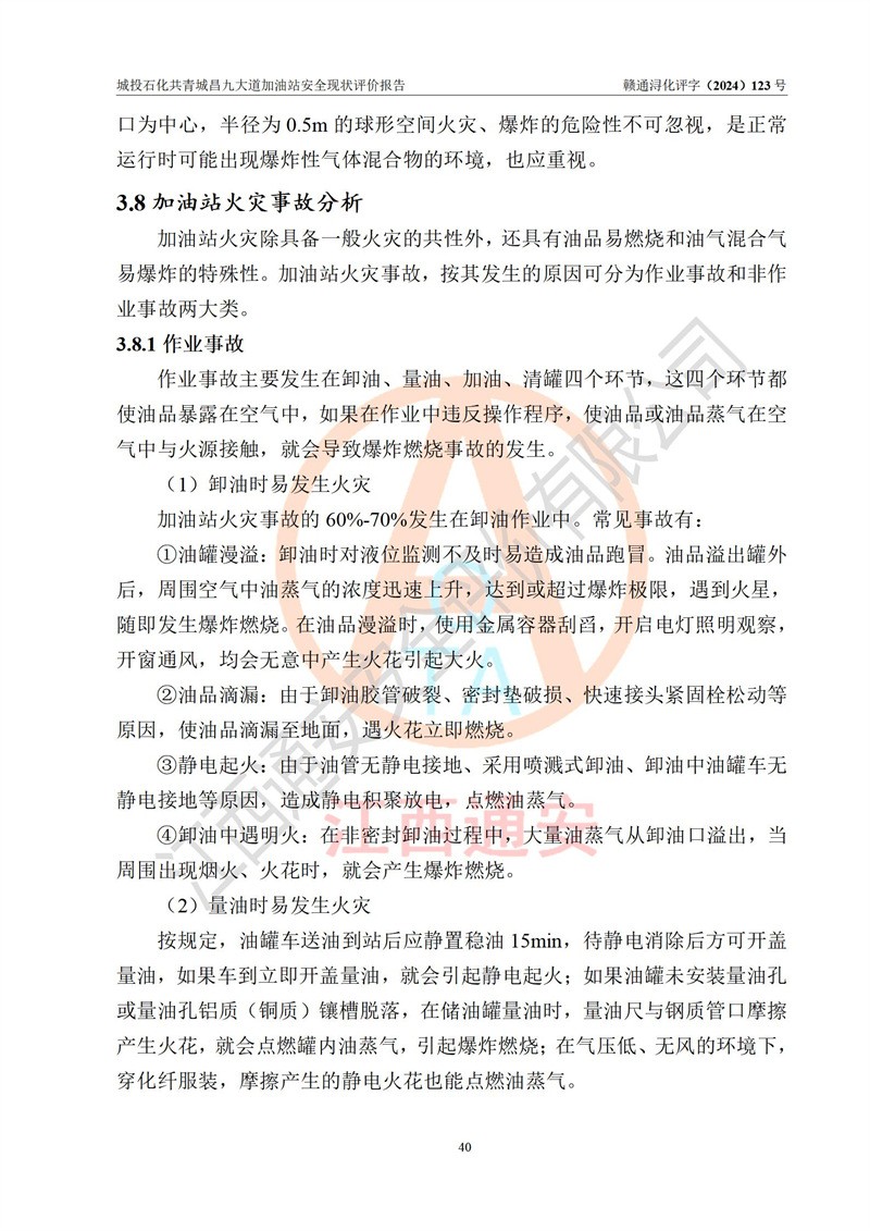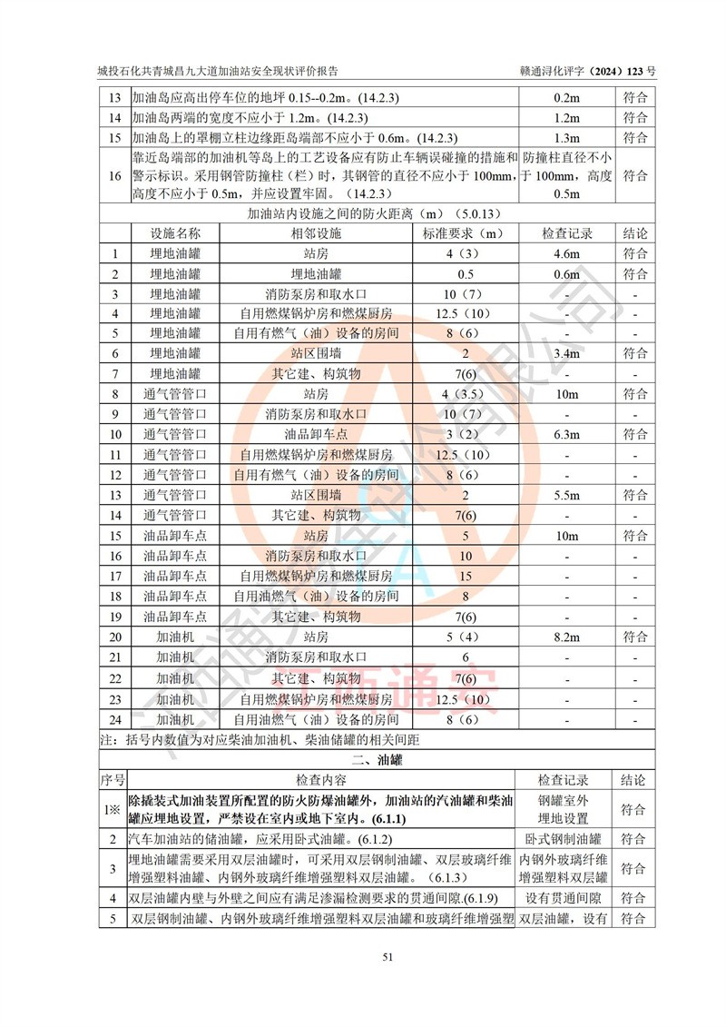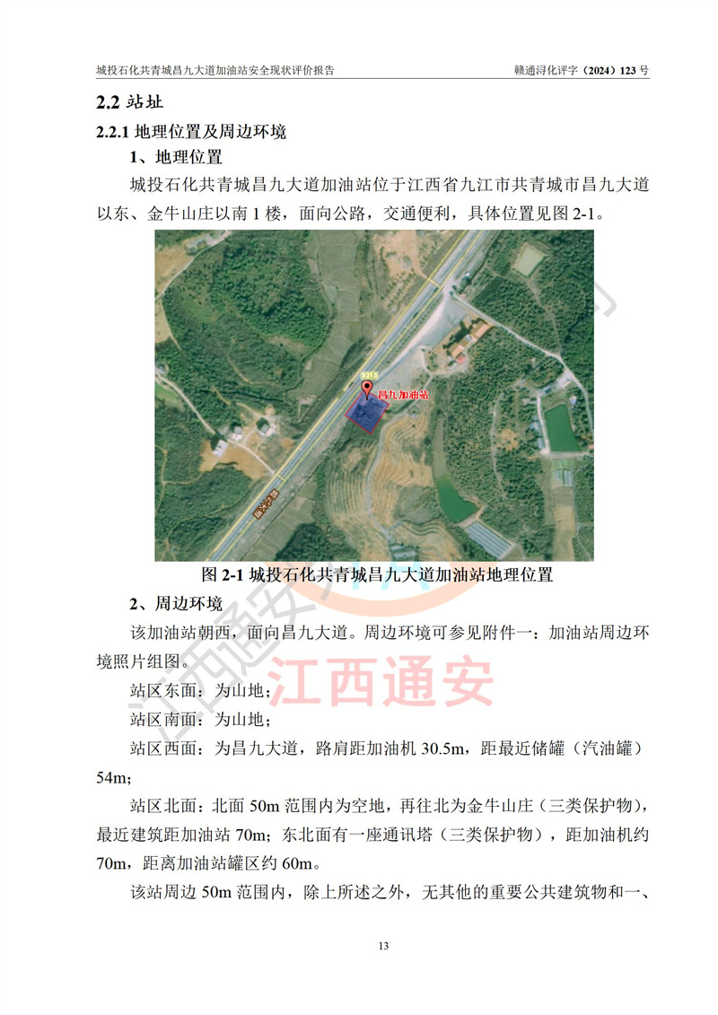 项目简介 | 九江市城投石化能源有限公司共青城昌九大道加油站是一家专门从事成品油零售经营的其他有限责任公司分公司,经营场所位于江西省九江市共青城市昌九大道以东、金牛山庄以南1楼。现有从业人员6名,其中安全管理人员1人,加油站负责人张田磊。 该加油站占地面积3600.30m2,站区内设置有4台4枪加油机及配套的工艺管线,设4台SF地下储罐,其中30m3的0#柴油储罐2台、30m3的92#汽油储罐1台、30m3的95#汽油储罐1台,油品储罐总容积共计120 m3(折算成汽油为90m3),按现行《汽车加油加气加氢站技术标准》对加油站的等级划分原则,属三级加油站。 该站由共青城市行政审批局换发《危险化学品经营许可证》(证号:赣共危化经字[2024]000001号),**期限2024年04月24日至2027年04月23日。 | |||