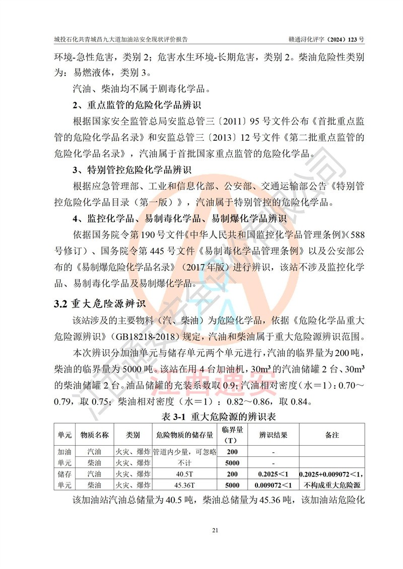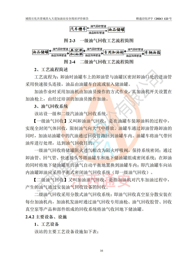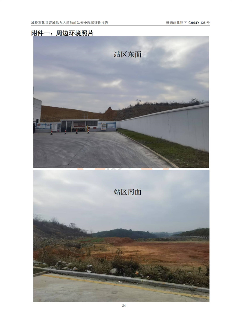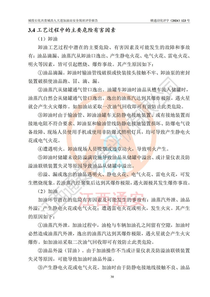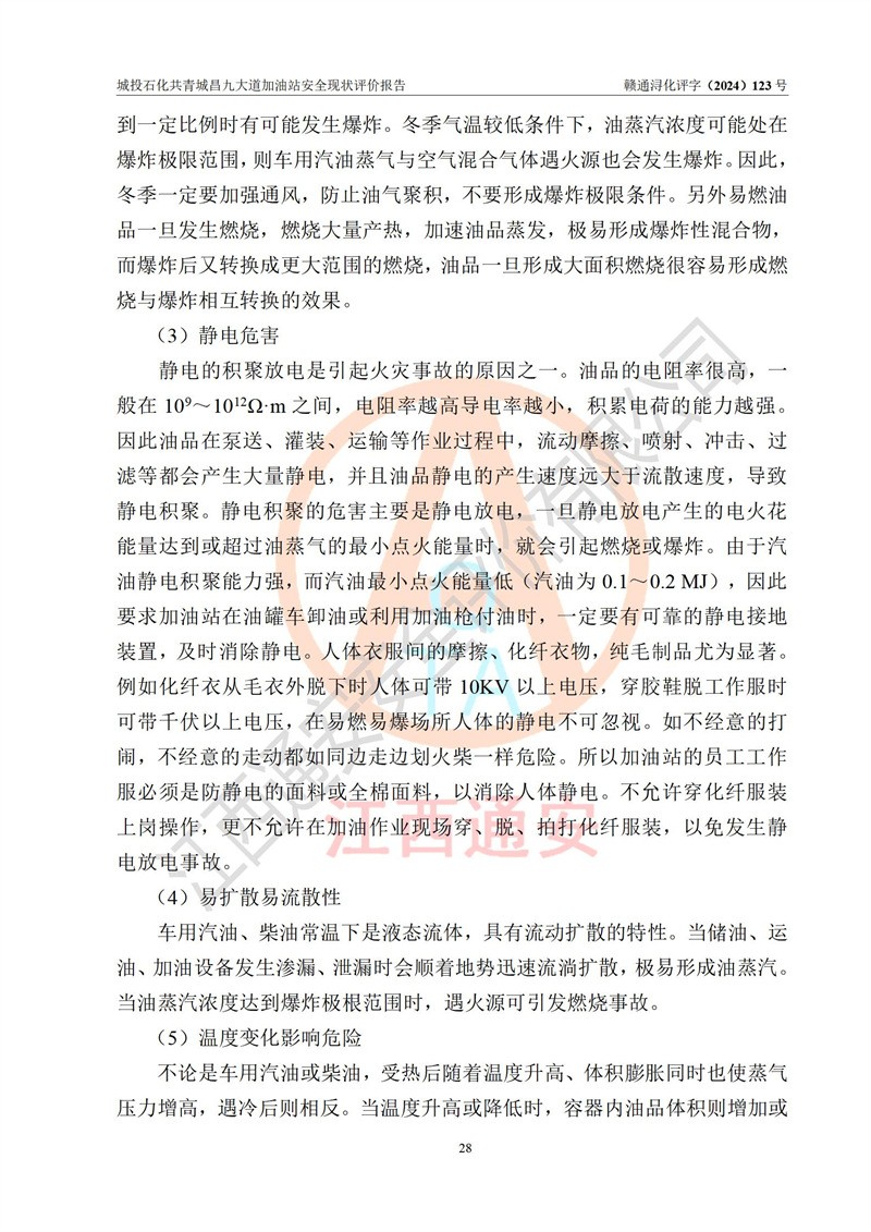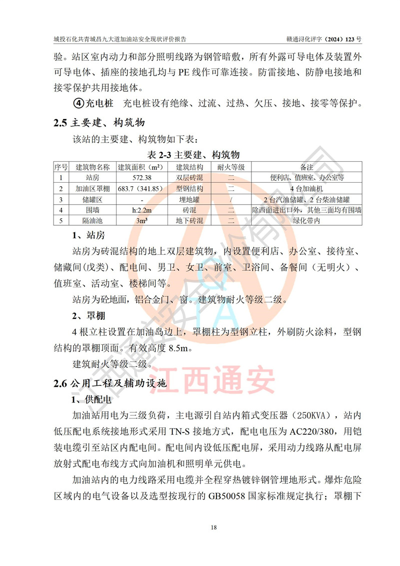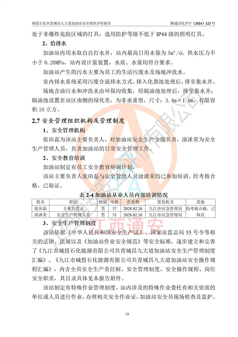 项目简介 | 九江市城投石化能源有限公司共青城昌九大道加油站是一家专门从事成品油零售经营的其他有限责任公司分公司,经营场所位于江西省九江市共青城市昌九大道以东、金牛山庄以南1楼。现有从业人员6名,其中安全管理人员1人,加油站负责人张田磊。 该加油站占地面积3600.30m2,站区内设置有4台4枪加油机及配套的工艺管线,设4台SF地下储罐,其中30m3的0#柴油储罐2台、30m3的92#汽油储罐1台、30m3的95#汽油储罐1台,油品储罐总容积共计120 m3(折算成汽油为90m3),按现行《汽车加油加气加氢站技术标准》对加油站的等级划分原则,属三级加油站。 该站由共青城市行政审批局换发《危险化学品经营许可证》(证号:赣共危化经字[2024]000001号),**期限2024年04月24日至2027年04月23日。 | |||