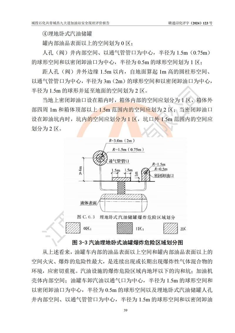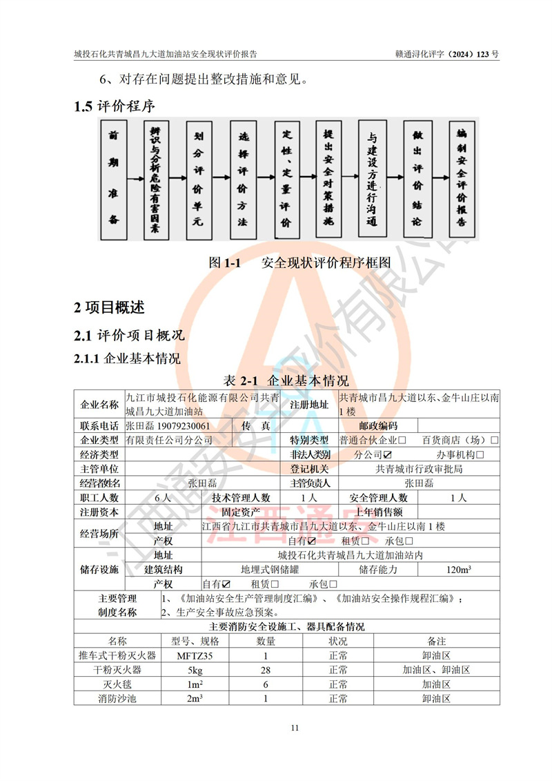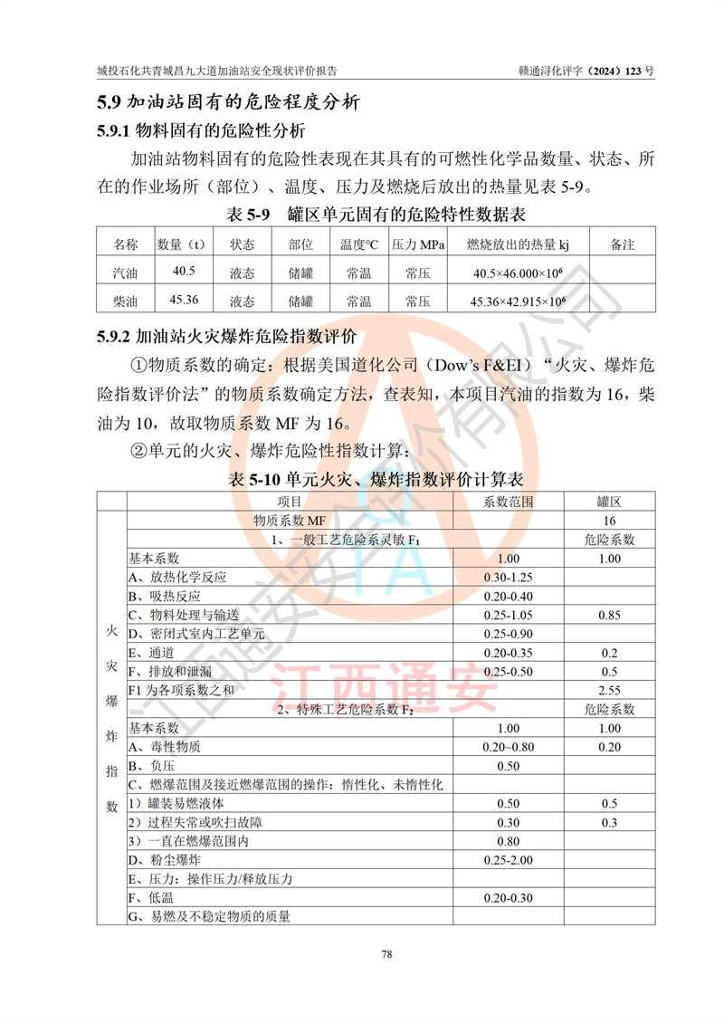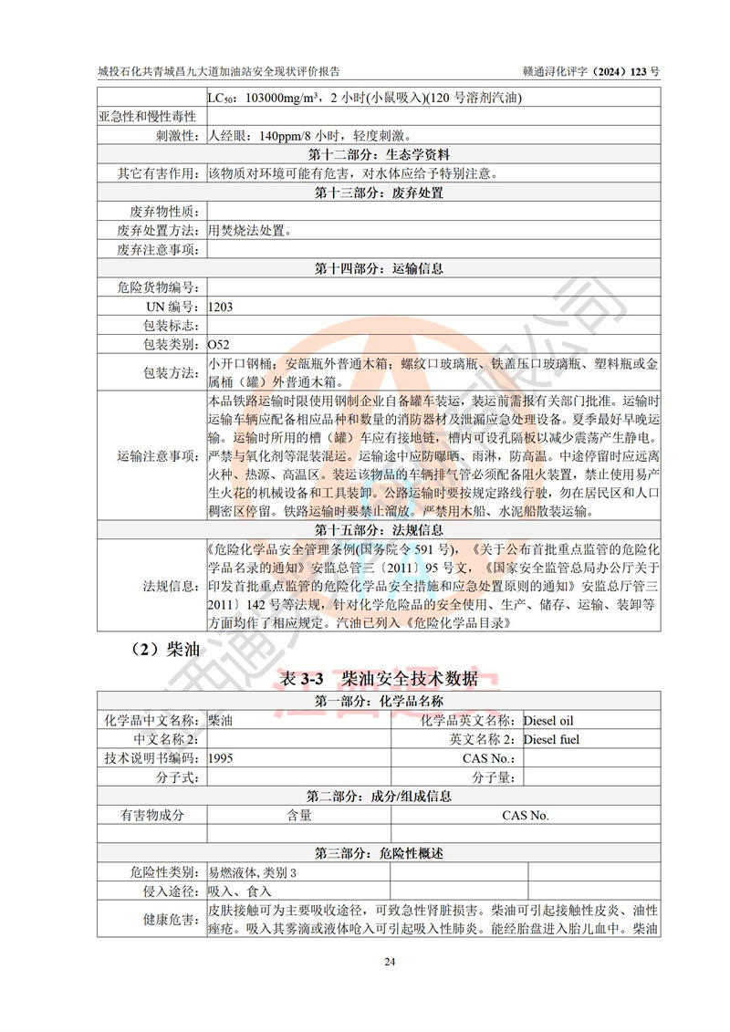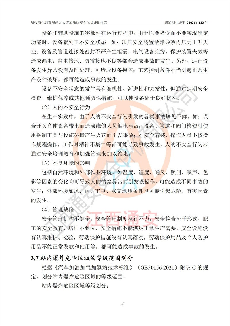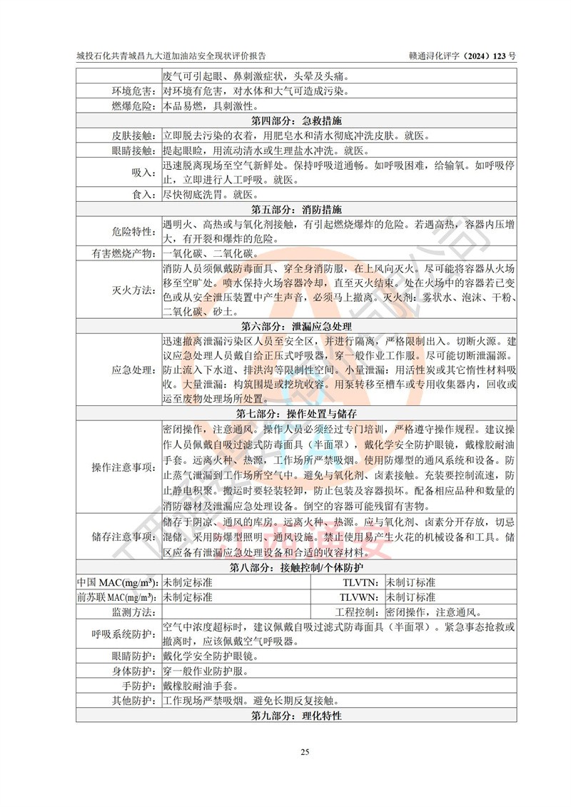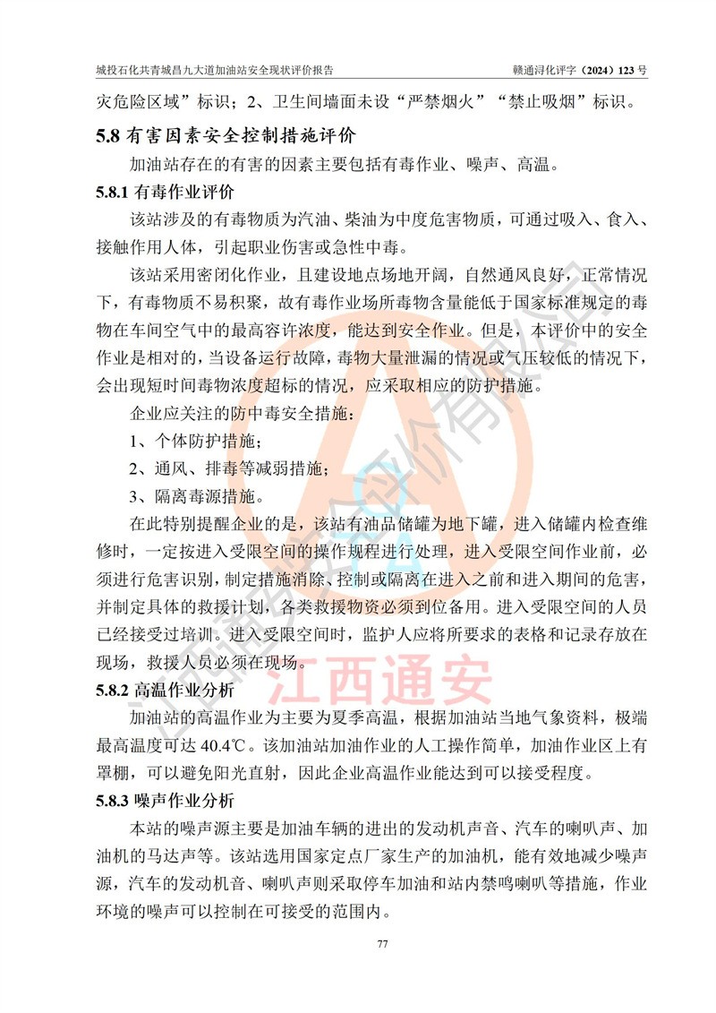 项目简介 | 九江市城投石化能源有限公司共青城昌九大道加油站是一家专门从事成品油零售经营的其他有限责任公司分公司,经营场所位于江西省九江市共青城市昌九大道以东、金牛山庄以南1楼。现有从业人员6名,其中安全管理人员1人,加油站负责人张田磊。 该加油站占地面积3600.30m2,站区内设置有4台4枪加油机及配套的工艺管线,设4台SF地下储罐,其中30m3的0#柴油储罐2台、30m3的92#汽油储罐1台、30m3的95#汽油储罐1台,油品储罐总容积共计120 m3(折算成汽油为90m3),按现行《汽车加油加气加氢站技术标准》对加油站的等级划分原则,属三级加油站。 该站由共青城市行政审批局换发《危险化学品经营许可证》(证号:赣共危化经字[2024]000001号),**期限2024年04月24日至2027年04月23日。 | |||