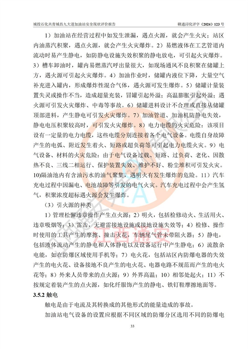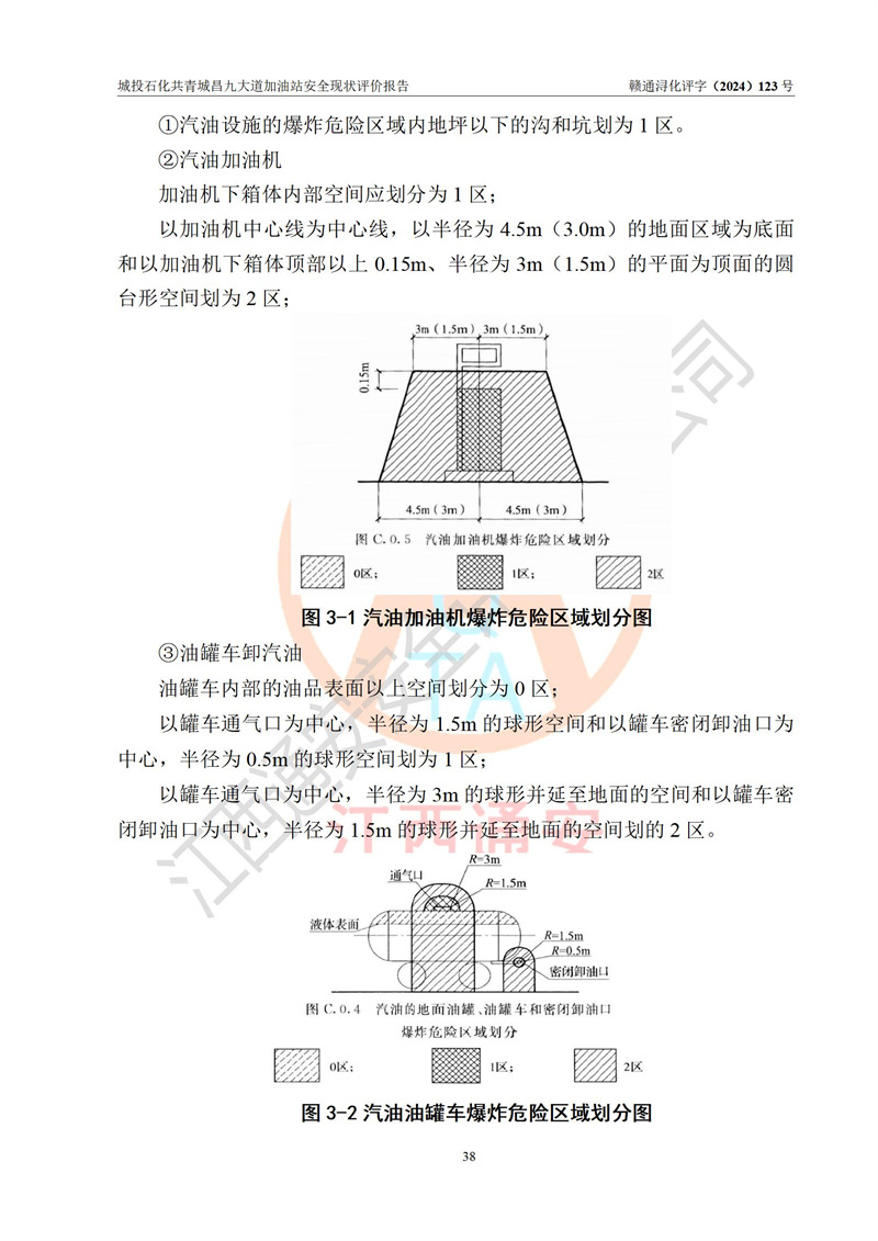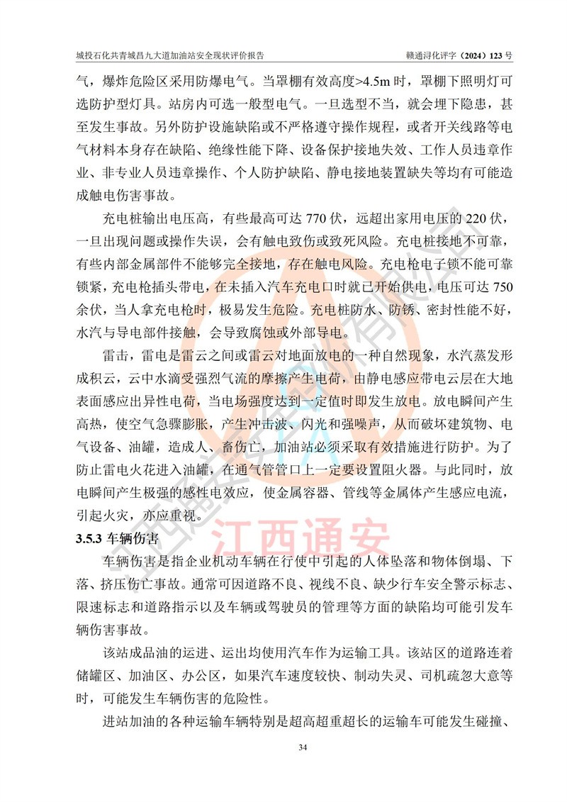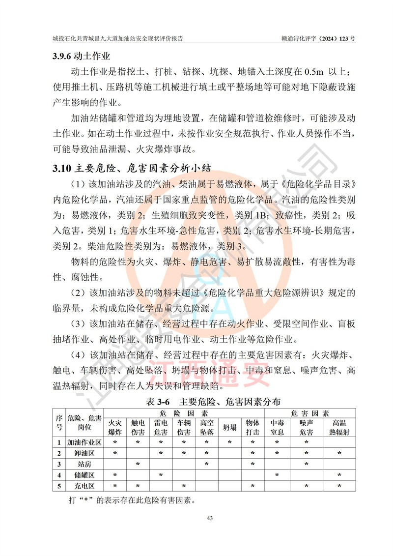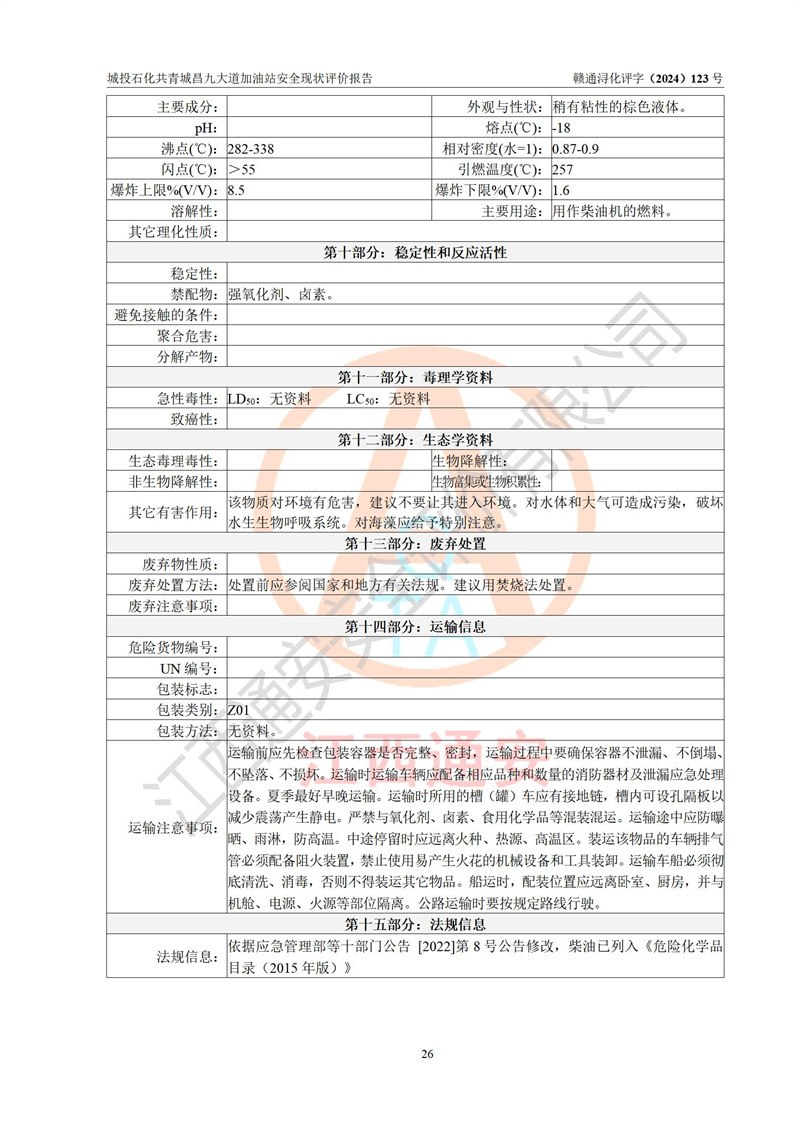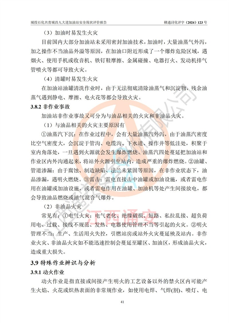 项目简介 | 九江市城投石化能源有限公司共青城昌九大道加油站是一家专门从事成品油零售经营的其他有限责任公司分公司,经营场所位于江西省九江市共青城市昌九大道以东、金牛山庄以南1楼。现有从业人员6名,其中安全管理人员1人,加油站负责人张田磊。 该加油站占地面积3600.30m2,站区内设置有4台4枪加油机及配套的工艺管线,设4台SF地下储罐,其中30m3的0#柴油储罐2台、30m3的92#汽油储罐1台、30m3的95#汽油储罐1台,油品储罐总容积共计120 m3(折算成汽油为90m3),按现行《汽车加油加气加氢站技术标准》对加油站的等级划分原则,属三级加油站。 该站由共青城市行政审批局换发《危险化学品经营许可证》(证号:赣共危化经字[2024]000001号),**期限2024年04月24日至2027年04月23日。 | |||