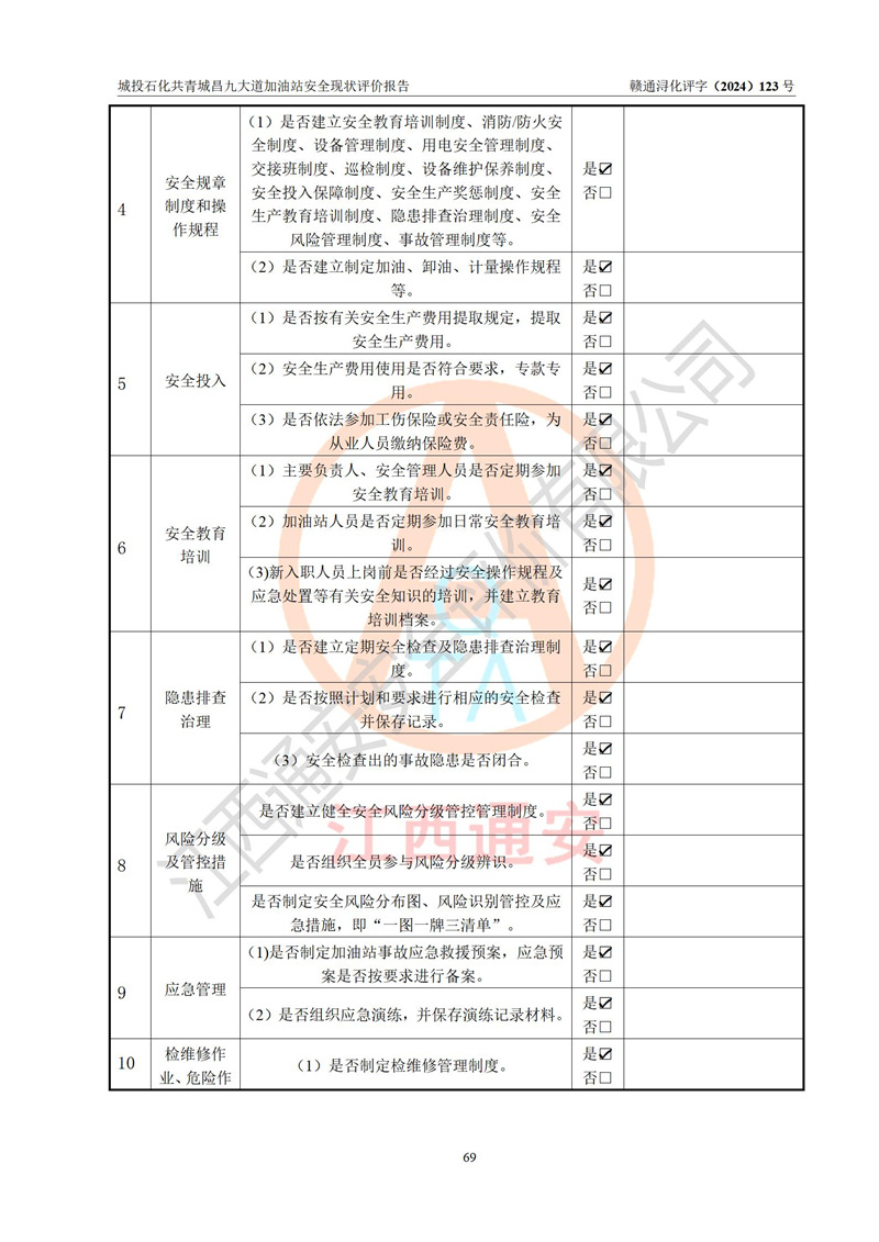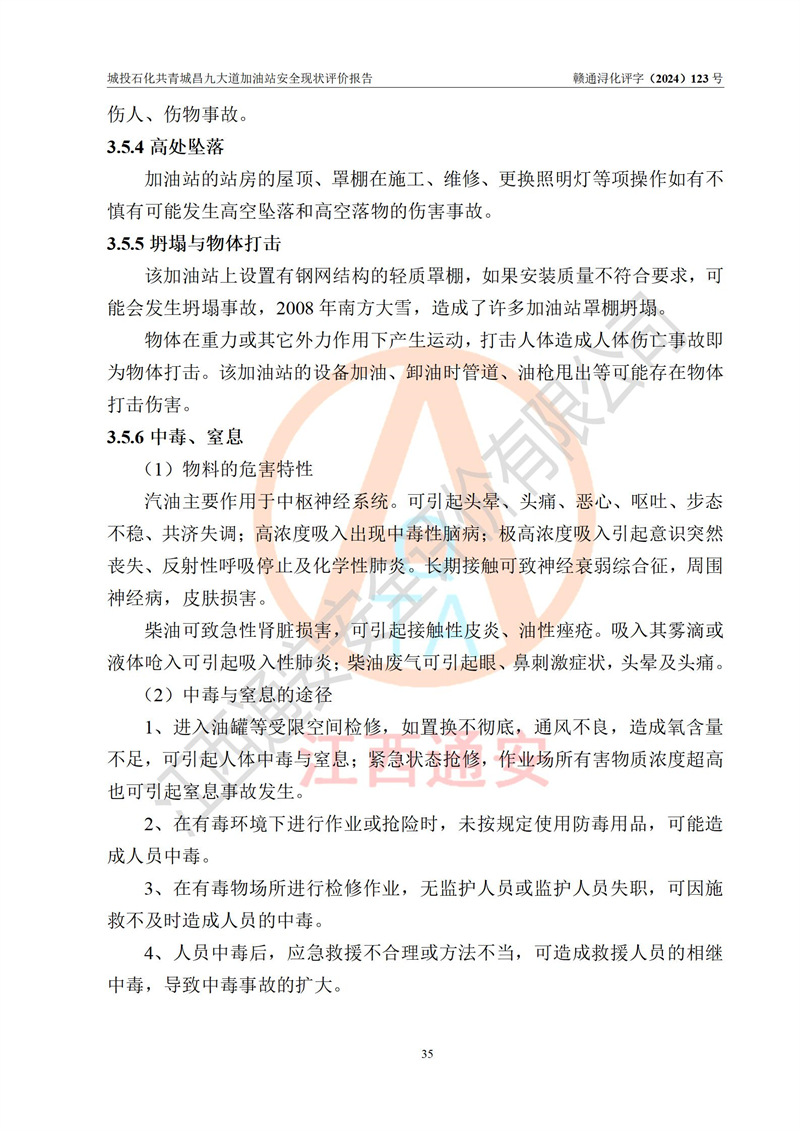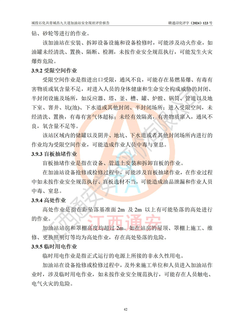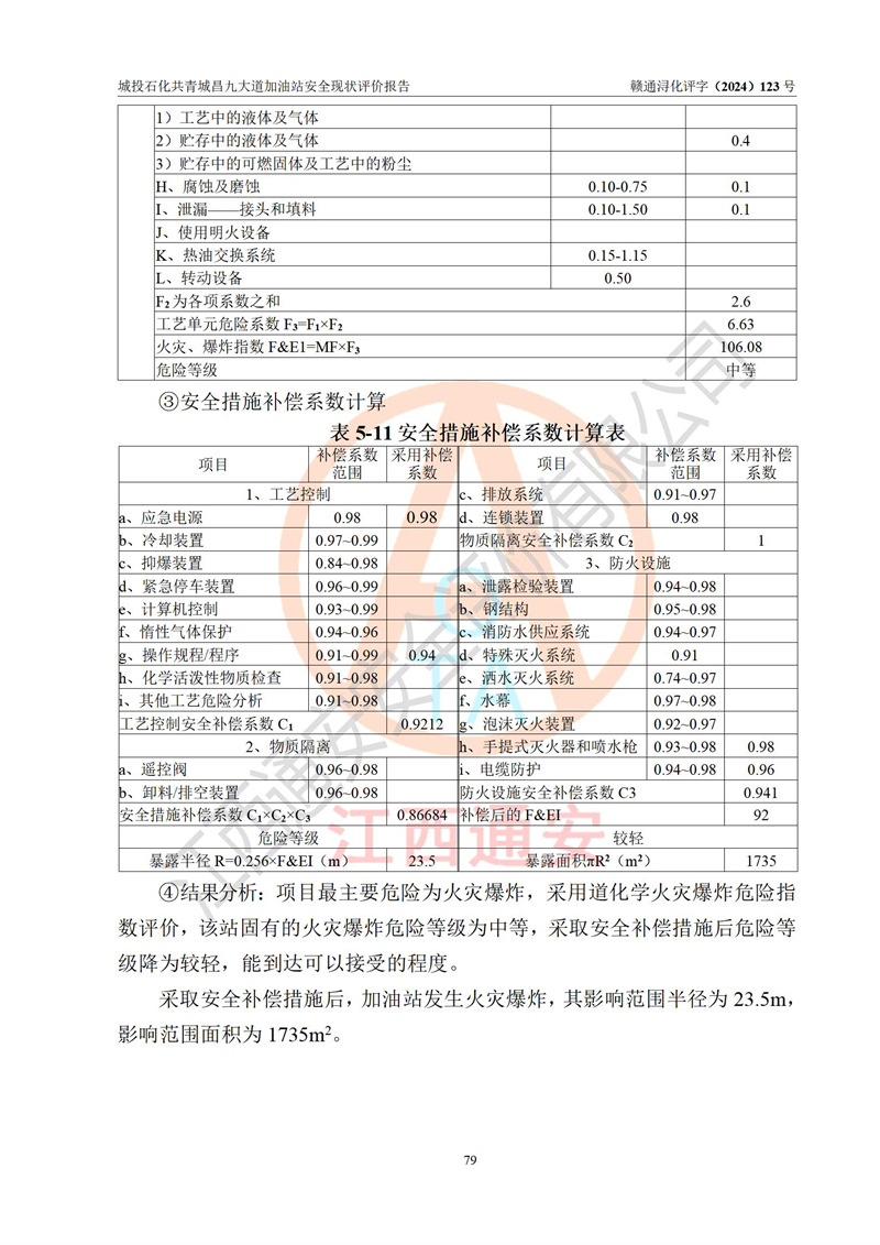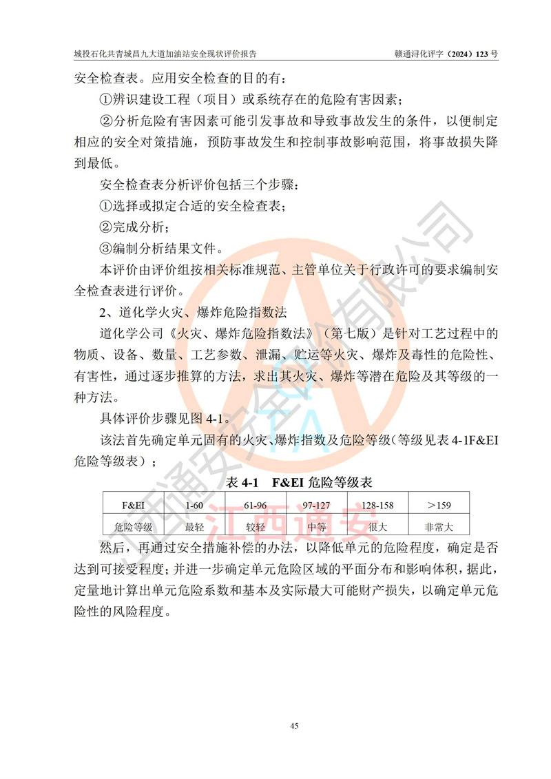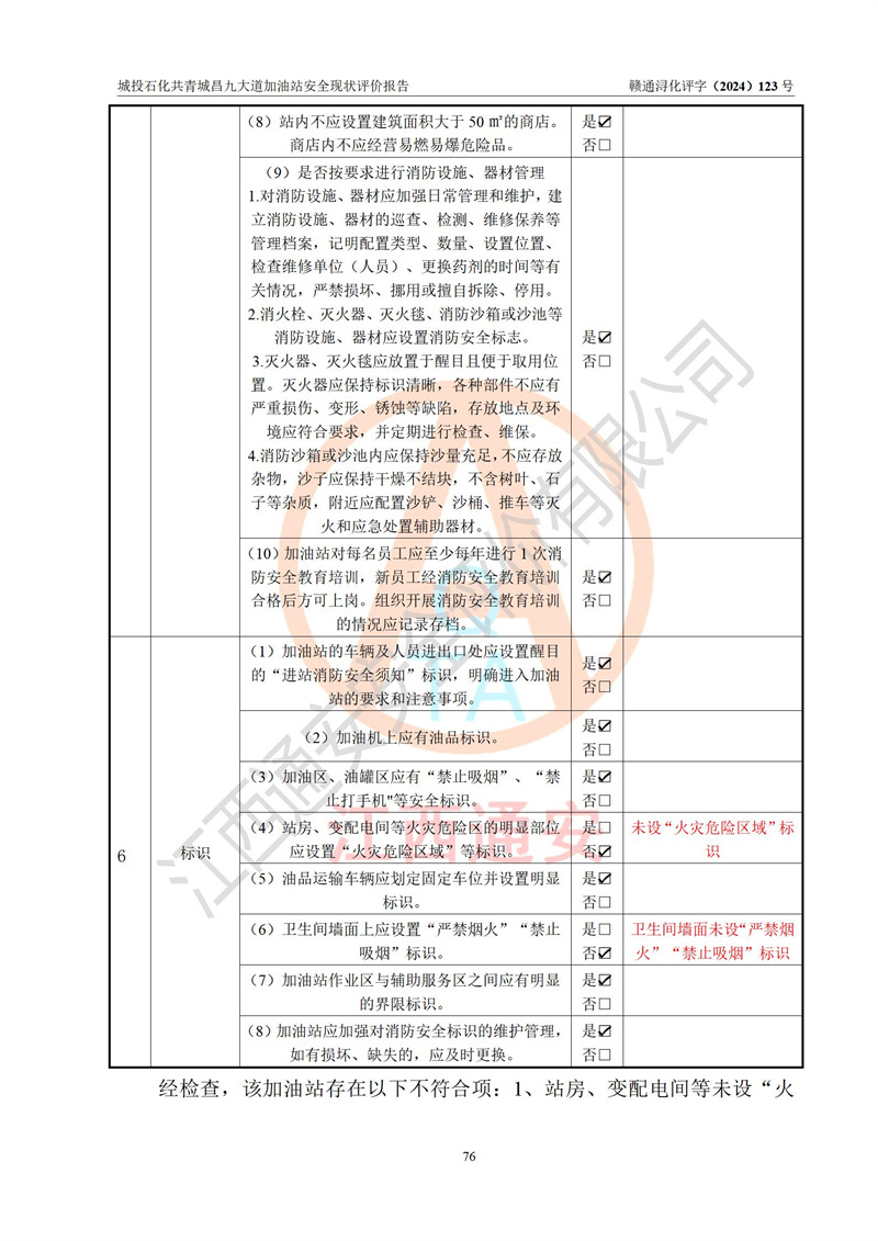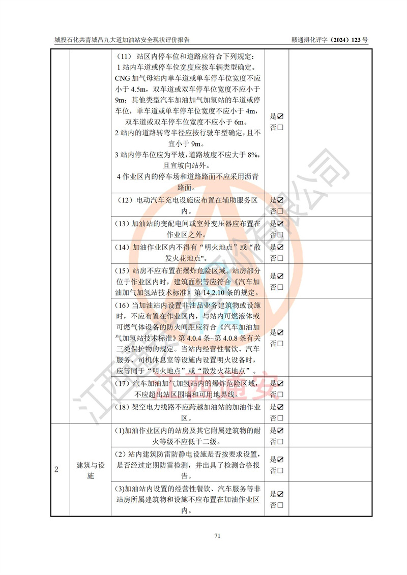 项目简介 | 九江市城投石化能源有限公司共青城昌九大道加油站是一家专门从事成品油零售经营的其他有限责任公司分公司,经营场所位于江西省九江市共青城市昌九大道以东、金牛山庄以南1楼。现有从业人员6名,其中安全管理人员1人,加油站负责人张田磊。 该加油站占地面积3600.30m2,站区内设置有4台4枪加油机及配套的工艺管线,设4台SF地下储罐,其中30m3的0#柴油储罐2台、30m3的92#汽油储罐1台、30m3的95#汽油储罐1台,油品储罐总容积共计120 m3(折算成汽油为90m3),按现行《汽车加油加气加氢站技术标准》对加油站的等级划分原则,属三级加油站。 该站由共青城市行政审批局换发《危险化学品经营许可证》(证号:赣共危化经字[2024]000001号),**期限2024年04月24日至2027年04月23日。 | |||