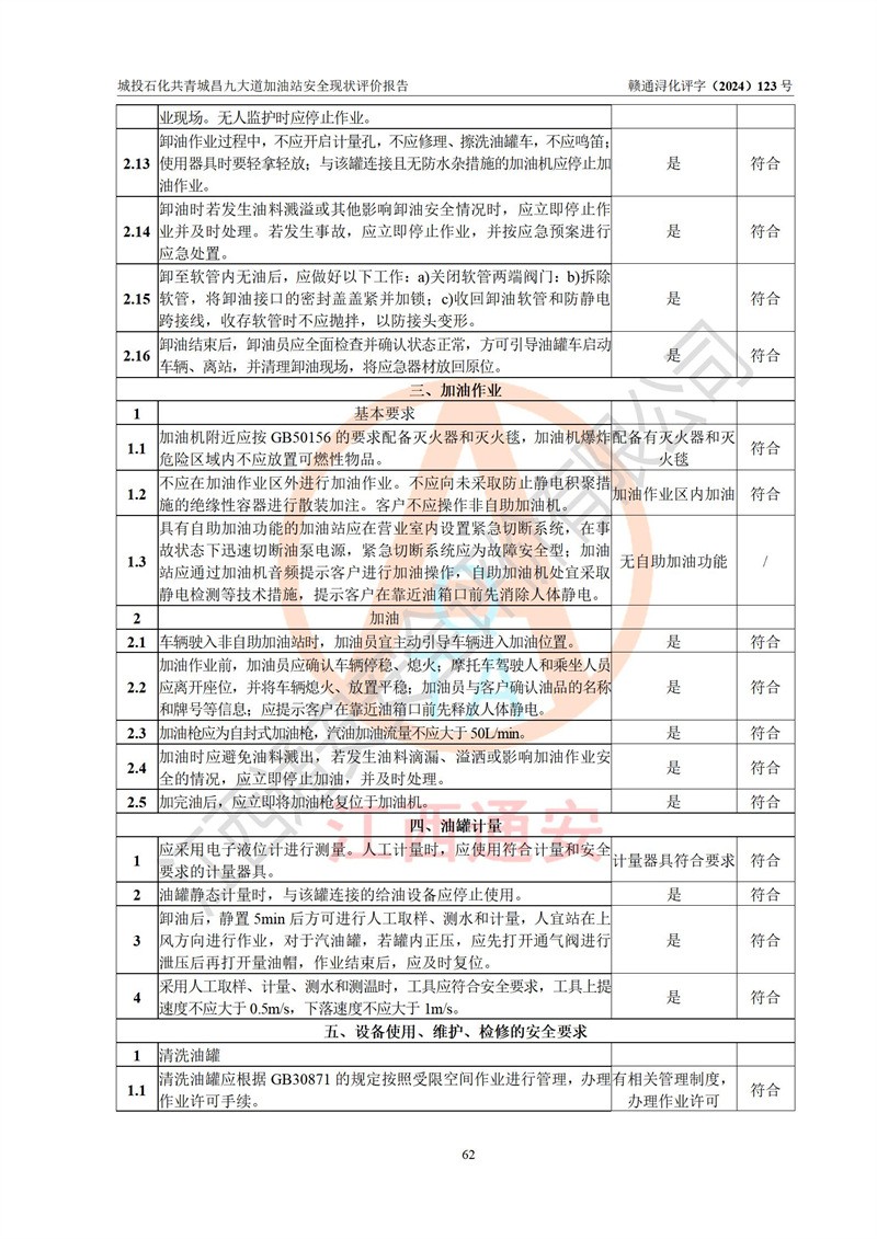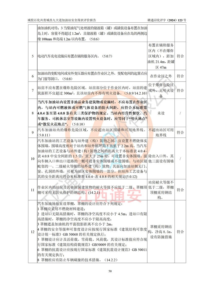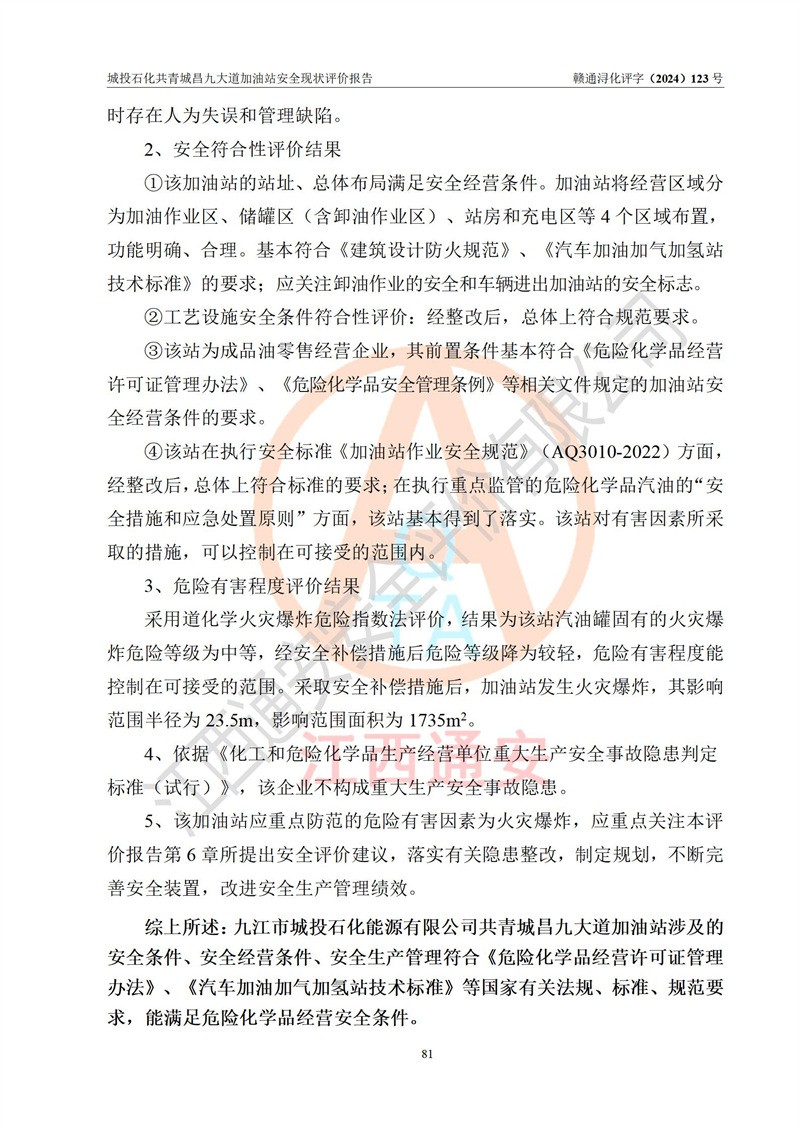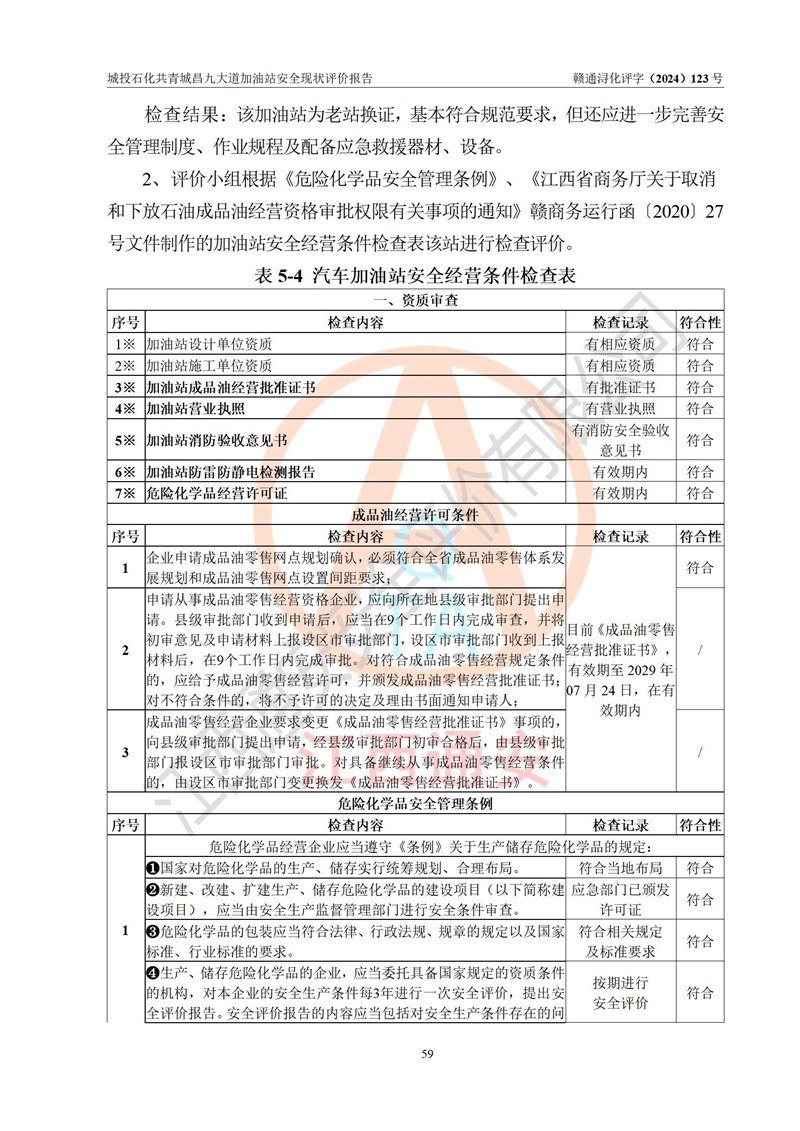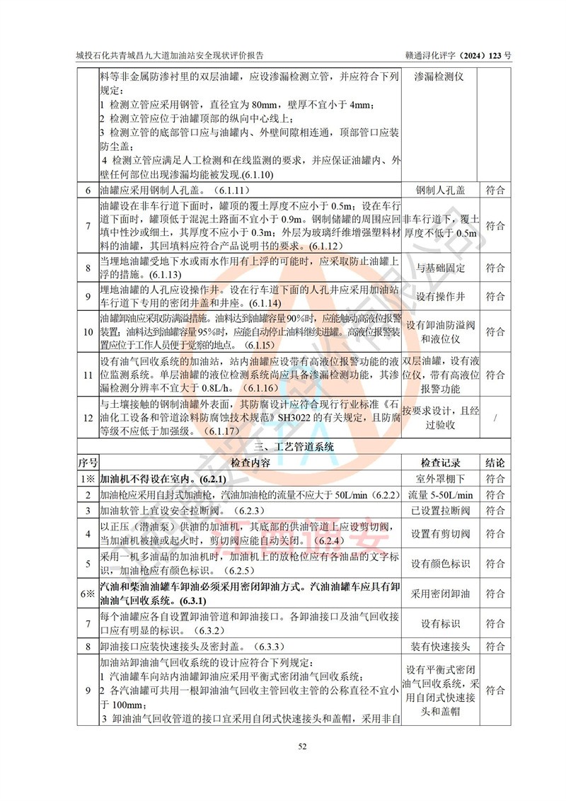 评价结论 | 九江市城投石化能源有限公司共青城昌九大道加油站涉及的安全条件、安全经营条件、安全生产管理符合《危险化学品经营许可证管理办法》、《汽车加油加气加氢站技术标准》等**有关法规、标准、规范要求,能满足危险化学品经营安全条件。 | |||