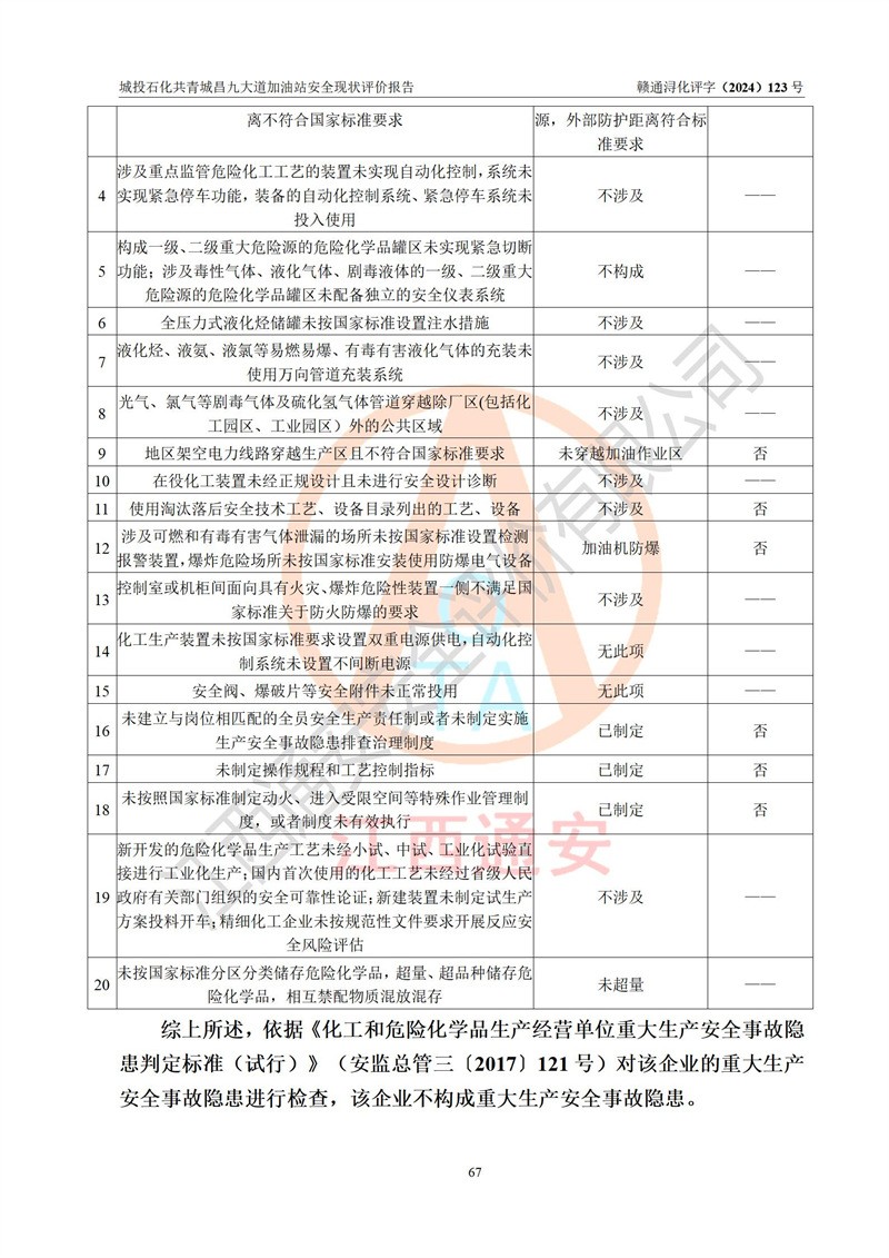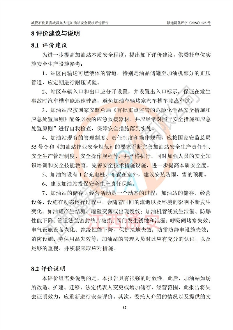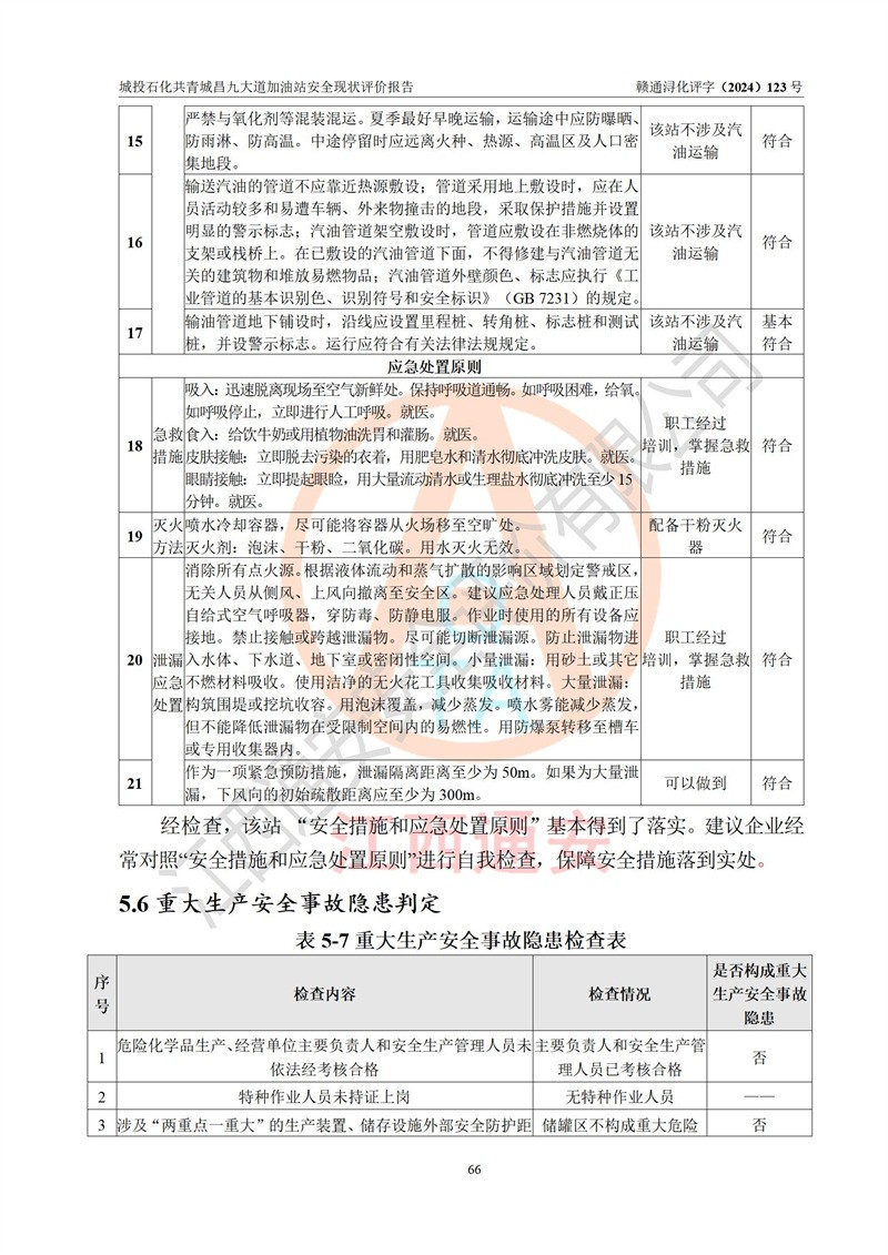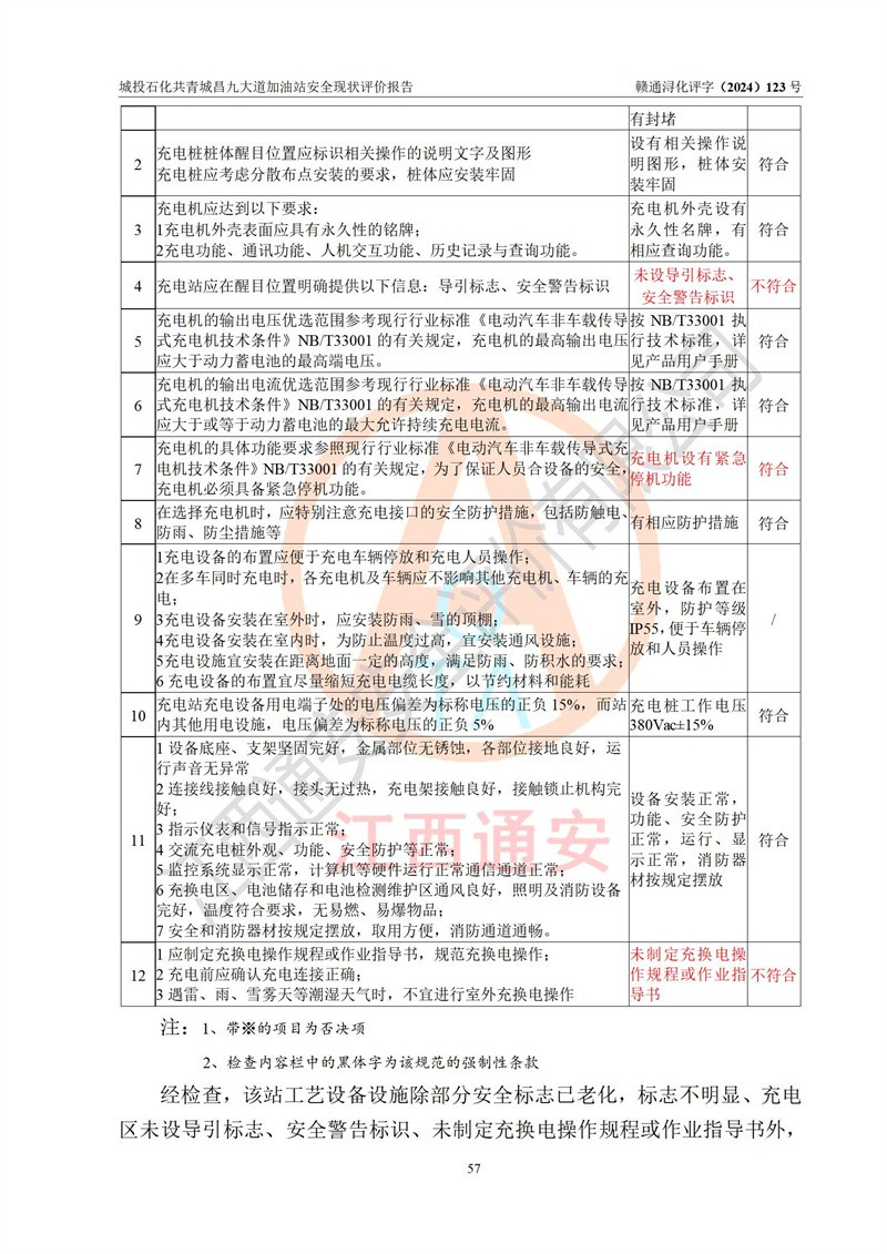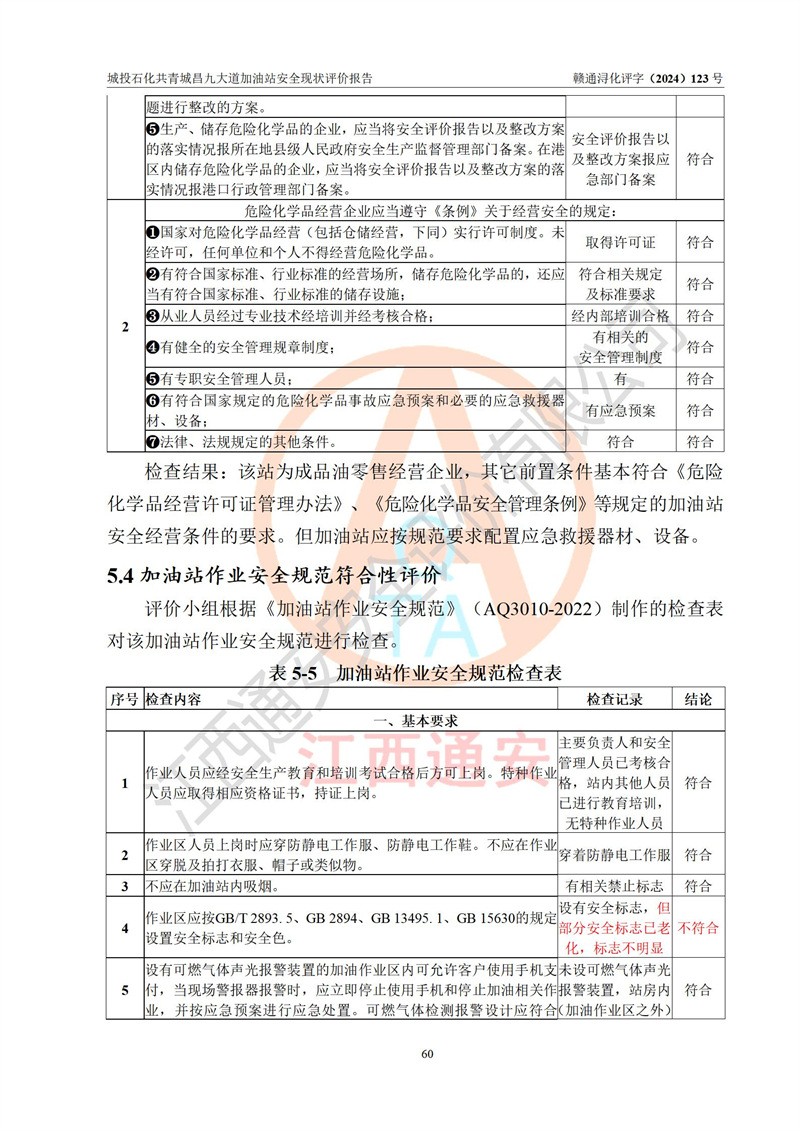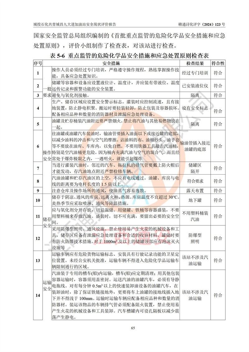 评价结论 | 九江市城投石化能源有限公司共青城昌九大道加油站涉及的安全条件、安全经营条件、安全生产管理符合《危险化学品经营许可证管理办法》、《汽车加油加气加氢站技术标准》等**有关法规、标准、规范要求,能满足危险化学品经营安全条件。 | |||
