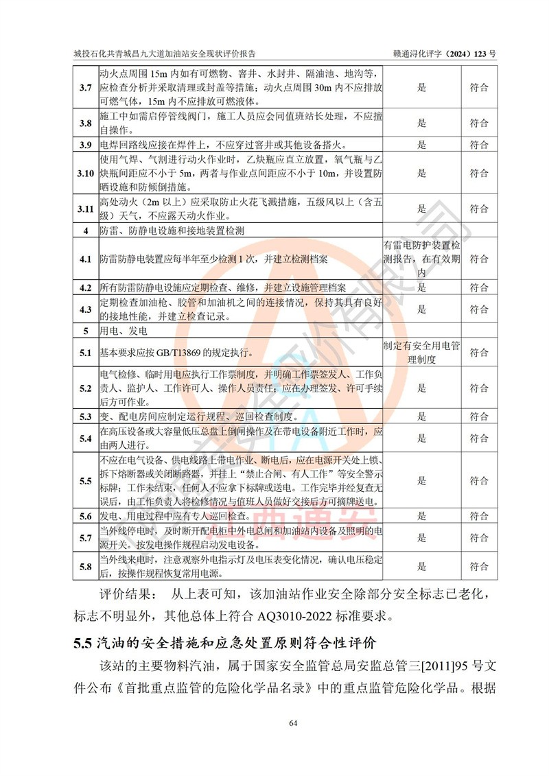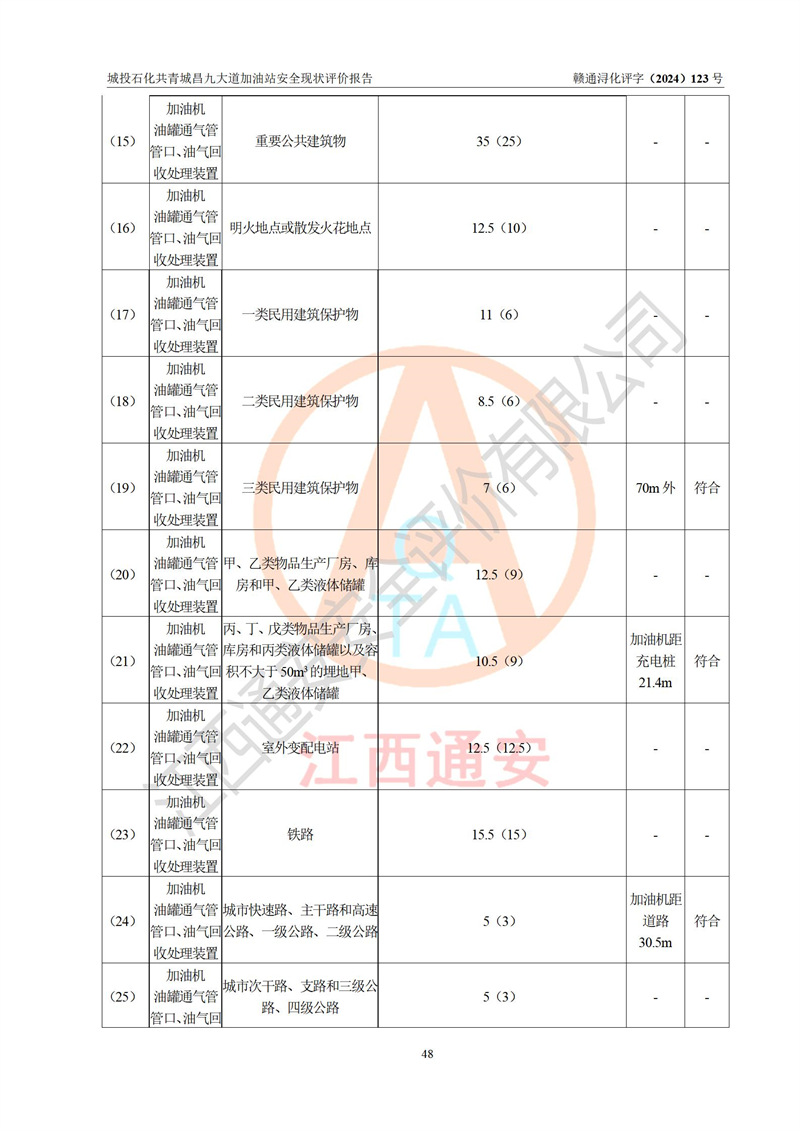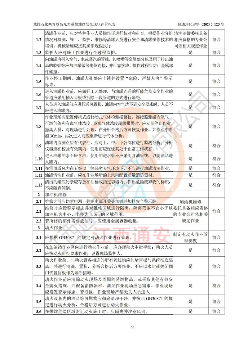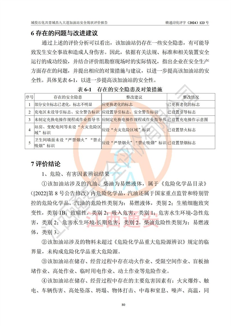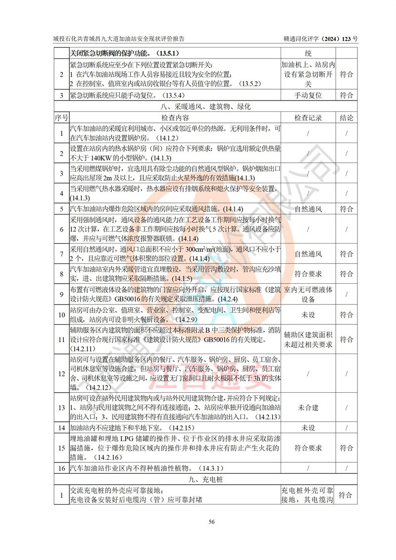 评价结论 | 九江市城投石化能源有限公司共青城昌九大道加油站涉及的安全条件、安全经营条件、安全生产管理符合《危险化学品经营许可证管理办法》、《汽车加油加气加氢站技术标准》等**有关法规、标准、规范要求,能满足危险化学品经营安全条件。 | |||