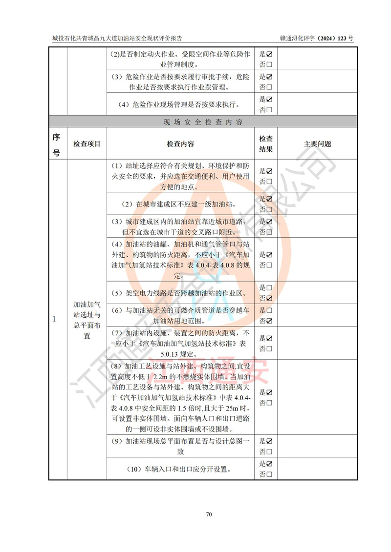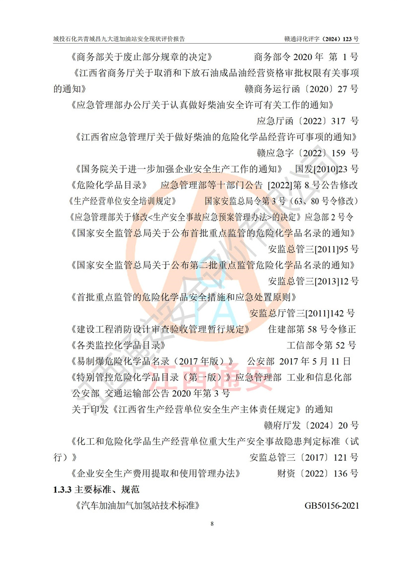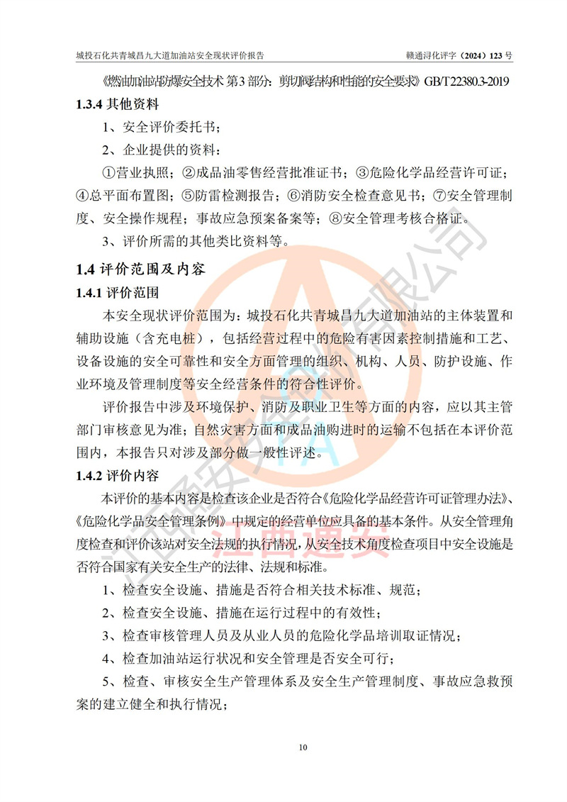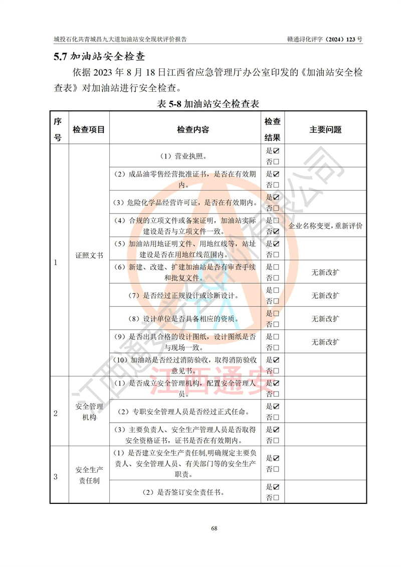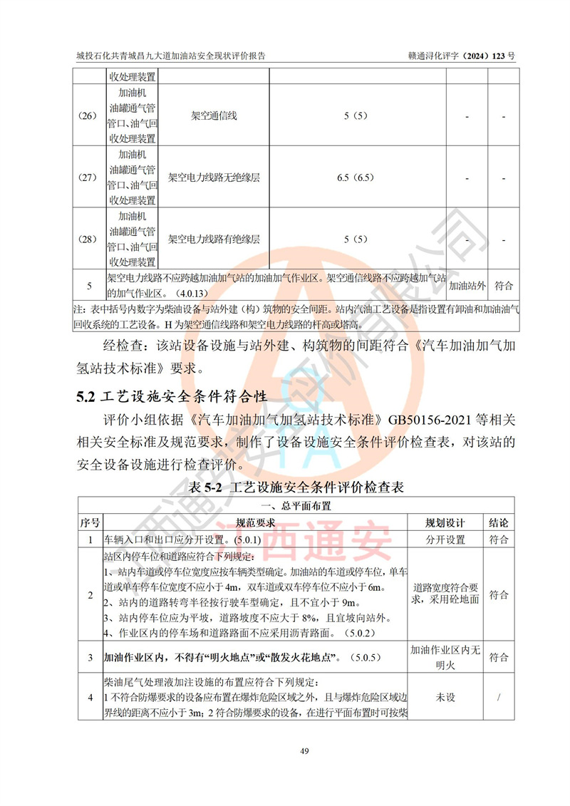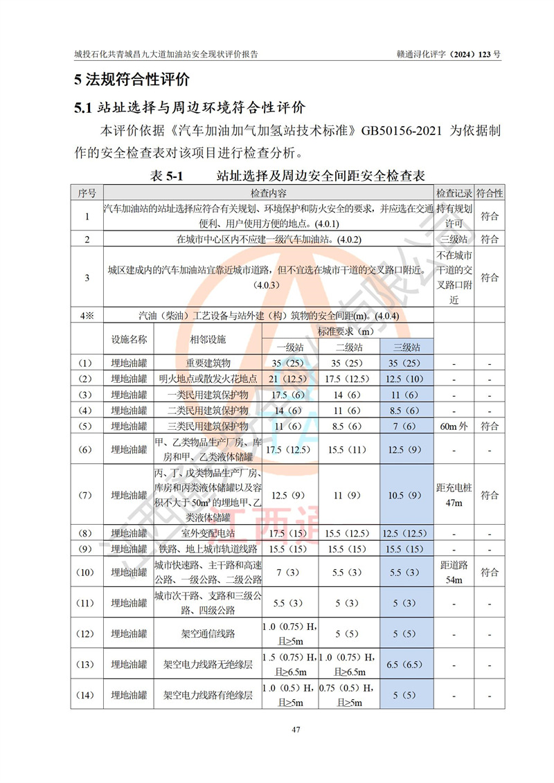 评价结论 | 九江市城投石化能源有限公司共青城昌九大道加油站涉及的安全条件、安全经营条件、安全生产管理符合《危险化学品经营许可证管理办法》、《汽车加油加气加氢站技术标准》等**有关法规、标准、规范要求,能满足危险化学品经营安全条件。 | |||