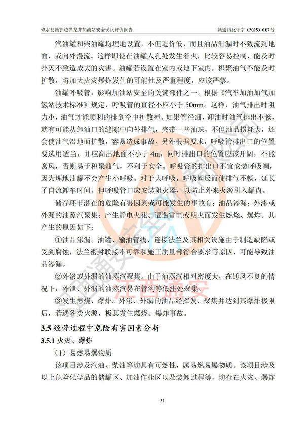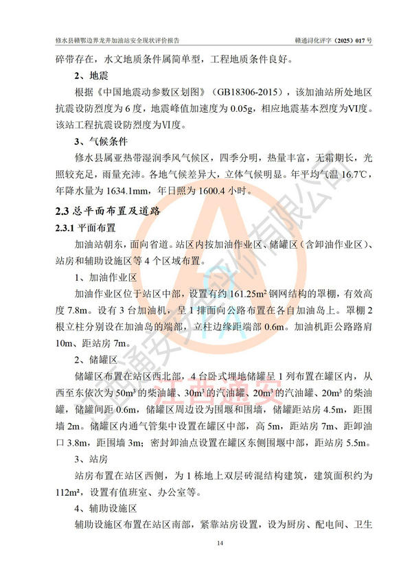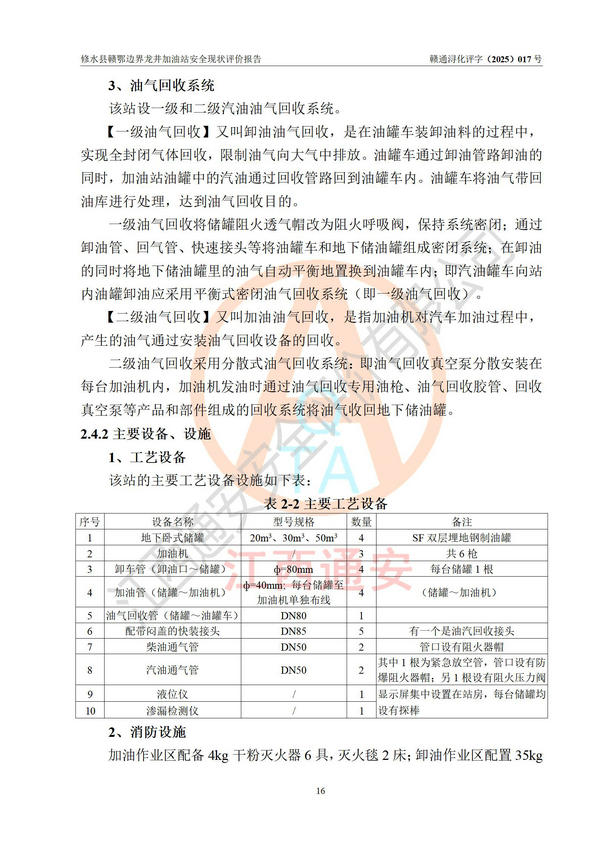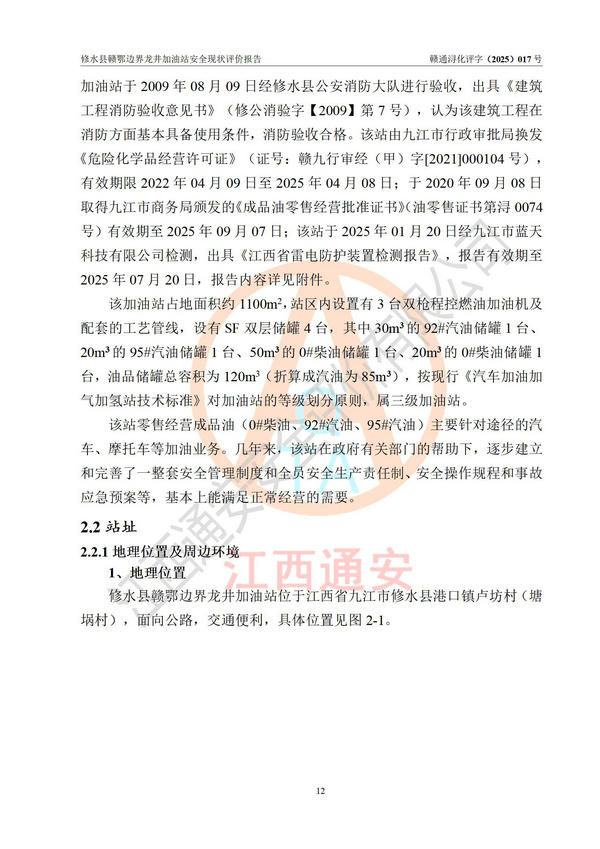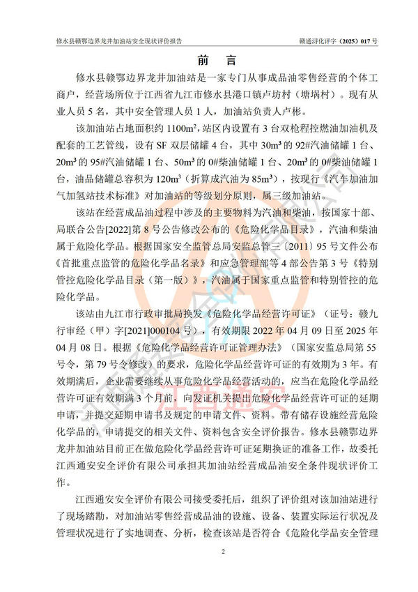 项目简介 | 修水县赣鄂边界龙井加油站是一家专门从事成品油零售经营的个体工商户,经营场所位于江西省九江市修水县港口镇卢坊村(塘埚村)。现有从业人员5名,其中安全管理人员1人,加油站负责人卢彬。 该加油站占地面积约1100m2,站区内设置有3台双枪程控燃油加油机及配套的工艺管线,设有SF双层储罐4台,其中30m3的92#汽油储罐1台、20m3的95#汽油储罐1台、50m3的0#柴油储罐1台、20m3的0#柴油储罐1台,油品储罐总容积为120m3(折算成汽油为85m3),按现行《汽车加油加气加氢站技术标准》对加油站的等级划分原则,属三级加油站。 该站由九江市行政审批局换发《危险化学品经营许可证》(证号:赣九行审经(甲)字[2021]000104号),**期限2022年04月09日至2025年04月08日。 | |||