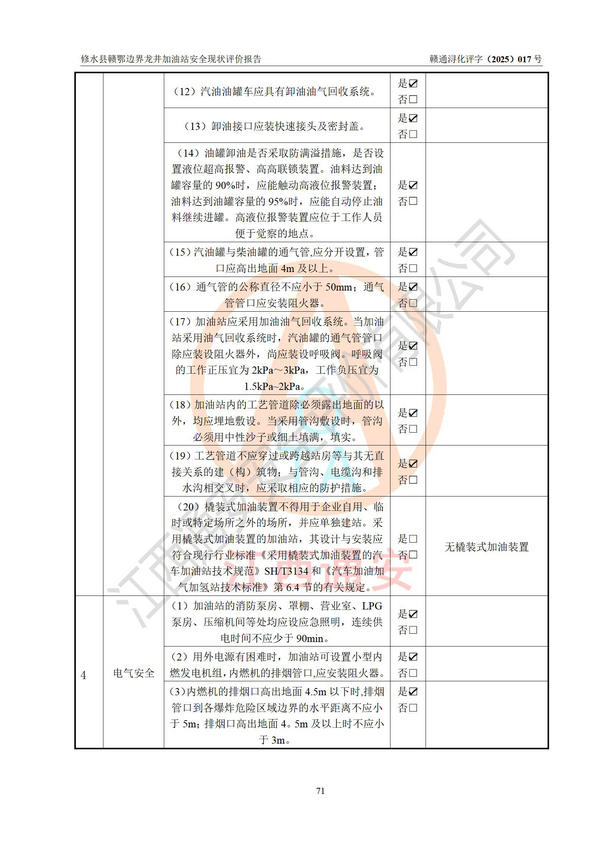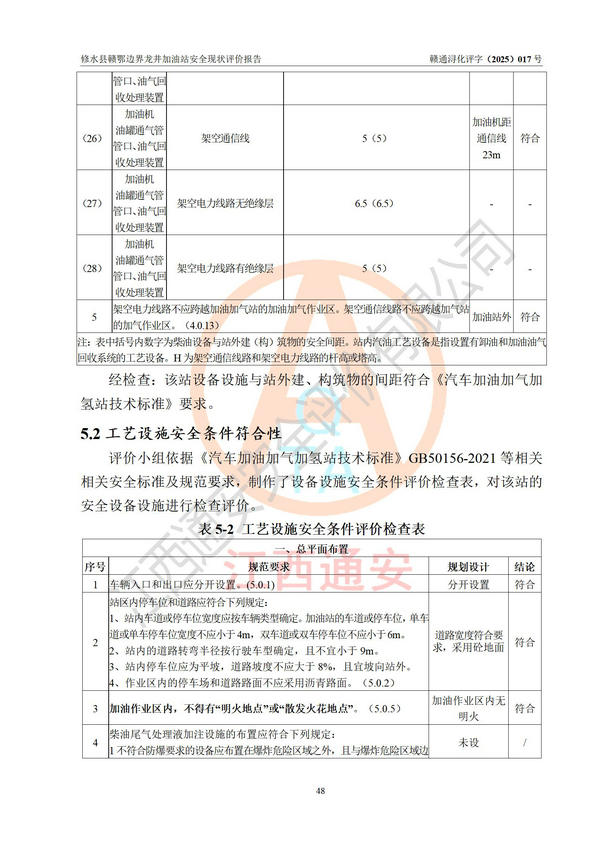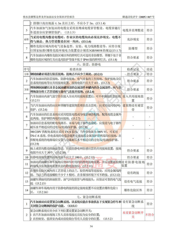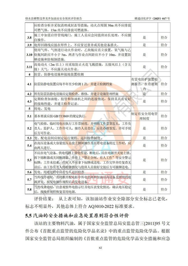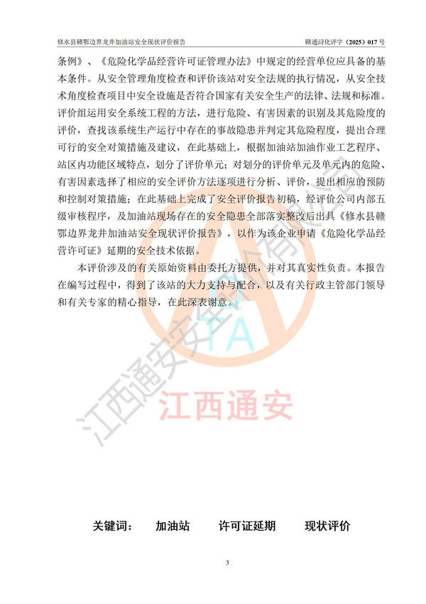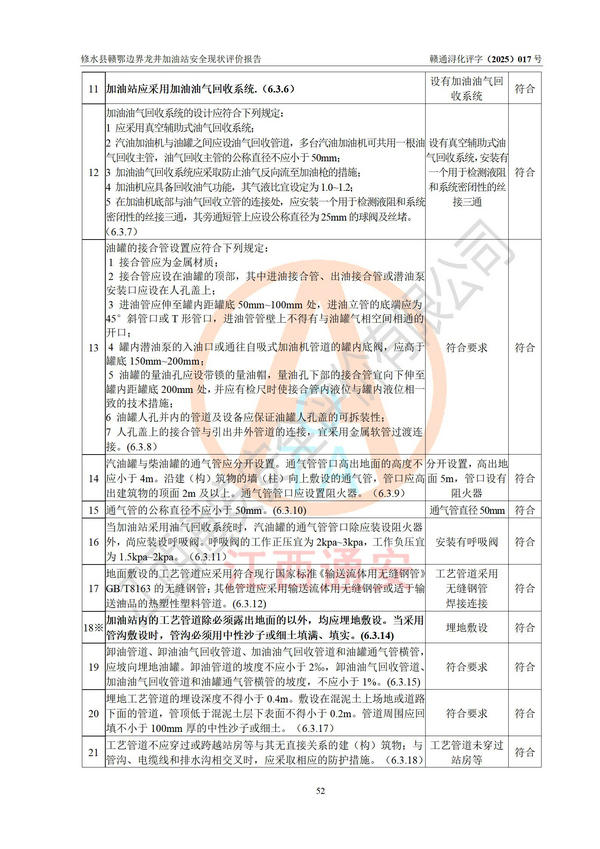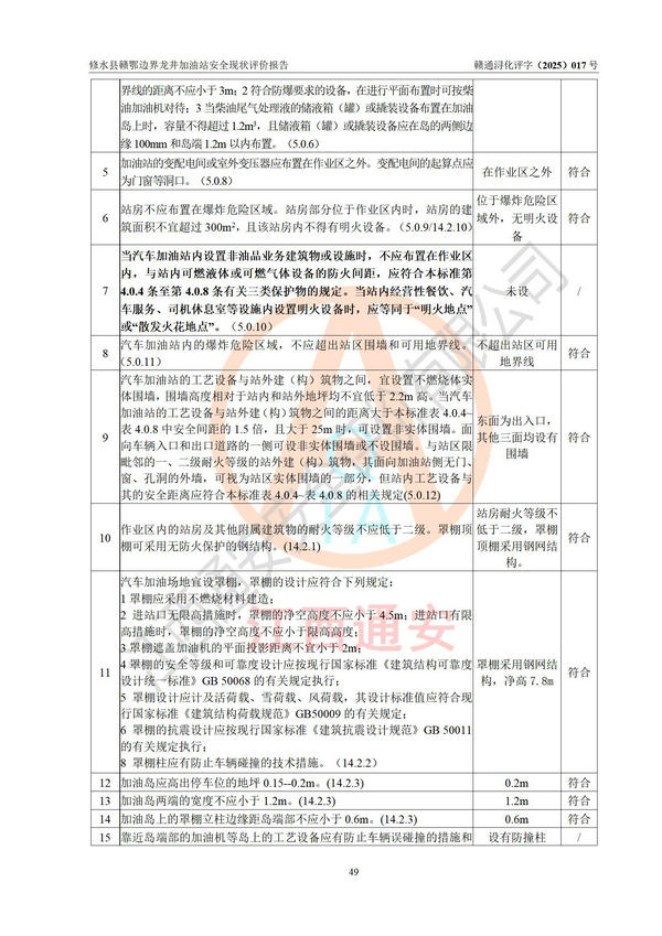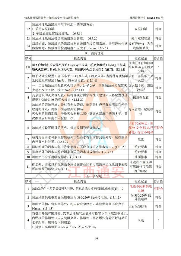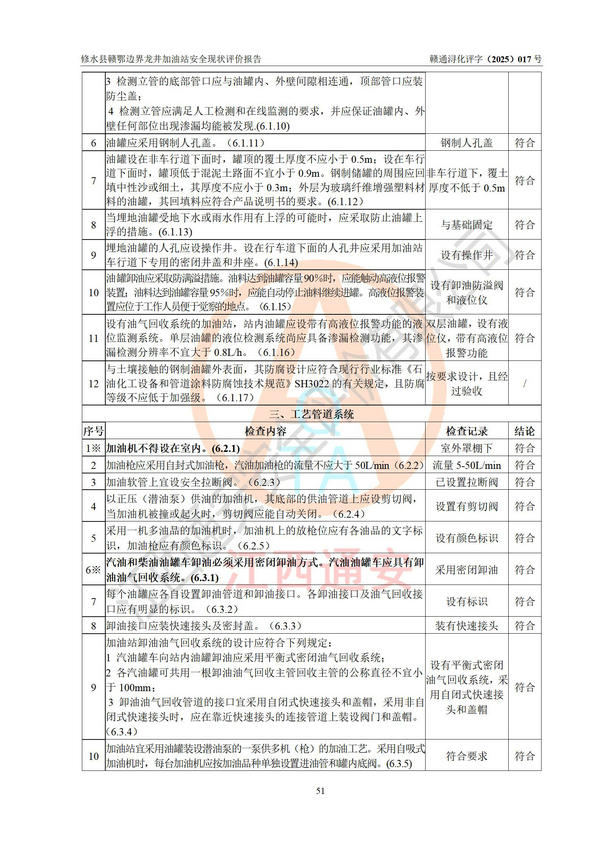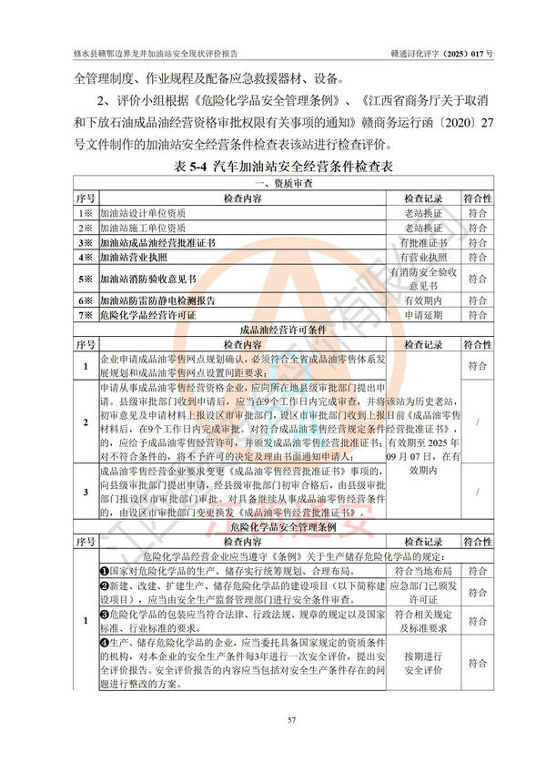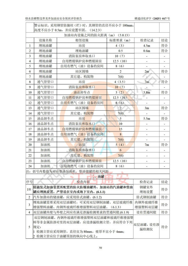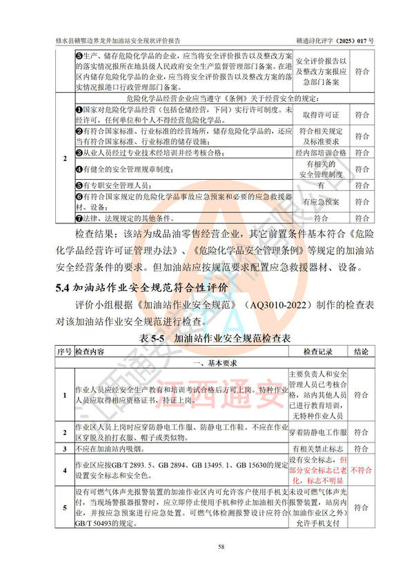 评价结论 | 修水县赣鄂边界龙井加油站涉及的安全条件、安全经营条件、安全生产管理符合《危险化学品经营许可证管理办法》、《汽车加油加气加氢站技术标准》等**有关法规、标准、规范要求,能满足危险化学品经营安全条件。 | |||
