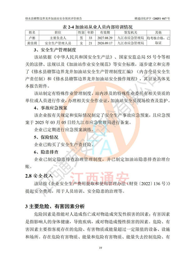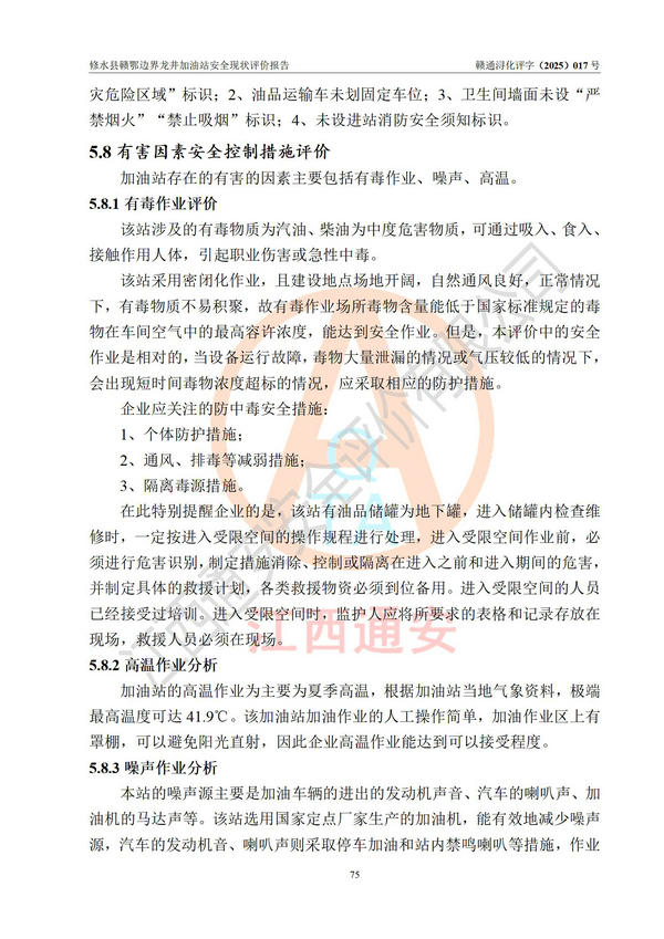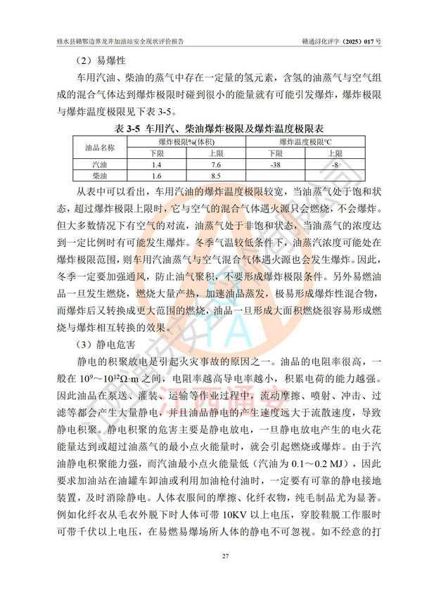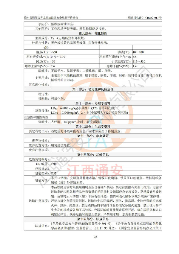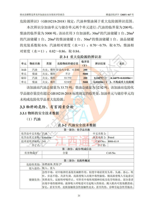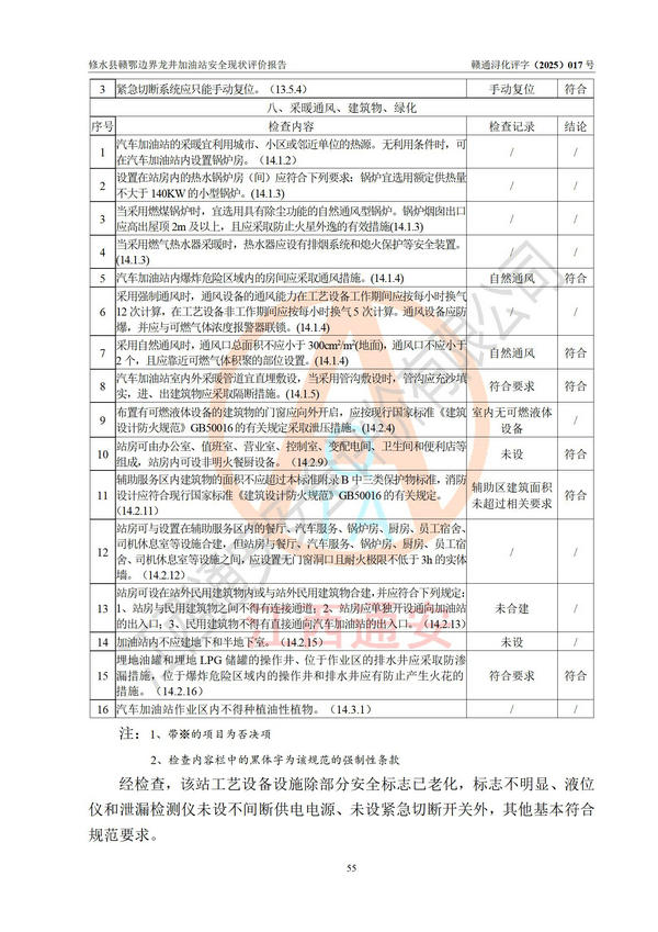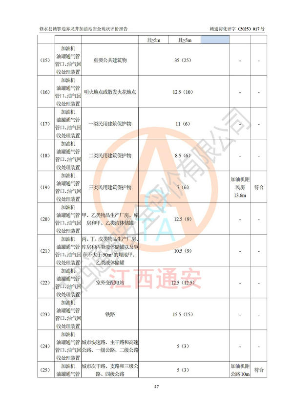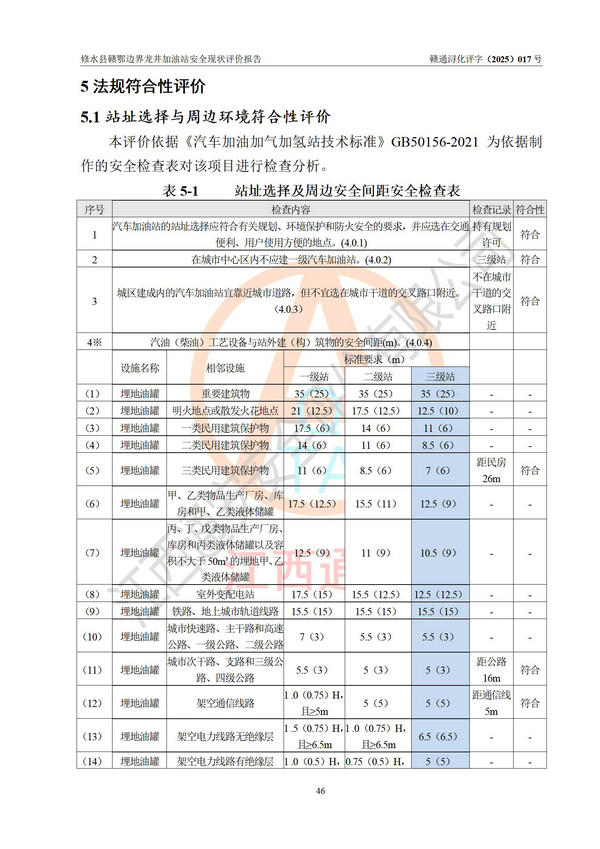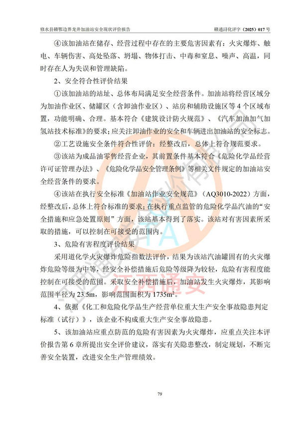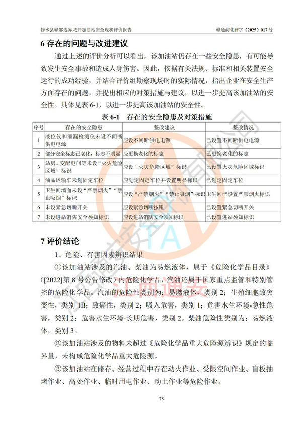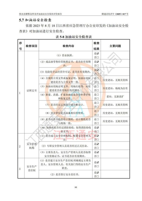 评价结论 | 修水县赣鄂边界龙井加油站涉及的安全条件、安全经营条件、安全生产管理符合《危险化学品经营许可证管理办法》、《汽车加油加气加氢站技术标准》等**有关法规、标准、规范要求,能满足危险化学品经营安全条件。 | |||