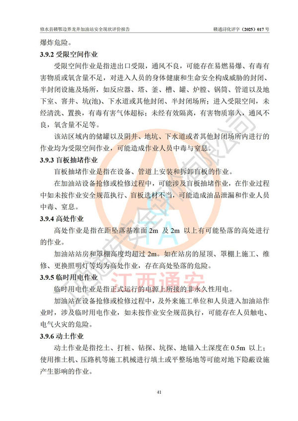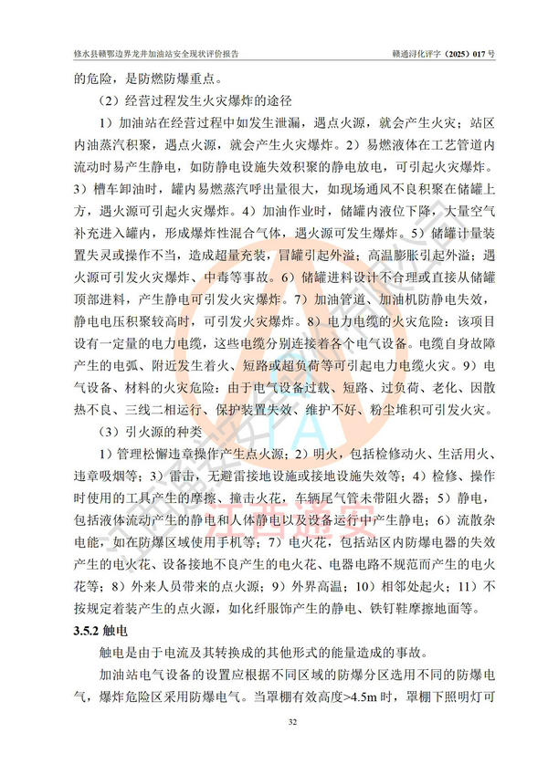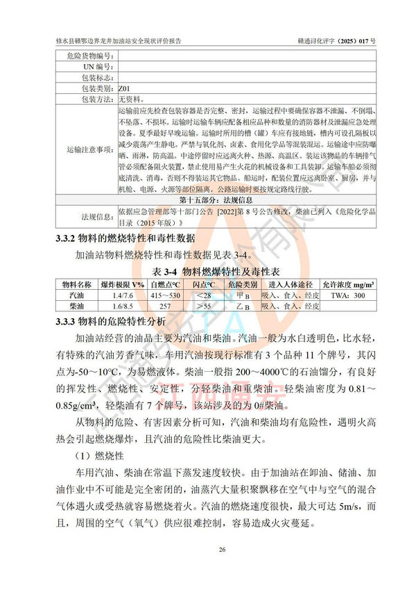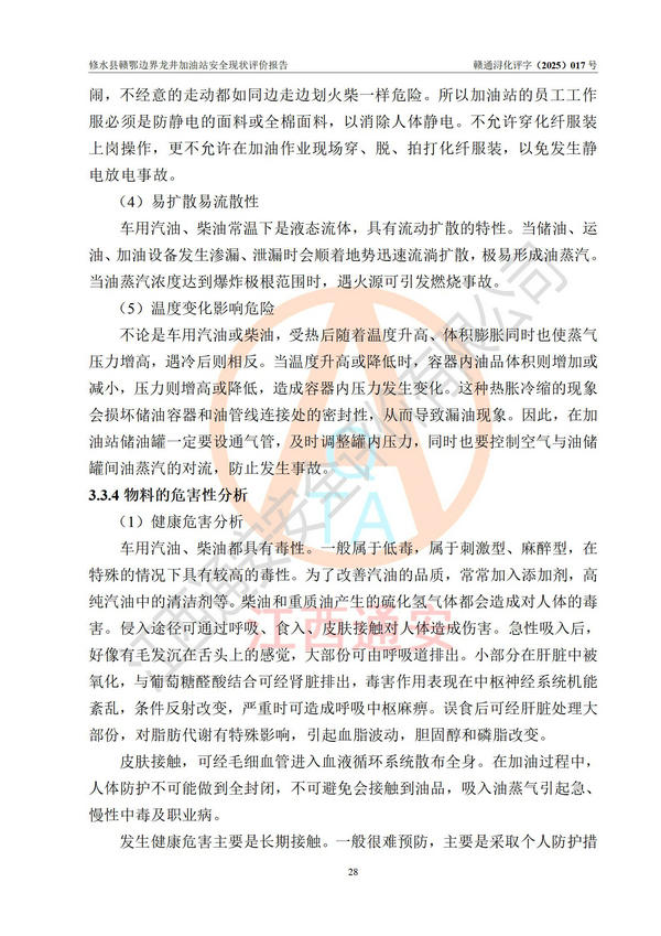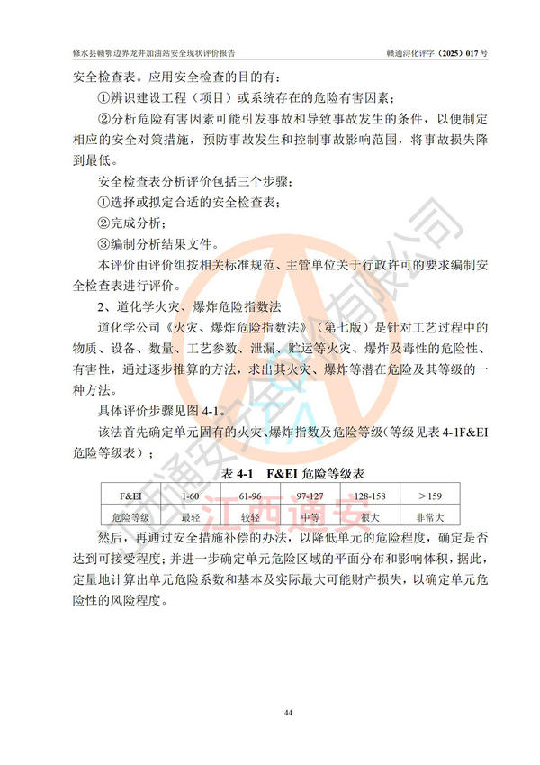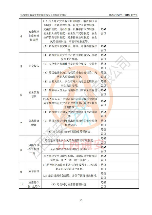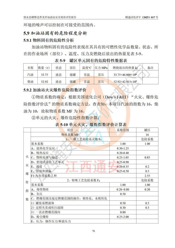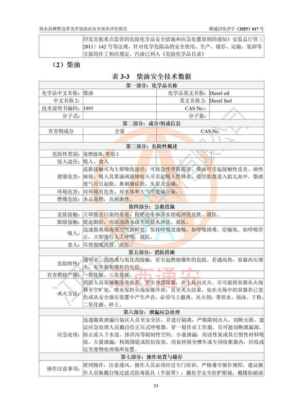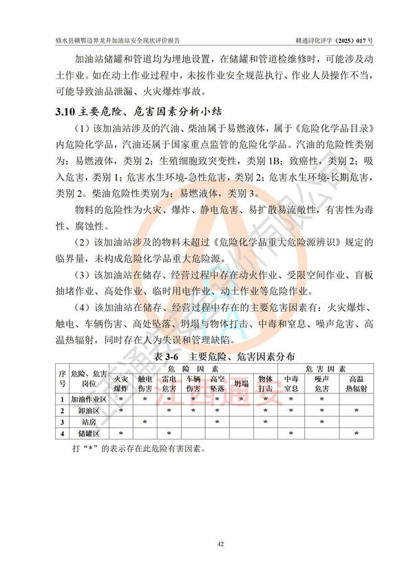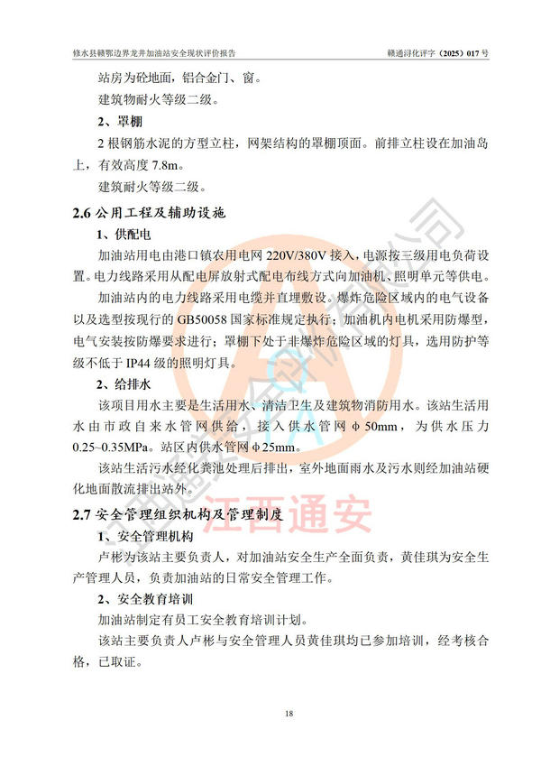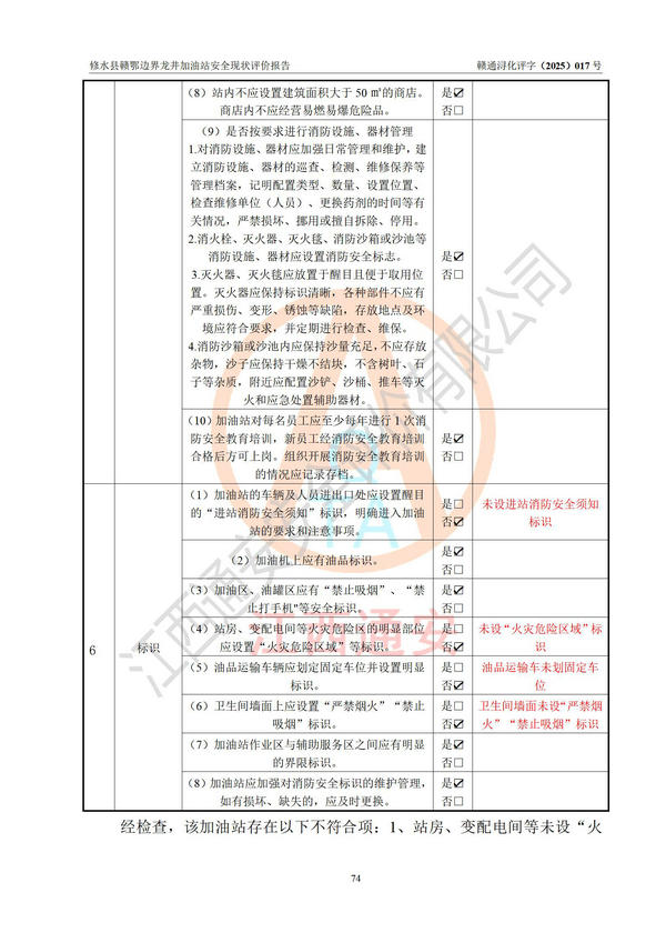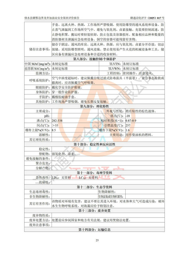 评价结论 | 修水县赣鄂边界龙井加油站涉及的安全条件、安全经营条件、安全生产管理符合《危险化学品经营许可证管理办法》、《汽车加油加气加氢站技术标准》等**有关法规、标准、规范要求,能满足危险化学品经营安全条件。 | |||
