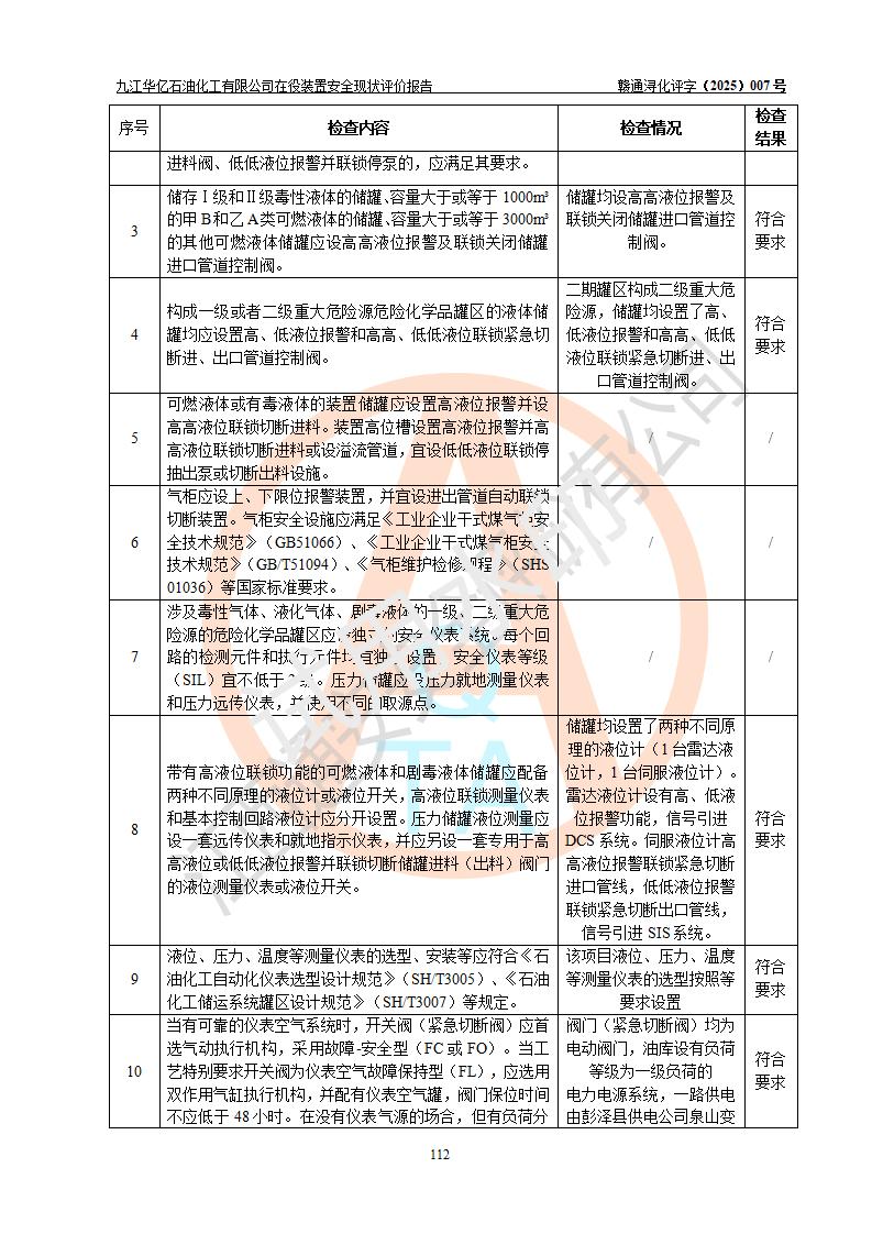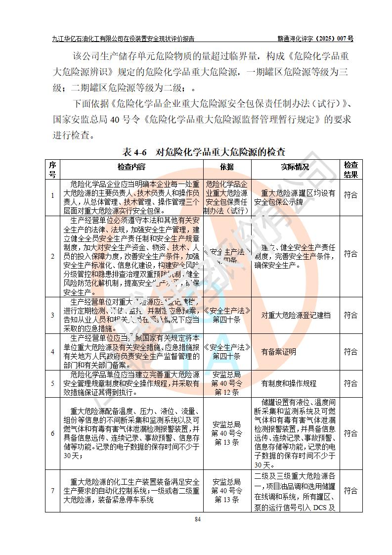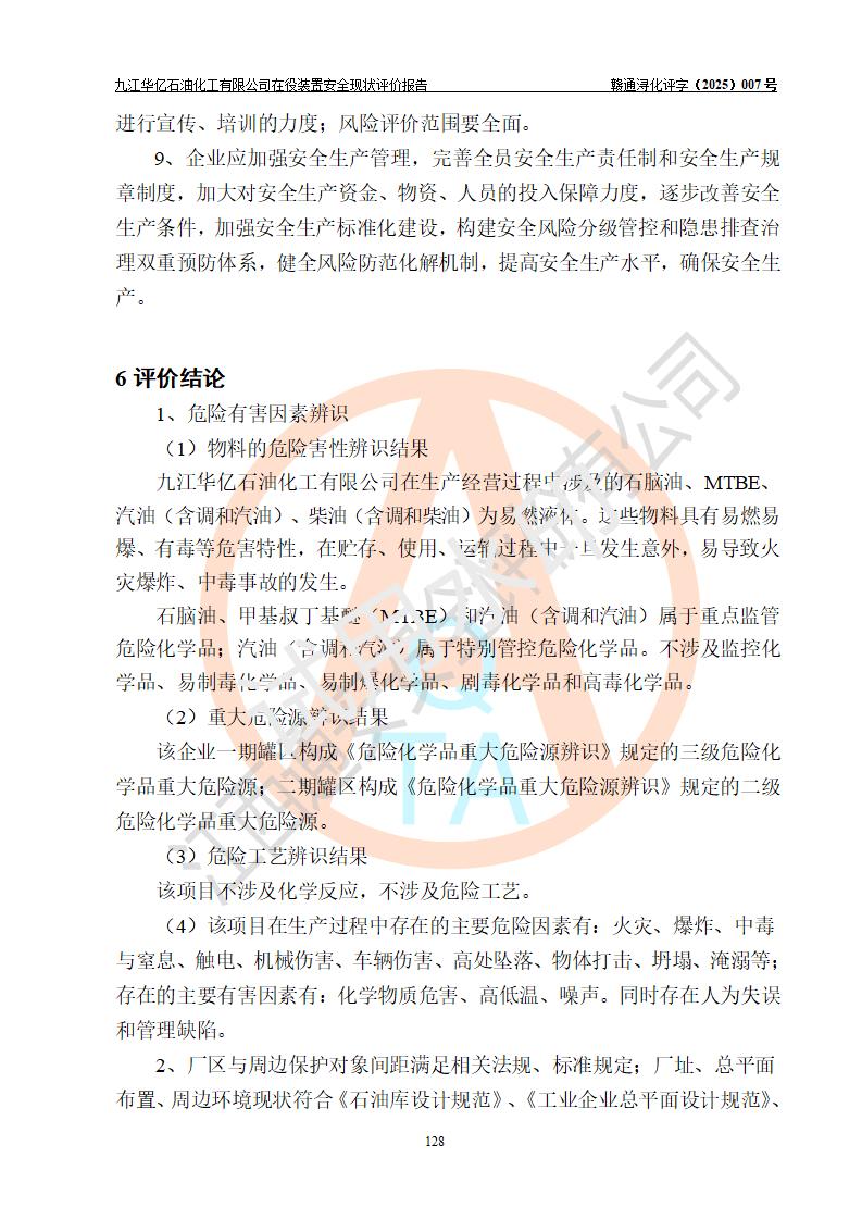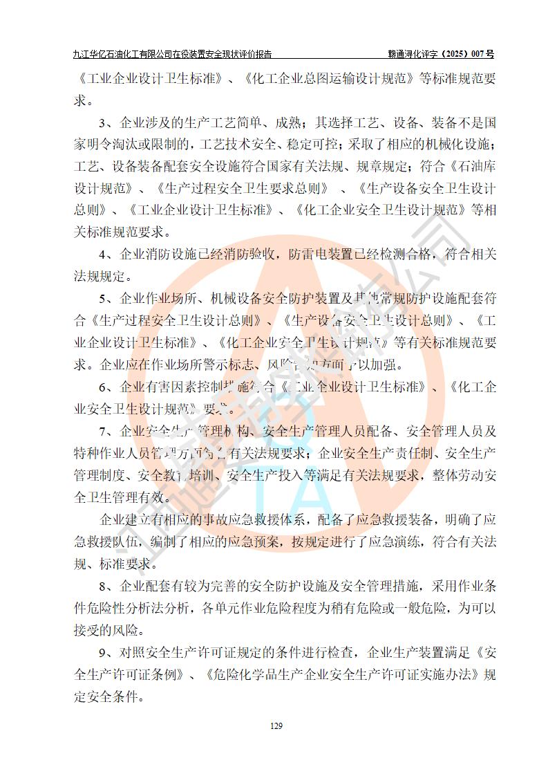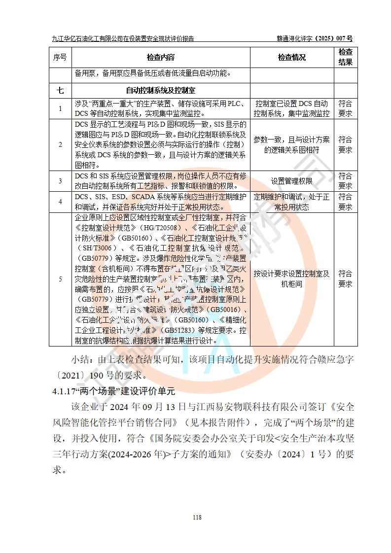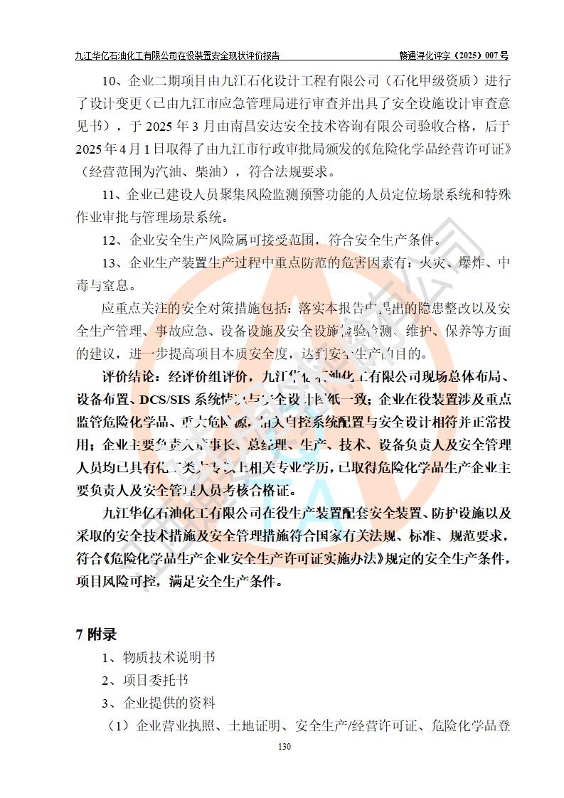 评价结论 | 经评价组评价,九江华亿石油化工有限公司现场总体布局、设备布置、DCS/SIS系统情况与安全设计图纸一致;企业在役装置涉及重点监管危险化学品、重大危险源,相关自控系统配置与安全设计相符并正常投用;企业主要负责人董事长、总经理、生产、技术、设备负责人及安全管理人员均已具有化工类大专以上相关专业学历,已取得危险化学品生产企业主要负责人及安全管理人员考核合格证。 九江华亿石油化工有限公司在役生产装置配套安全装置、防护设施以及采取的安全技术措施及安全管理措施符合**有关法规、标准、规范要求,符合《危险化学品生产企业安全生产许可证实施办法》规定的安全生产条件,项目风险可控,满足安全生产条件。