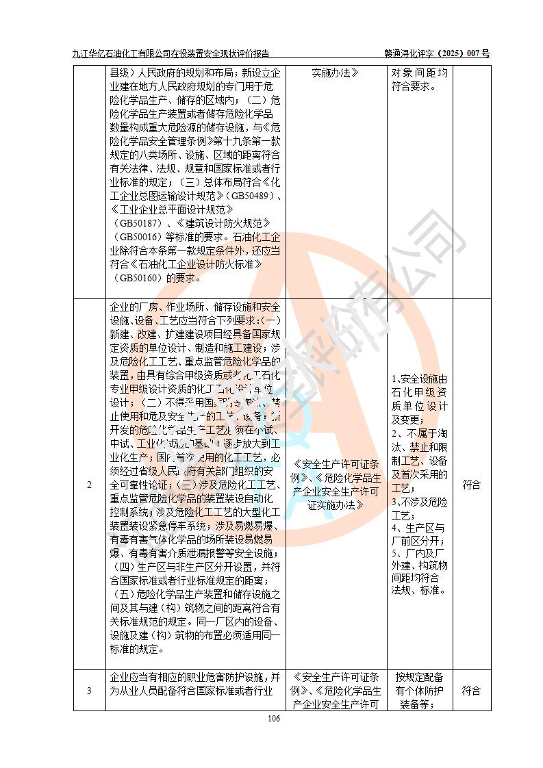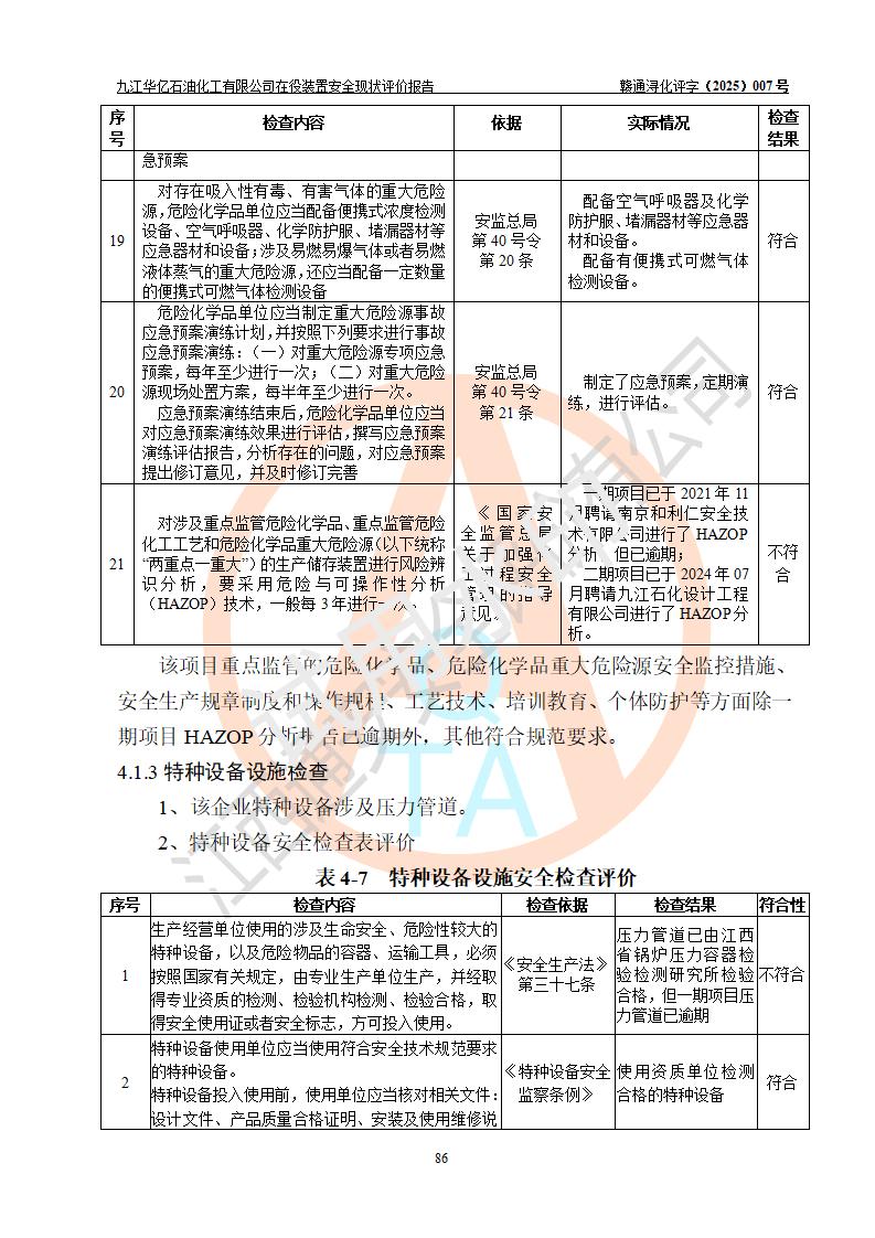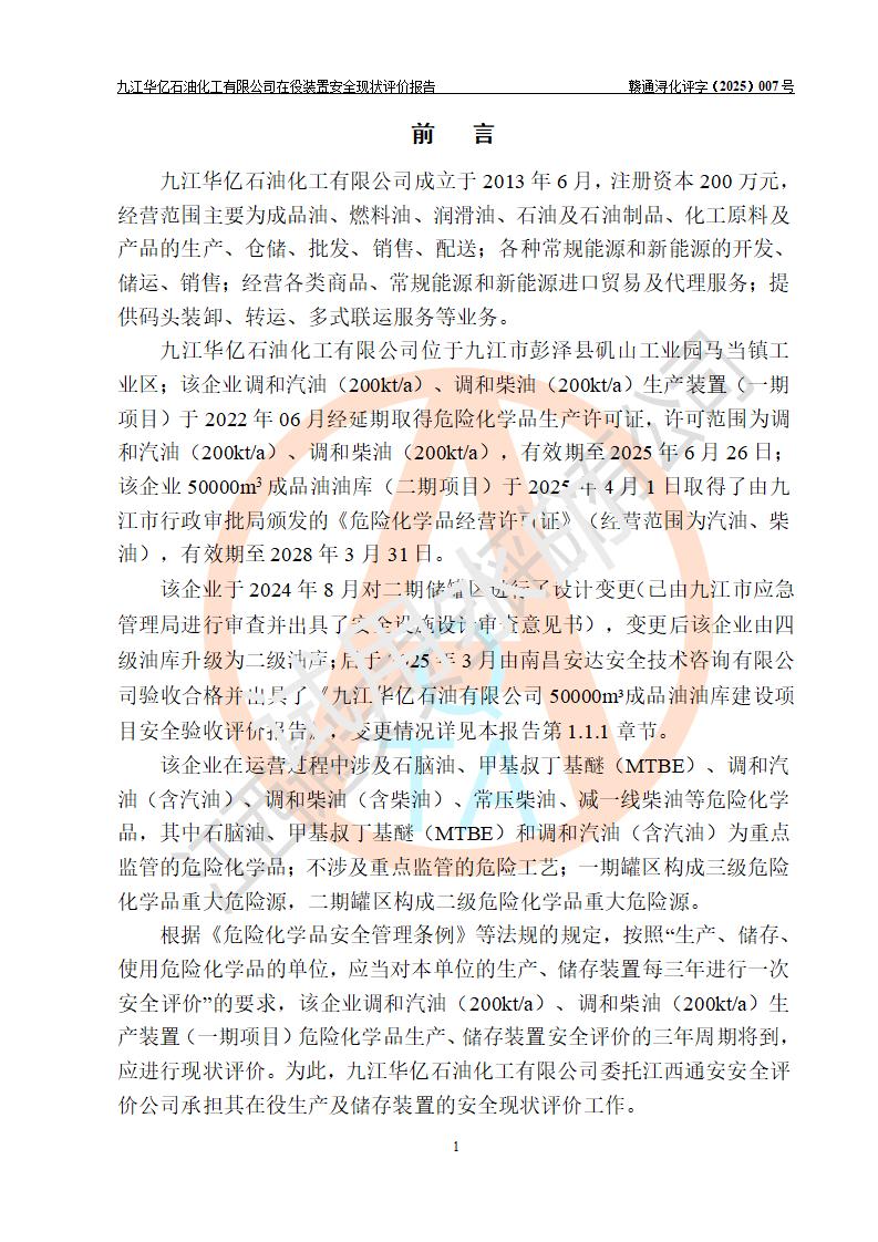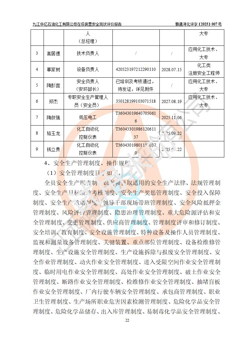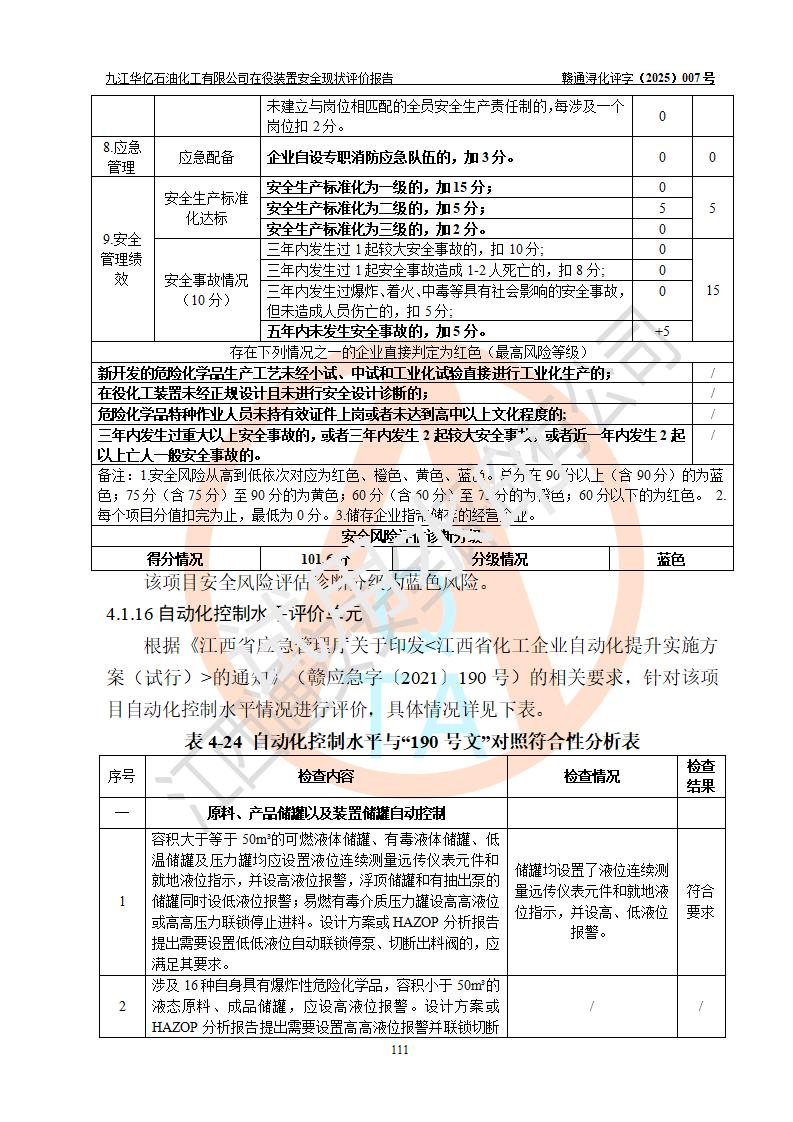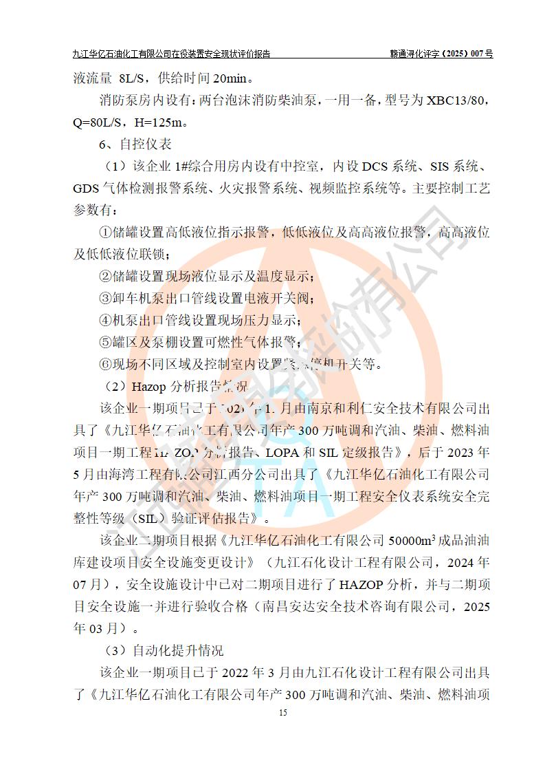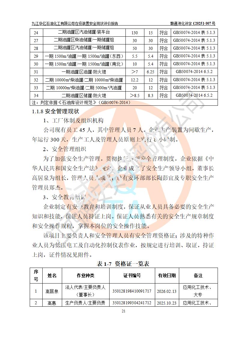 评价结论 | 经评价组评价,九江华亿石油化工有限公司现场总体布局、设备布置、DCS/SIS系统情况与安全设计图纸一致;企业在役装置涉及重点监管危险化学品、重大危险源,相关自控系统配置与安全设计相符并正常投用;企业主要负责人董事长、总经理、生产、技术、设备负责人及安全管理人员均已具有化工类大专以上相关专业学历,已取得危险化学品生产企业主要负责人及安全管理人员考核合格证。 九江华亿石油化工有限公司在役生产装置配套安全装置、防护设施以及采取的安全技术措施及安全管理措施符合**有关法规、标准、规范要求,符合《危险化学品生产企业安全生产许可证实施办法》规定的安全生产条件,项目风险可控,满足安全生产条件。