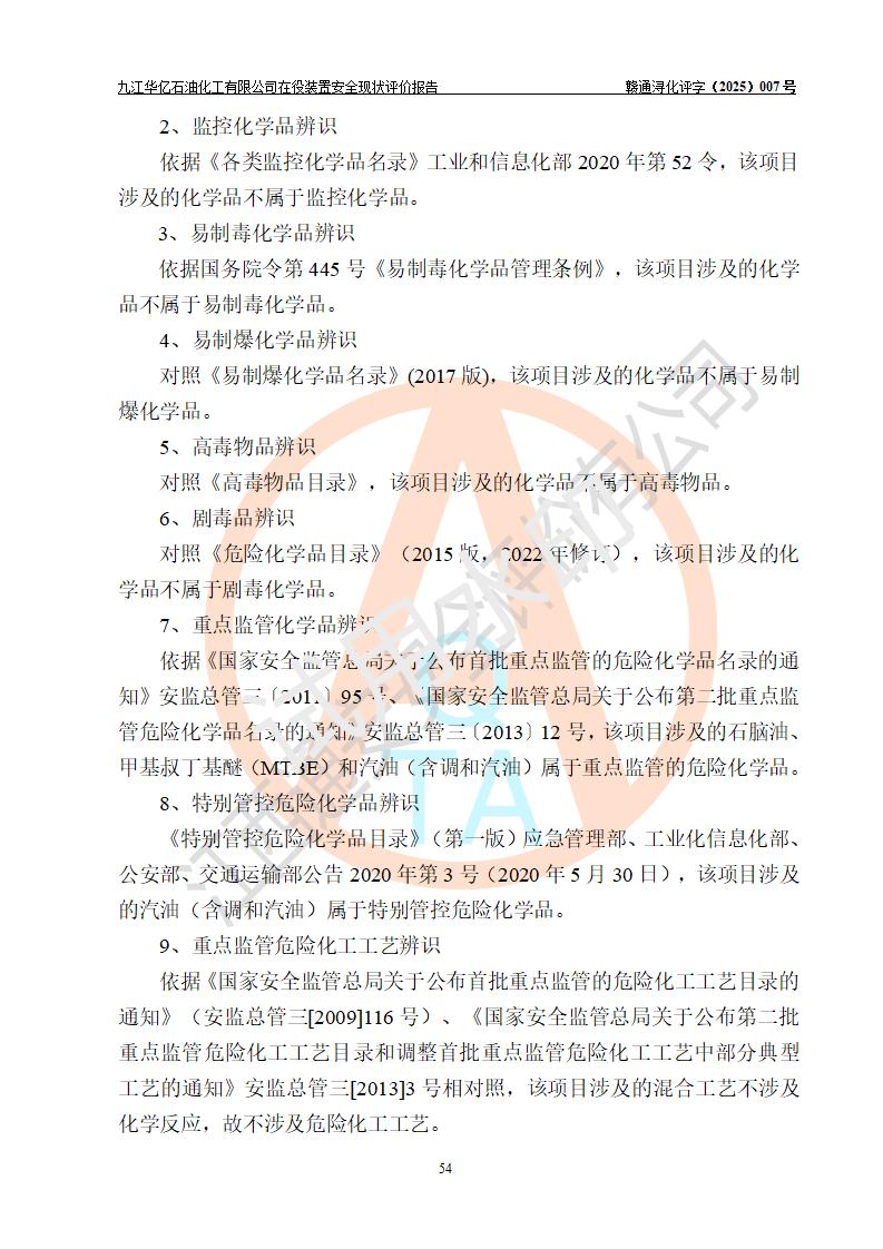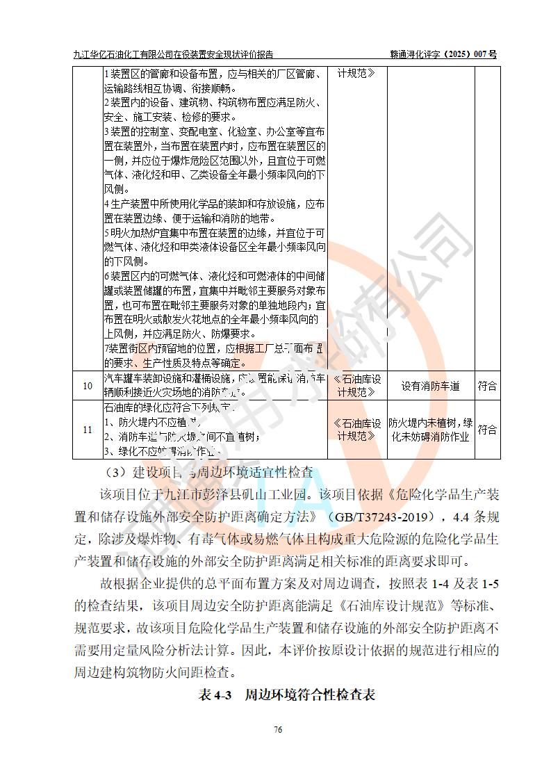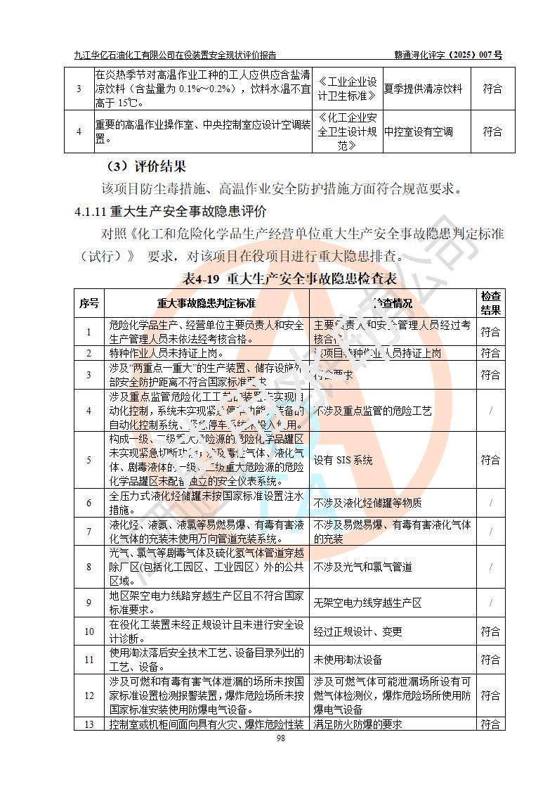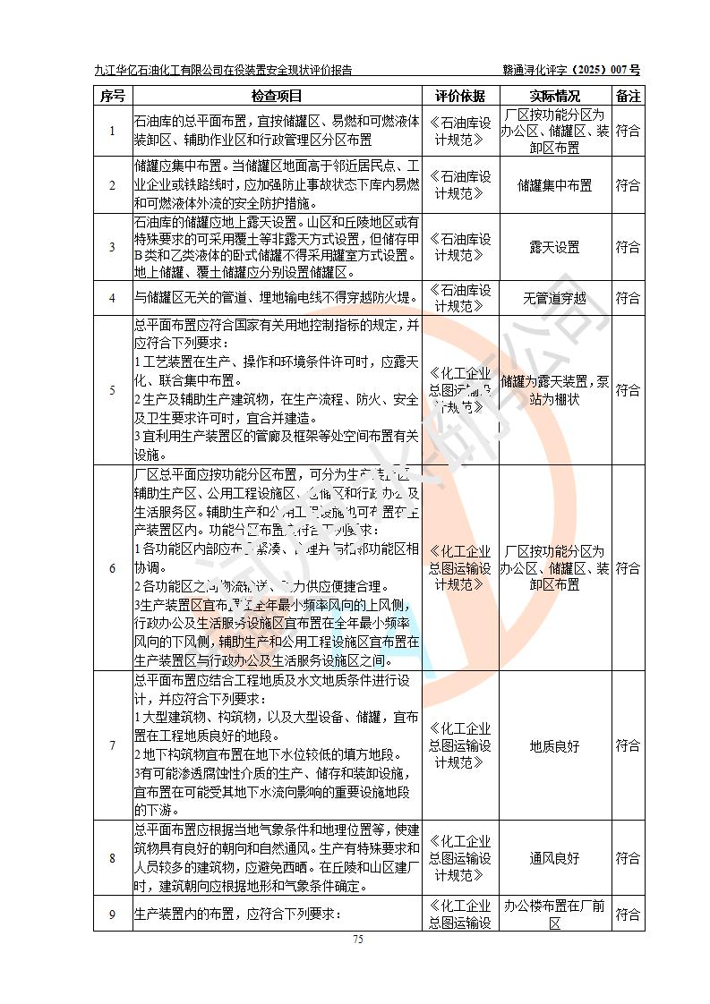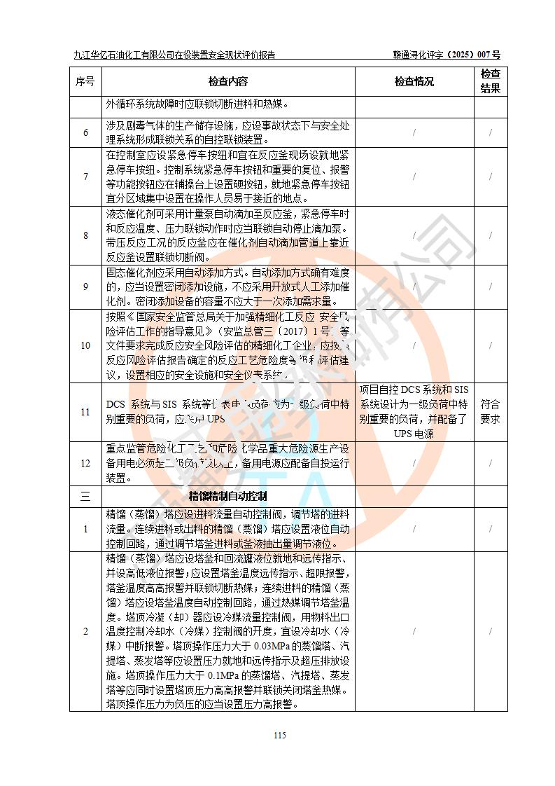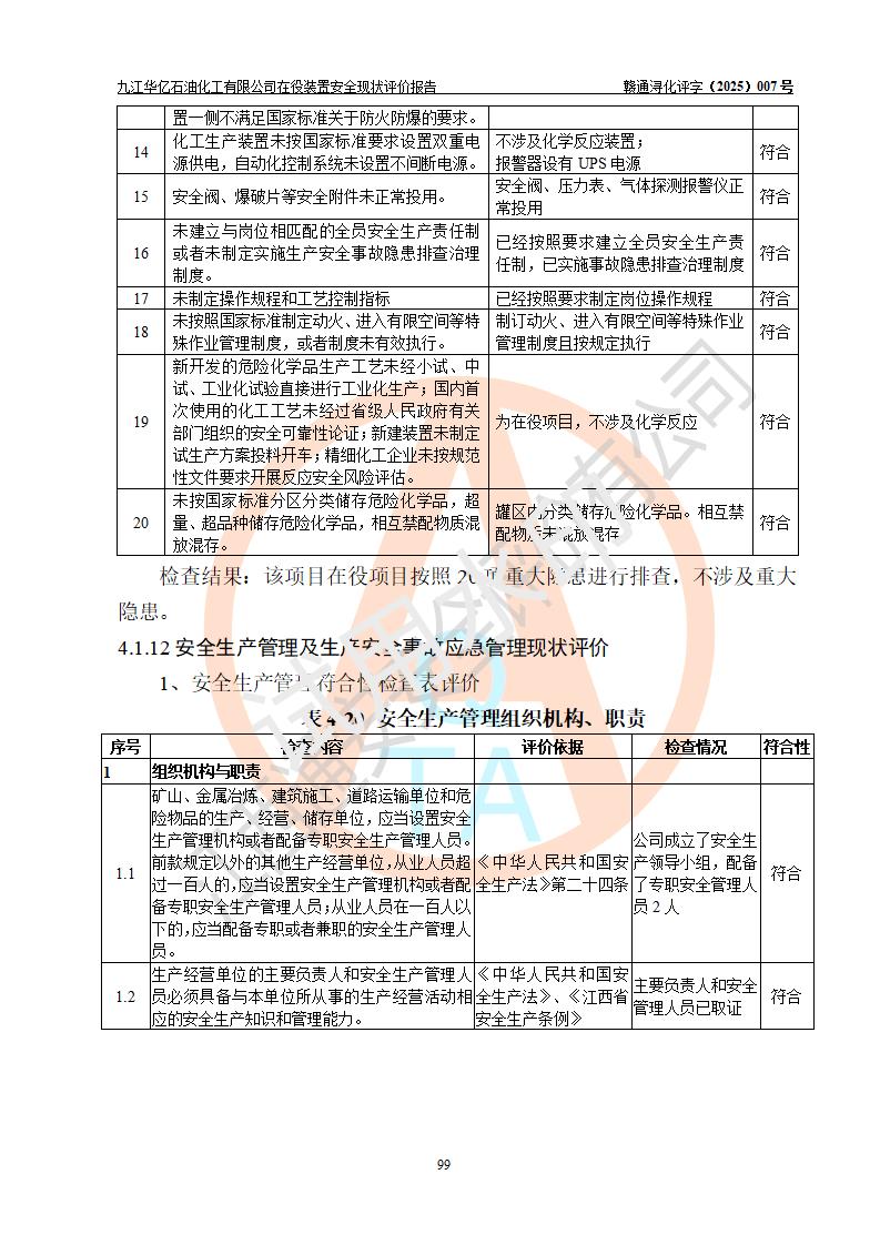 评价结论 | 经评价组评价,九江华亿石油化工有限公司现场总体布局、设备布置、DCS/SIS系统情况与安全设计图纸一致;企业在役装置涉及重点监管危险化学品、重大危险源,相关自控系统配置与安全设计相符并正常投用;企业主要负责人董事长、总经理、生产、技术、设备负责人及安全管理人员均已具有化工类大专以上相关专业学历,已取得危险化学品生产企业主要负责人及安全管理人员考核合格证。 九江华亿石油化工有限公司在役生产装置配套安全装置、防护设施以及采取的安全技术措施及安全管理措施符合**有关法规、标准、规范要求,符合《危险化学品生产企业安全生产许可证实施办法》规定的安全生产条件,项目风险可控,满足安全生产条件。