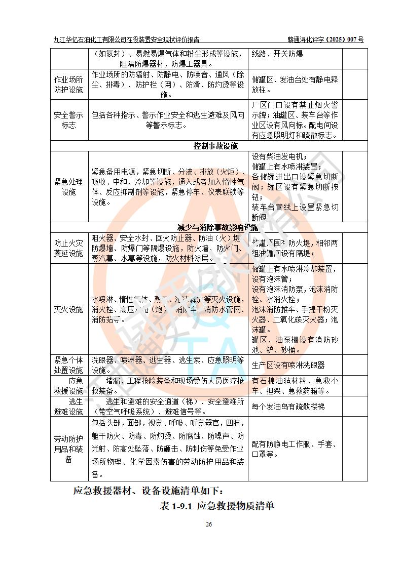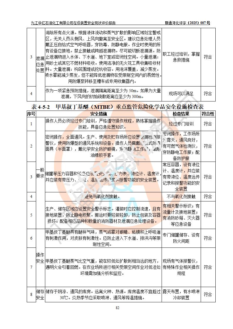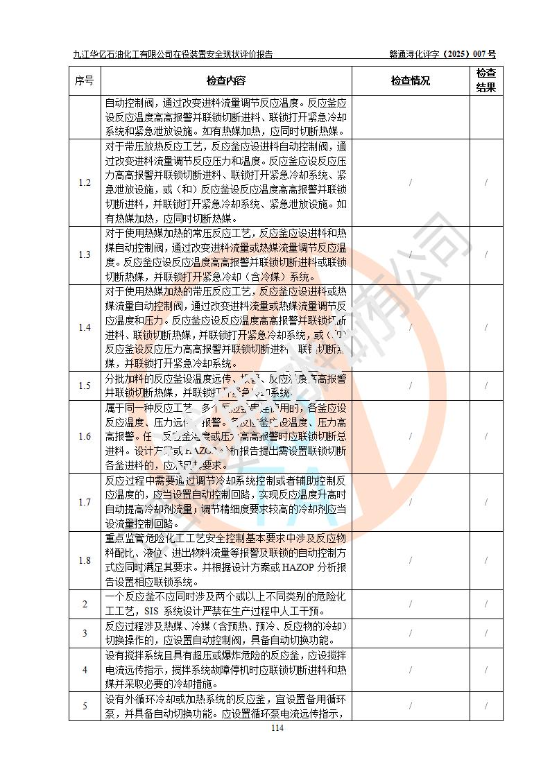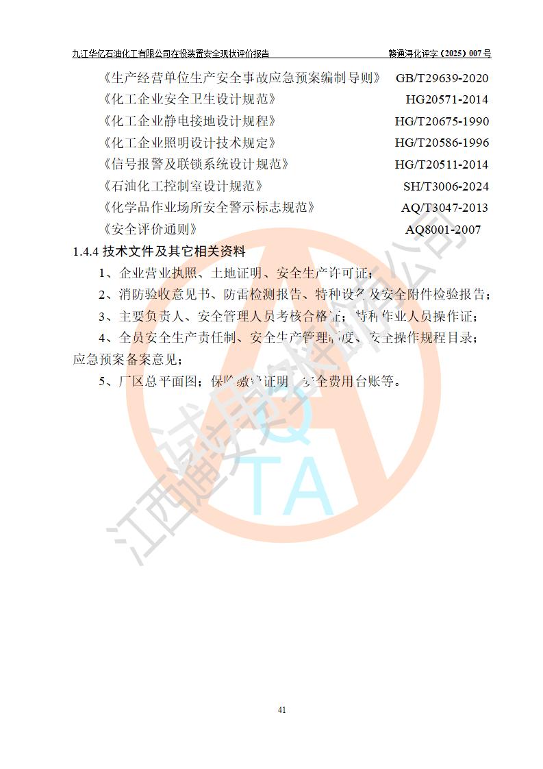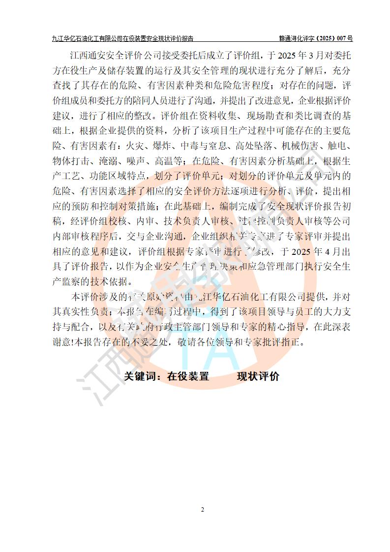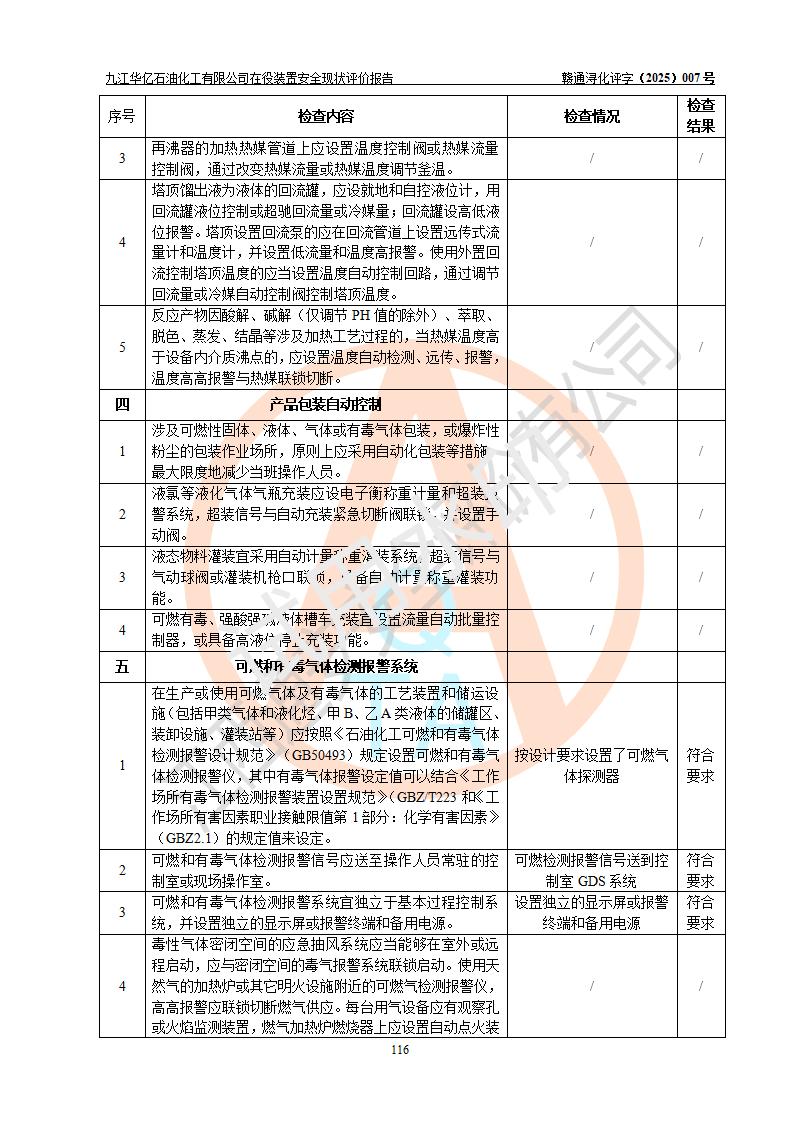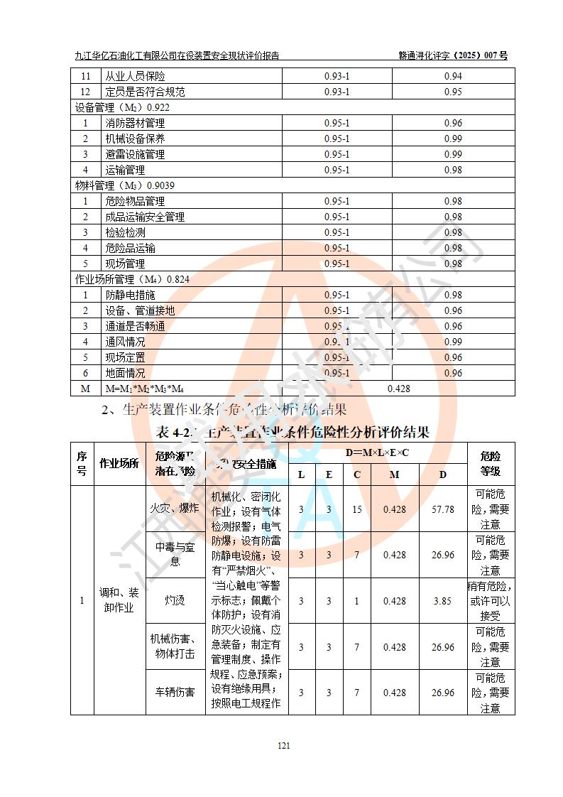 评价结论 | 经评价组评价,九江华亿石油化工有限公司现场总体布局、设备布置、DCS/SIS系统情况与安全设计图纸一致;企业在役装置涉及重点监管危险化学品、重大危险源,相关自控系统配置与安全设计相符并正常投用;企业主要负责人董事长、总经理、生产、技术、设备负责人及安全管理人员均已具有化工类大专以上相关专业学历,已取得危险化学品生产企业主要负责人及安全管理人员考核合格证。 九江华亿石油化工有限公司在役生产装置配套安全装置、防护设施以及采取的安全技术措施及安全管理措施符合**有关法规、标准、规范要求,符合《危险化学品生产企业安全生产许可证实施办法》规定的安全生产条件,项目风险可控,满足安全生产条件。