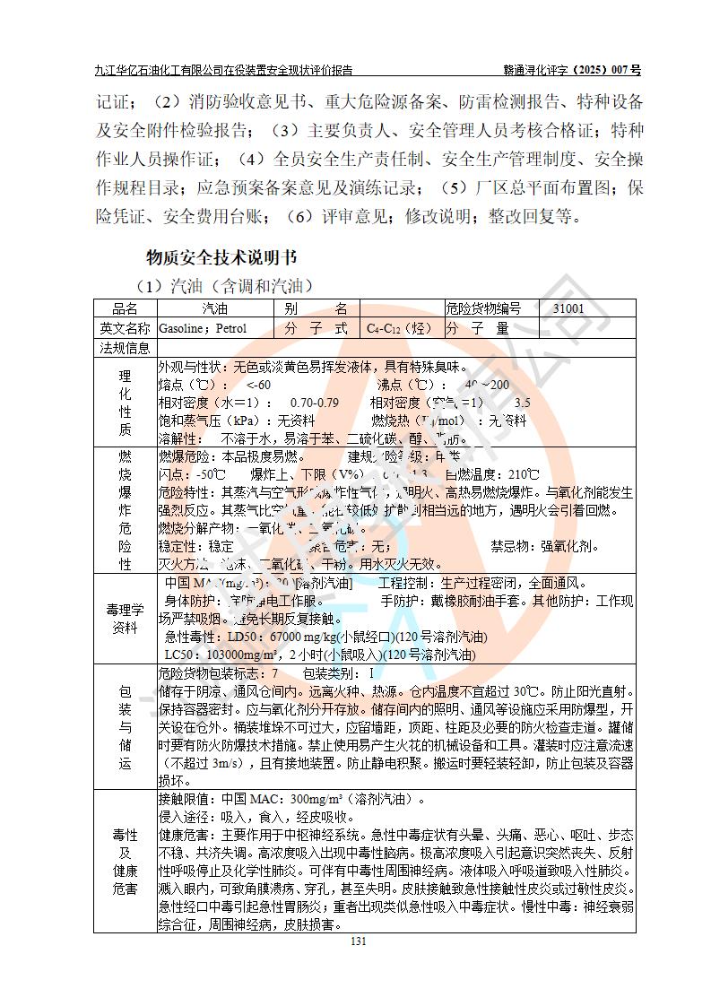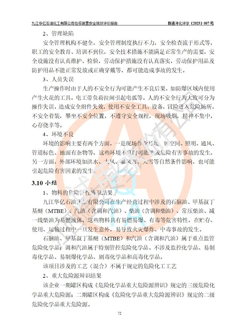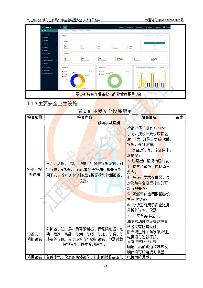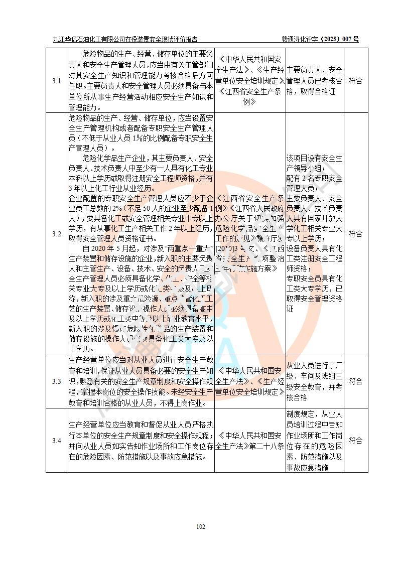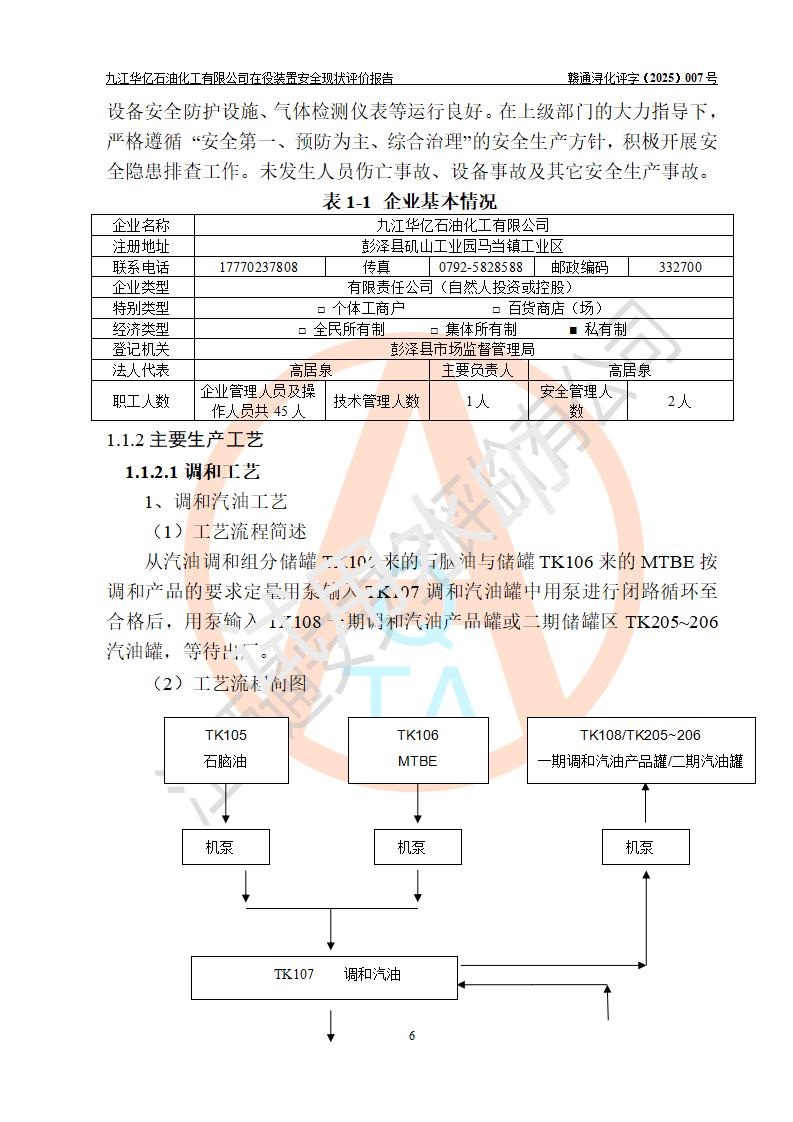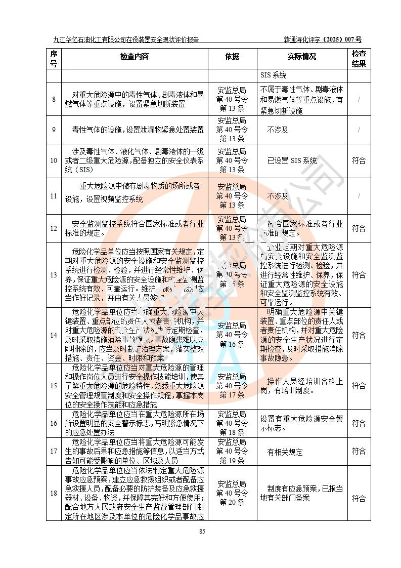 评价结论 | 经评价组评价,九江华亿石油化工有限公司现场总体布局、设备布置、DCS/SIS系统情况与安全设计图纸一致;企业在役装置涉及重点监管危险化学品、重大危险源,相关自控系统配置与安全设计相符并正常投用;企业主要负责人董事长、总经理、生产、技术、设备负责人及安全管理人员均已具有化工类大专以上相关专业学历,已取得危险化学品生产企业主要负责人及安全管理人员考核合格证。 九江华亿石油化工有限公司在役生产装置配套安全装置、防护设施以及采取的安全技术措施及安全管理措施符合**有关法规、标准、规范要求,符合《危险化学品生产企业安全生产许可证实施办法》规定的安全生产条件,项目风险可控,满足安全生产条件。