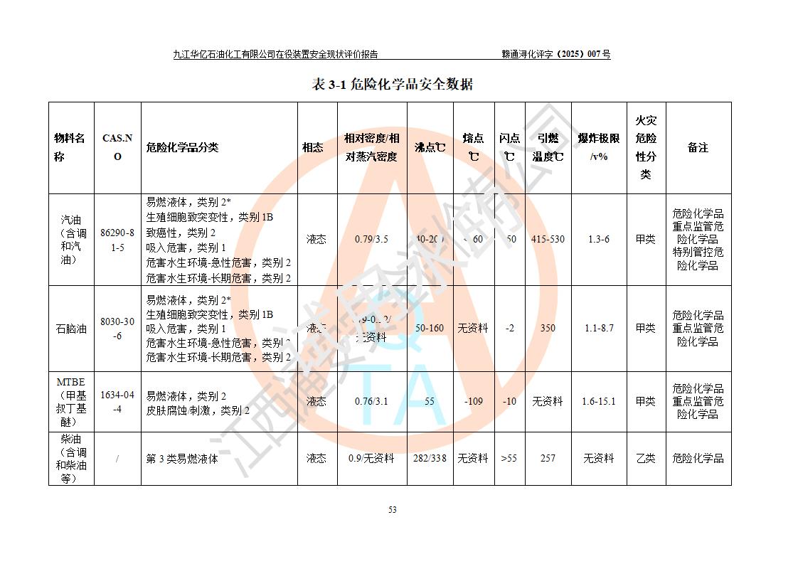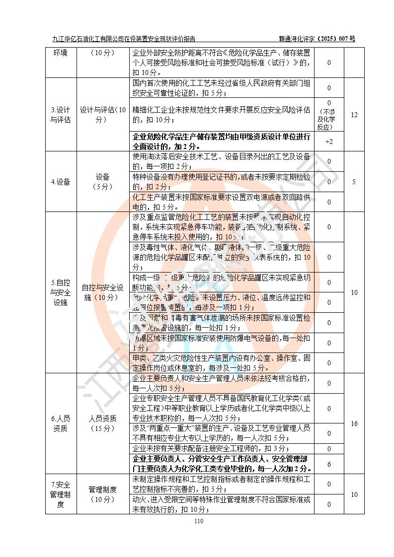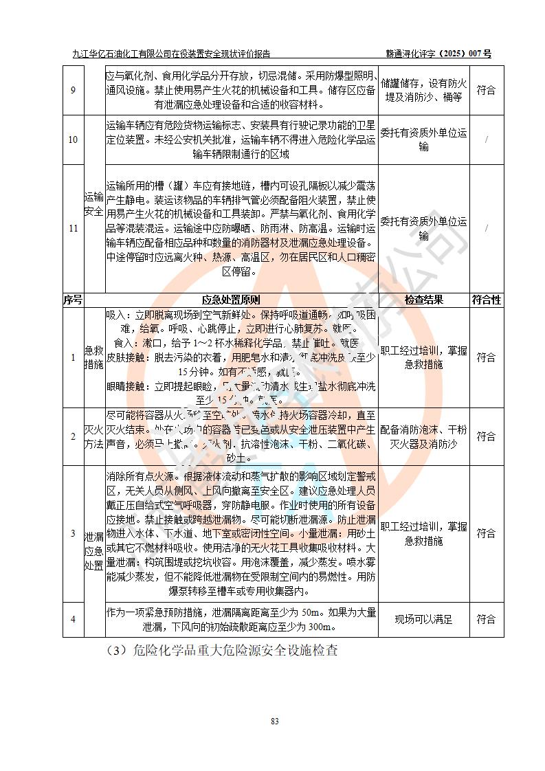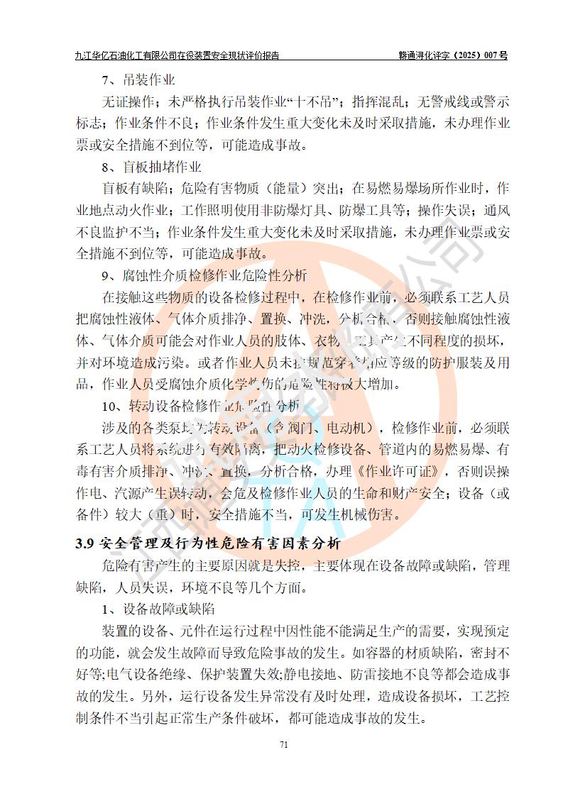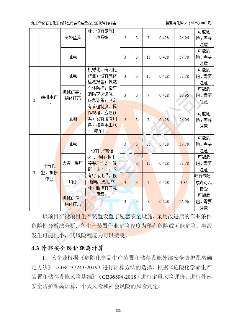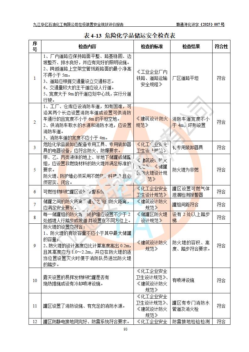 评价结论 | 经评价组评价,九江华亿石油化工有限公司现场总体布局、设备布置、DCS/SIS系统情况与安全设计图纸一致;企业在役装置涉及重点监管危险化学品、重大危险源,相关自控系统配置与安全设计相符并正常投用;企业主要负责人董事长、总经理、生产、技术、设备负责人及安全管理人员均已具有化工类大专以上相关专业学历,已取得危险化学品生产企业主要负责人及安全管理人员考核合格证。 九江华亿石油化工有限公司在役生产装置配套安全装置、防护设施以及采取的安全技术措施及安全管理措施符合**有关法规、标准、规范要求,符合《危险化学品生产企业安全生产许可证实施办法》规定的安全生产条件,项目风险可控,满足安全生产条件。