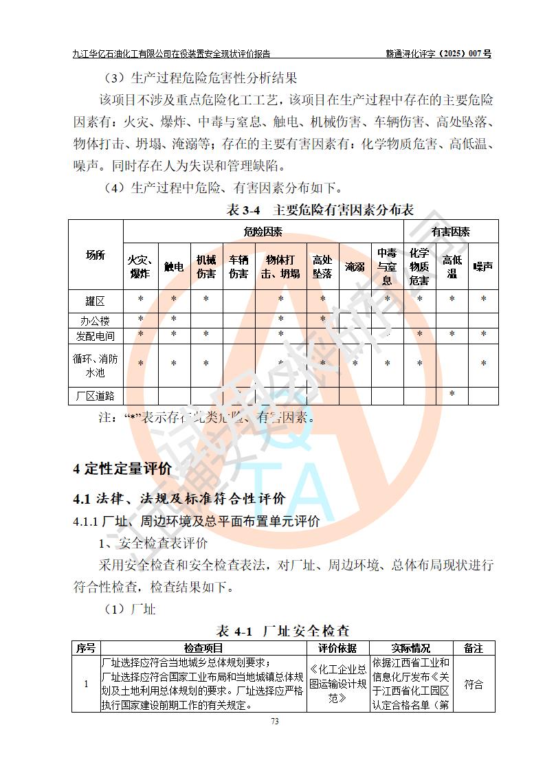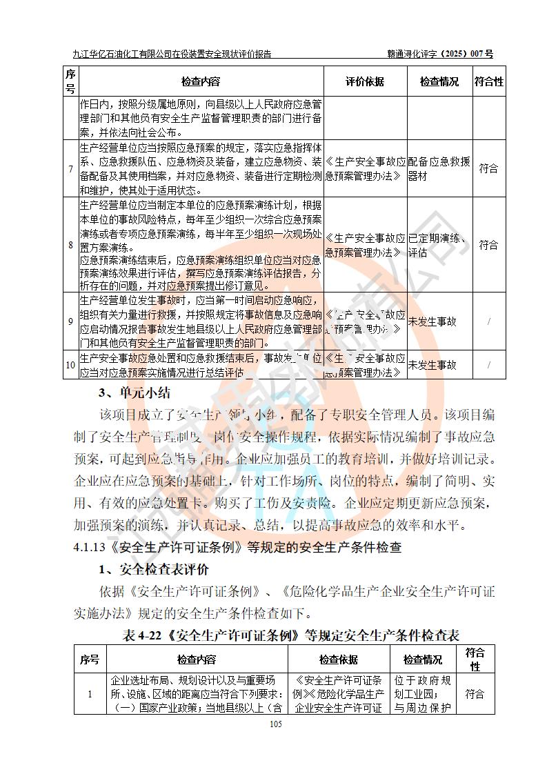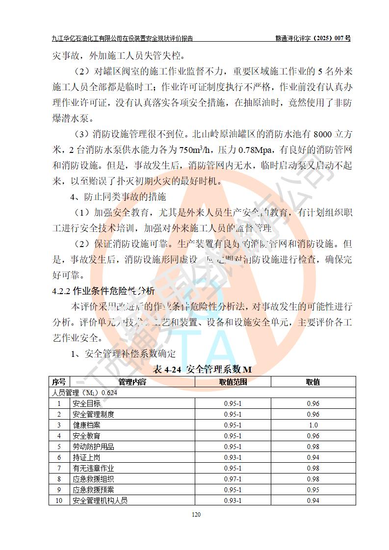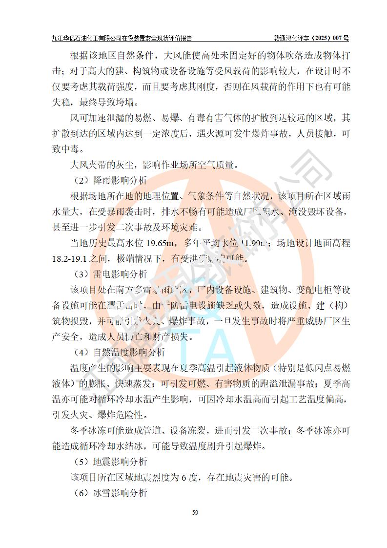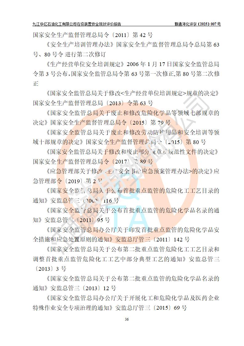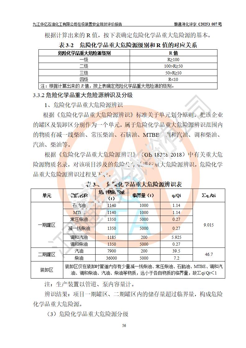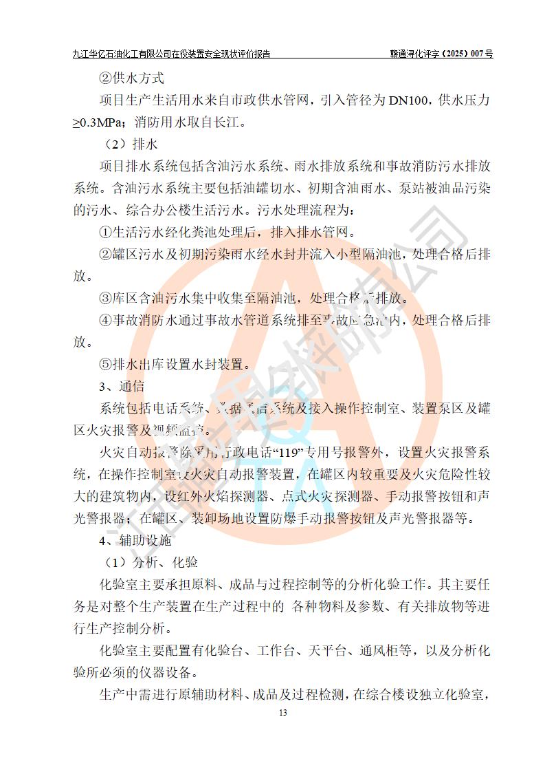 评价结论 | 经评价组评价,九江华亿石油化工有限公司现场总体布局、设备布置、DCS/SIS系统情况与安全设计图纸一致;企业在役装置涉及重点监管危险化学品、重大危险源,相关自控系统配置与安全设计相符并正常投用;企业主要负责人董事长、总经理、生产、技术、设备负责人及安全管理人员均已具有化工类大专以上相关专业学历,已取得危险化学品生产企业主要负责人及安全管理人员考核合格证。 九江华亿石油化工有限公司在役生产装置配套安全装置、防护设施以及采取的安全技术措施及安全管理措施符合**有关法规、标准、规范要求,符合《危险化学品生产企业安全生产许可证实施办法》规定的安全生产条件,项目风险可控,满足安全生产条件。