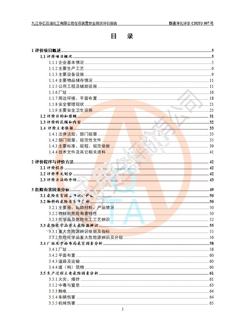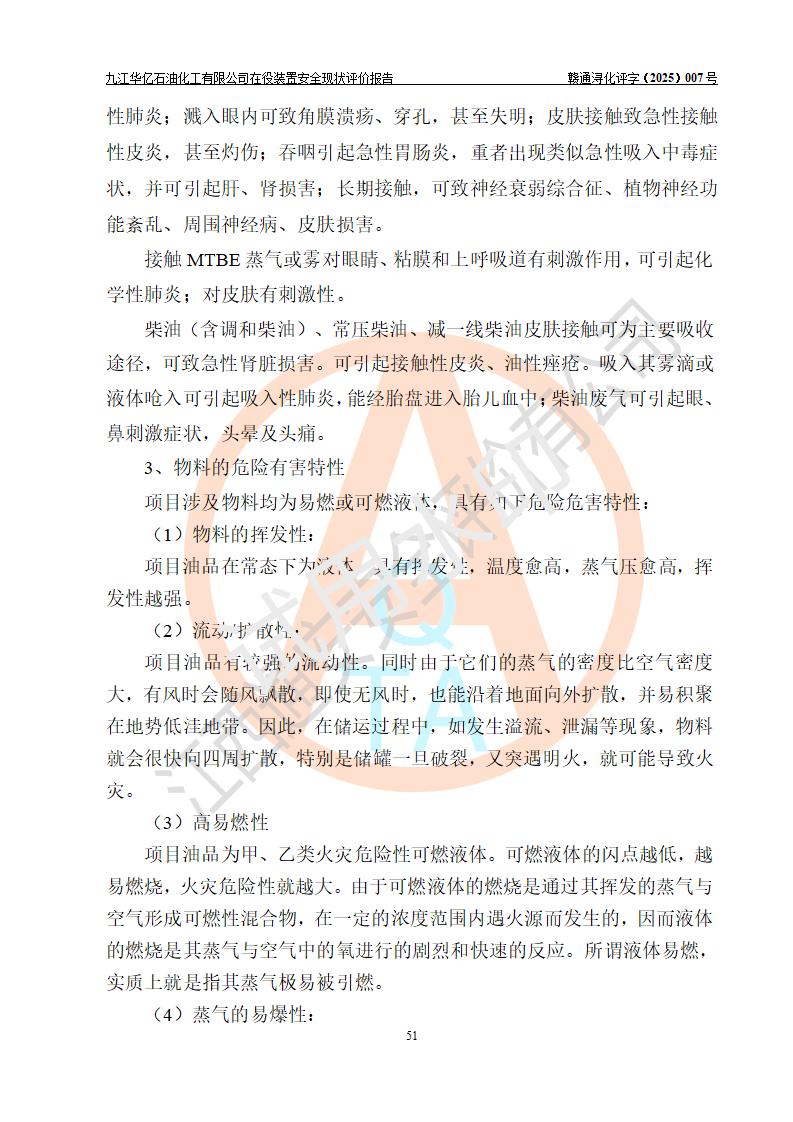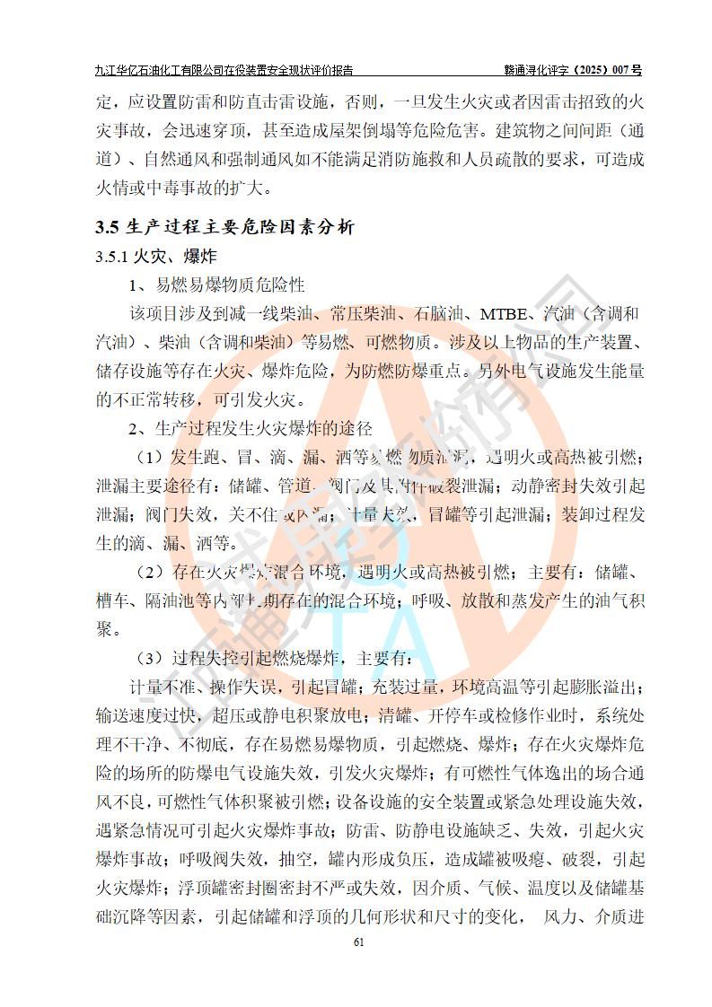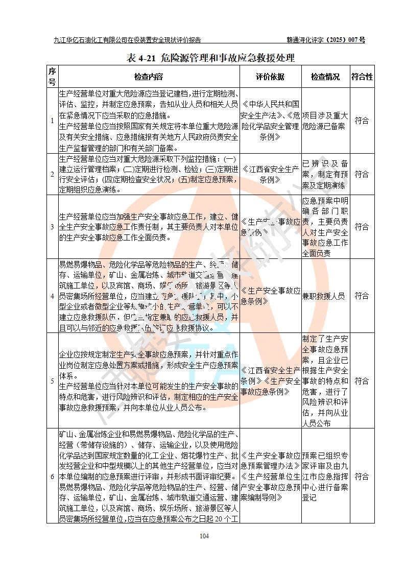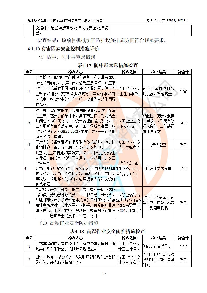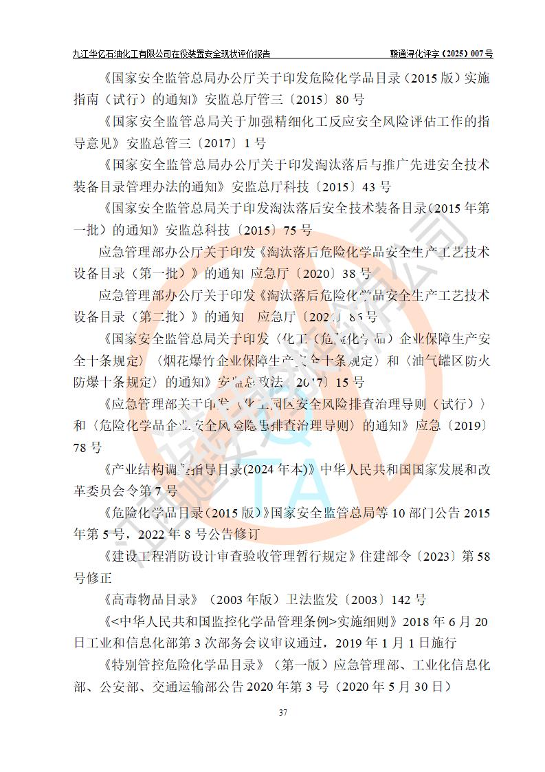 评价结论 | 经评价组评价,九江华亿石油化工有限公司现场总体布局、设备布置、DCS/SIS系统情况与安全设计图纸一致;企业在役装置涉及重点监管危险化学品、重大危险源,相关自控系统配置与安全设计相符并正常投用;企业主要负责人董事长、总经理、生产、技术、设备负责人及安全管理人员均已具有化工类大专以上相关专业学历,已取得危险化学品生产企业主要负责人及安全管理人员考核合格证。 九江华亿石油化工有限公司在役生产装置配套安全装置、防护设施以及采取的安全技术措施及安全管理措施符合**有关法规、标准、规范要求,符合《危险化学品生产企业安全生产许可证实施办法》规定的安全生产条件,项目风险可控,满足安全生产条件。