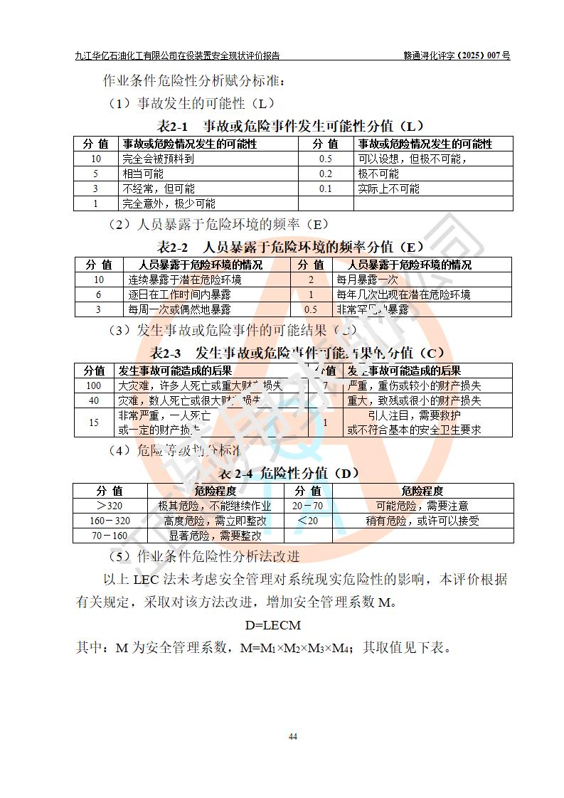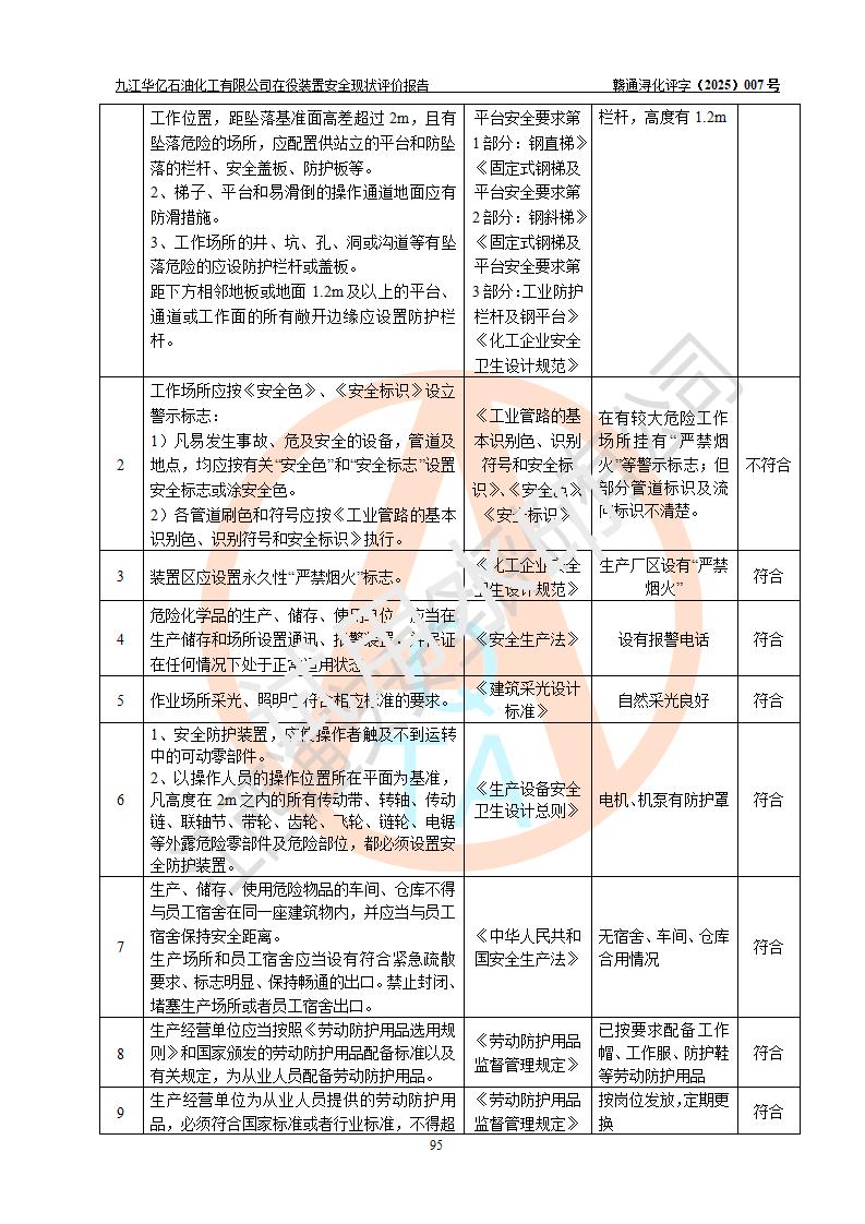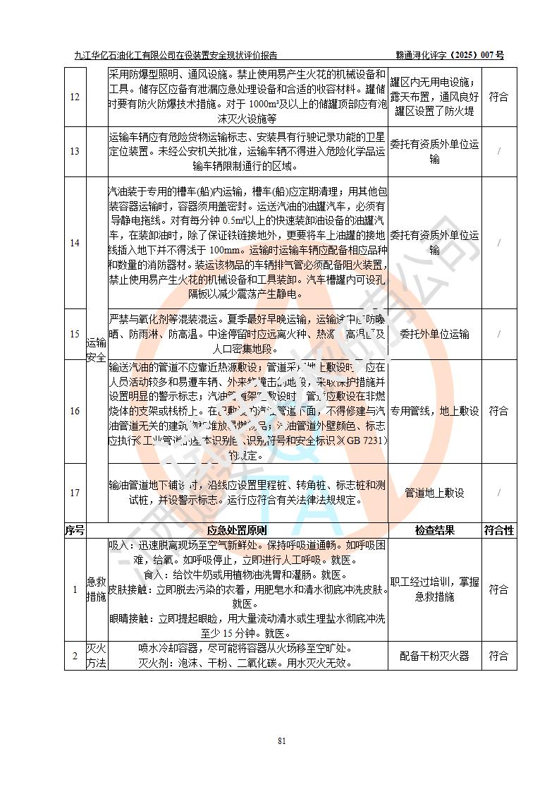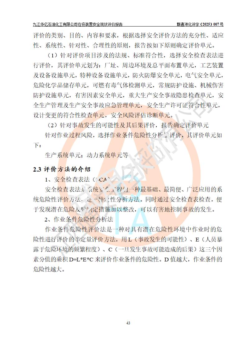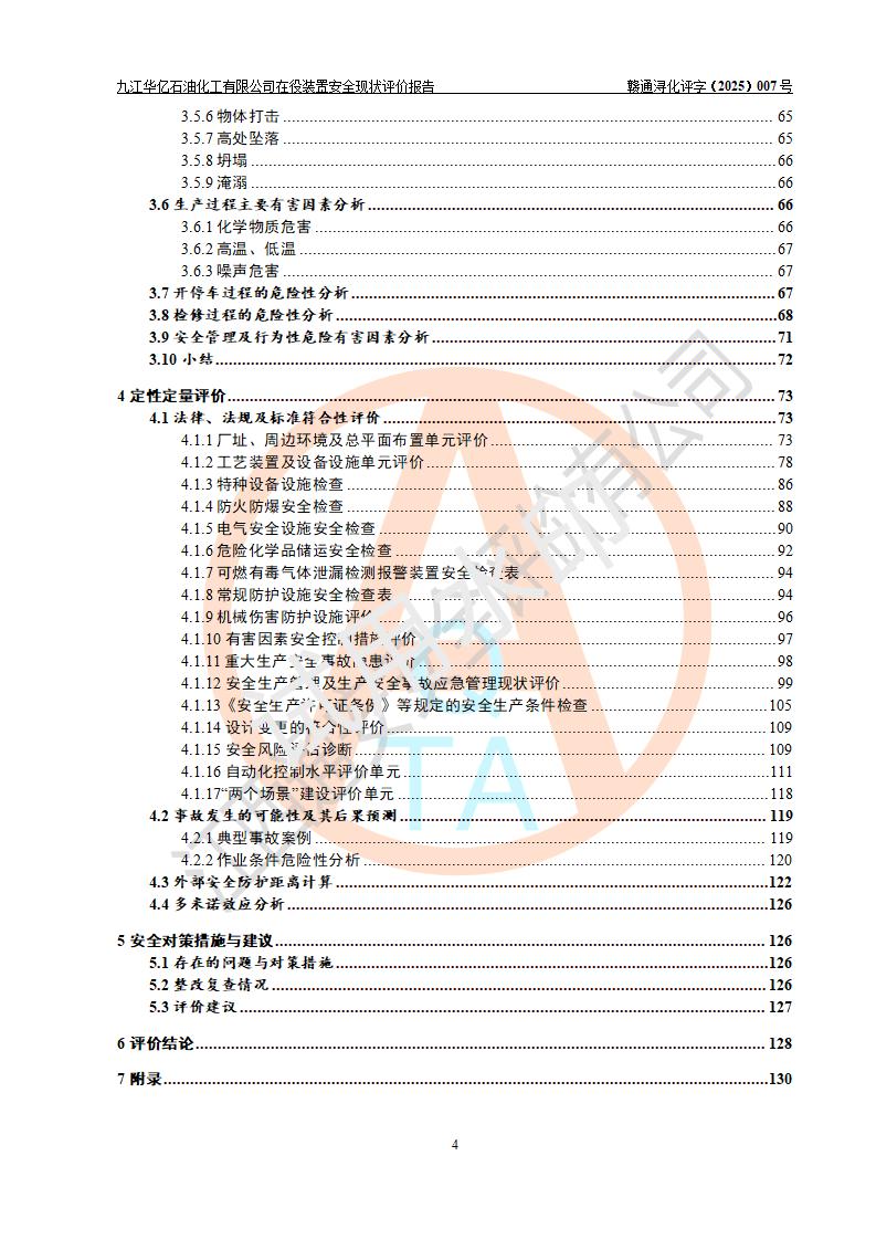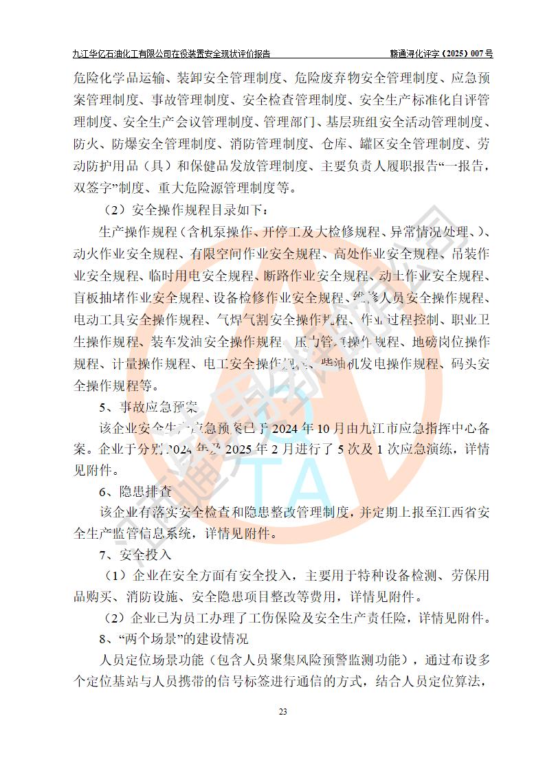 评价结论 | 经评价组评价,九江华亿石油化工有限公司现场总体布局、设备布置、DCS/SIS系统情况与安全设计图纸一致;企业在役装置涉及重点监管危险化学品、重大危险源,相关自控系统配置与安全设计相符并正常投用;企业主要负责人董事长、总经理、生产、技术、设备负责人及安全管理人员均已具有化工类大专以上相关专业学历,已取得危险化学品生产企业主要负责人及安全管理人员考核合格证。 九江华亿石油化工有限公司在役生产装置配套安全装置、防护设施以及采取的安全技术措施及安全管理措施符合**有关法规、标准、规范要求,符合《危险化学品生产企业安全生产许可证实施办法》规定的安全生产条件,项目风险可控,满足安全生产条件。