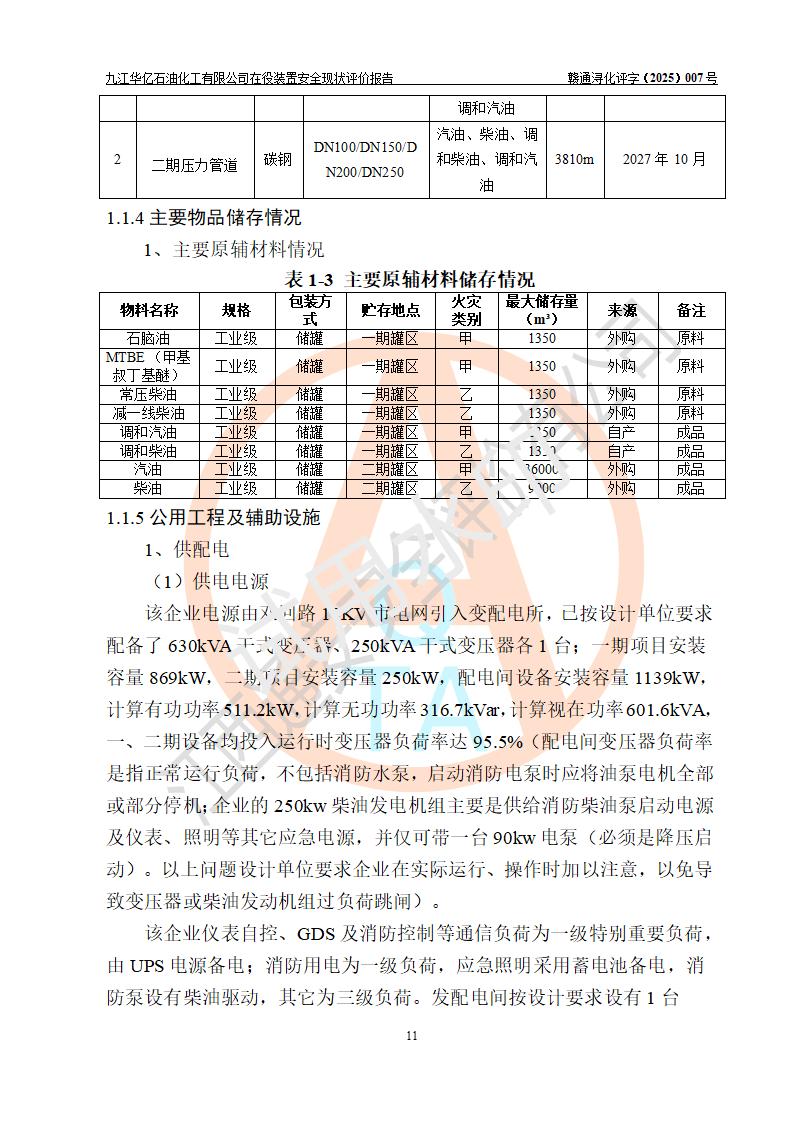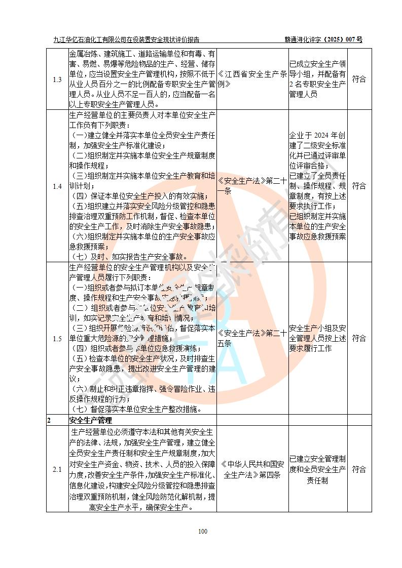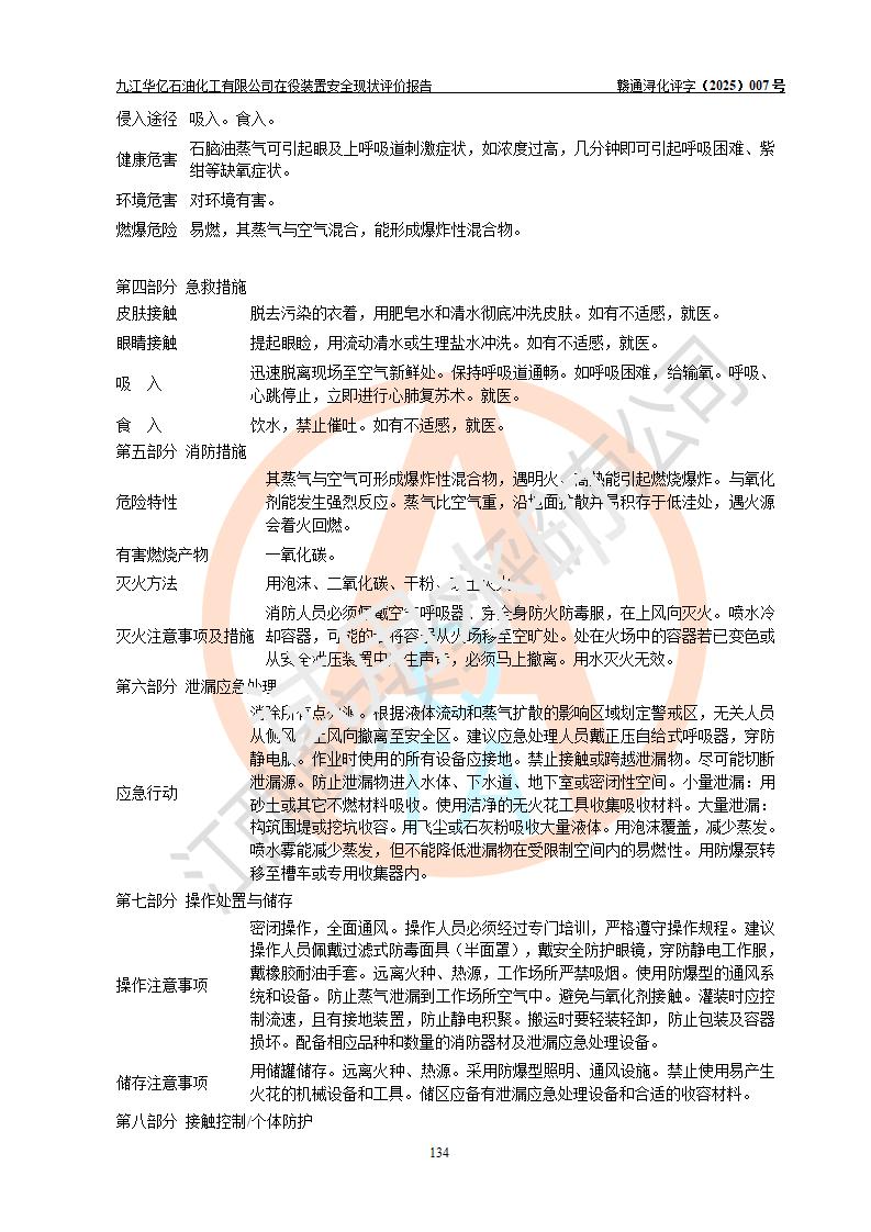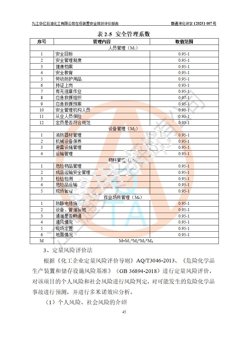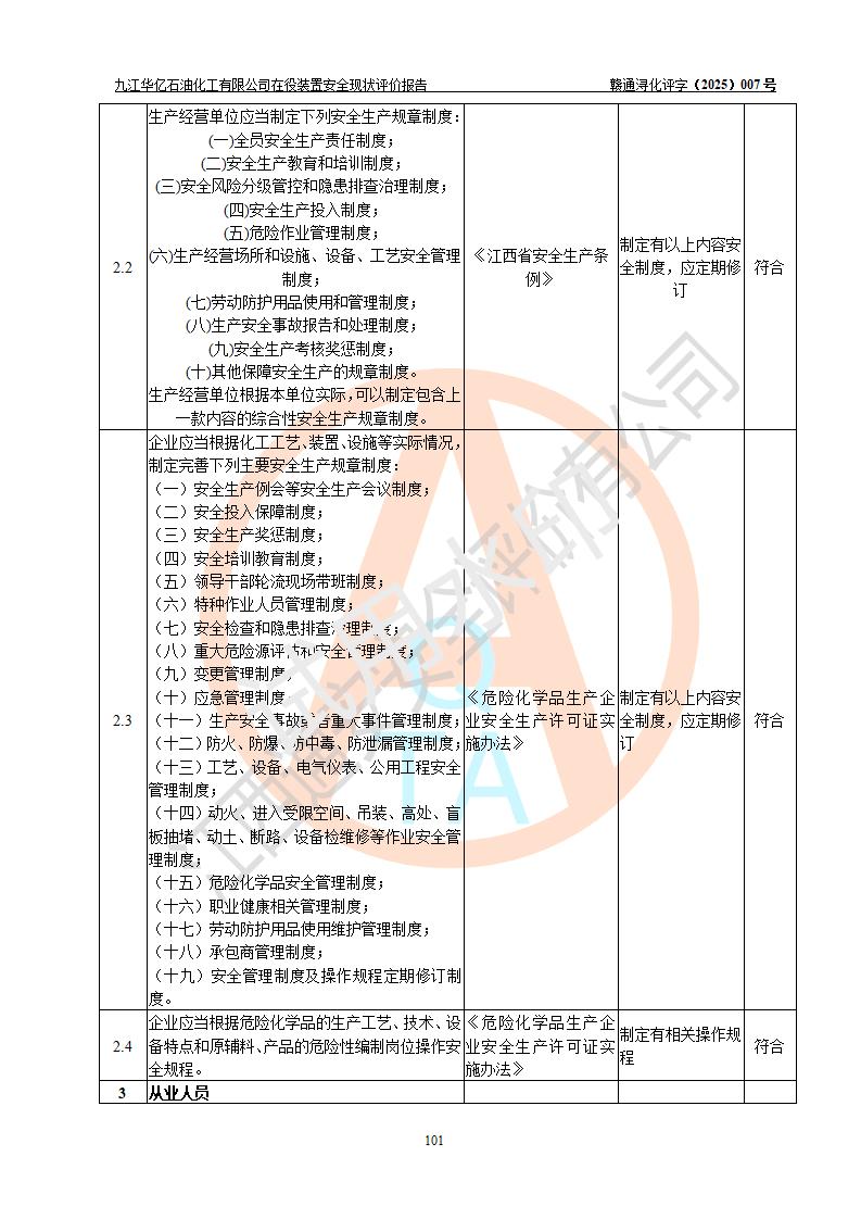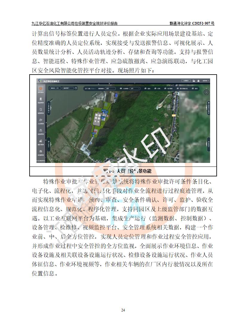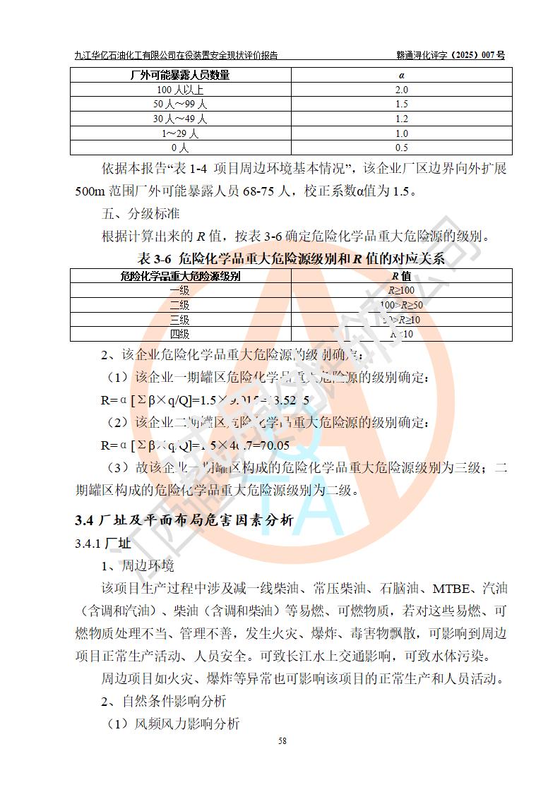 评价结论 | 经评价组评价,九江华亿石油化工有限公司现场总体布局、设备布置、DCS/SIS系统情况与安全设计图纸一致;企业在役装置涉及重点监管危险化学品、重大危险源,相关自控系统配置与安全设计相符并正常投用;企业主要负责人董事长、总经理、生产、技术、设备负责人及安全管理人员均已具有化工类大专以上相关专业学历,已取得危险化学品生产企业主要负责人及安全管理人员考核合格证。 九江华亿石油化工有限公司在役生产装置配套安全装置、防护设施以及采取的安全技术措施及安全管理措施符合**有关法规、标准、规范要求,符合《危险化学品生产企业安全生产许可证实施办法》规定的安全生产条件,项目风险可控,满足安全生产条件。