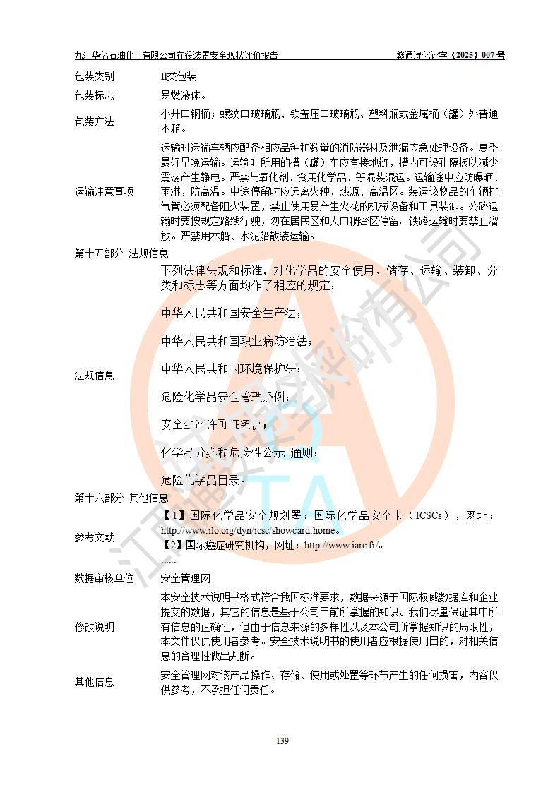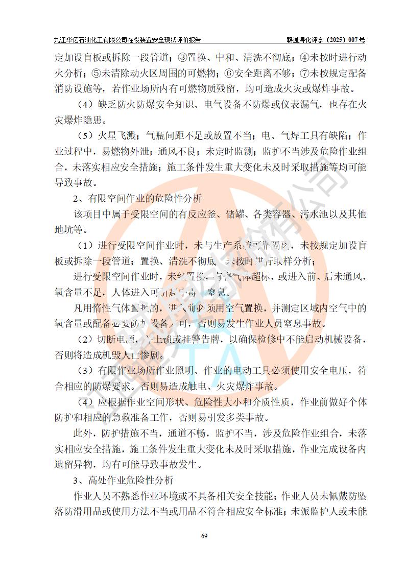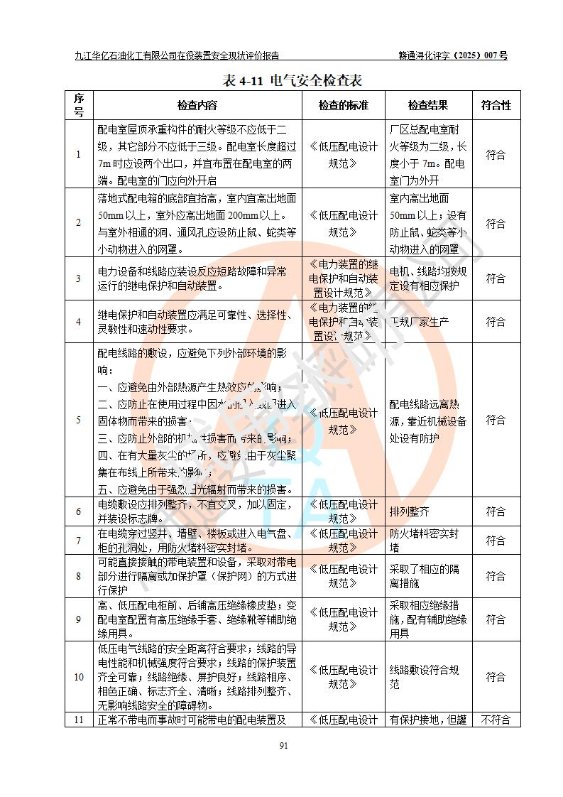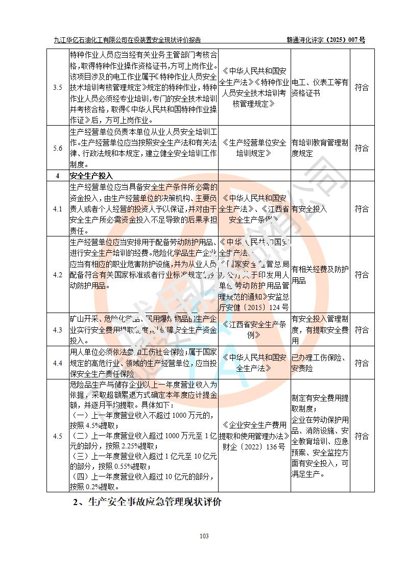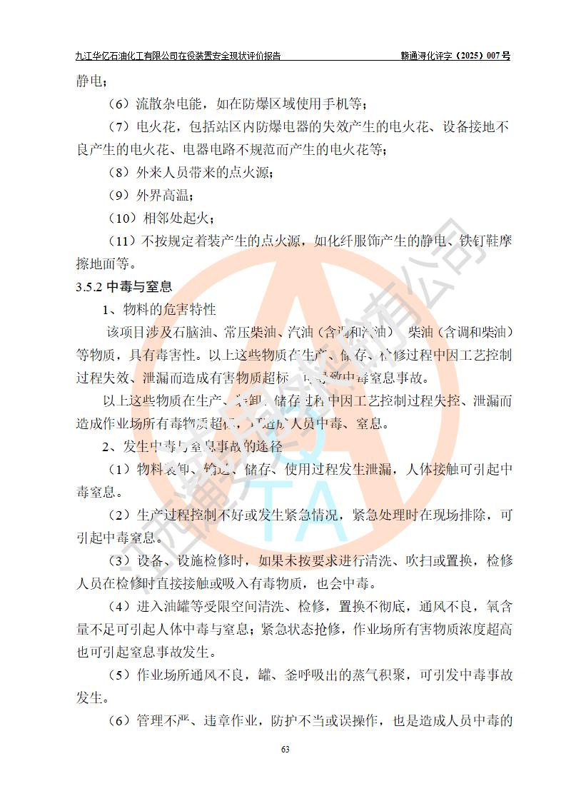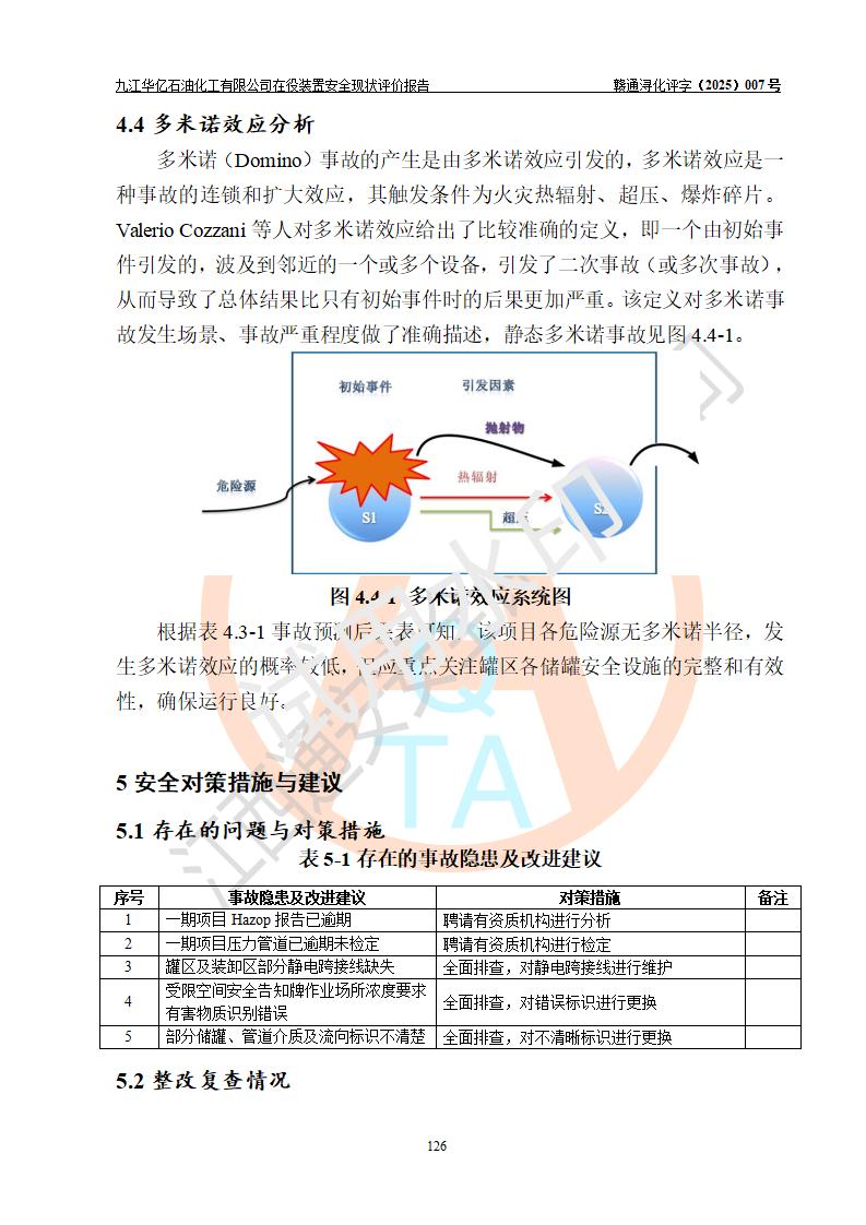 评价结论 | 经评价组评价,九江华亿石油化工有限公司现场总体布局、设备布置、DCS/SIS系统情况与安全设计图纸一致;企业在役装置涉及重点监管危险化学品、重大危险源,相关自控系统配置与安全设计相符并正常投用;企业主要负责人董事长、总经理、生产、技术、设备负责人及安全管理人员均已具有化工类大专以上相关专业学历,已取得危险化学品生产企业主要负责人及安全管理人员考核合格证。 九江华亿石油化工有限公司在役生产装置配套安全装置、防护设施以及采取的安全技术措施及安全管理措施符合**有关法规、标准、规范要求,符合《危险化学品生产企业安全生产许可证实施办法》规定的安全生产条件,项目风险可控,满足安全生产条件。