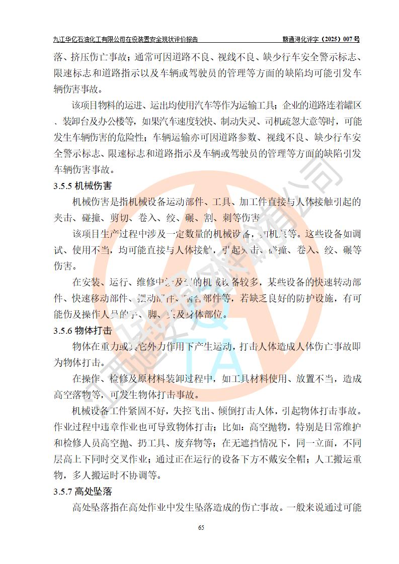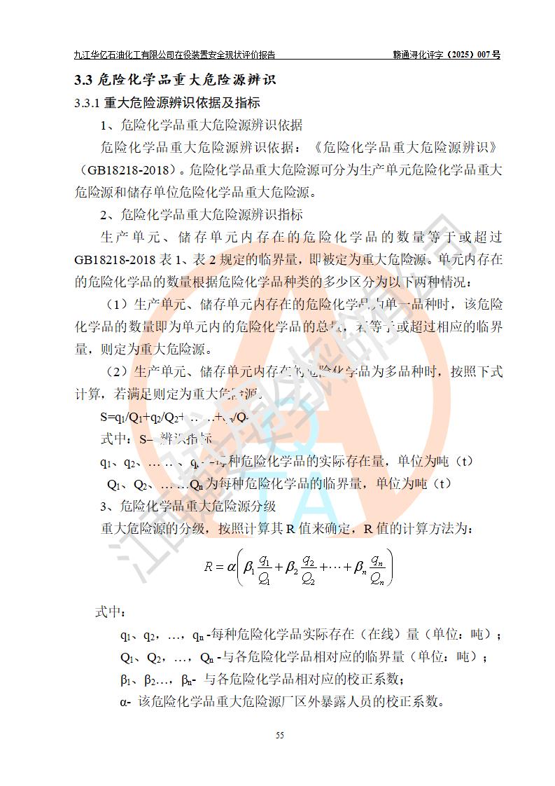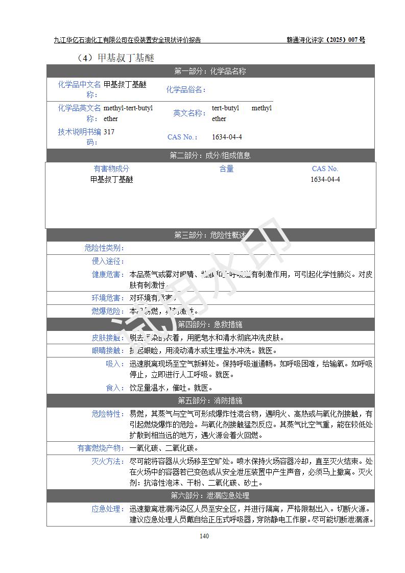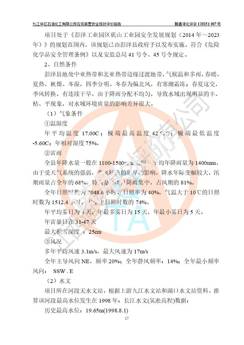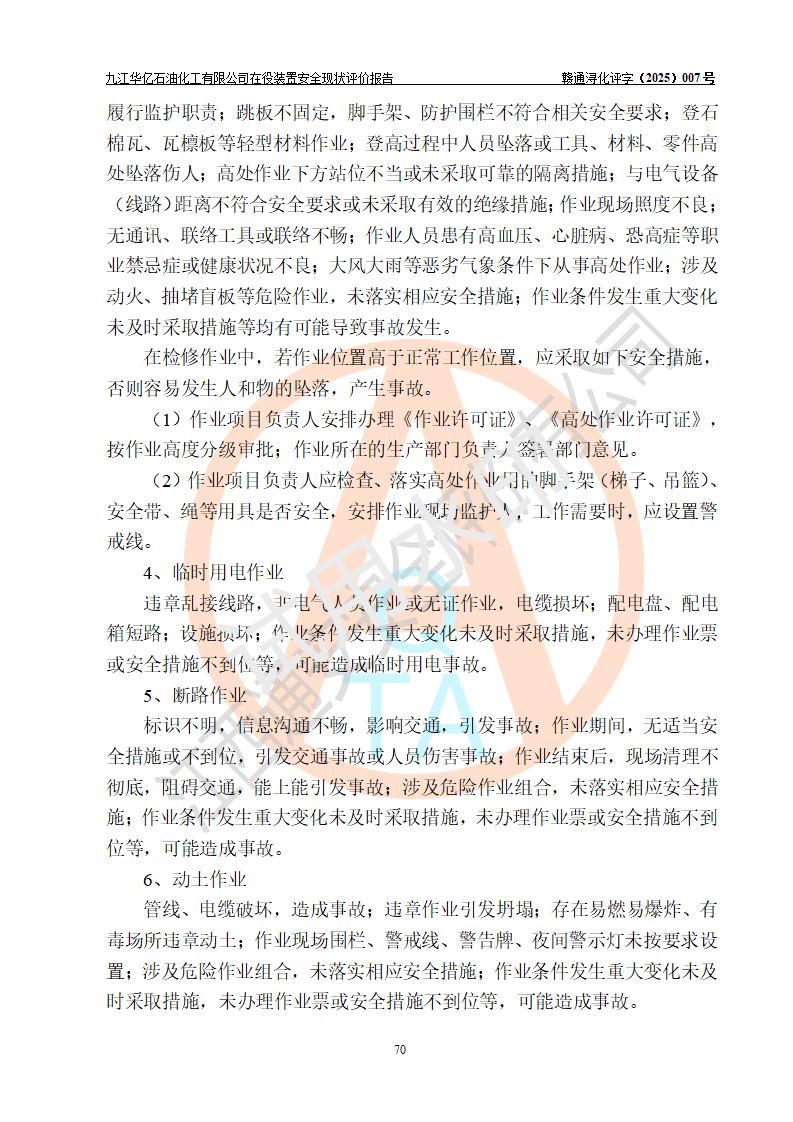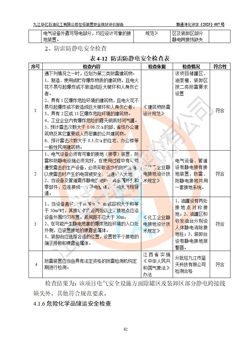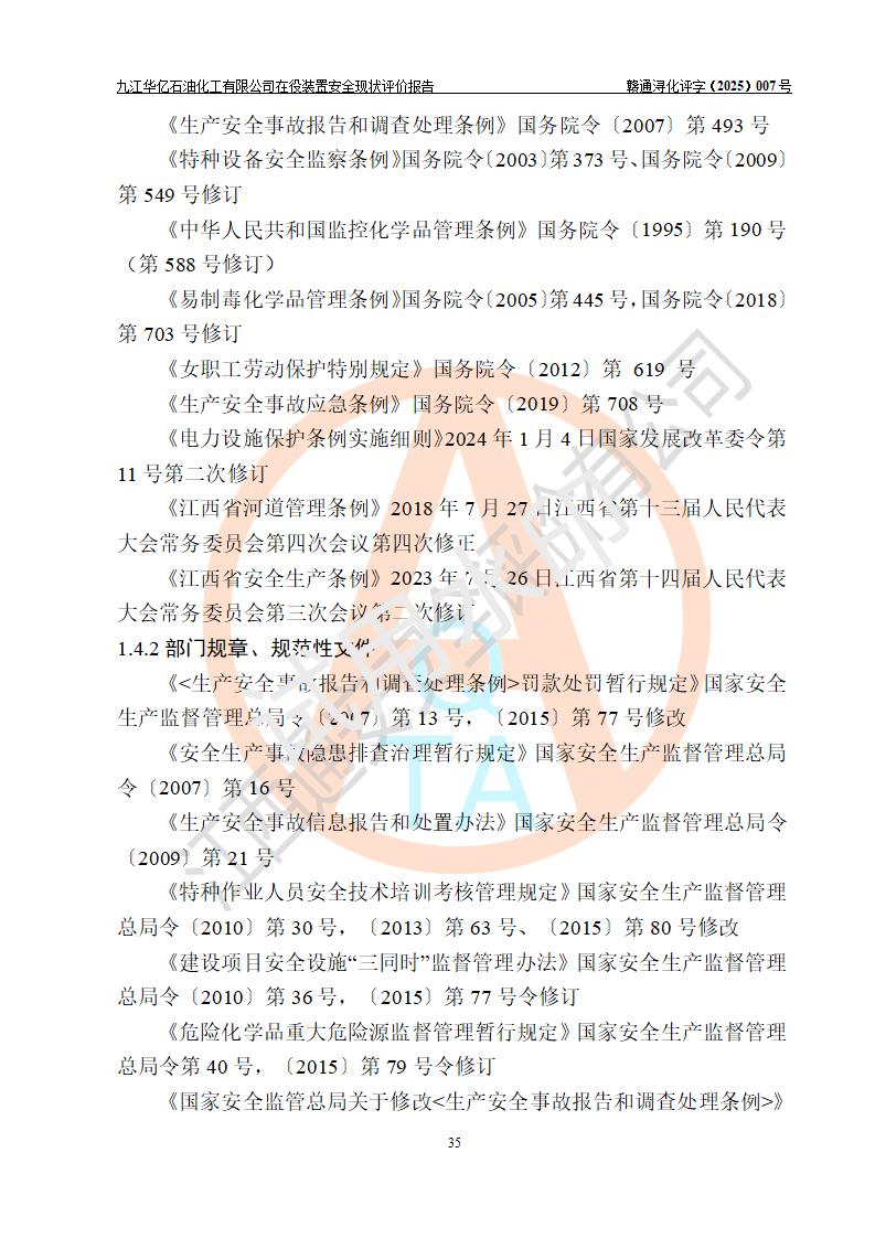 评价结论 | 经评价组评价,九江华亿石油化工有限公司现场总体布局、设备布置、DCS/SIS系统情况与安全设计图纸一致;企业在役装置涉及重点监管危险化学品、重大危险源,相关自控系统配置与安全设计相符并正常投用;企业主要负责人董事长、总经理、生产、技术、设备负责人及安全管理人员均已具有化工类大专以上相关专业学历,已取得危险化学品生产企业主要负责人及安全管理人员考核合格证。 九江华亿石油化工有限公司在役生产装置配套安全装置、防护设施以及采取的安全技术措施及安全管理措施符合**有关法规、标准、规范要求,符合《危险化学品生产企业安全生产许可证实施办法》规定的安全生产条件,项目风险可控,满足安全生产条件。