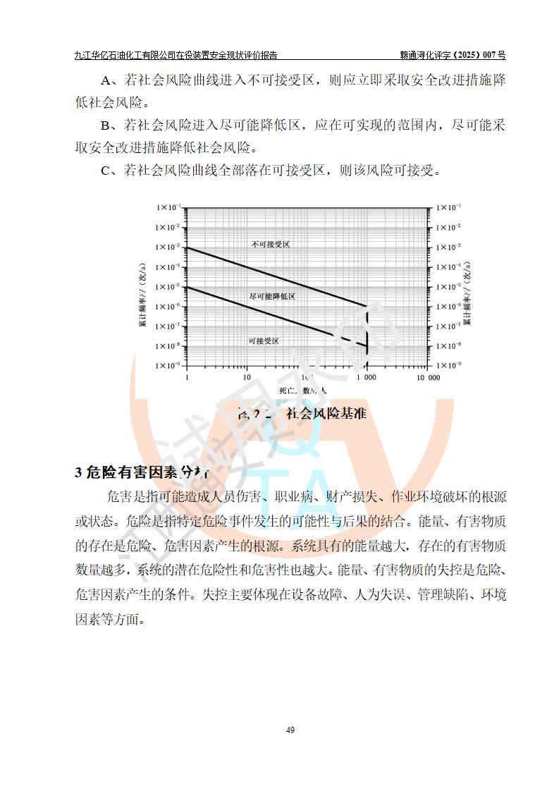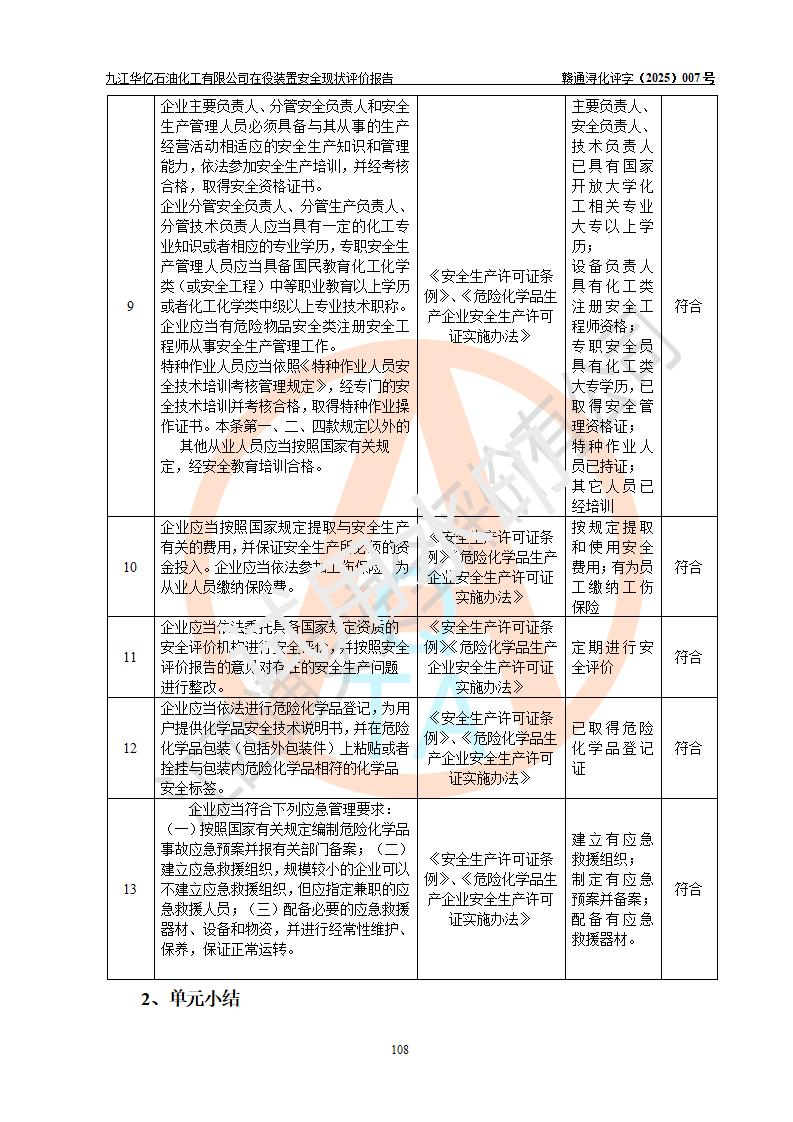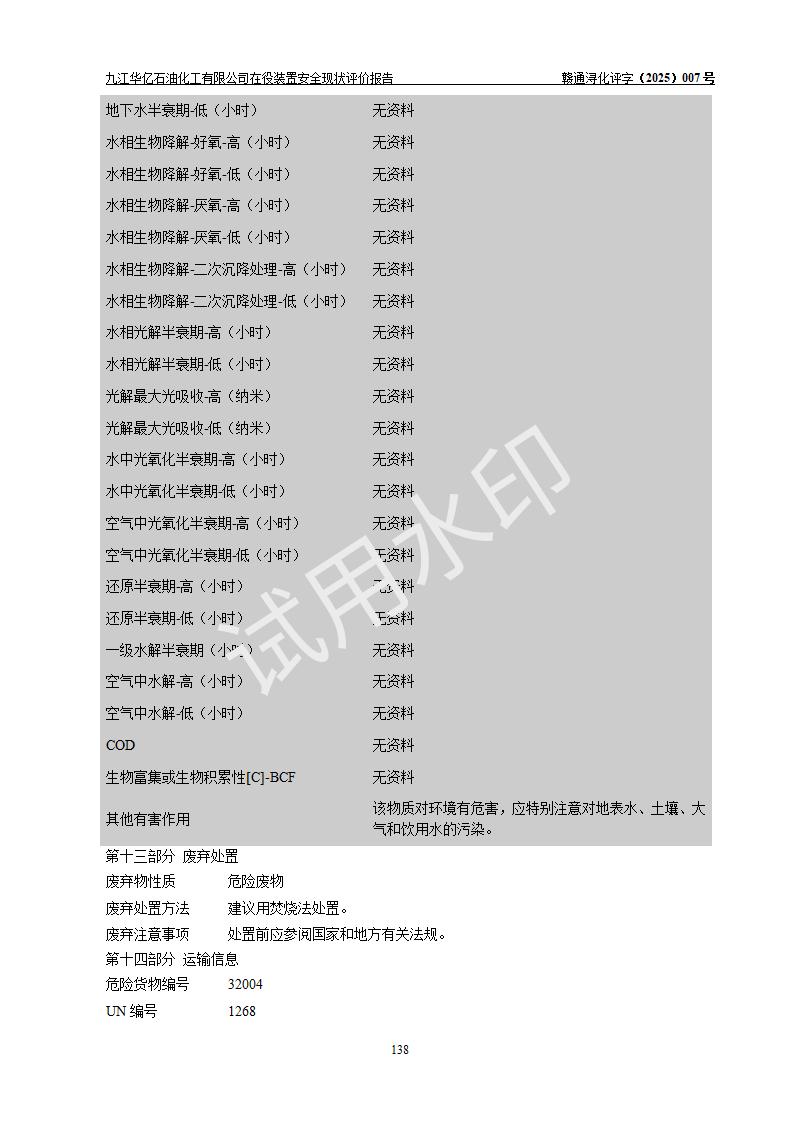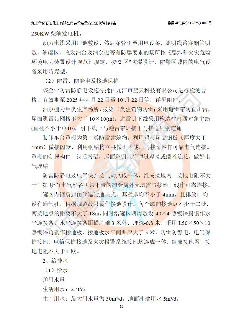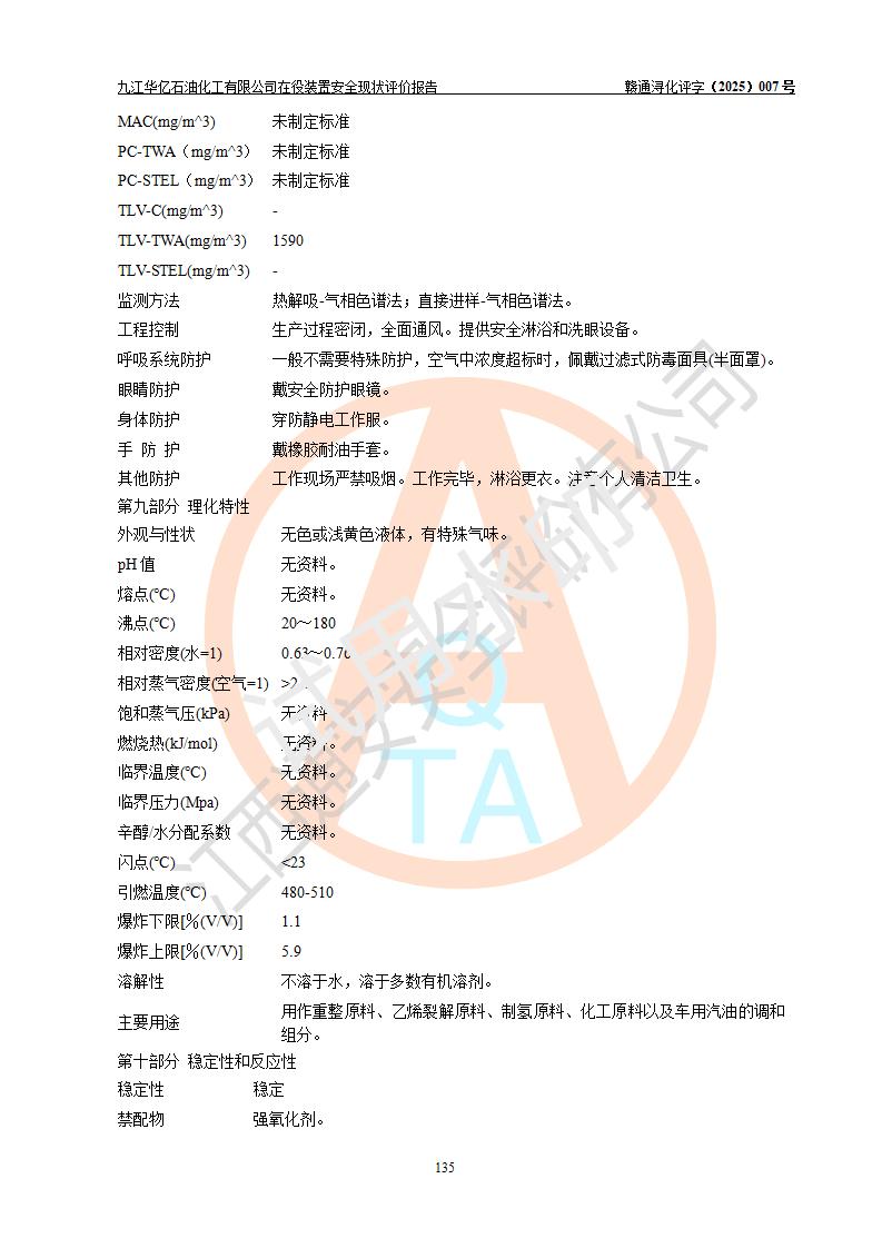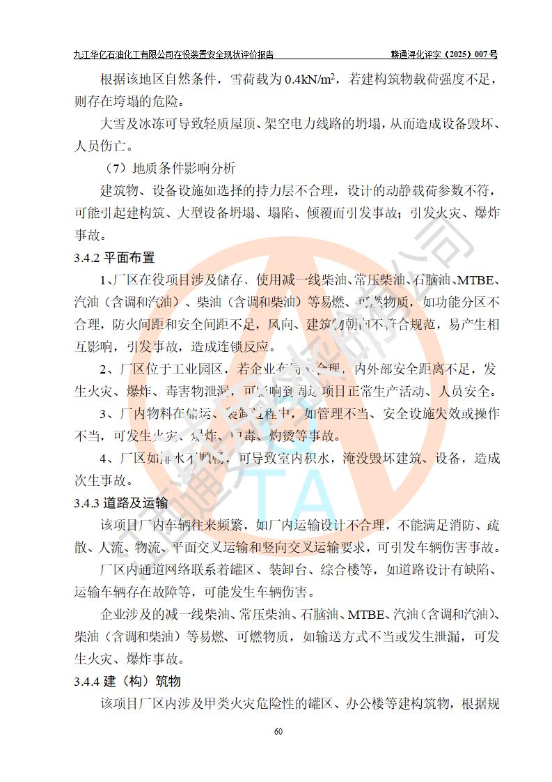 评价结论 | 经评价组评价,九江华亿石油化工有限公司现场总体布局、设备布置、DCS/SIS系统情况与安全设计图纸一致;企业在役装置涉及重点监管危险化学品、重大危险源,相关自控系统配置与安全设计相符并正常投用;企业主要负责人董事长、总经理、生产、技术、设备负责人及安全管理人员均已具有化工类大专以上相关专业学历,已取得危险化学品生产企业主要负责人及安全管理人员考核合格证。 九江华亿石油化工有限公司在役生产装置配套安全装置、防护设施以及采取的安全技术措施及安全管理措施符合**有关法规、标准、规范要求,符合《危险化学品生产企业安全生产许可证实施办法》规定的安全生产条件,项目风险可控,满足安全生产条件。